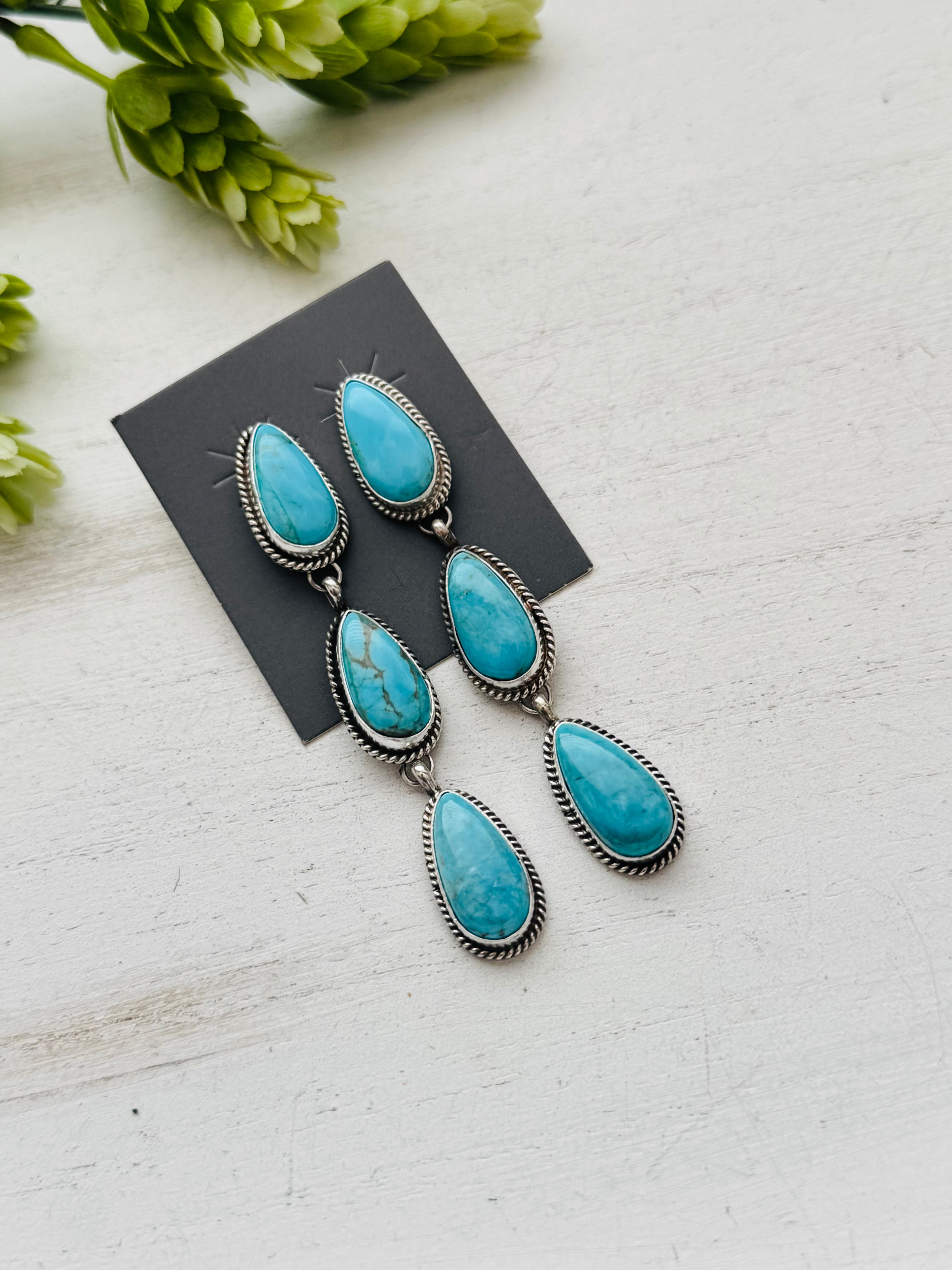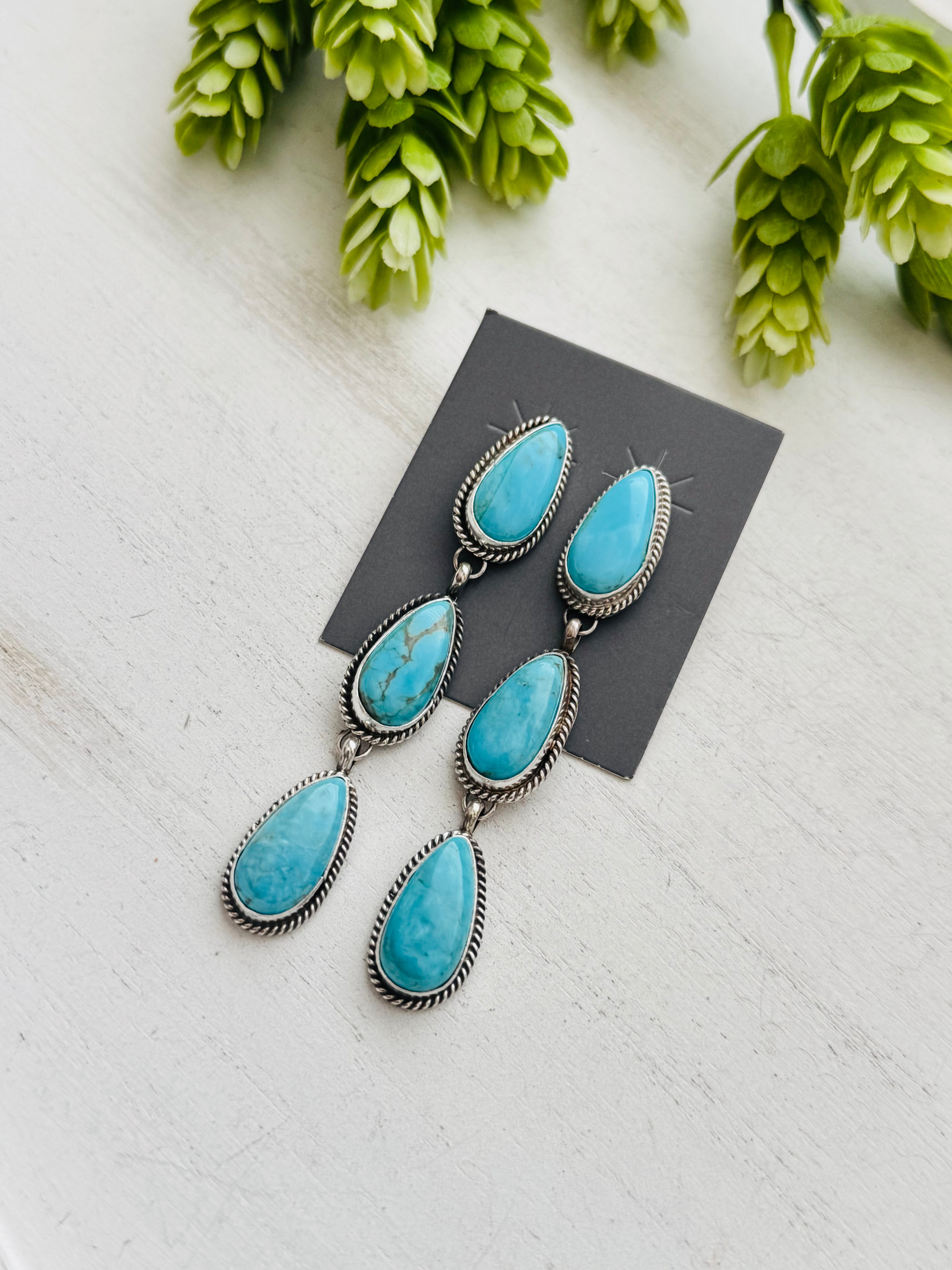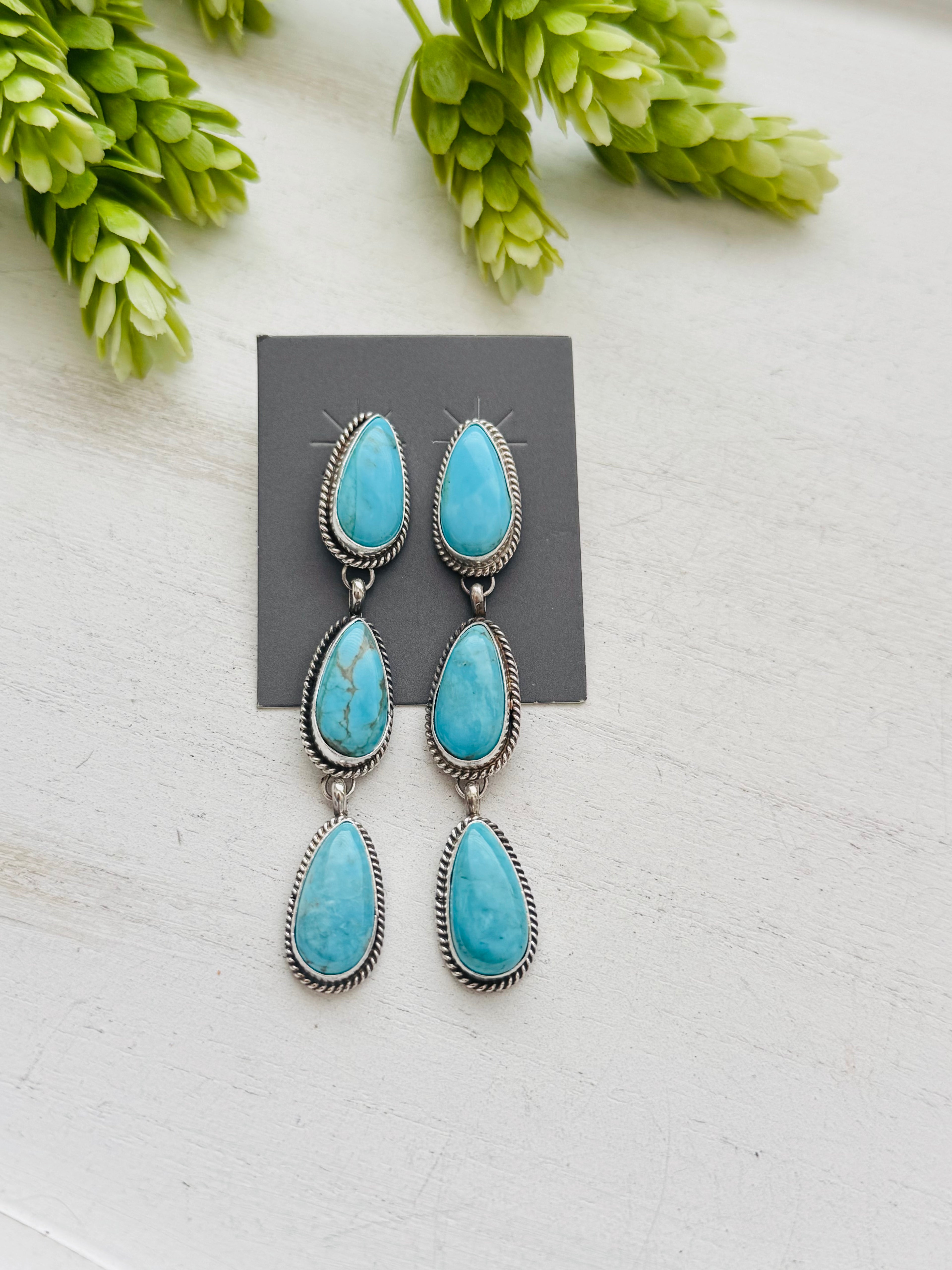 Navajo Made Kingman Turquoise & Sterling Silver Post Earrings. They measure 3 inches long and just under 1/2 of an inch wide. Signed by the artist and stamped sterling silver.