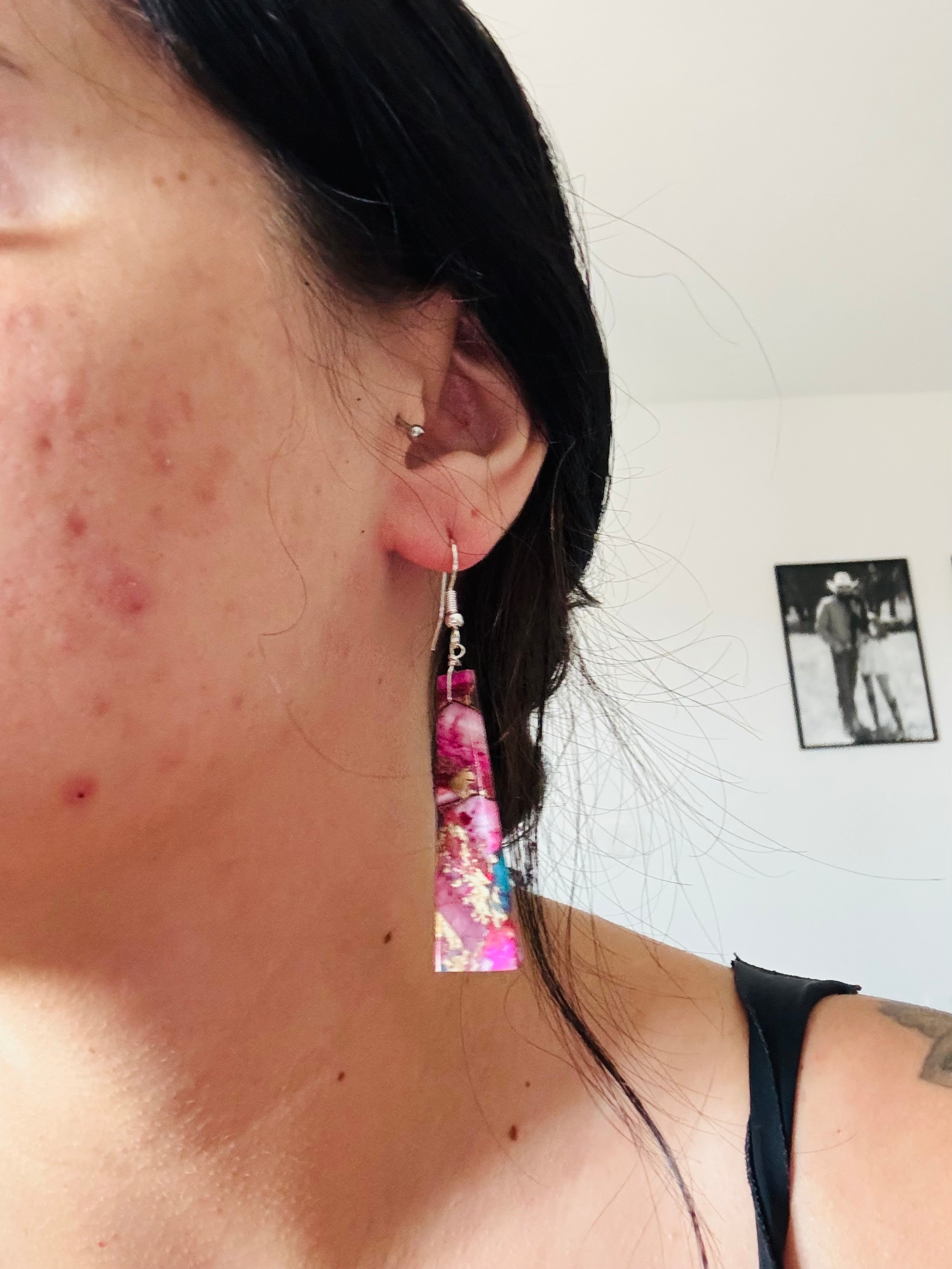 Navajo Made Purple Mohave Turquoise & Sterling Silver Slab Dangle Earrings. It measures 3 inches long and 5/8 of an inch wide.