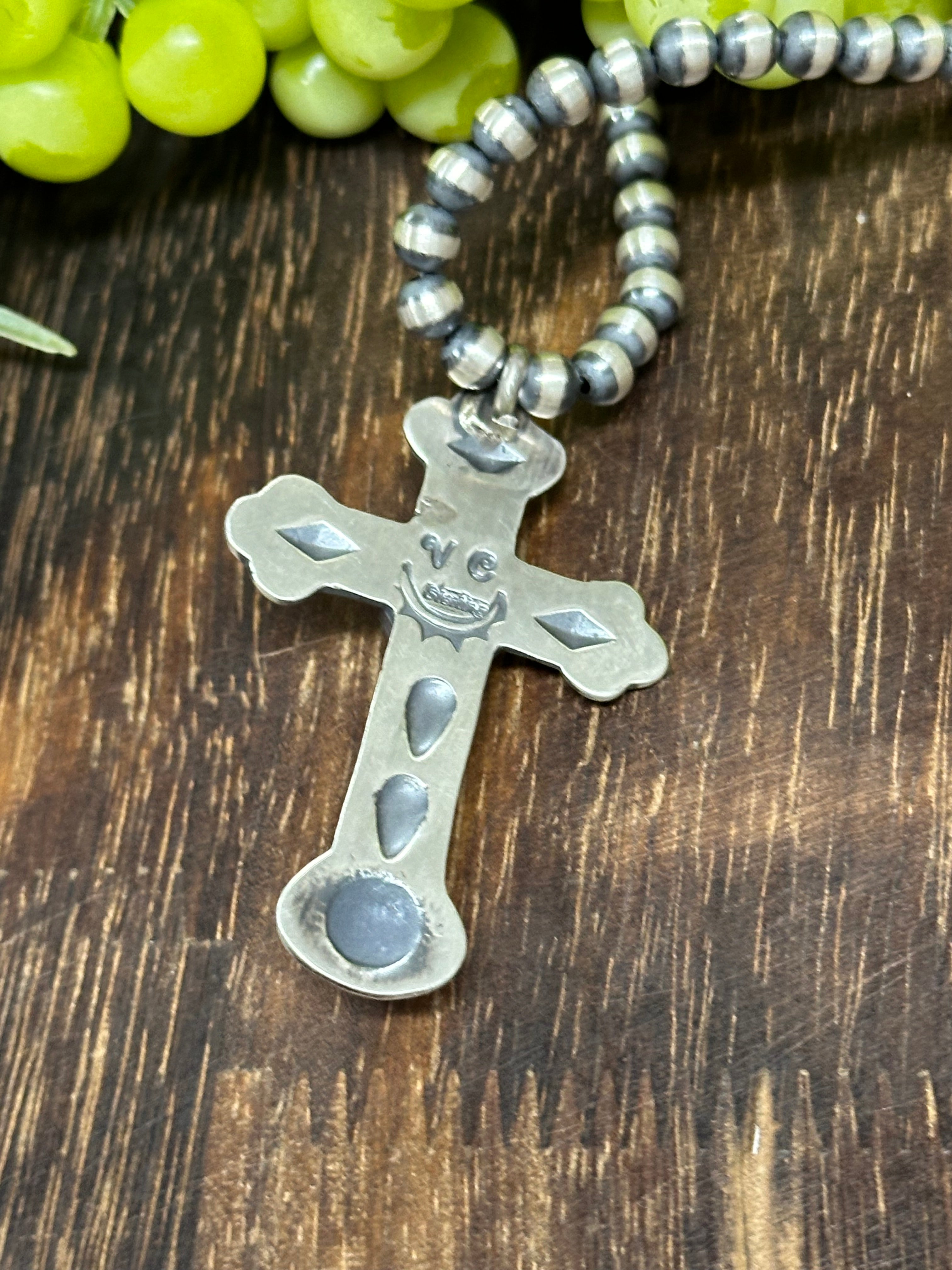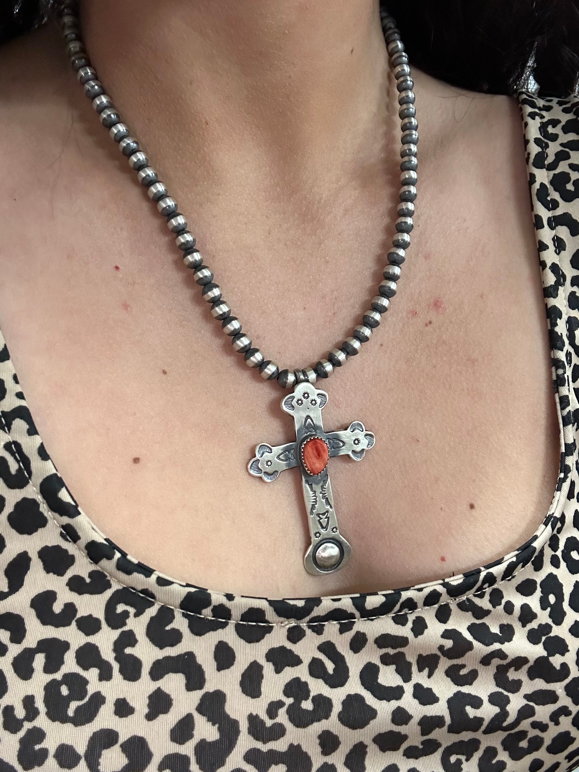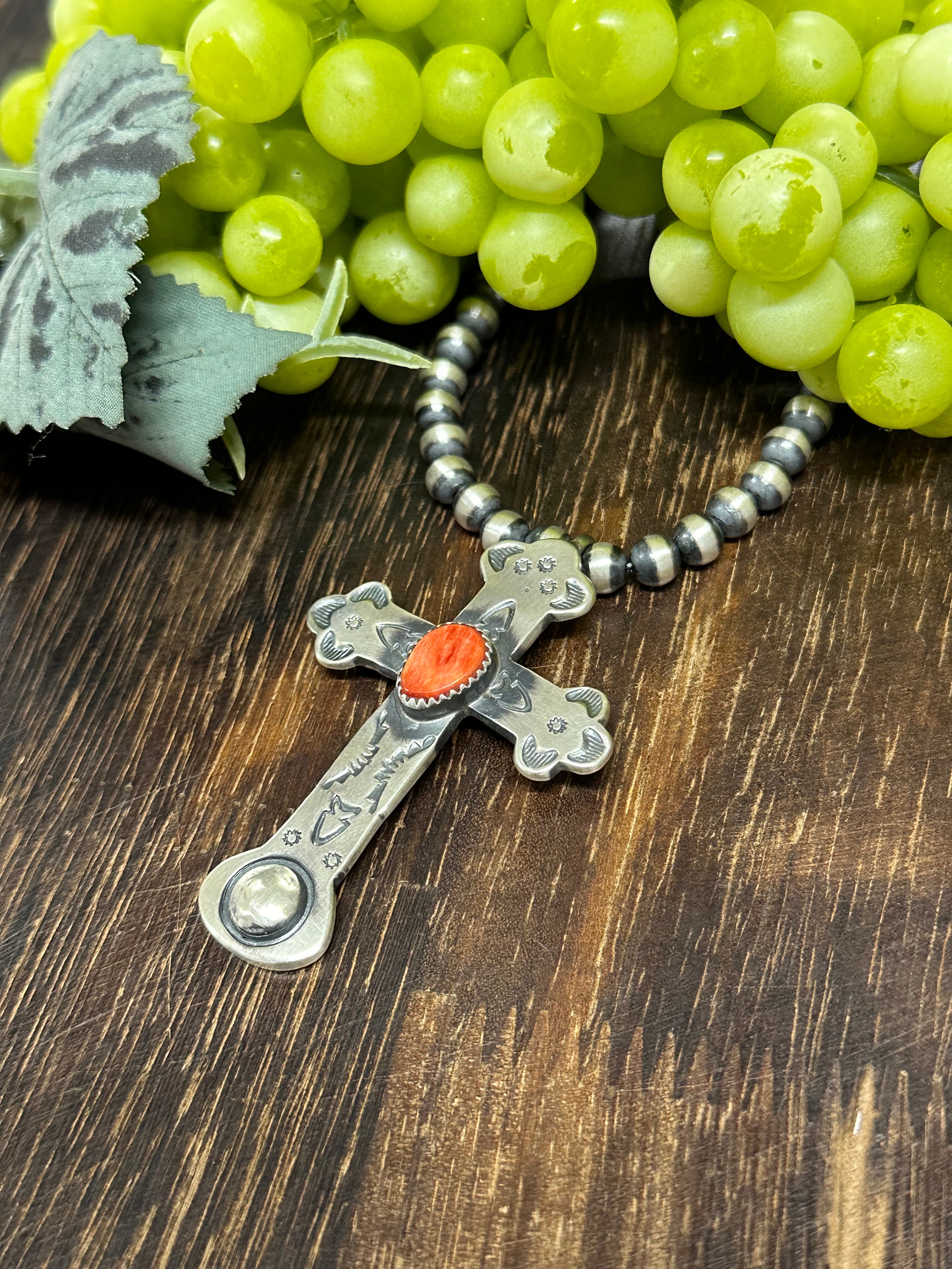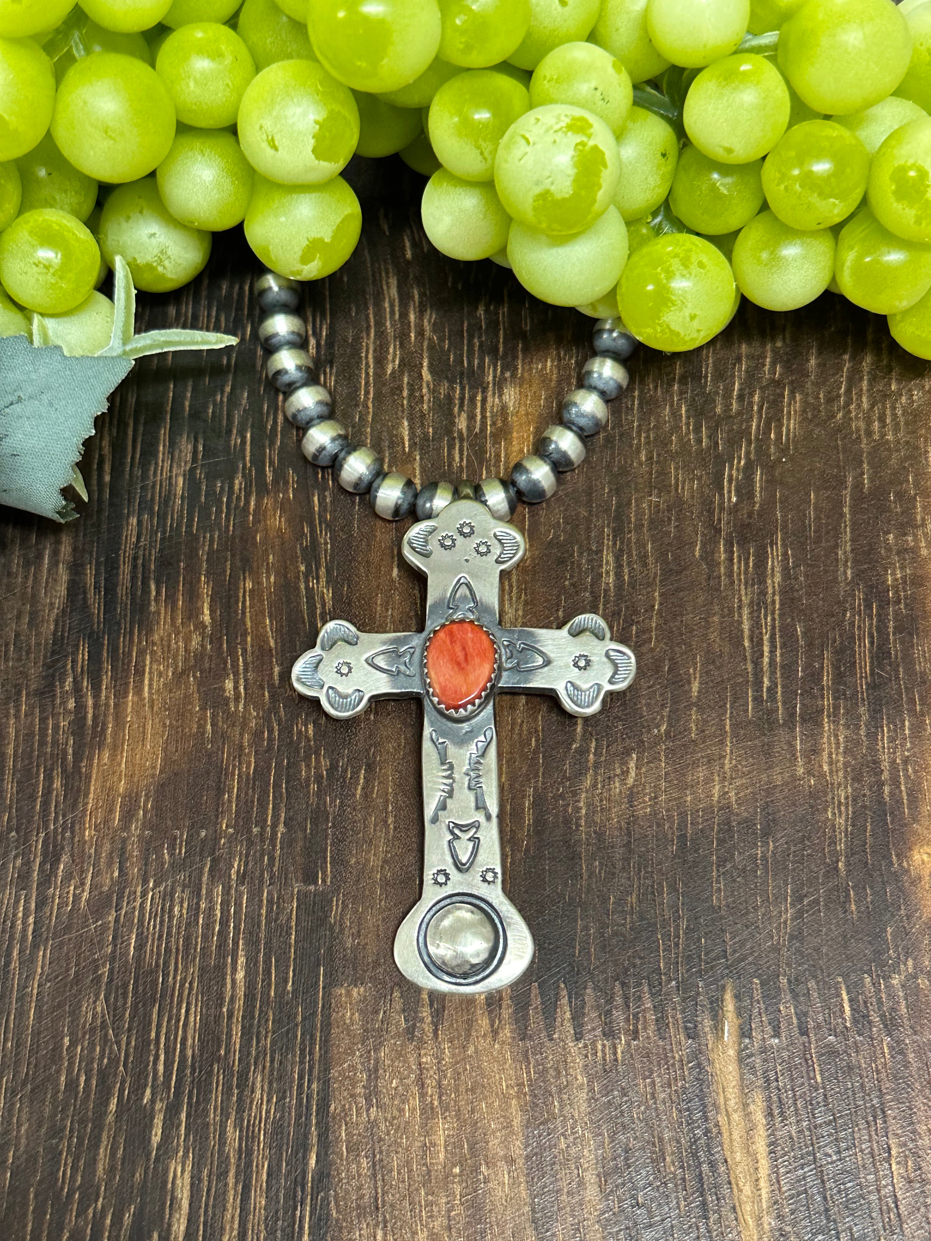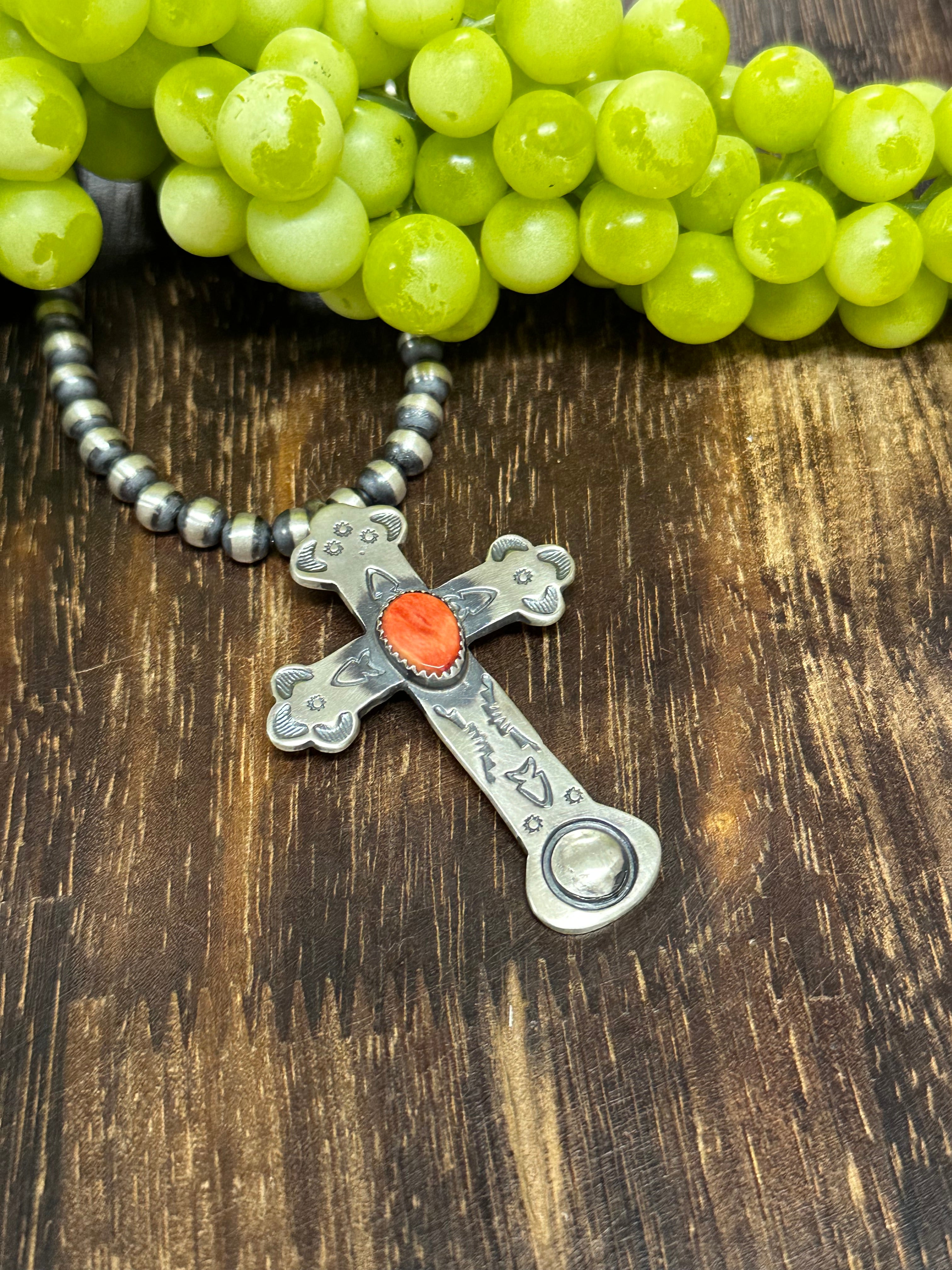 Navajo Made Spiny Oyster & Sterling Silver Cross Pendant