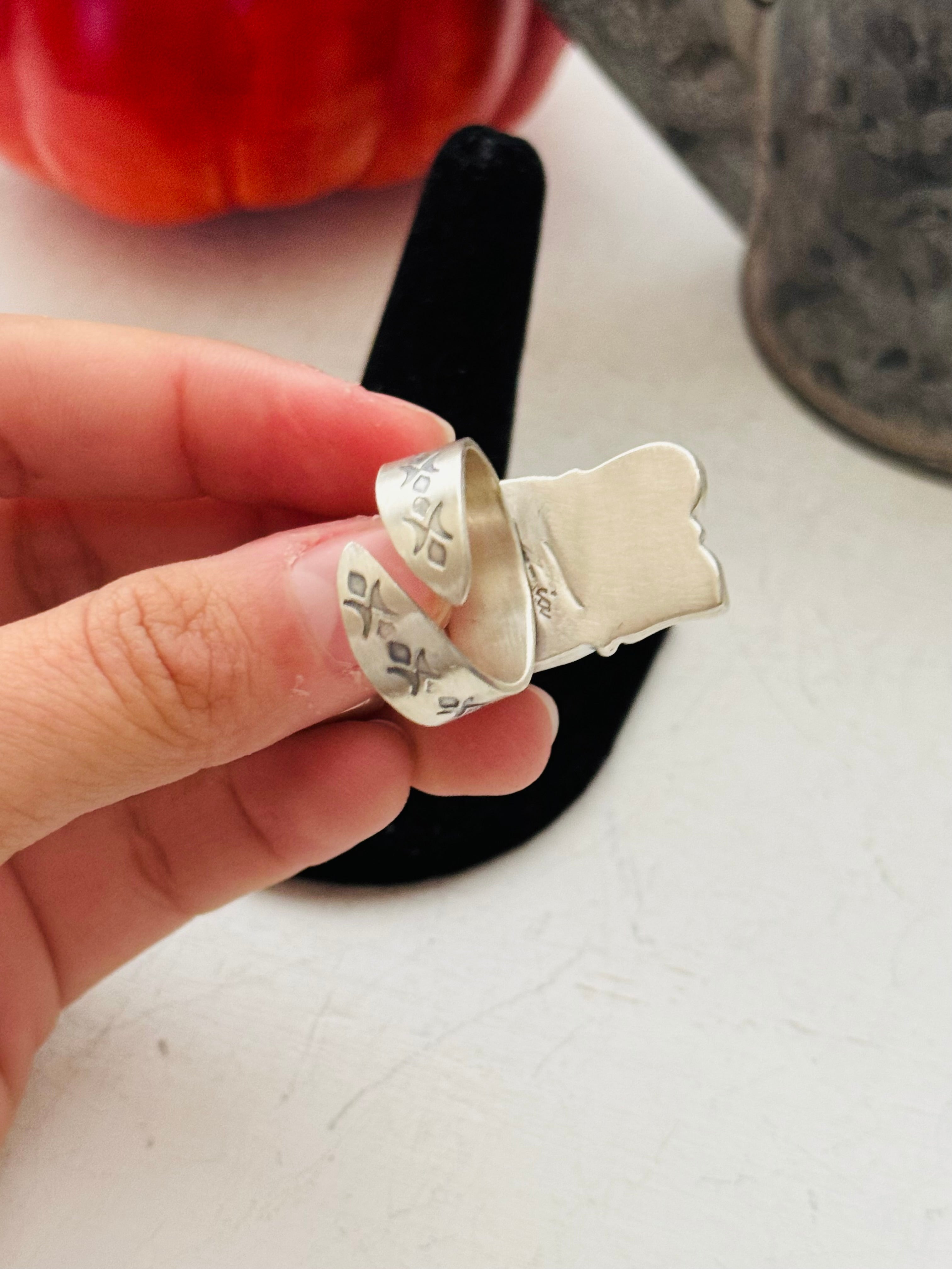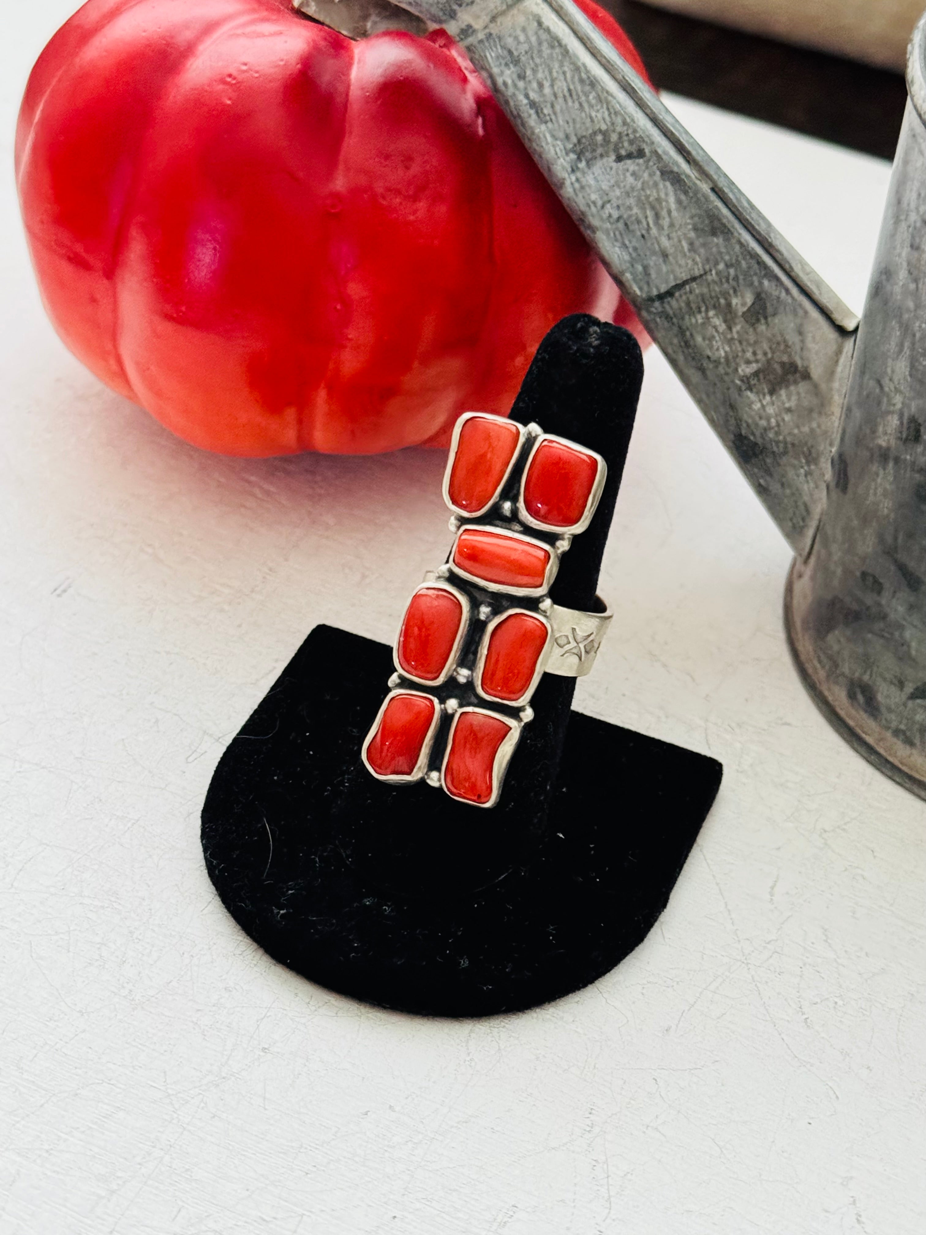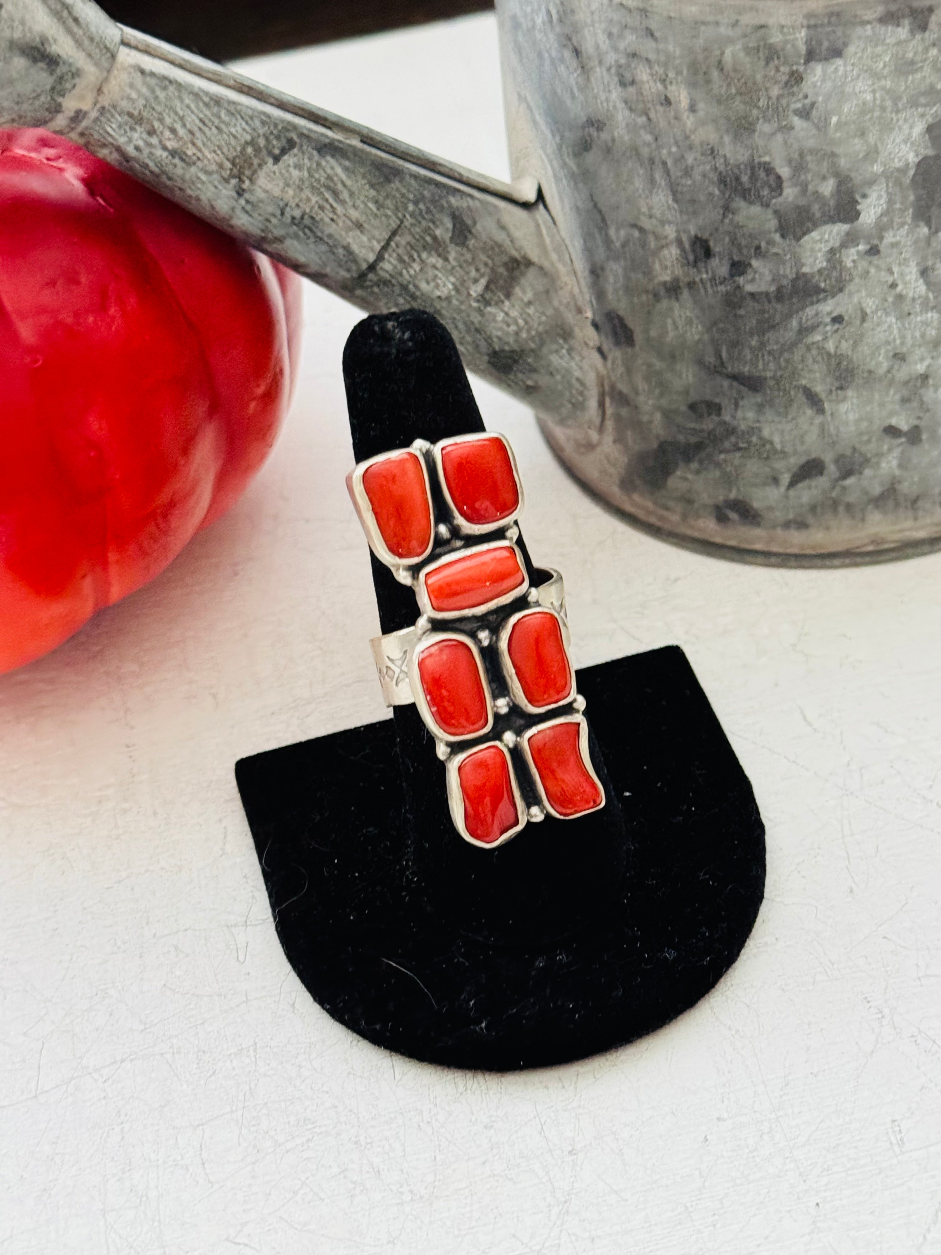 Beautiful ring, Navajo Made Red Coral & Sterling Silver Adjustable Ring. It measures 1 5/8 inches long. Signed by the artist and stamped sterling silver.