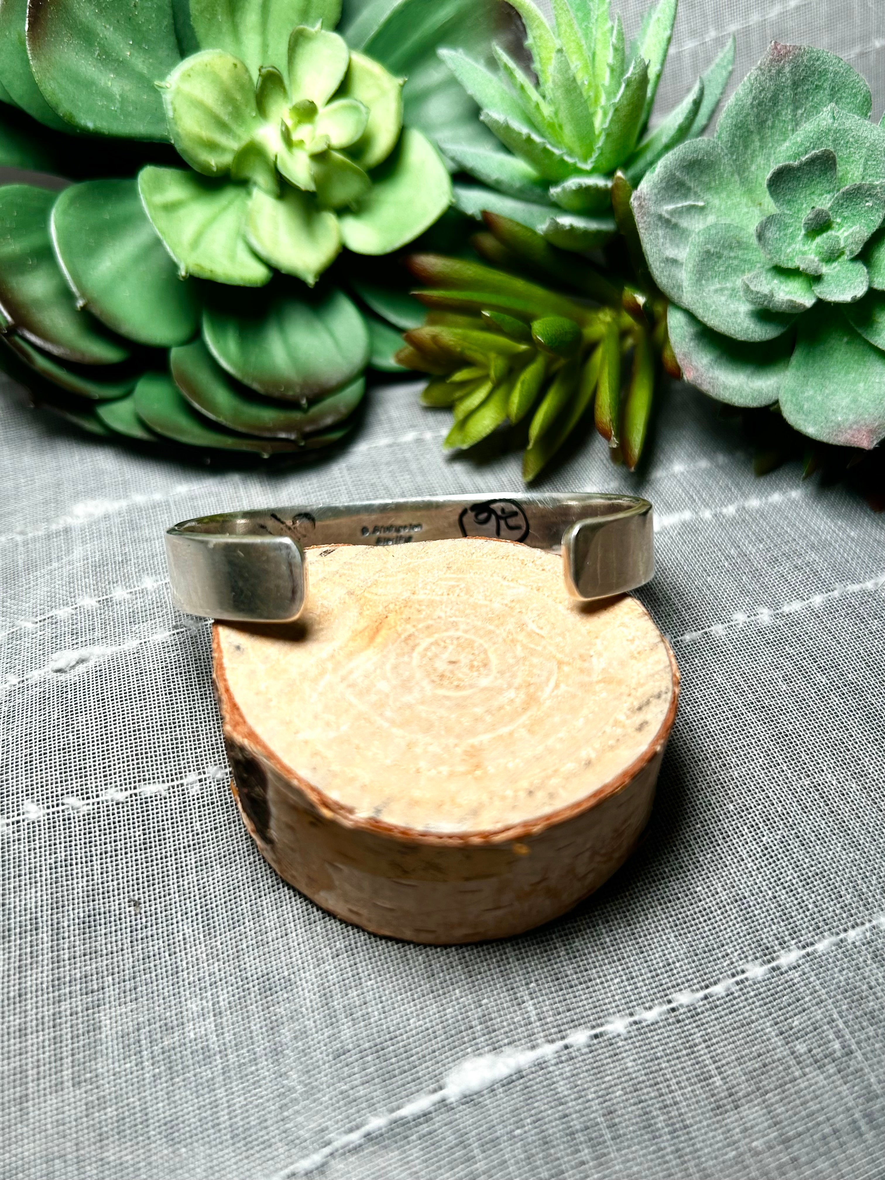 Navajo Made Drunzy & Sterling Silver Cuff Bracelet. It measures 3/8 of an inch wide with an inside circumference of 5 1/4 inches and a gap of 1 1/8 inches. Signed by the artist and stamped sterling silver.