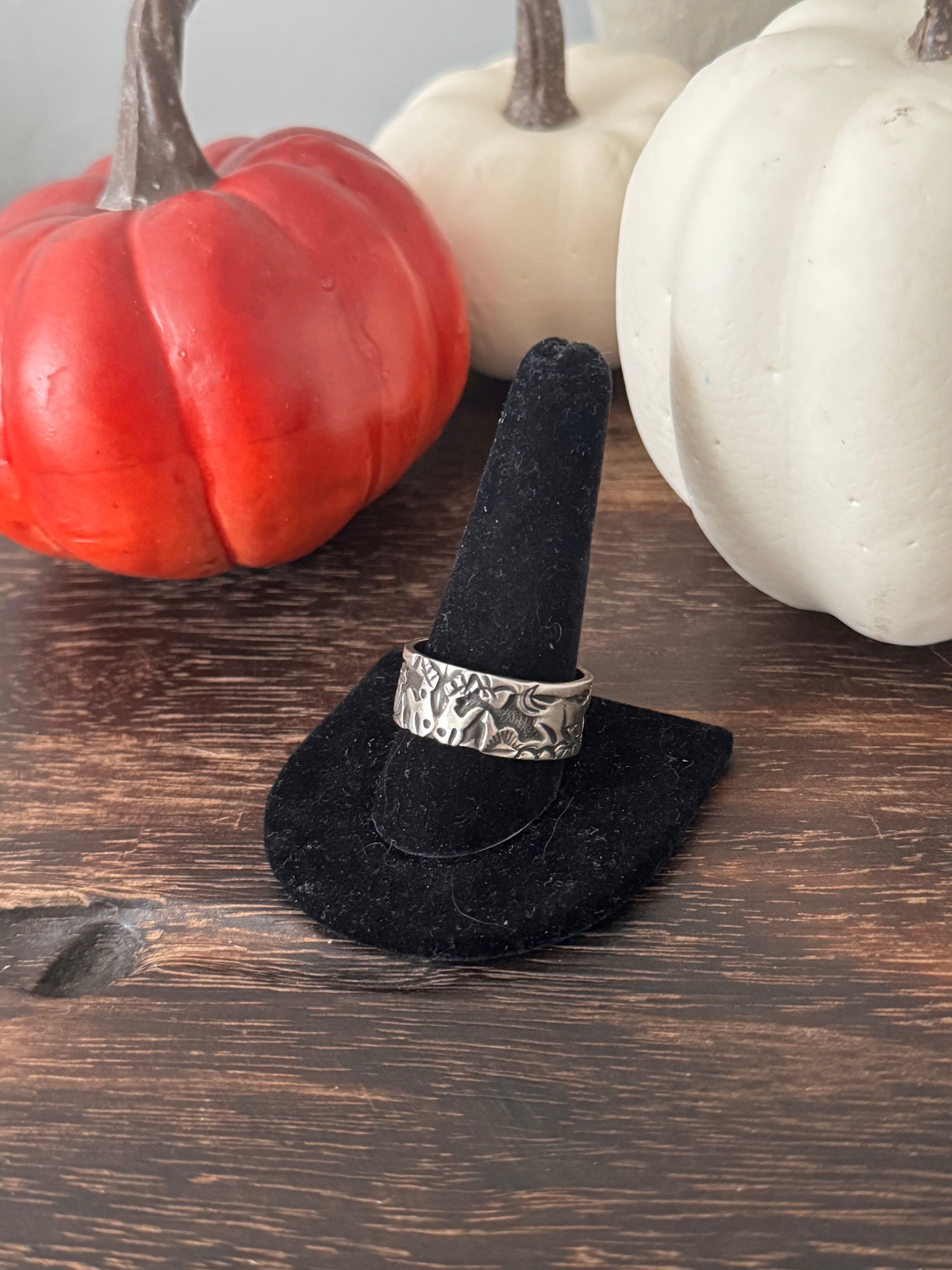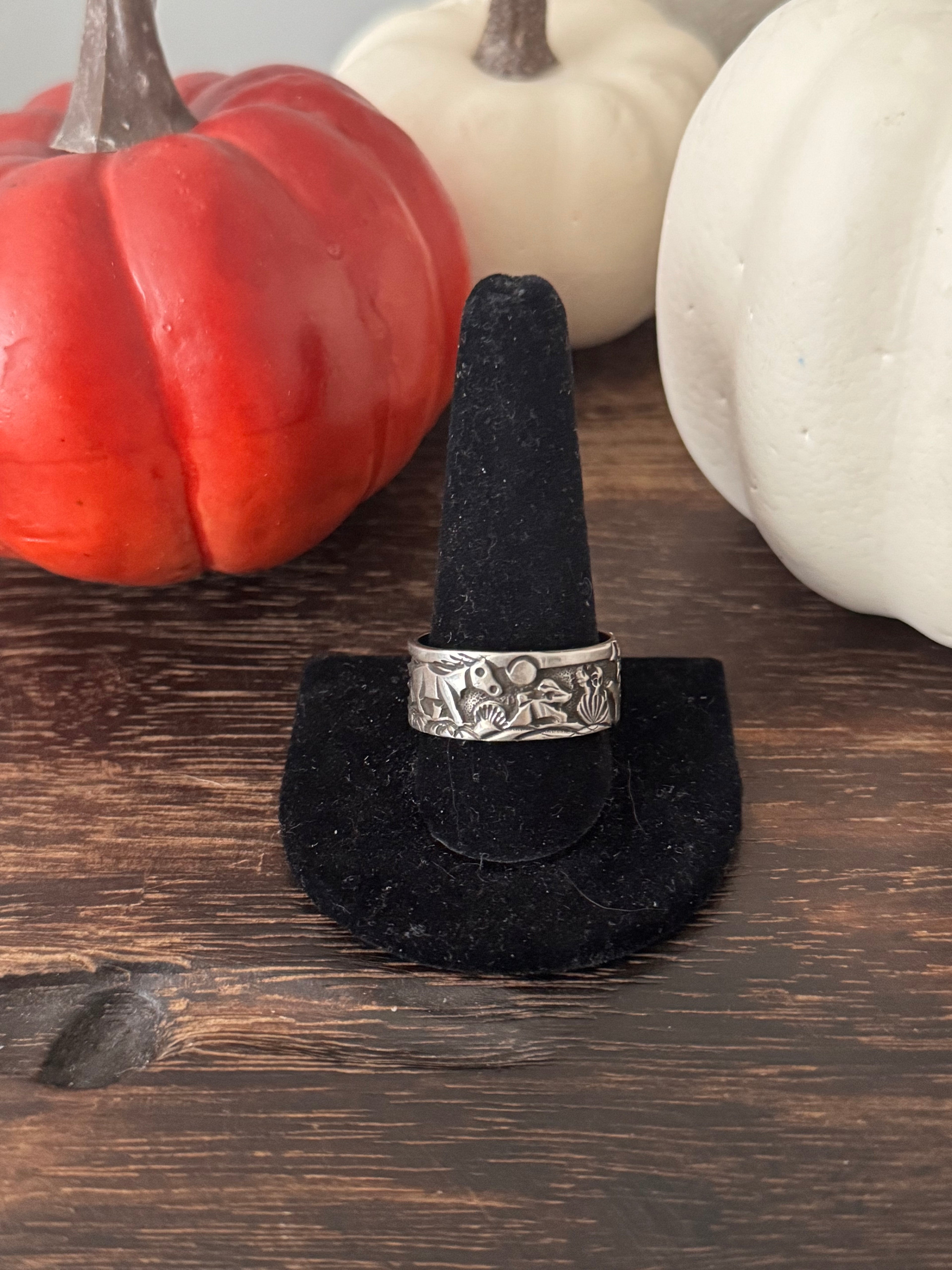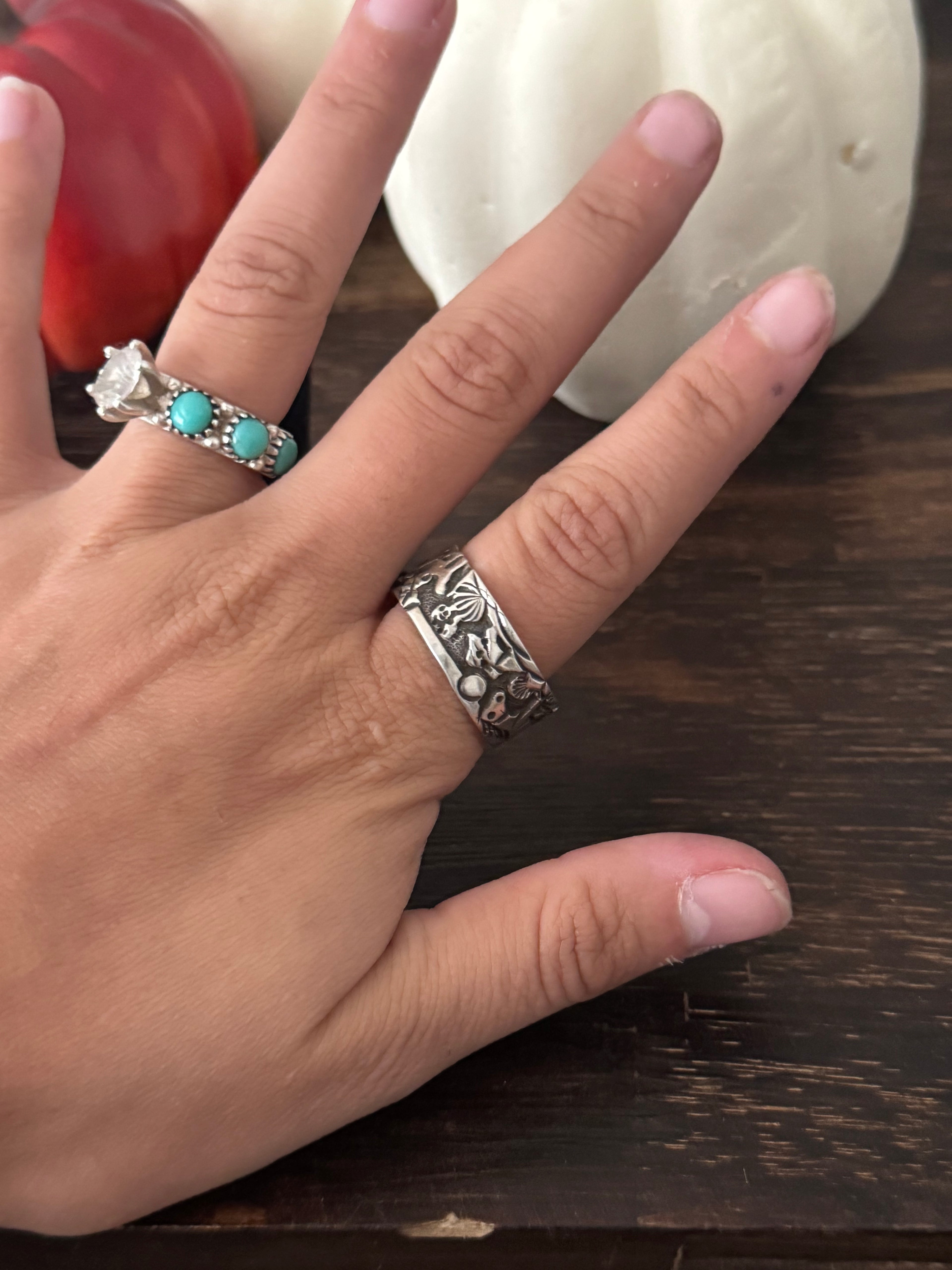 This is an awesome ring. Navajo Made Sterling Silver Story Teller Ring. It measures 1/2 of an inch long. Stamped and signed.