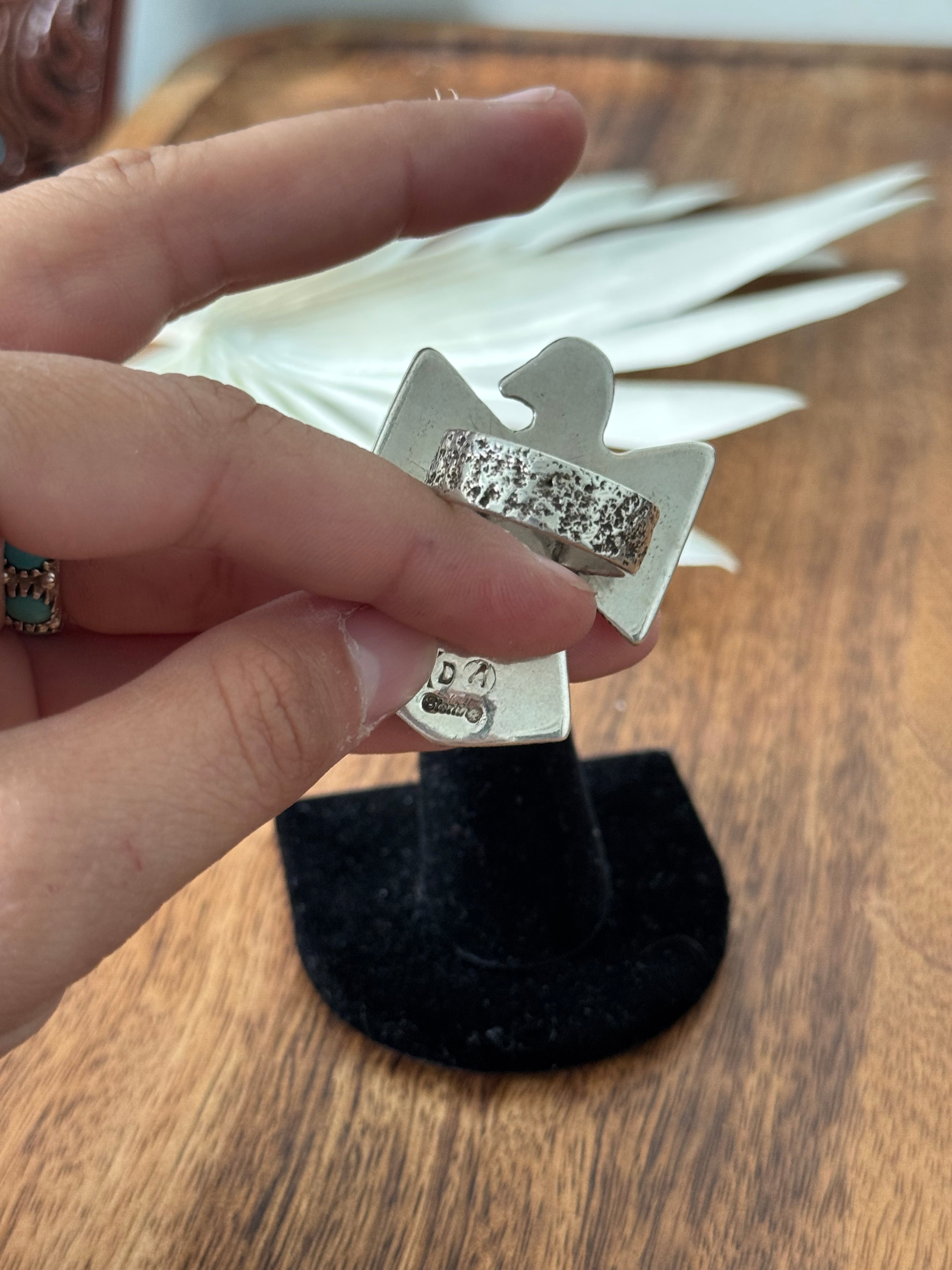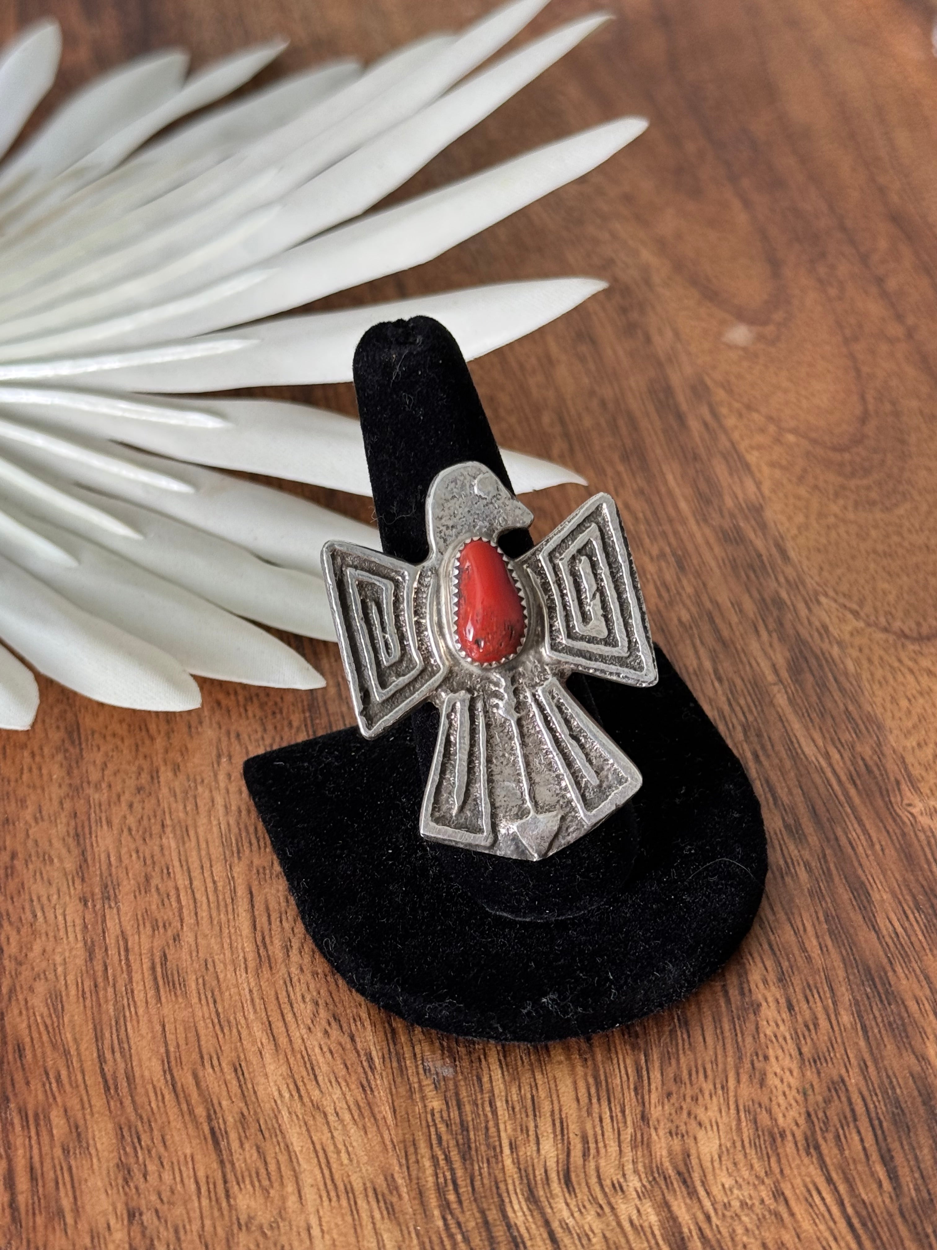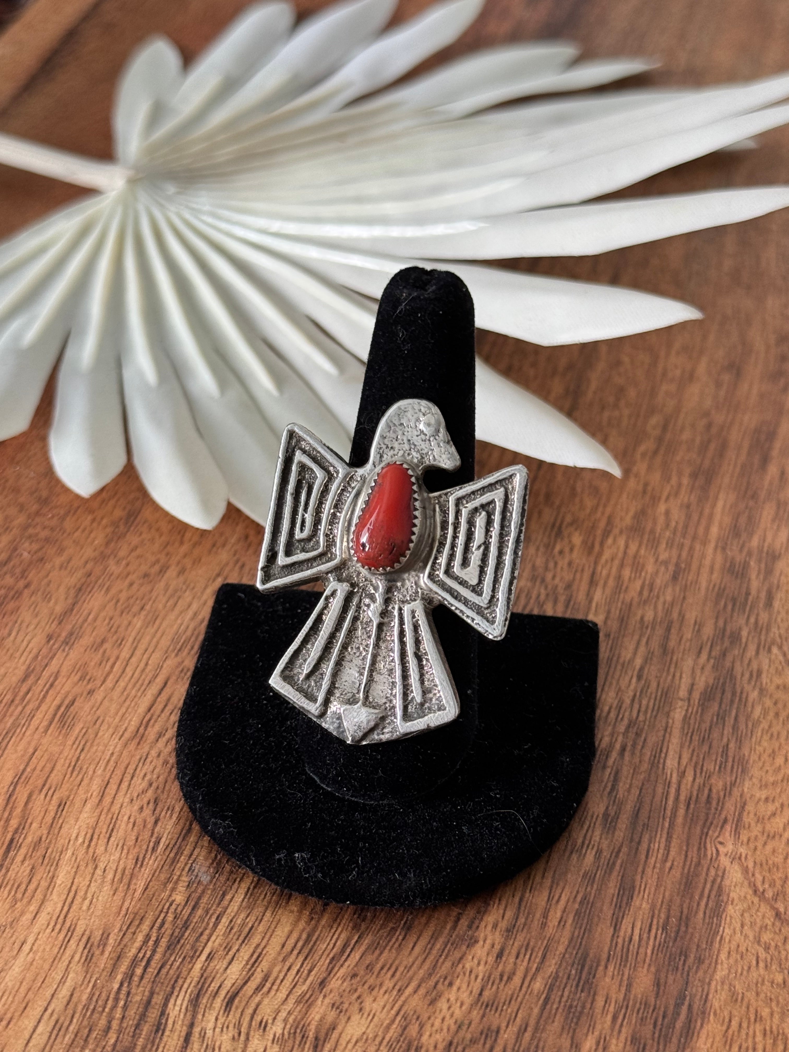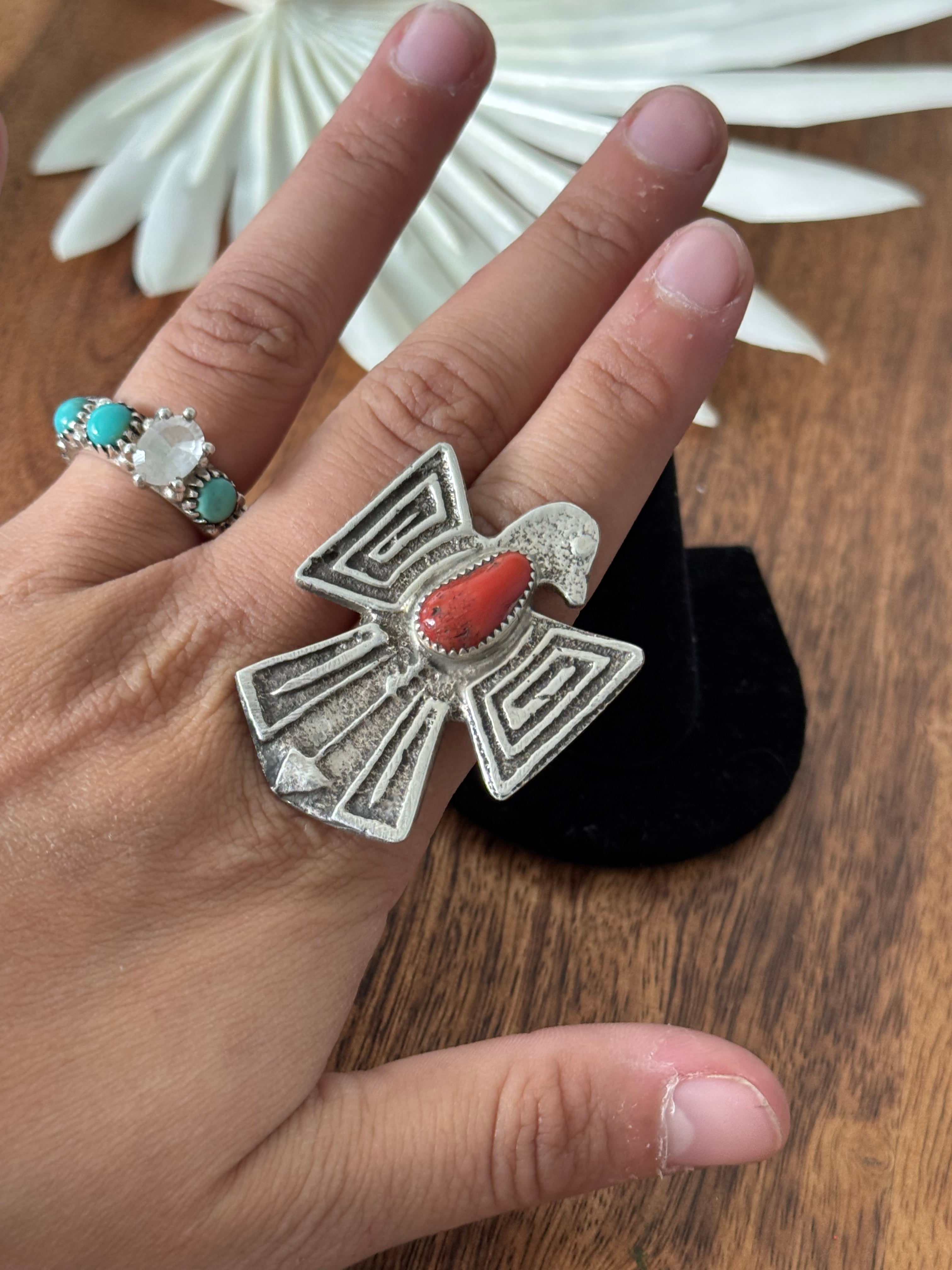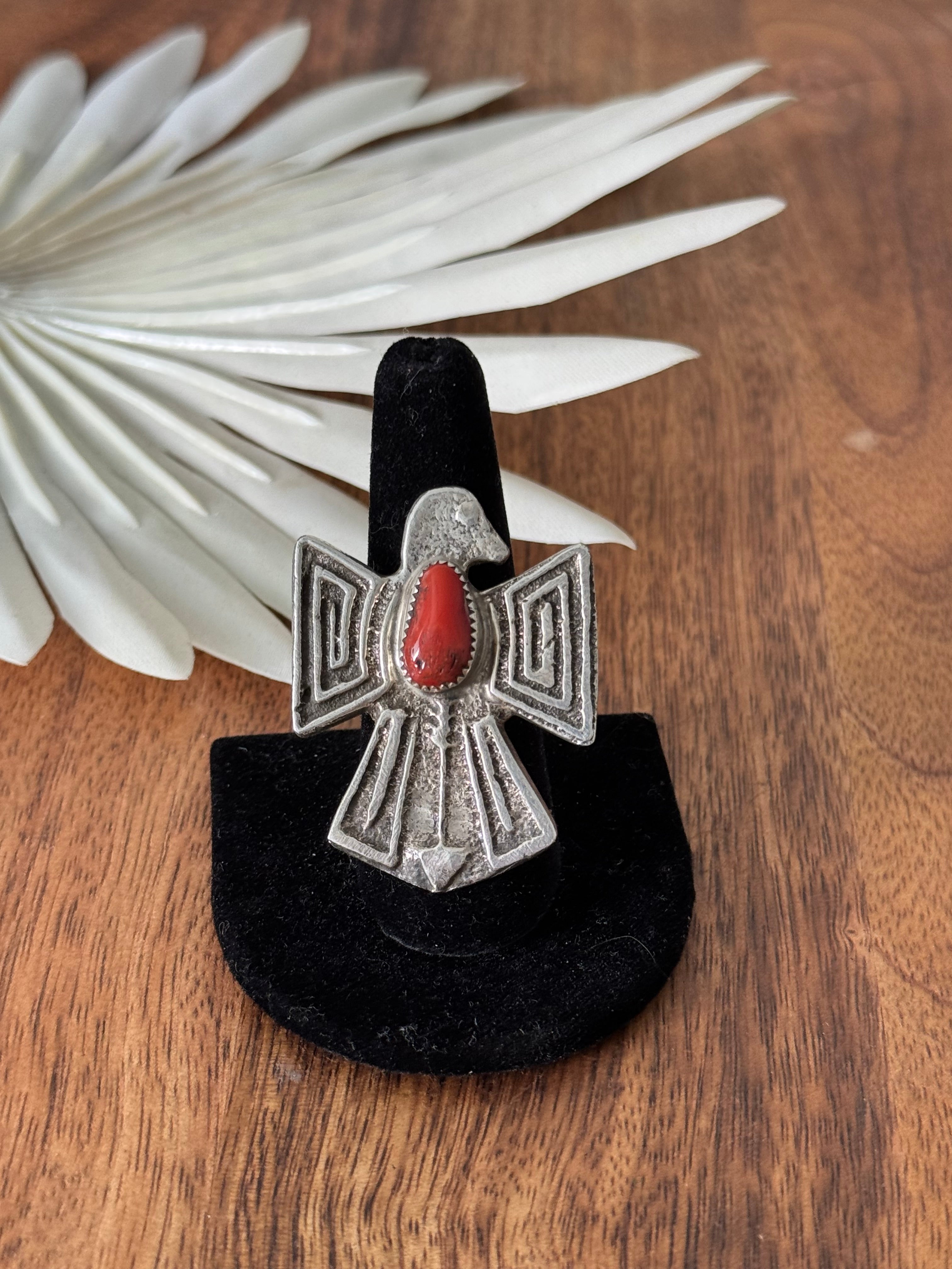 Navajo Made Red Coral & Sterling Silver Ring Thunderbird Size 11.5