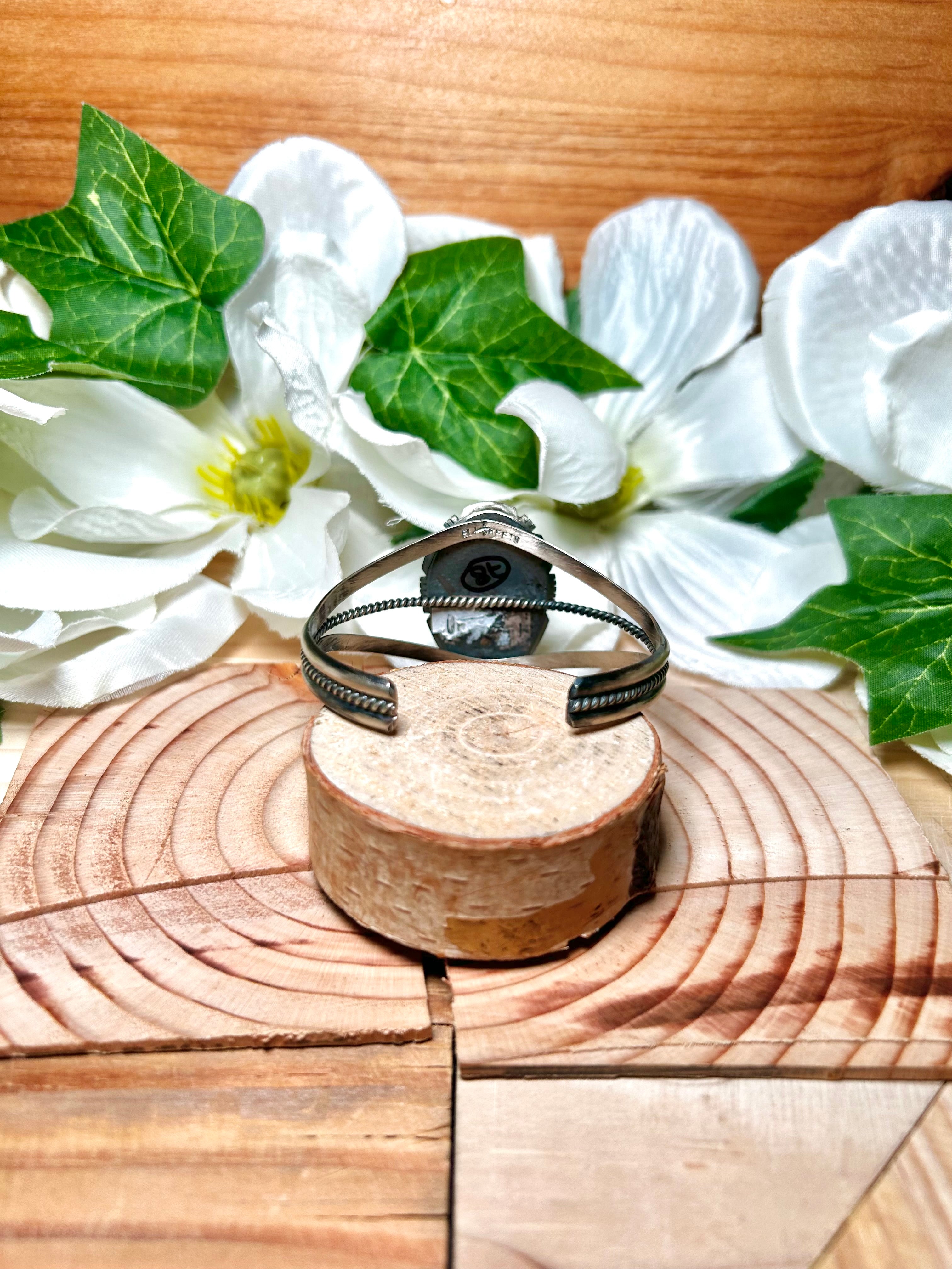 Navajo Made Red Skin Turquoise & Sterling Silver Cuff Bracelet. It measures 1 1/2 inches wide with an inside circumference of 5 1/2 inches and a gap of 1 inch. Signed by the artist and stamped sterling silver.