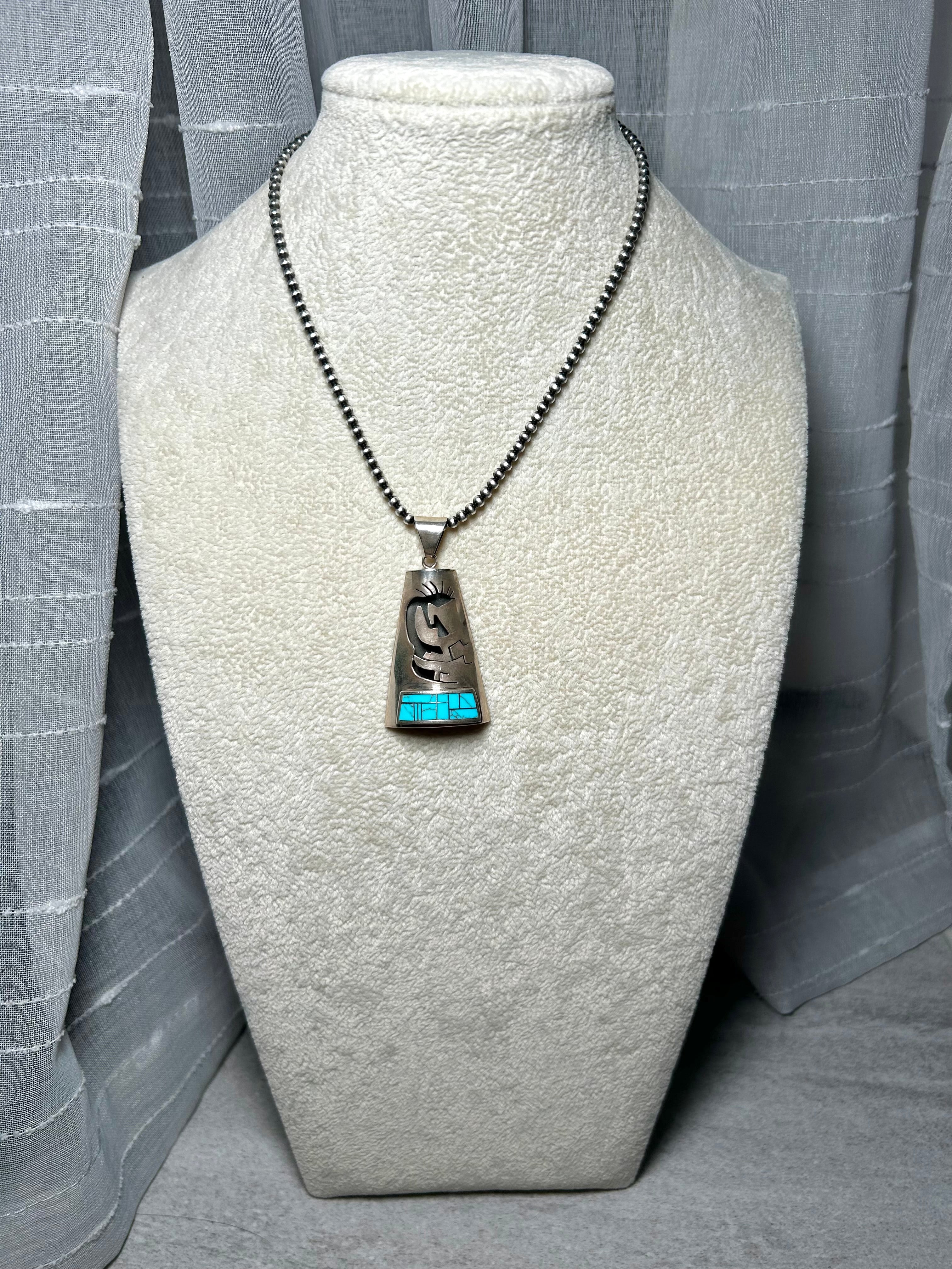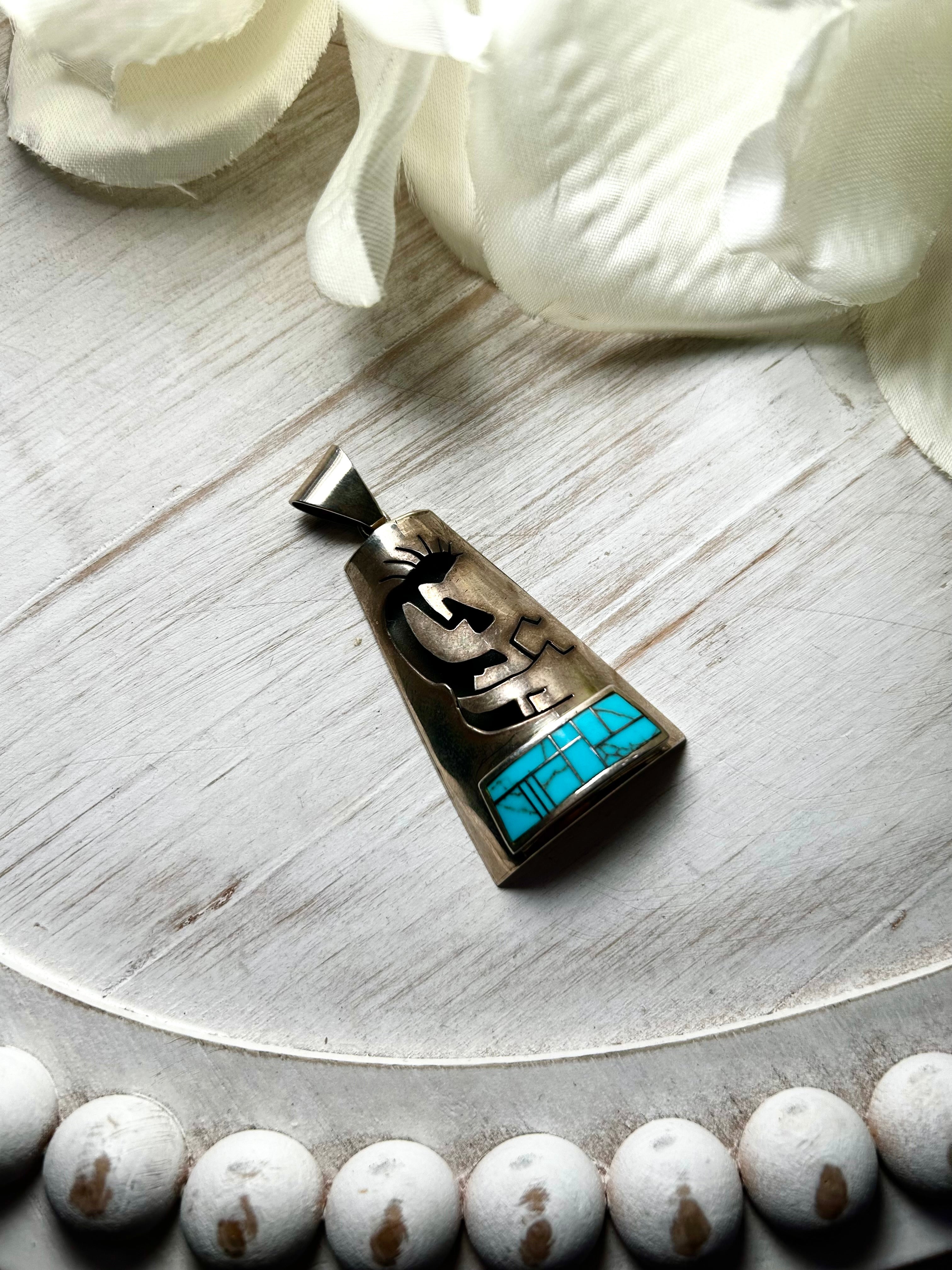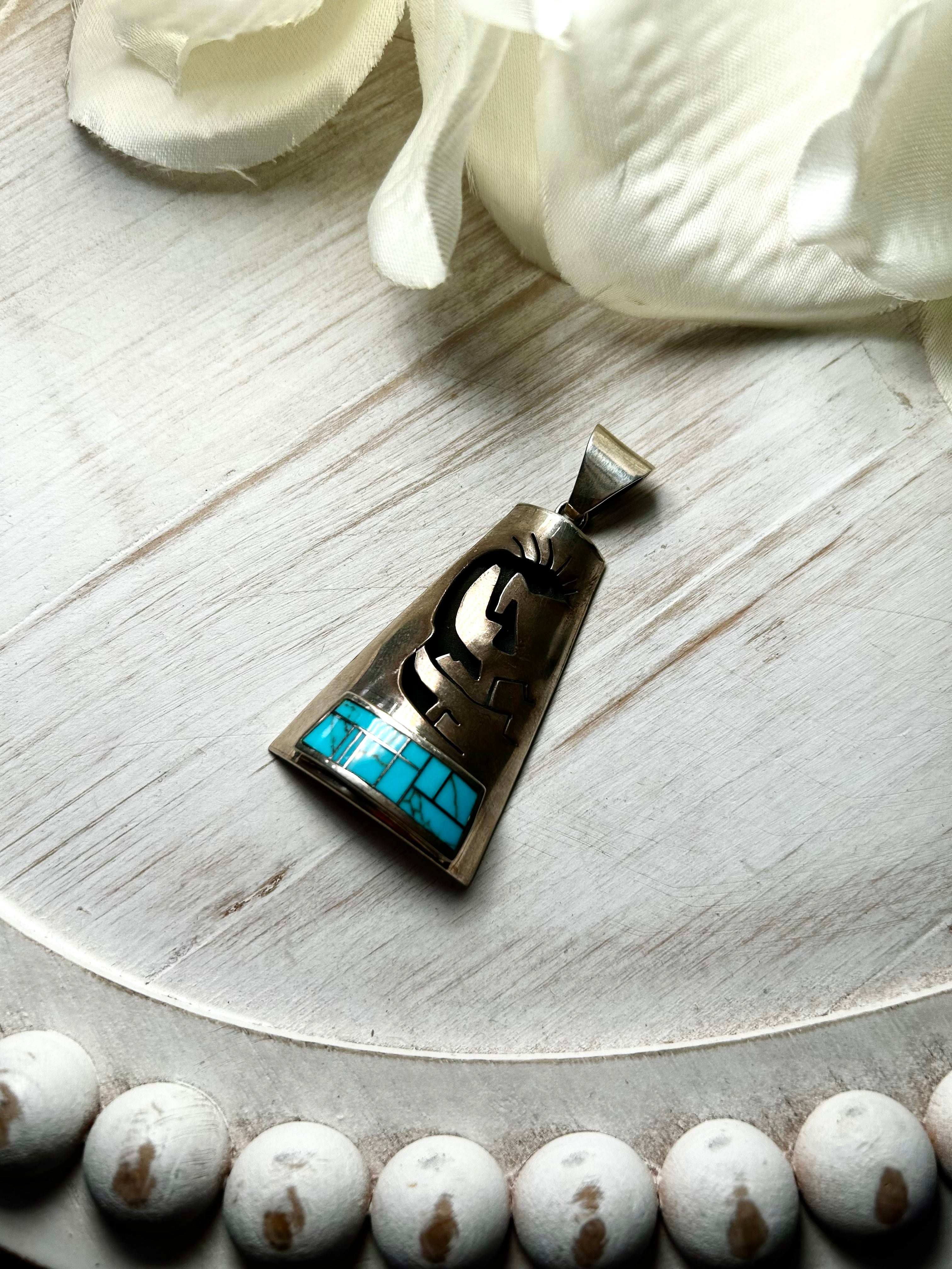 Navajo Made Kingman Turquoise & Sterling Silver Pendant. It measures 2 1/8 inches long and 1 1/8 inches wide. Signed by the artist and stamped sterling silver. Pendant only!