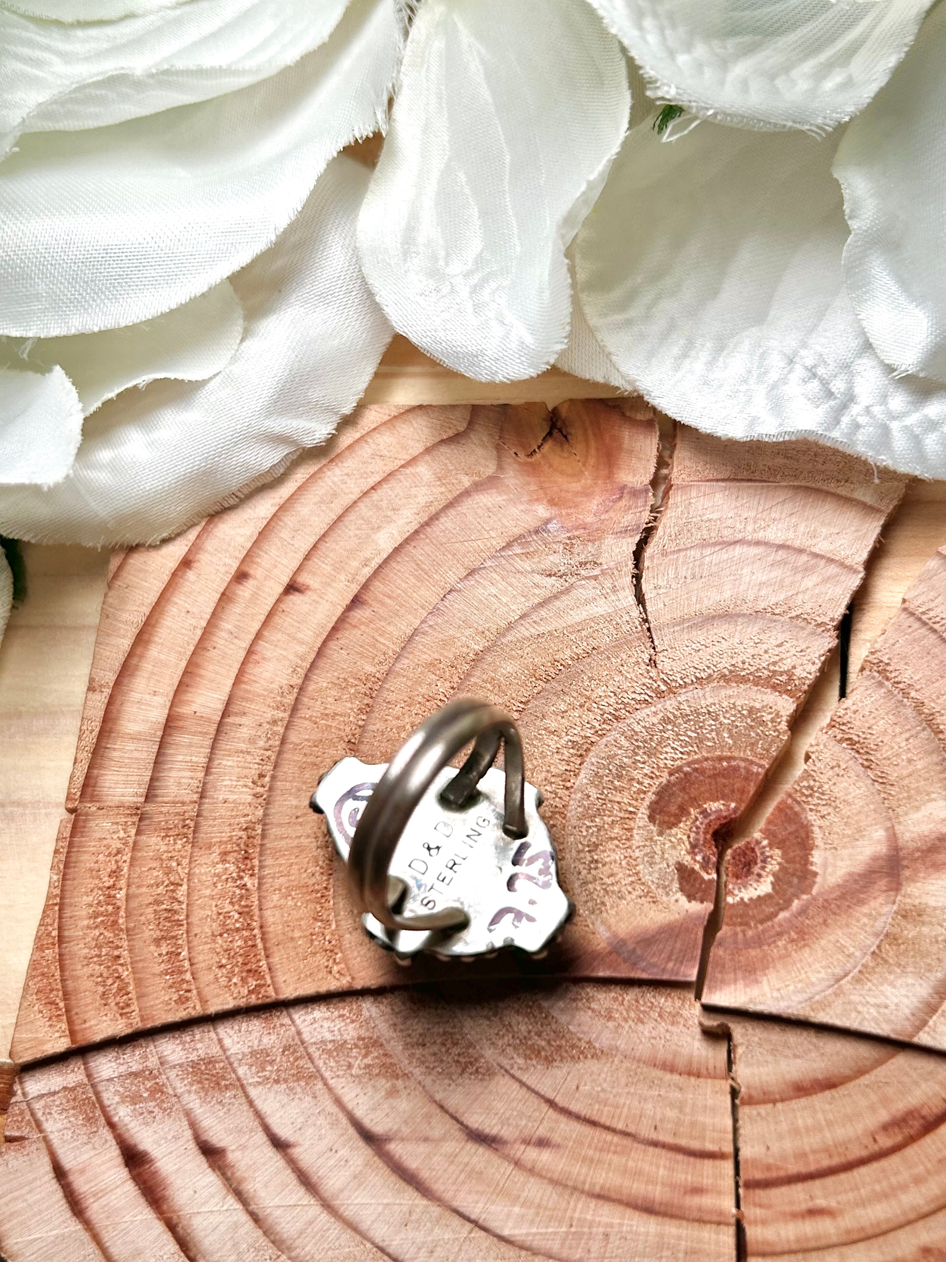 Navajo Made Red Skin Turquoise & Sterling Silver Ring Size 7.25. It measures 1 1/8 inches long and 3/4 of an inch wide. Signed by the artist and stamped sterling silver.
