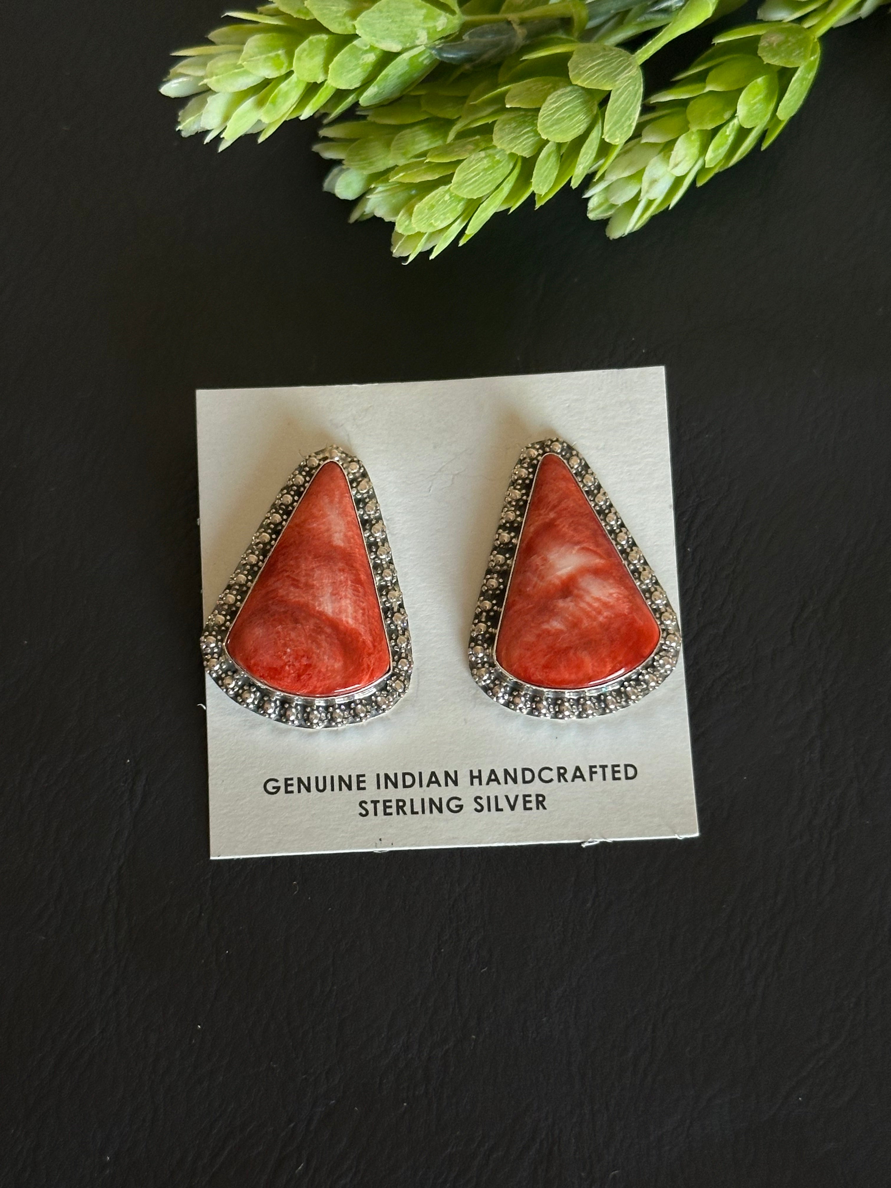 Navajo Made Red Spiny Oyster & Sterling Silver Post Earrings