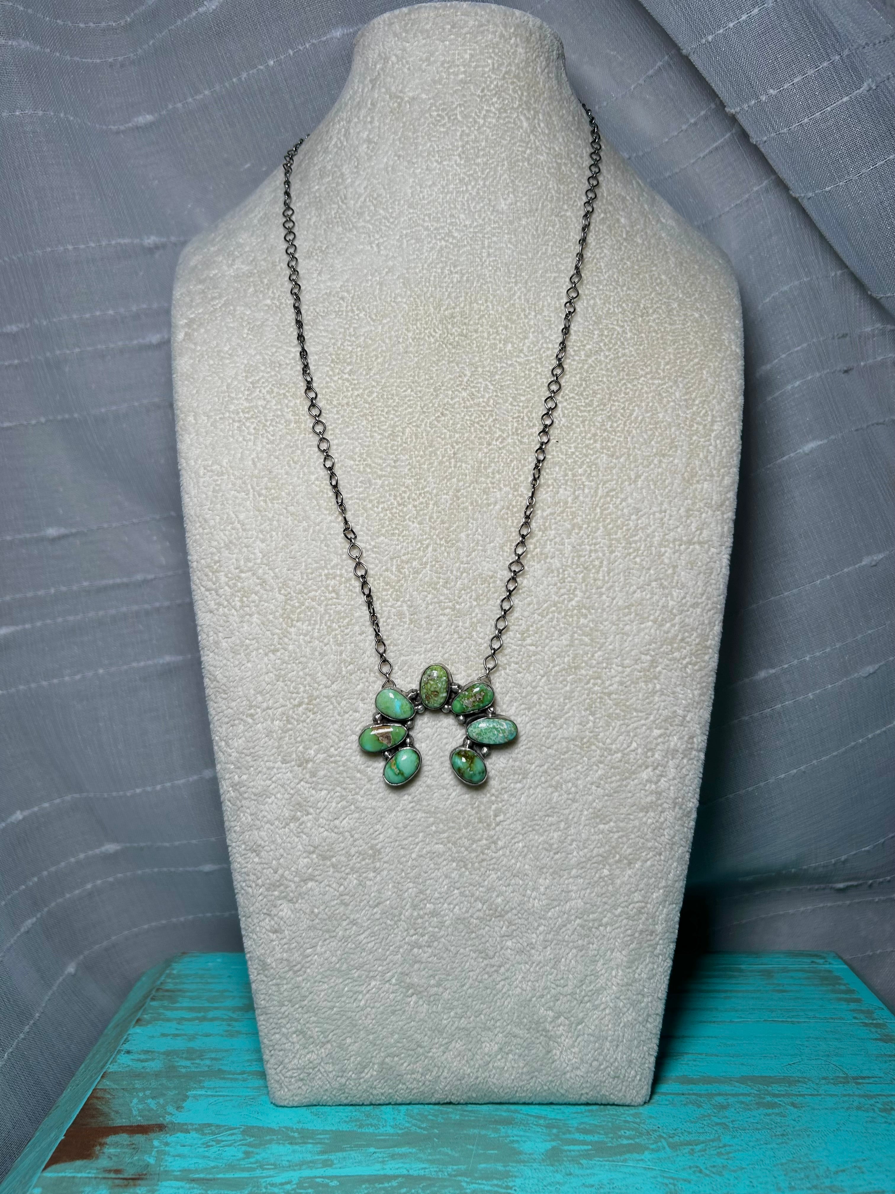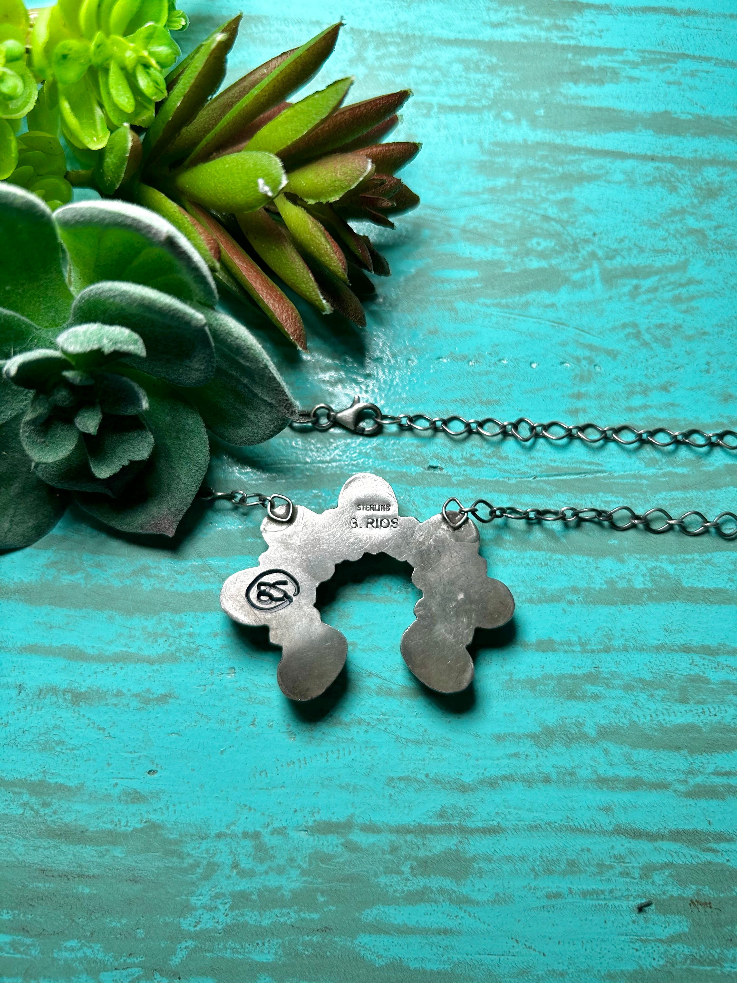 George Rios Sonoran Mountain Turquoise & Sterling Silver Necklace. It measures 23 1/2 inches long with hang while the chain measures 21 1/2 inches long. Signed by the artist and stamped sterling silver.