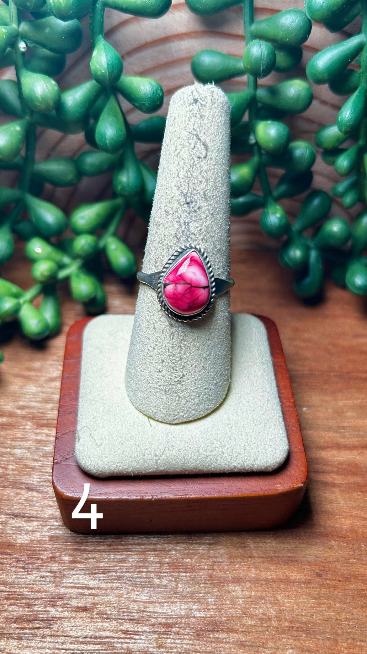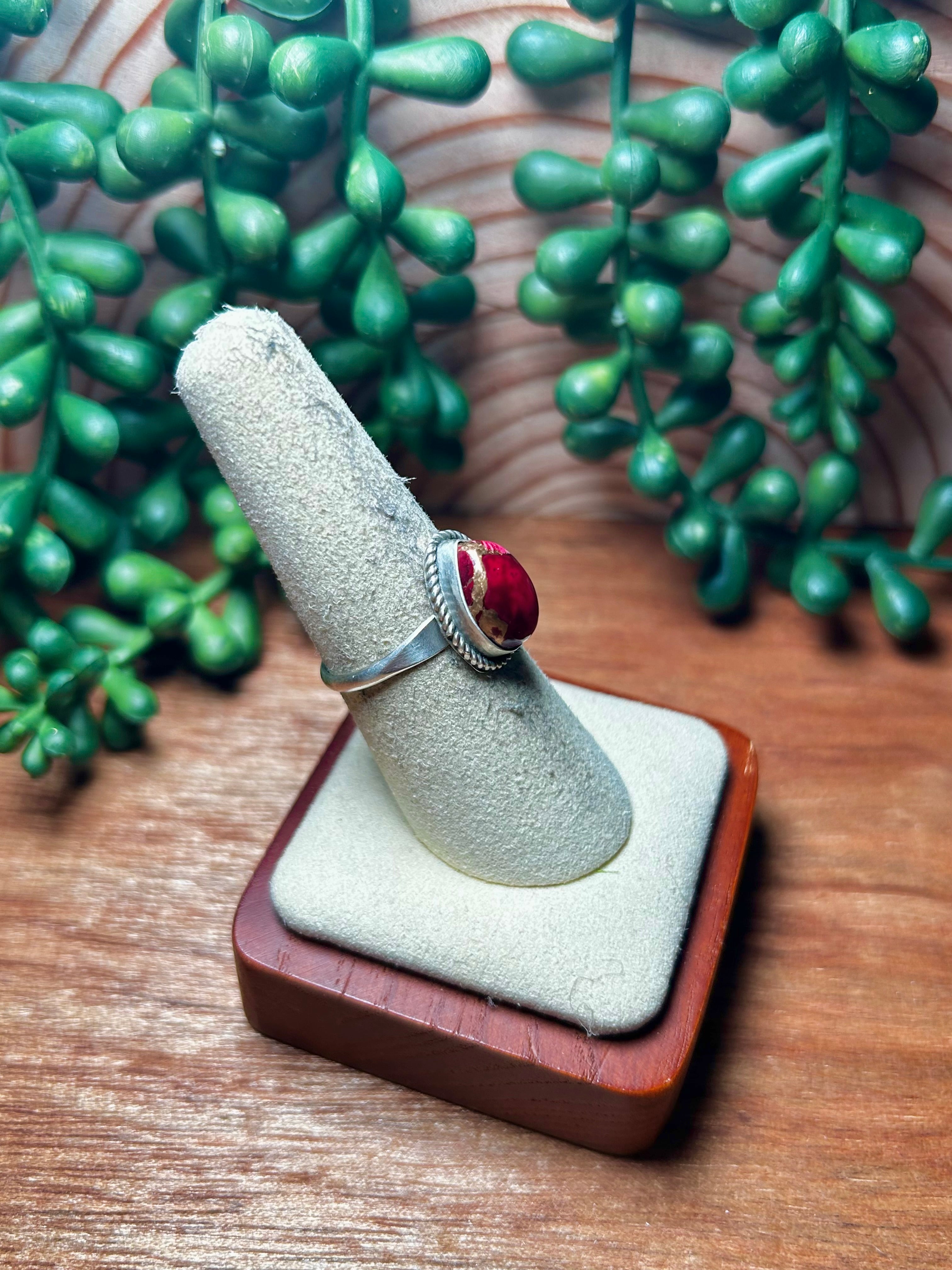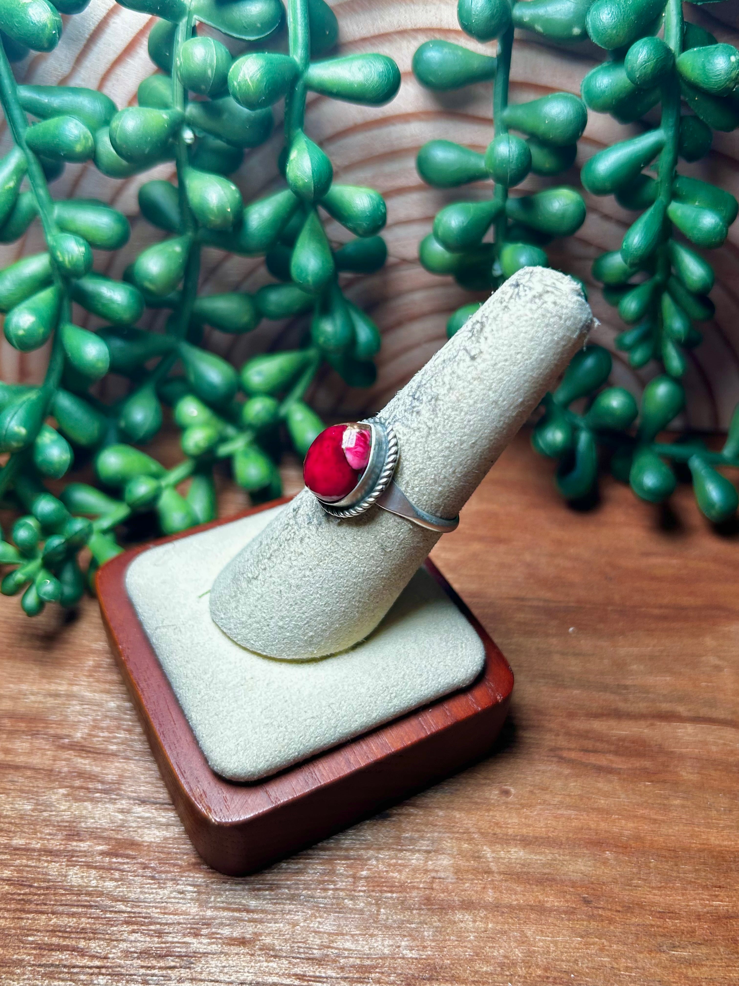 Navajo Made Rose Dahlia & Sterling Silver Ring. It measures 5/8 of an inch long and 1/2 of an inch wide. Signed by the artist and stamped sterling silver.