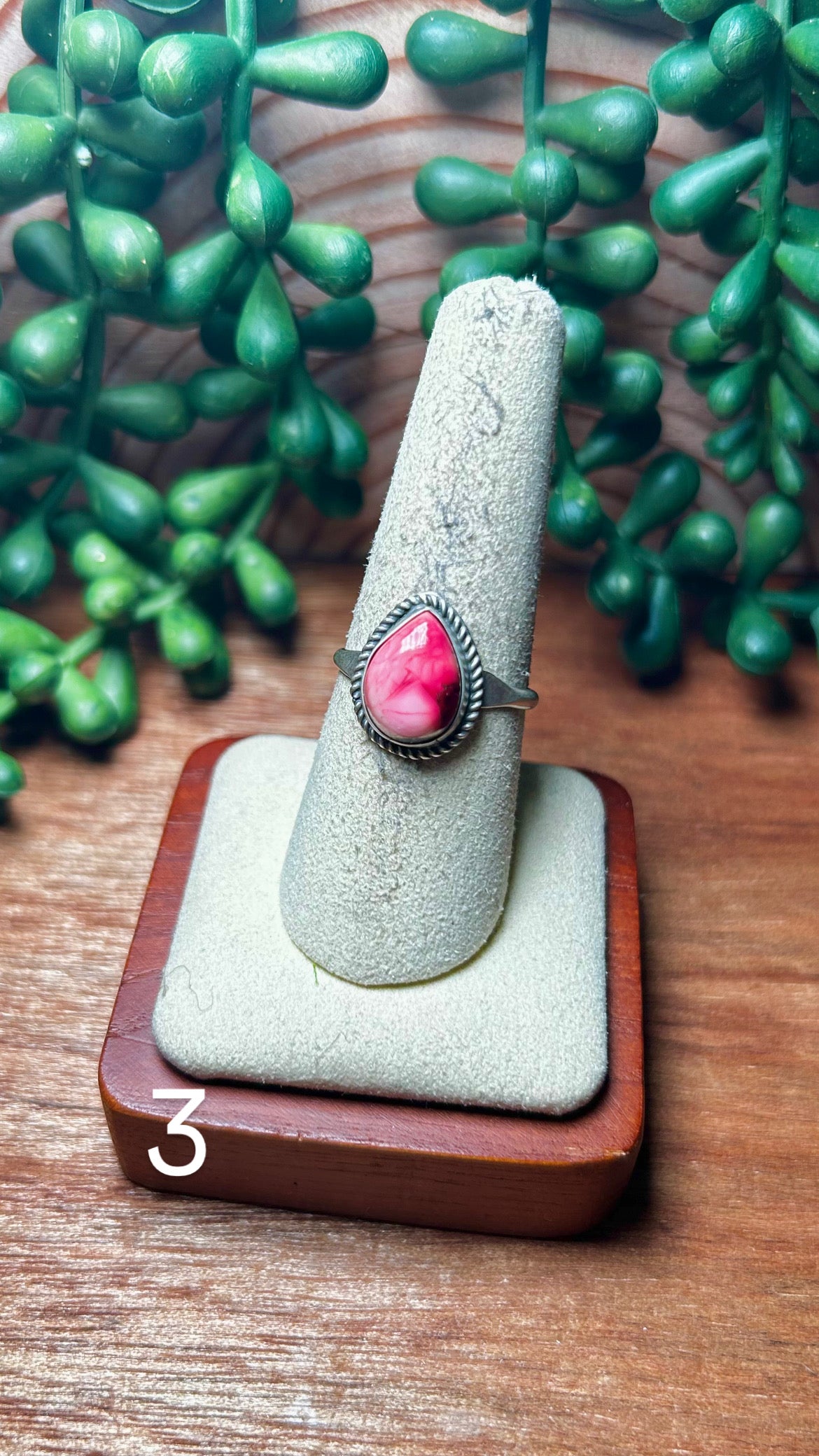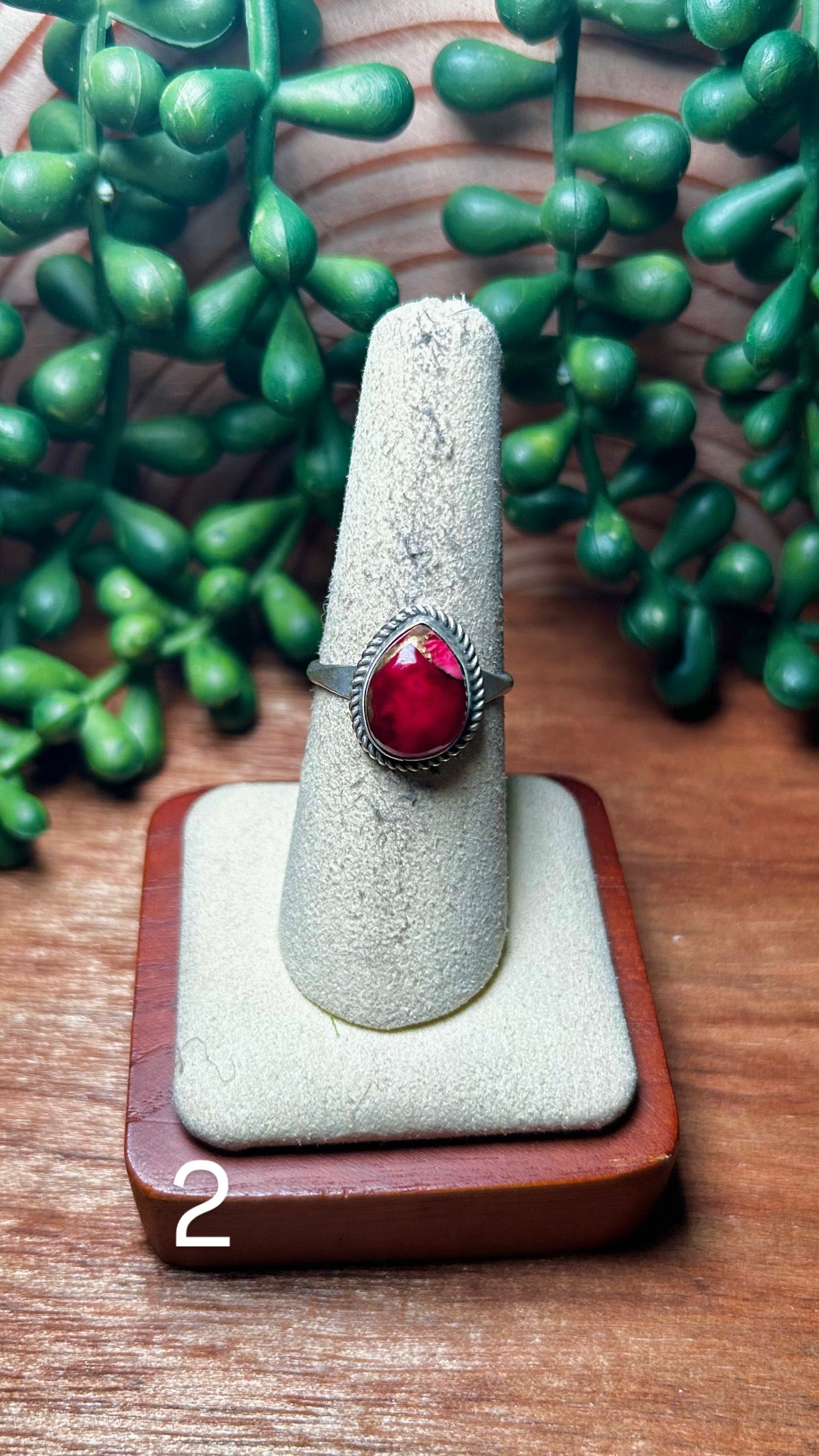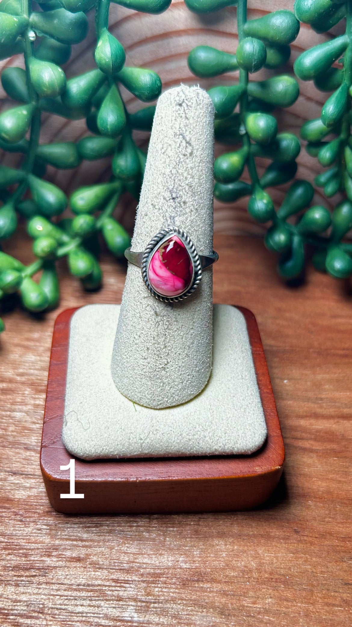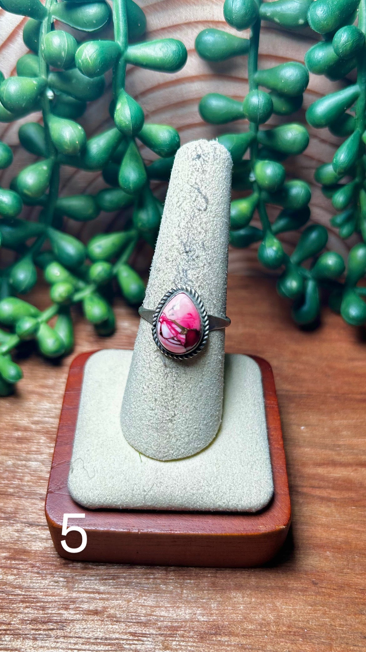Navajo Made Rose Dahlia & Sterling Silver Ring. It measures 5/8 of an inch long and 1/2 of an inch wide. Signed by the artist and stamped sterling silver.