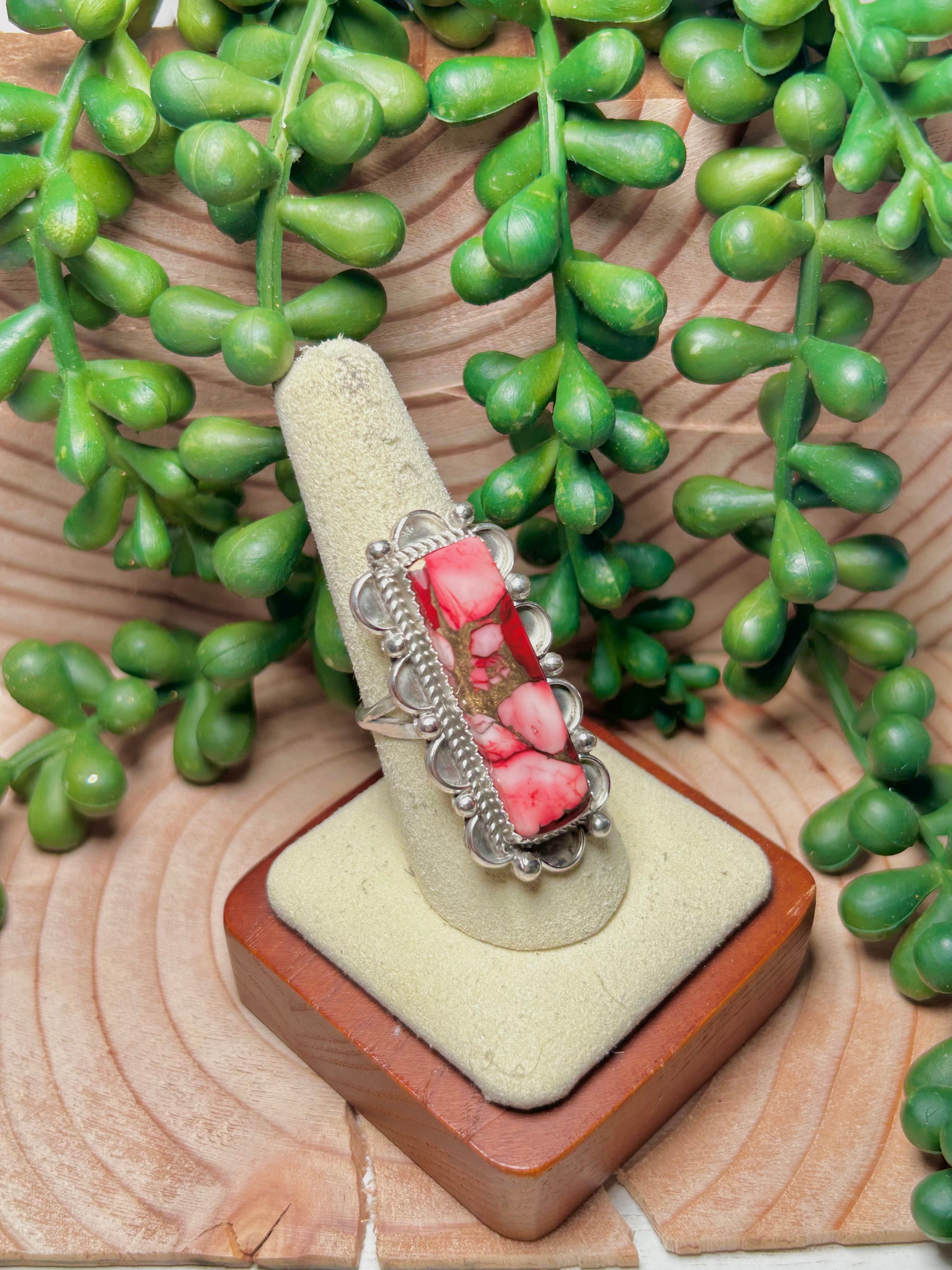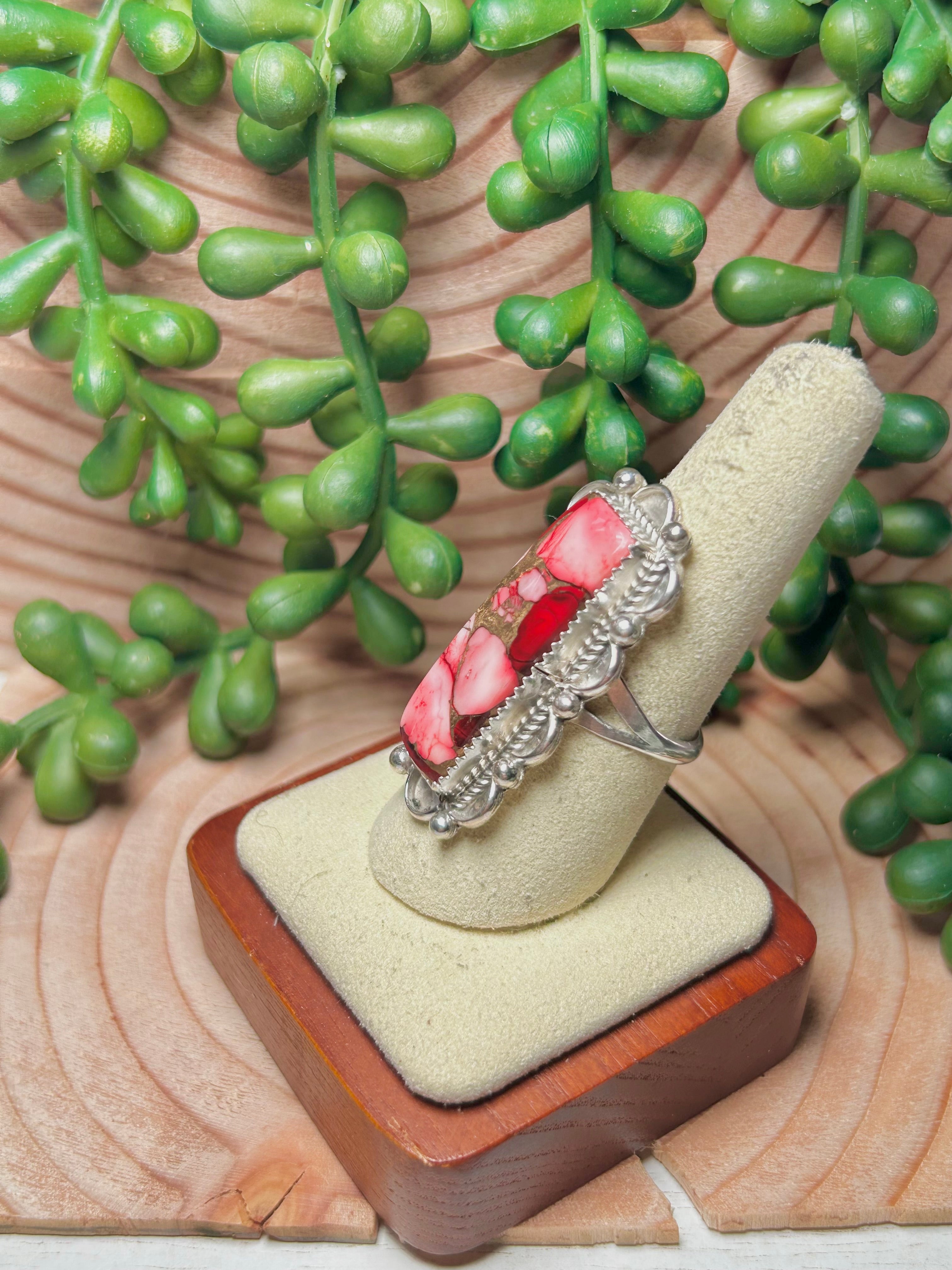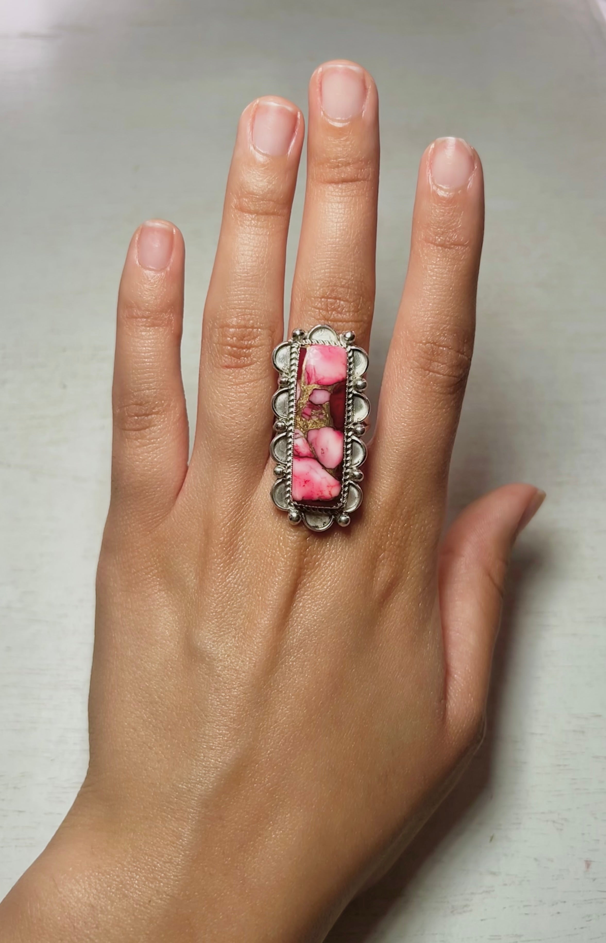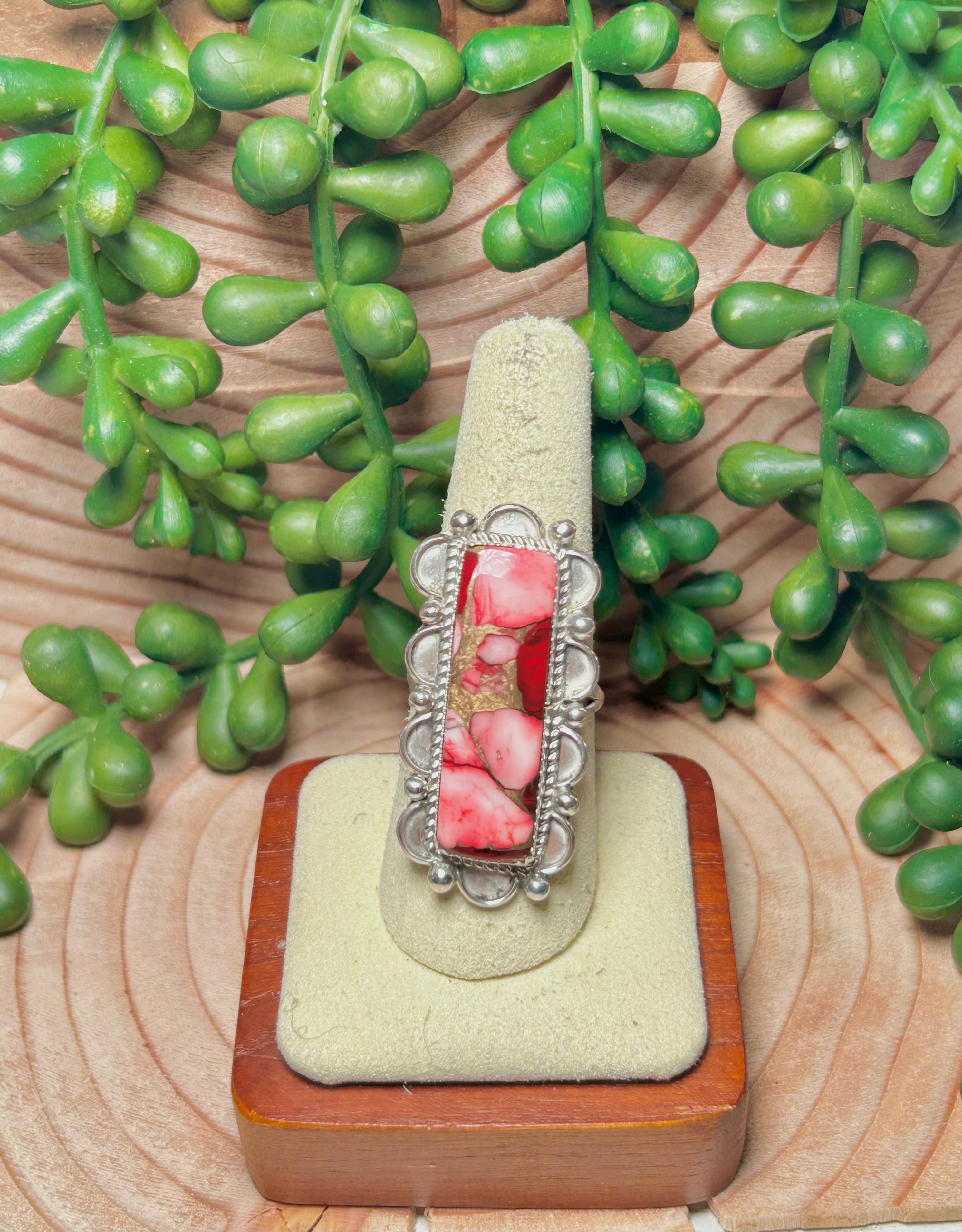 Navajo Made Rose Dahlia & Sterling Sliver Ring Size 8.5. It measures 1 1/2 inches long and 3/4 of an inch wide and Signed by the artist and stamped sterling silver.