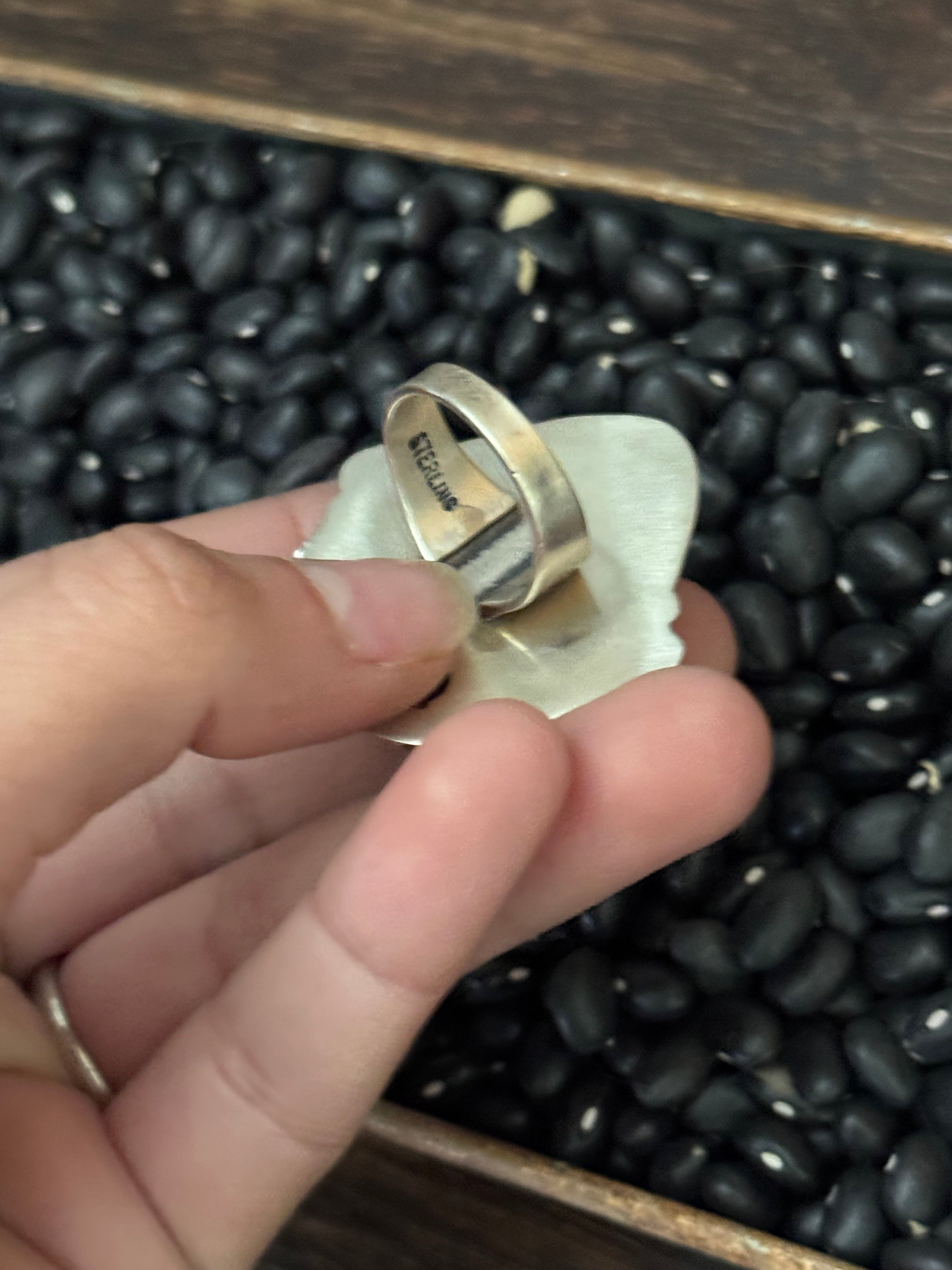 A stunning piece. Navajo Made Royston Turquoise and Sterling Silver Ring Size 7. It measures 1 5/8 inches long and 1 1/2 inches wide. Signed by the artist and stamped sterling silver.