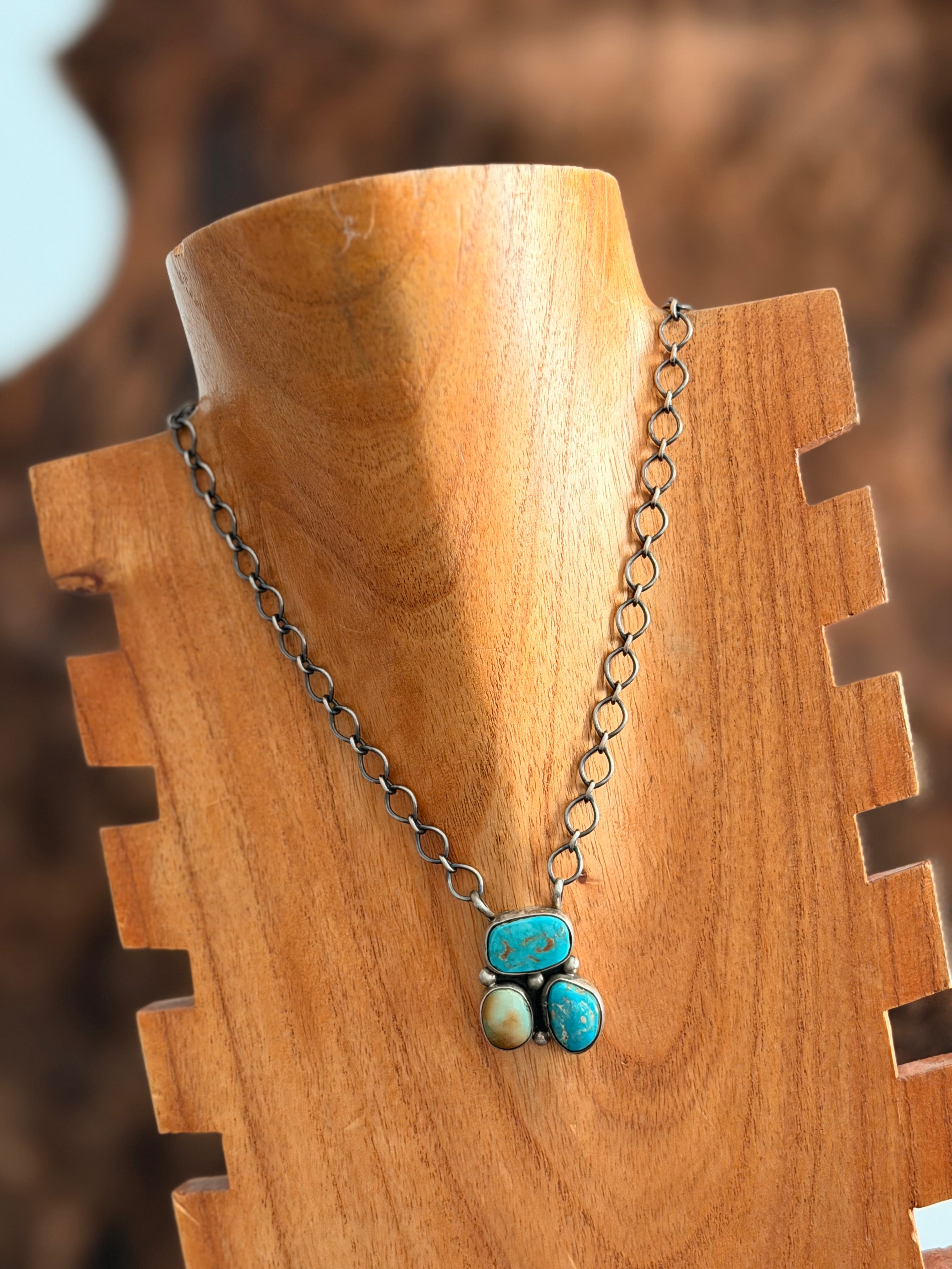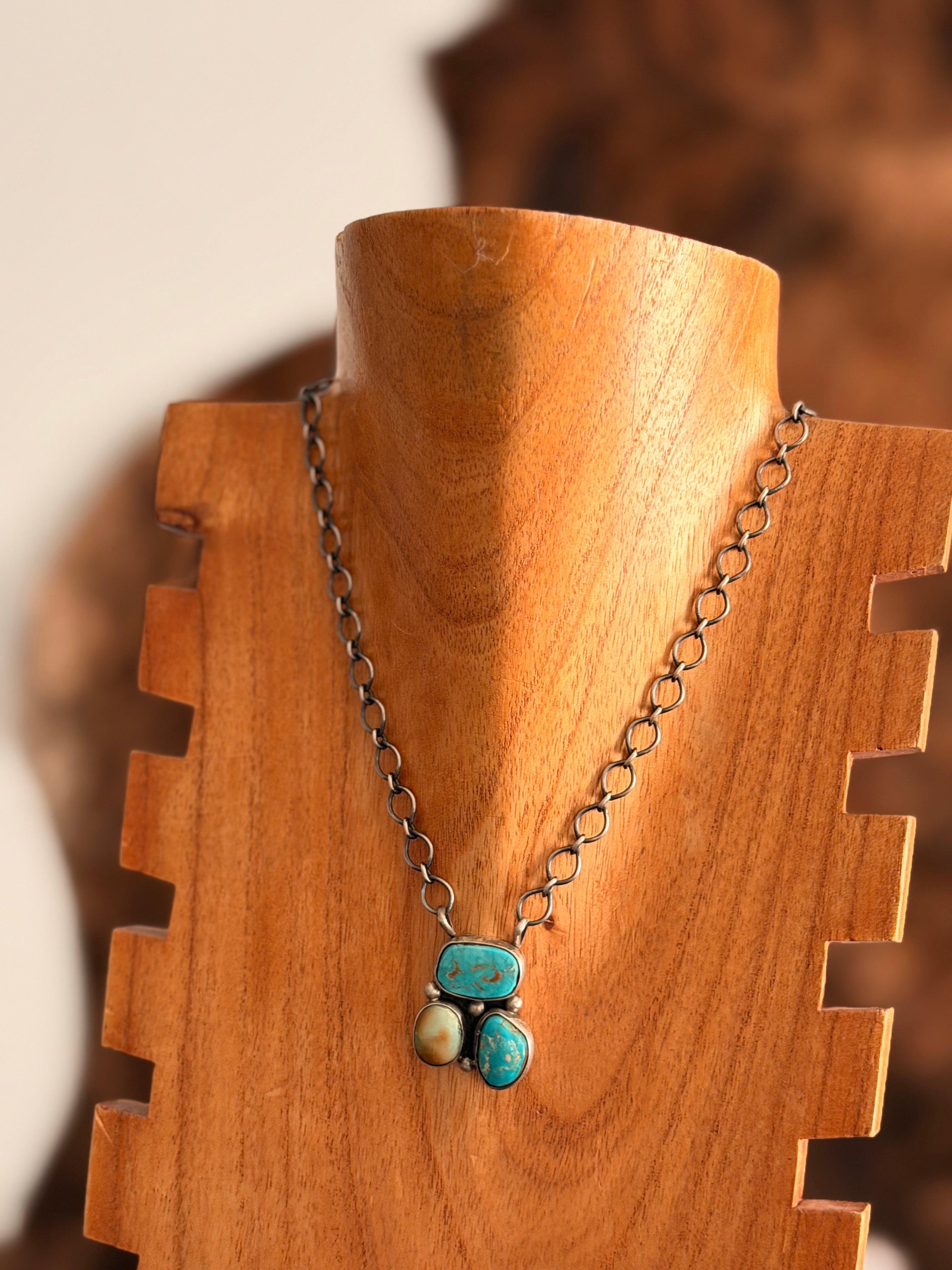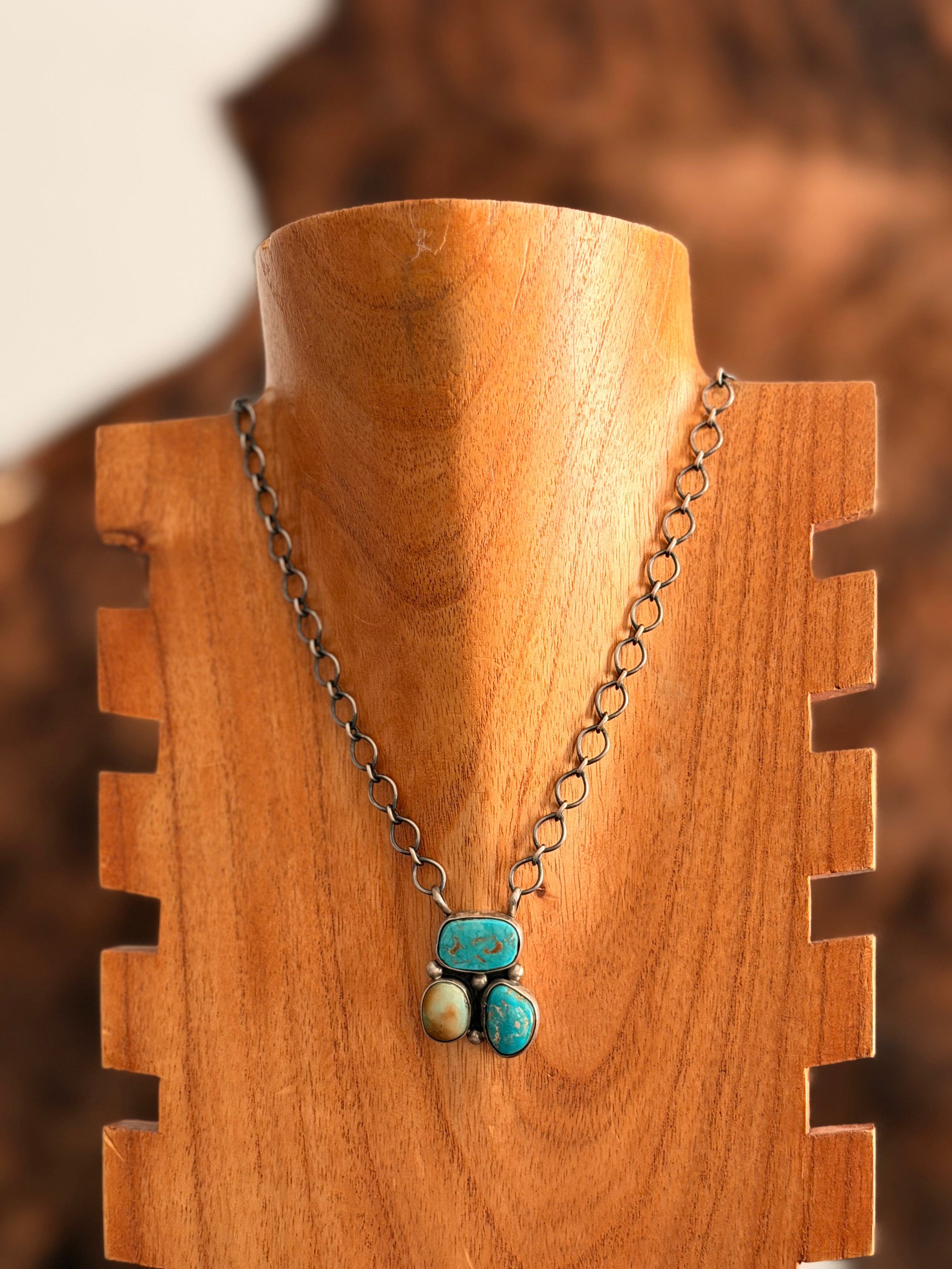 Navajo Made Royston Turquoise & Sterling Silver Cluster Necklace. It measures 21 inches long with hang while the chain measures 18 inches long. Signed by the artist and stamped sterling silver.