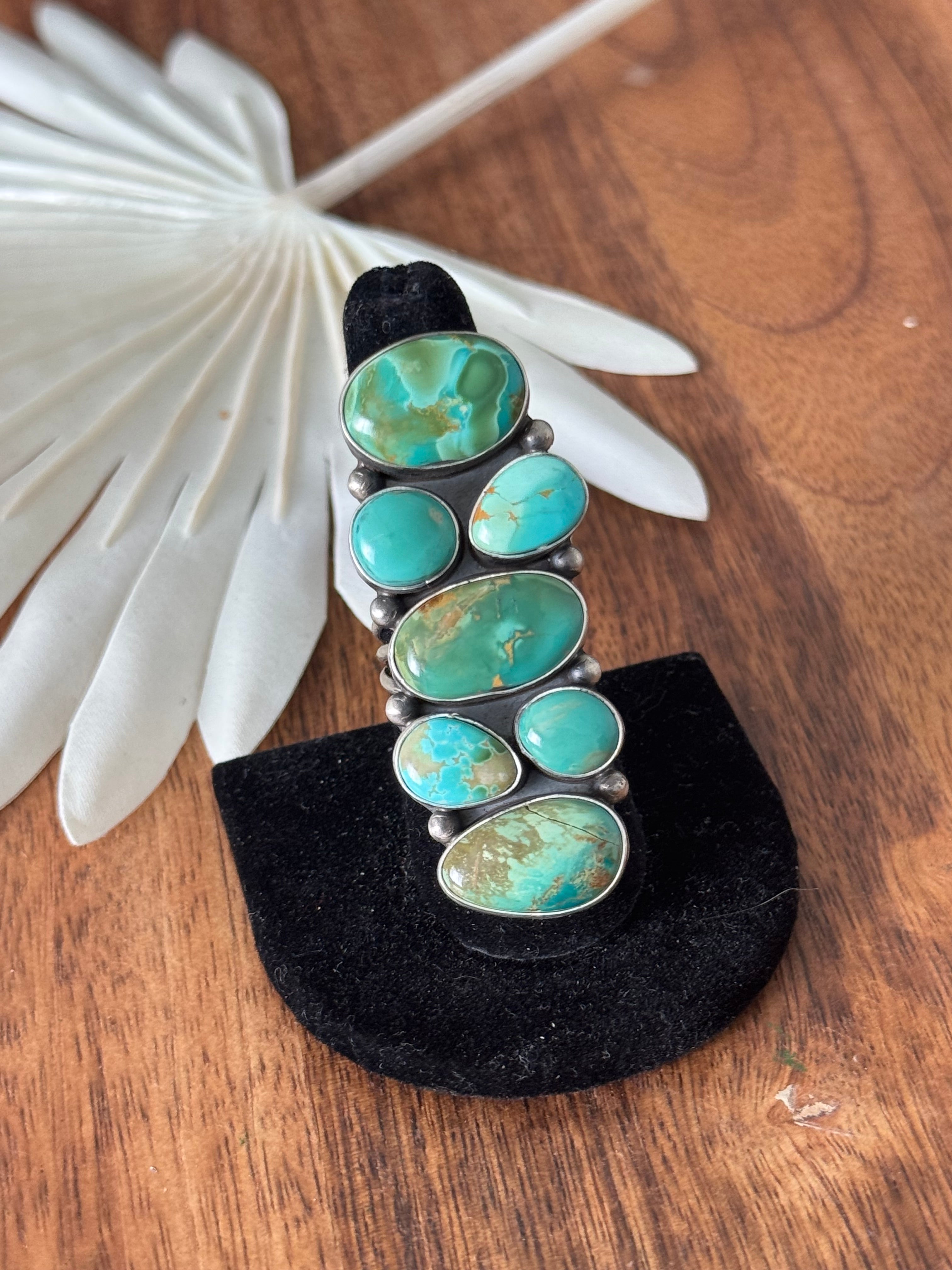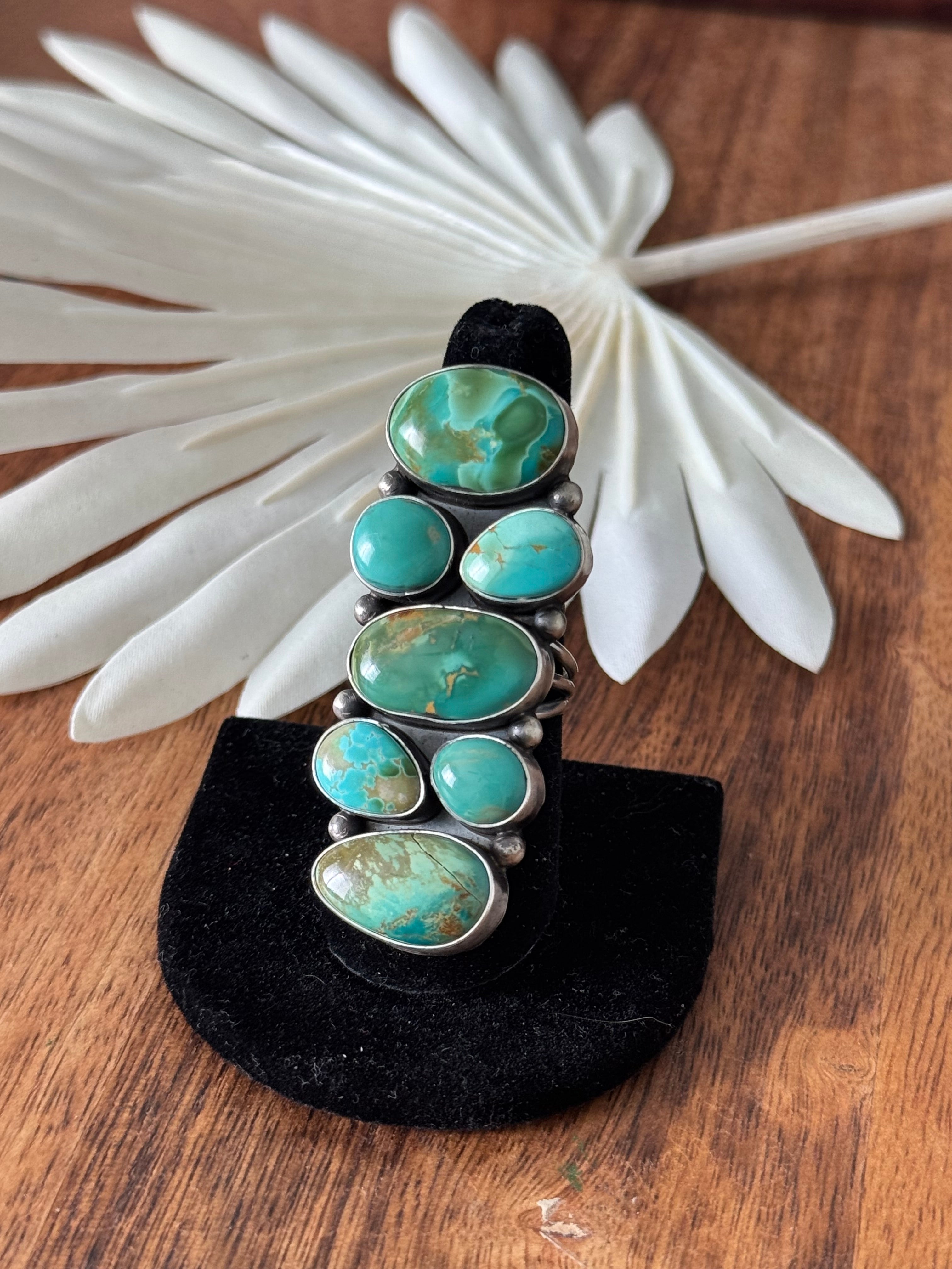 Navajo Made Royston Turquoise & Sterling Silver Cluster Ring Size 8.5. It measures 2 1/8 inches long and 3/4 of an inch wide. Signed by the artist and stamped sterling silver.