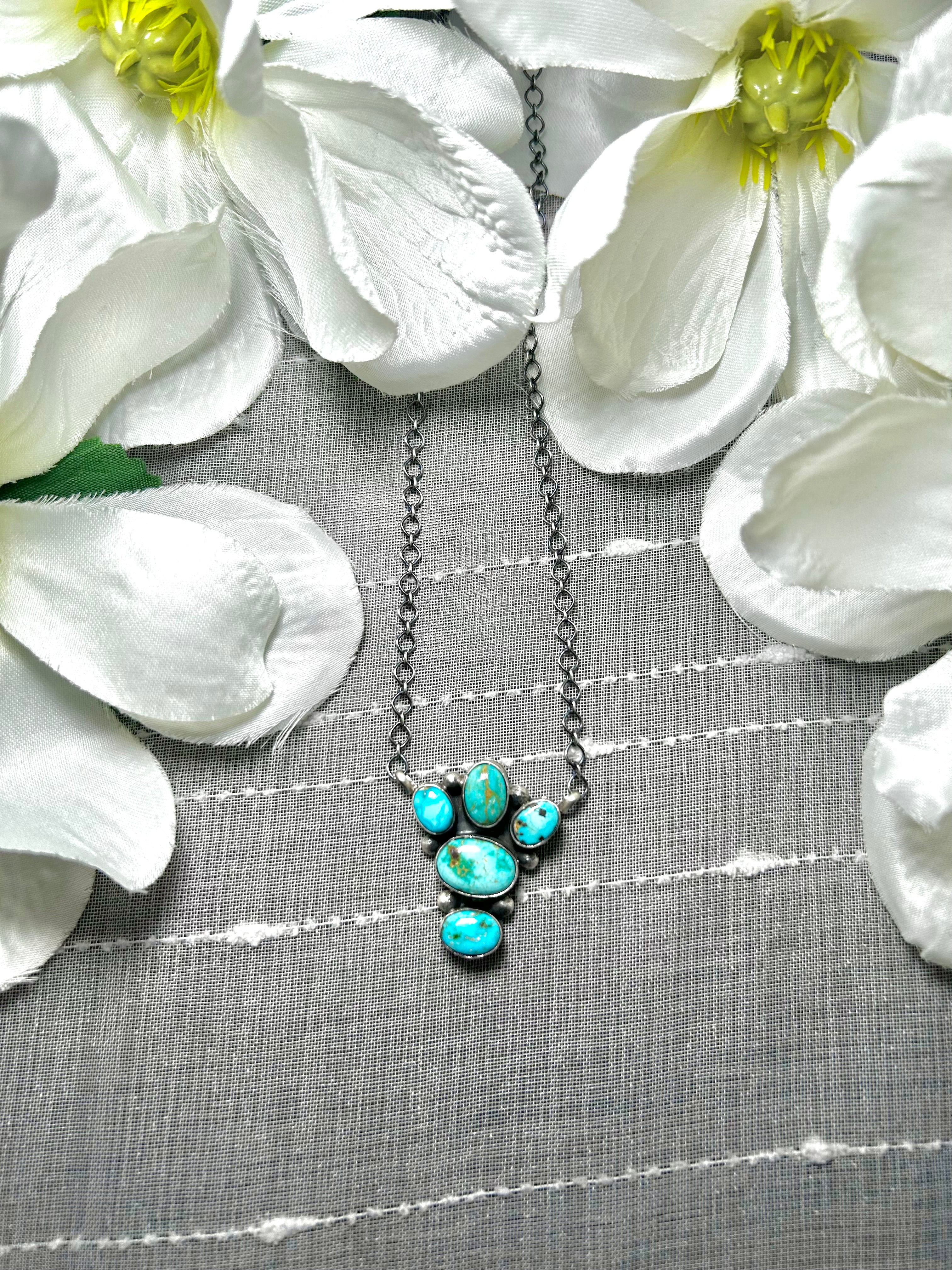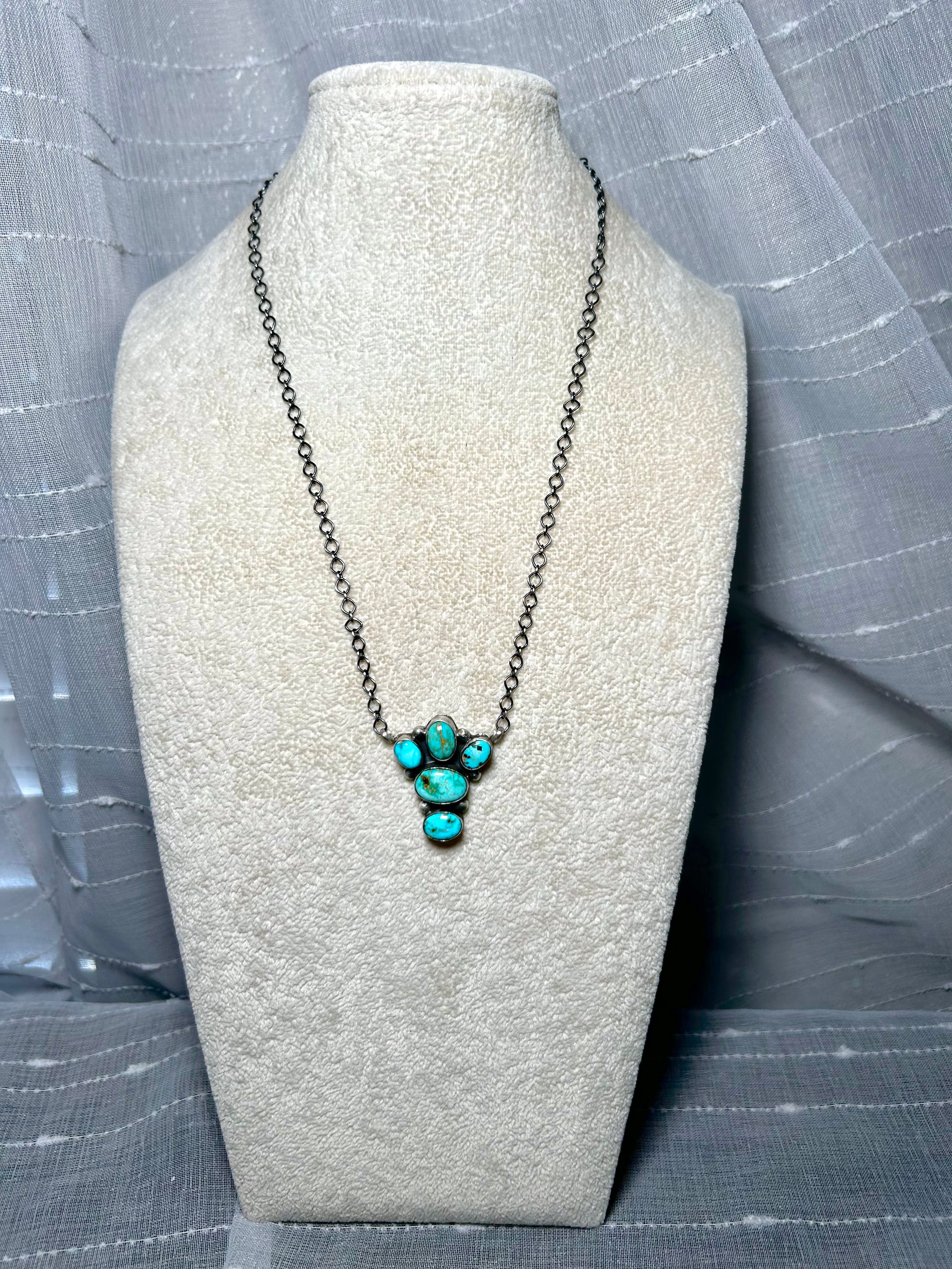 Navajo Made Royston Turquoise & Sterling Silver Necklace. It measures 20 3/4 inches long with hang while the chain measures 18 1/2 inches long. Signed by the artist and stamped sterling silver.