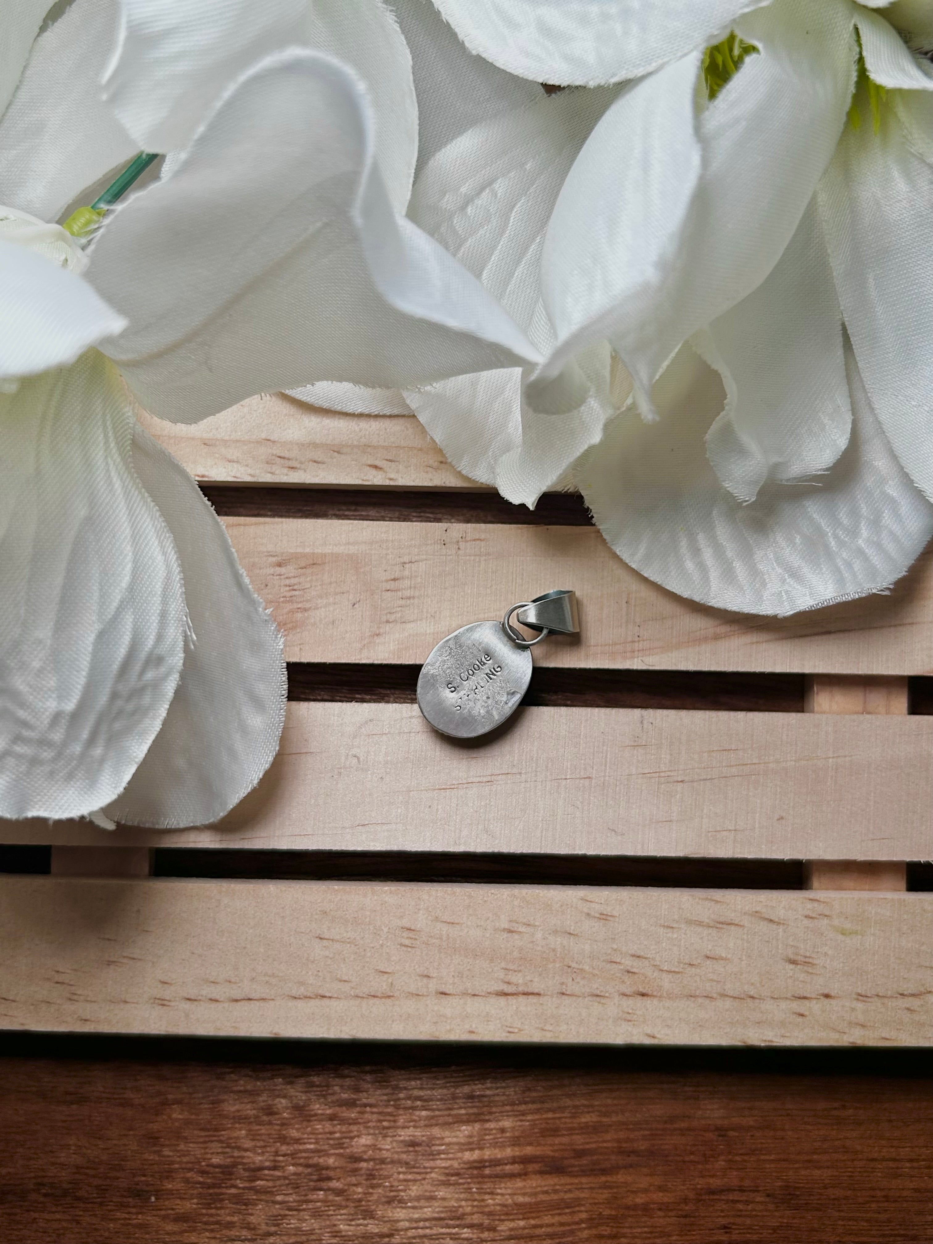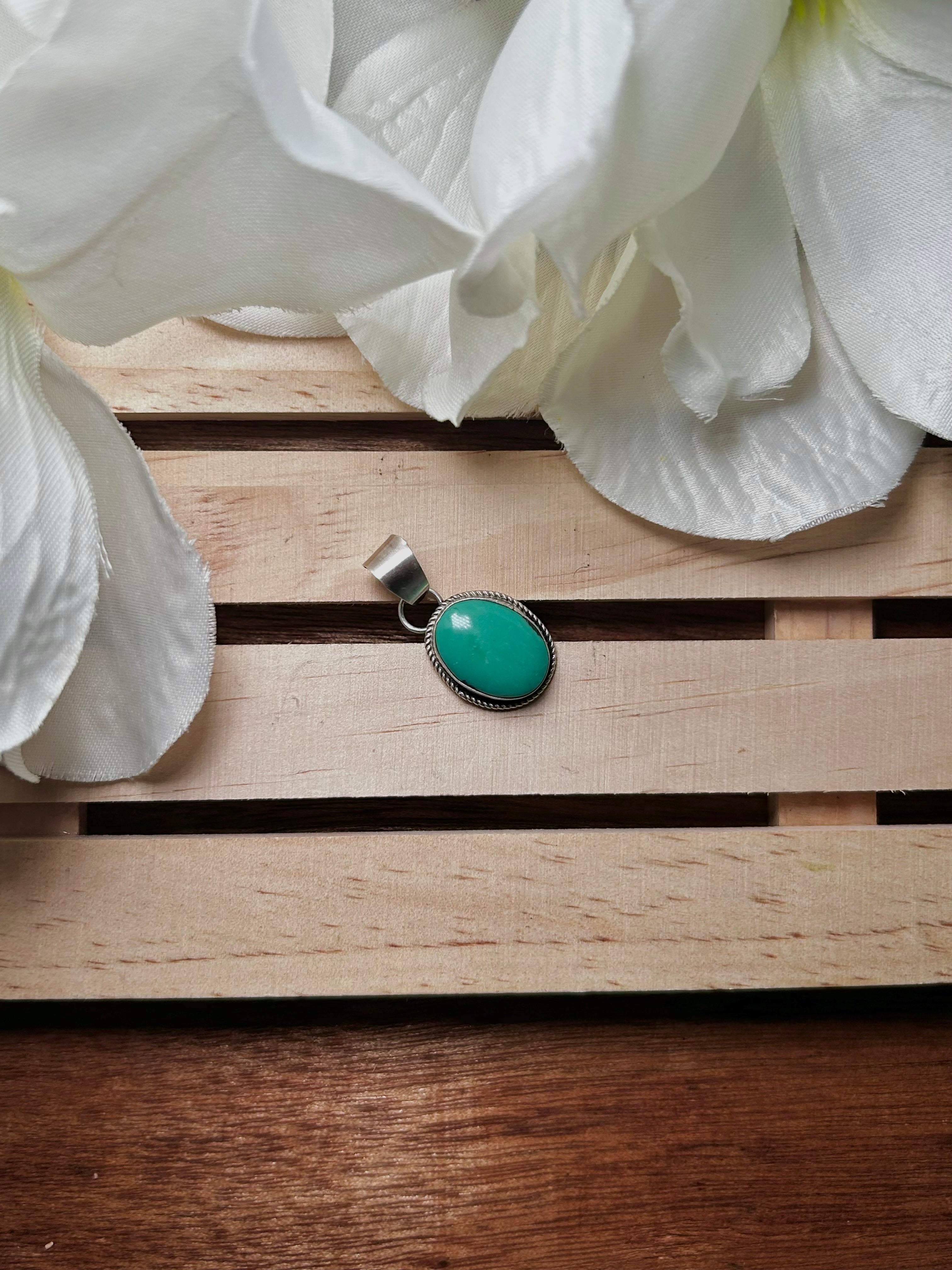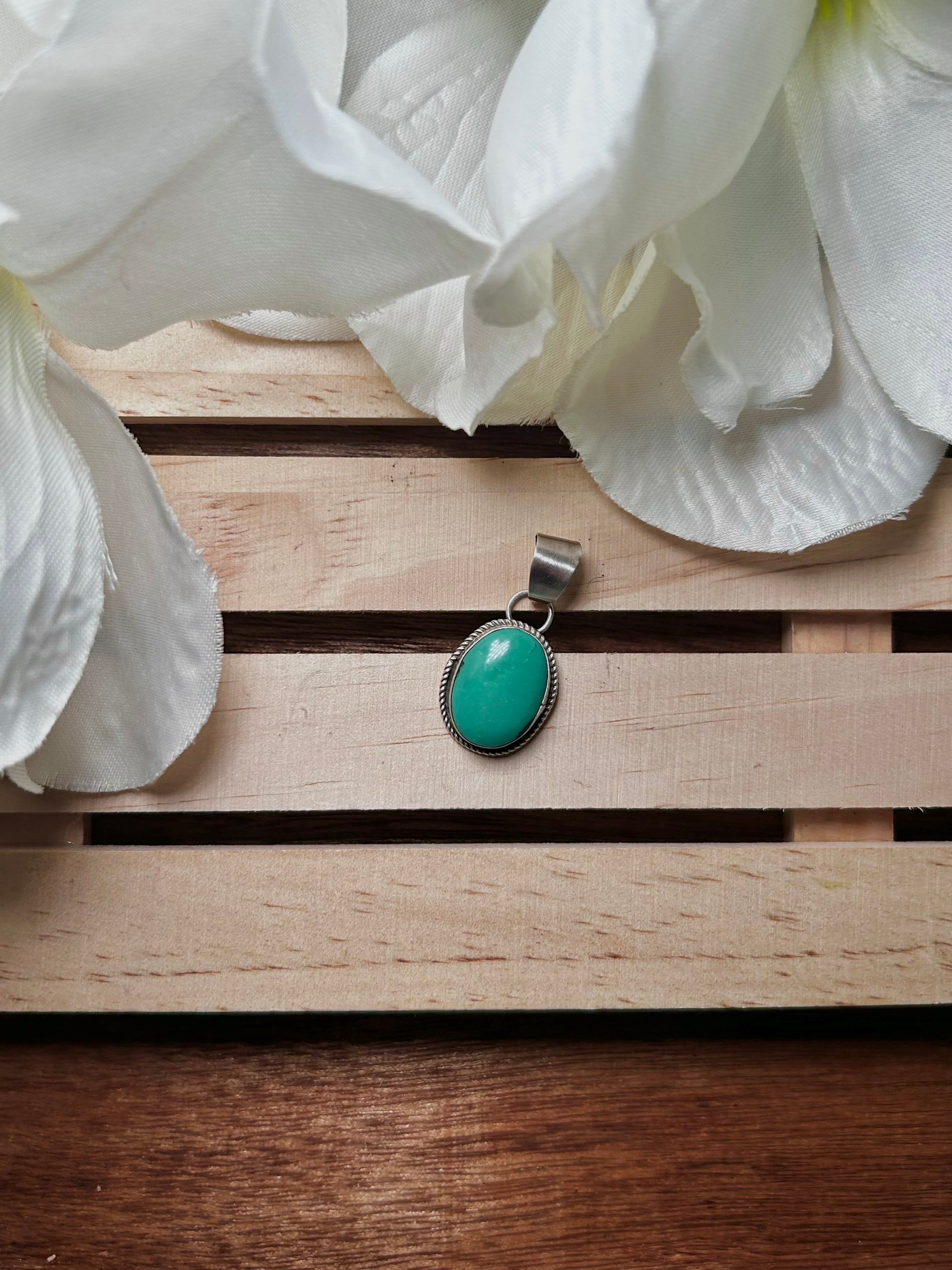 Navajo Made Hubei Turquoise & Sterling Silver Pendant. It measures 1 1/4 inches long and 5/8 of an inch wide. Pendant Only!! Signed by the artist and stamped sterling silver.