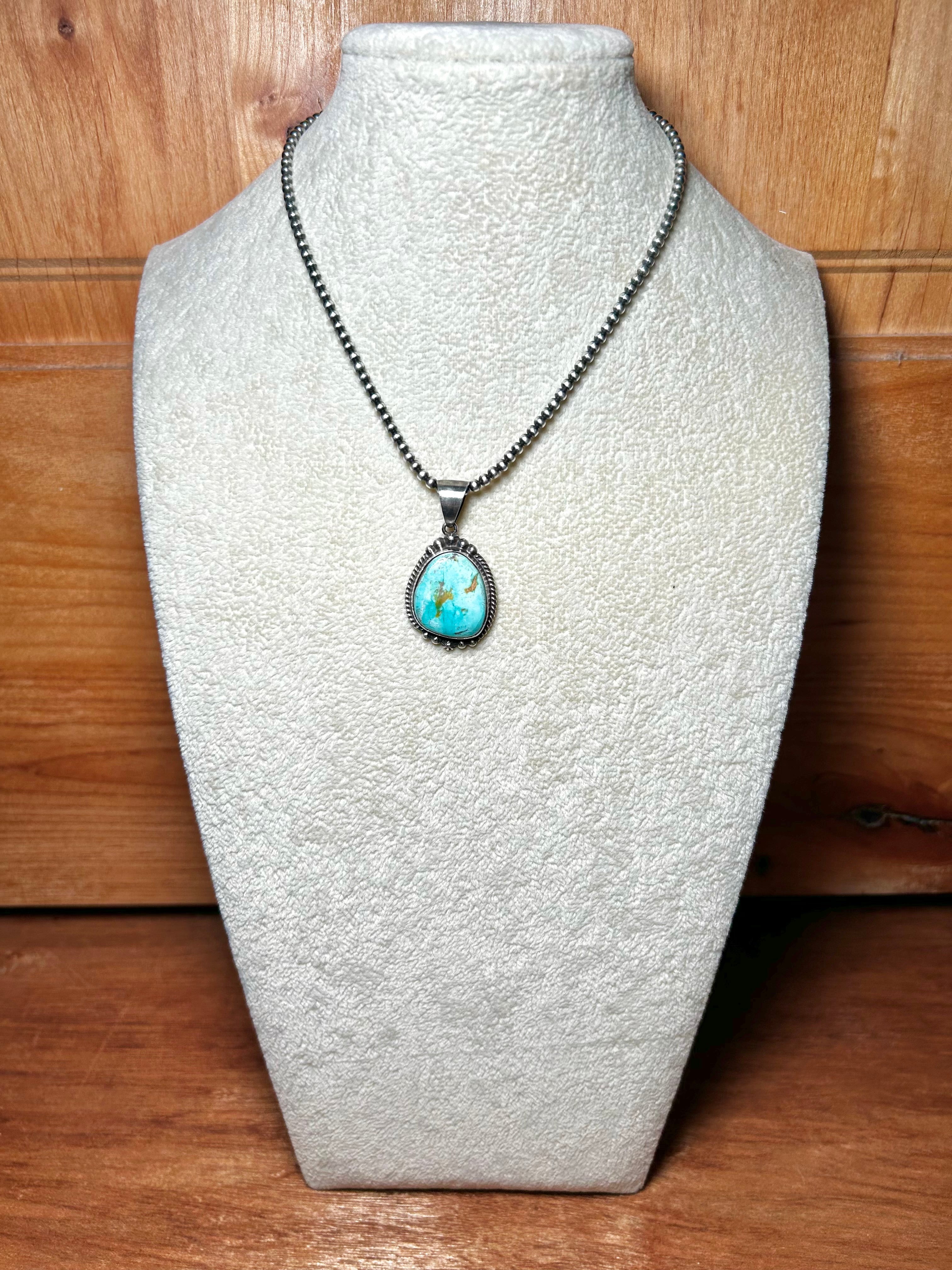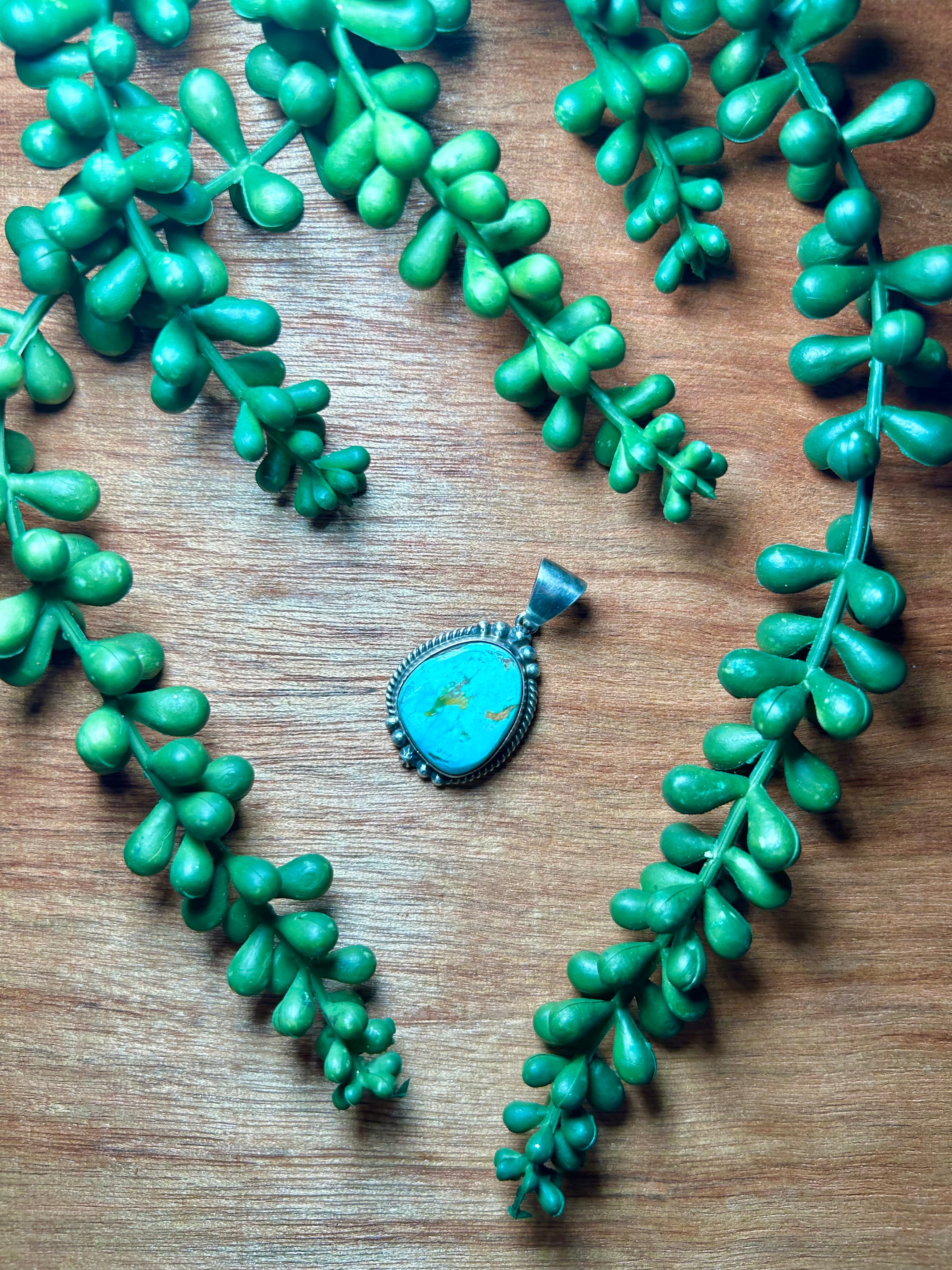 Navajo Made Royston Turquoise & Sterling Silver Pendant. It measures 1 3/4 inches long and 1 inch wide. Pendant Only! Signed by the artist and stamped sterling silver.