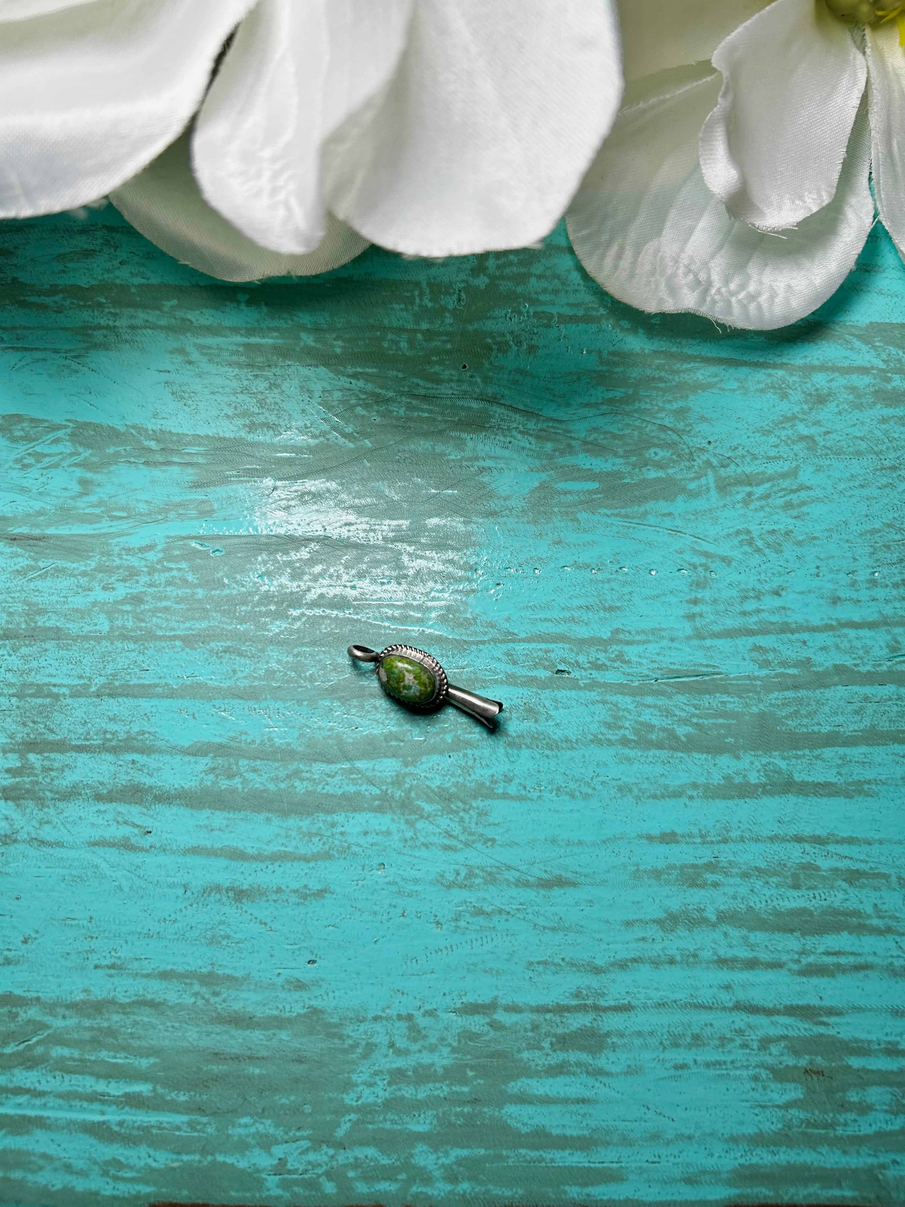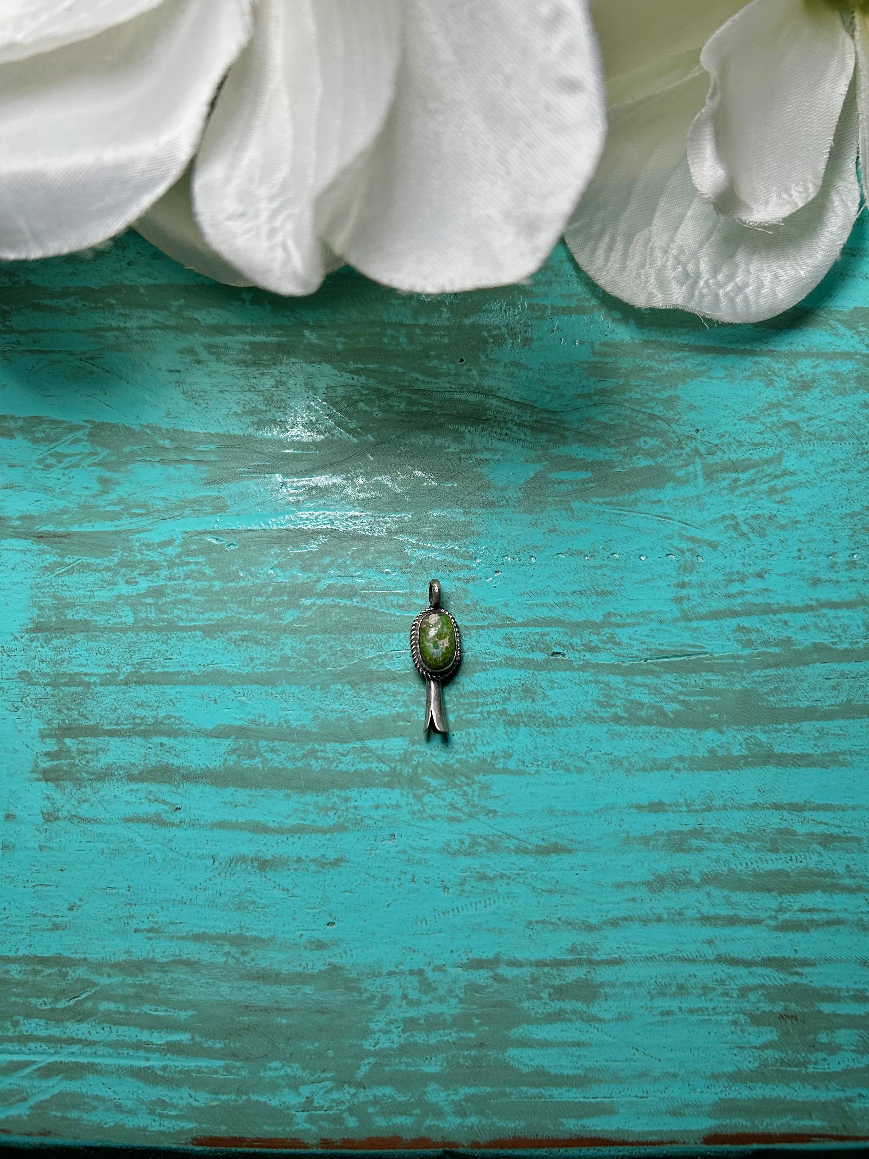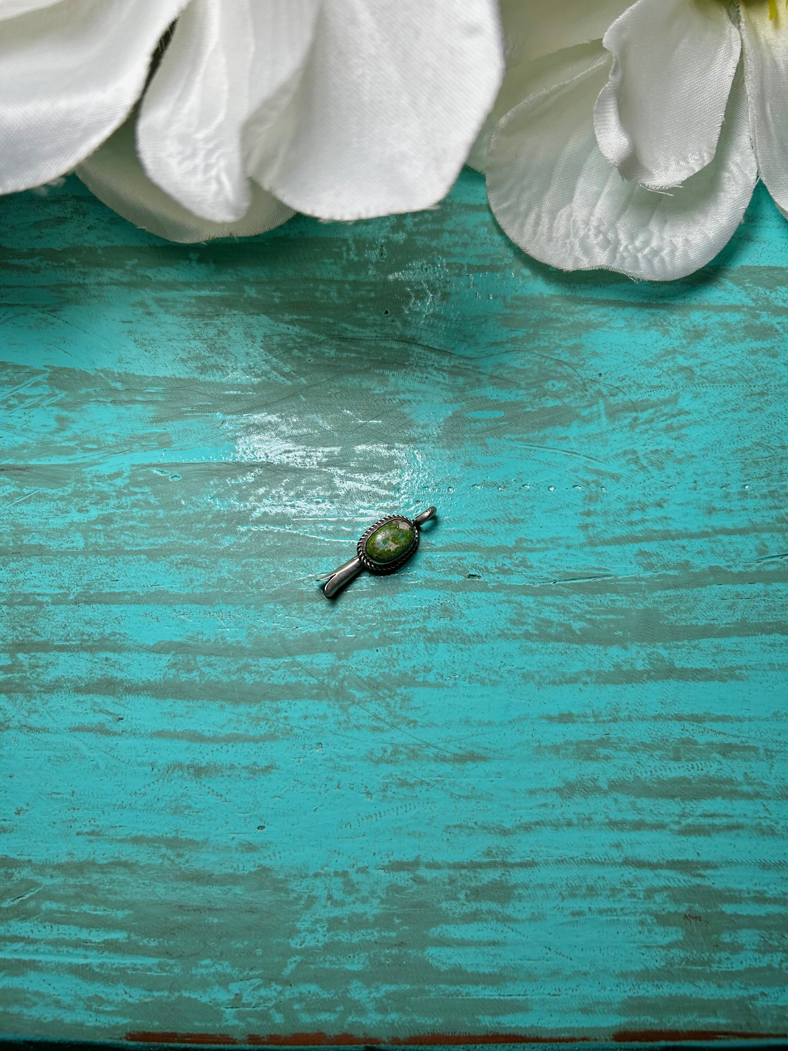 Navajo Made Sonoran Mountain Turquoise & Sterling Silver Pendant. It measures 1 1/8 inches long and 3/8 of an inch wide. Signed and stamped the artist. Pendant only!