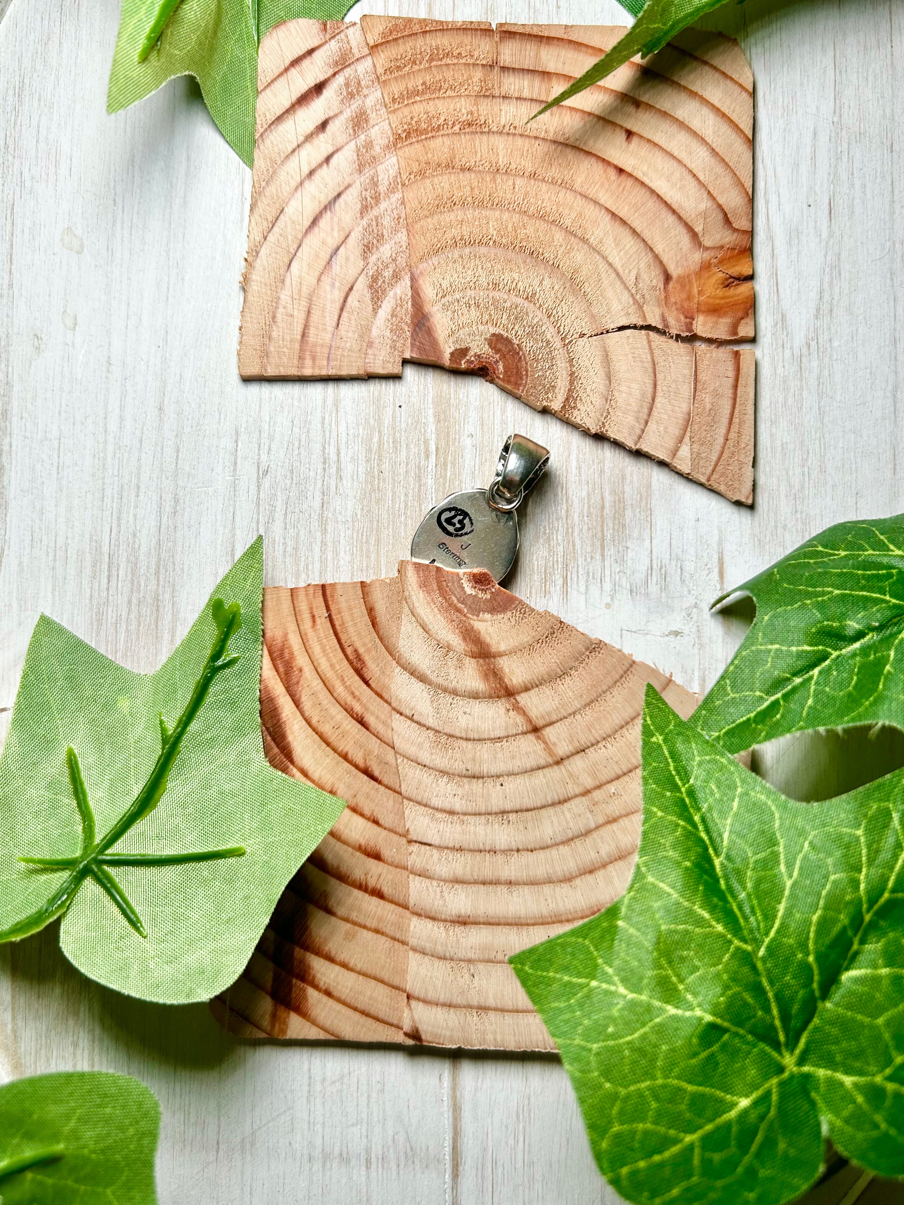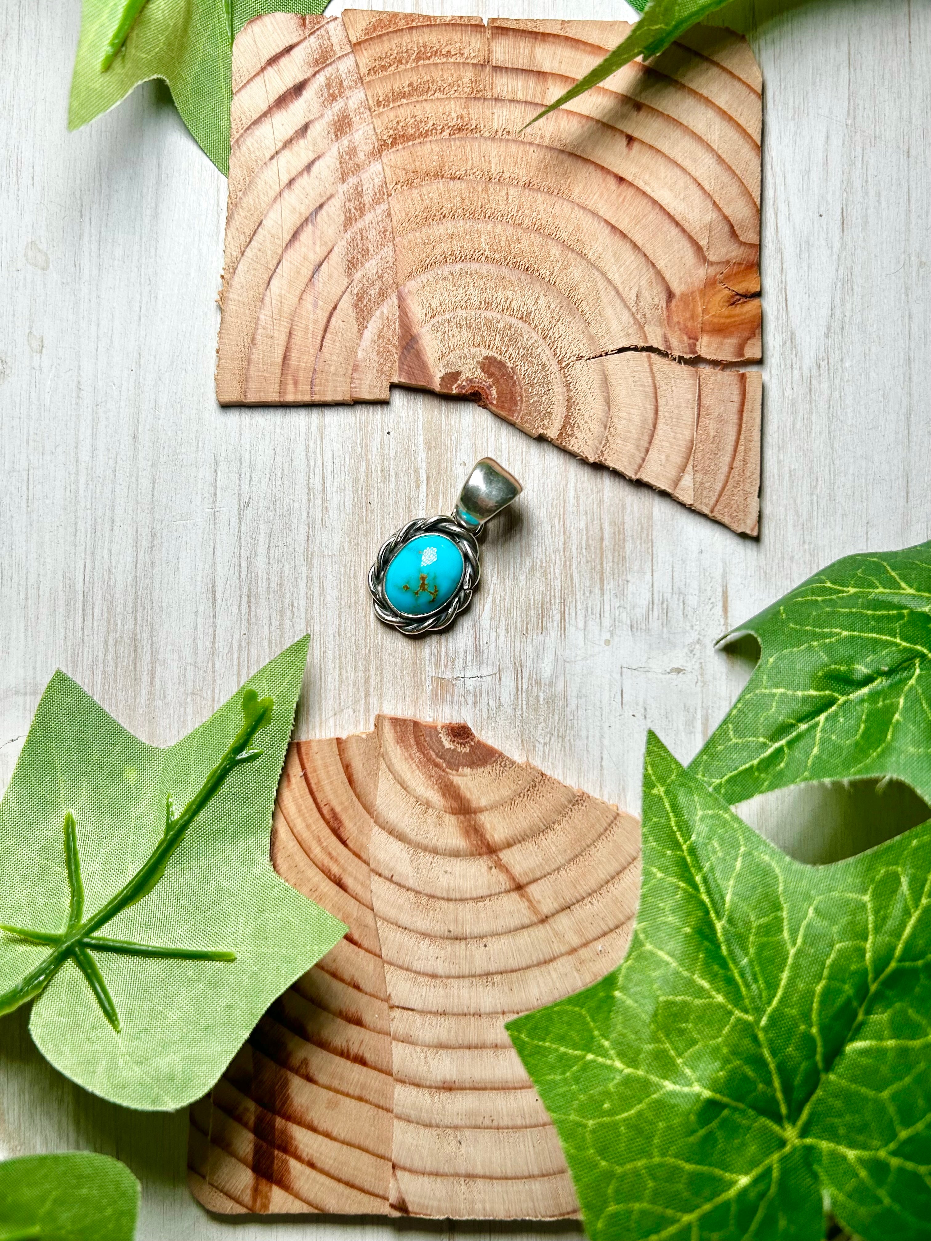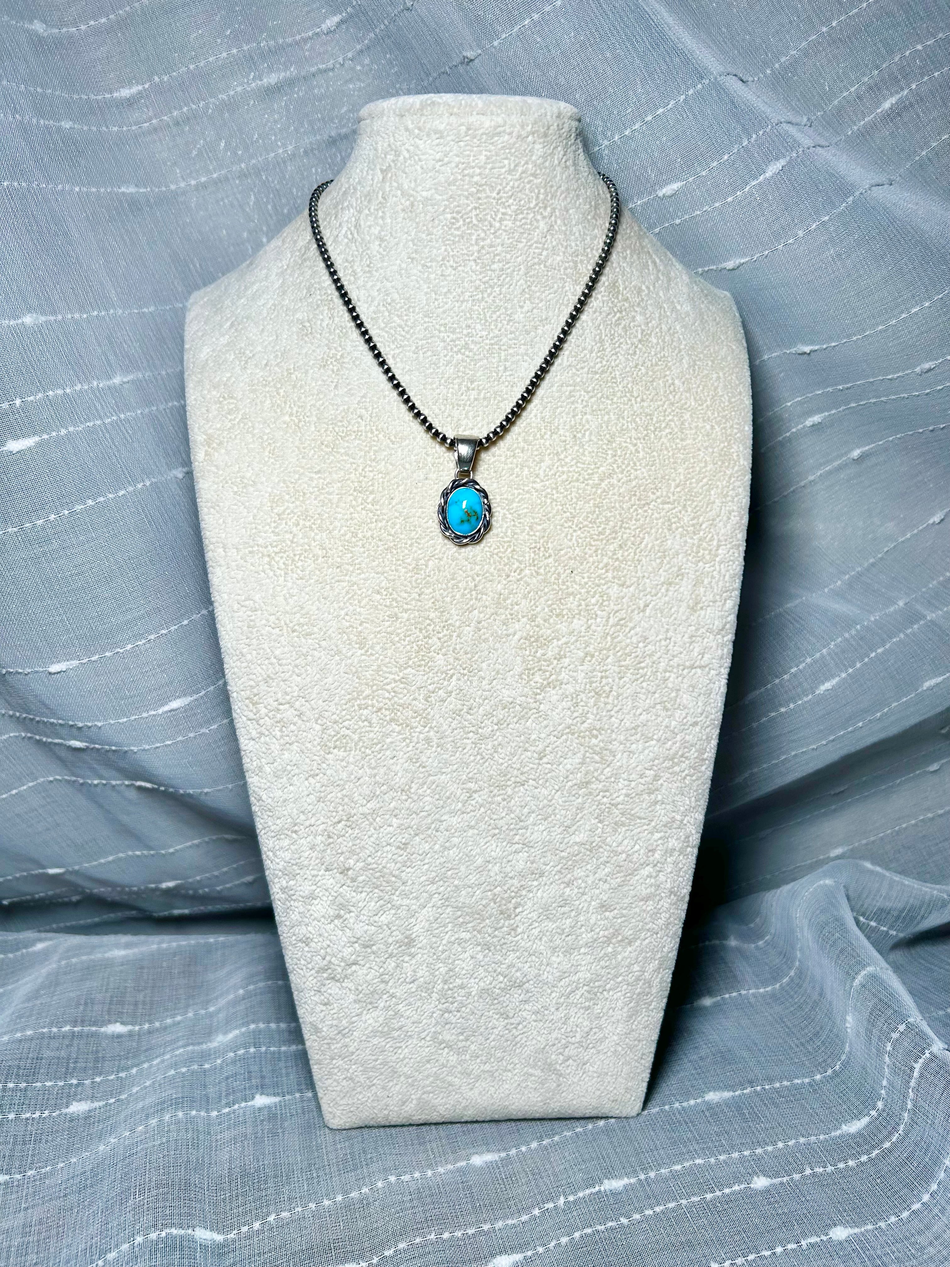 Navajo Made Kingman Turquoise & Sterling Silver Pendant. It measures 1 1/4 inches long and 5/8 of an inch wide. Pendant Only! Signed by the artist and stamped sterling silver.