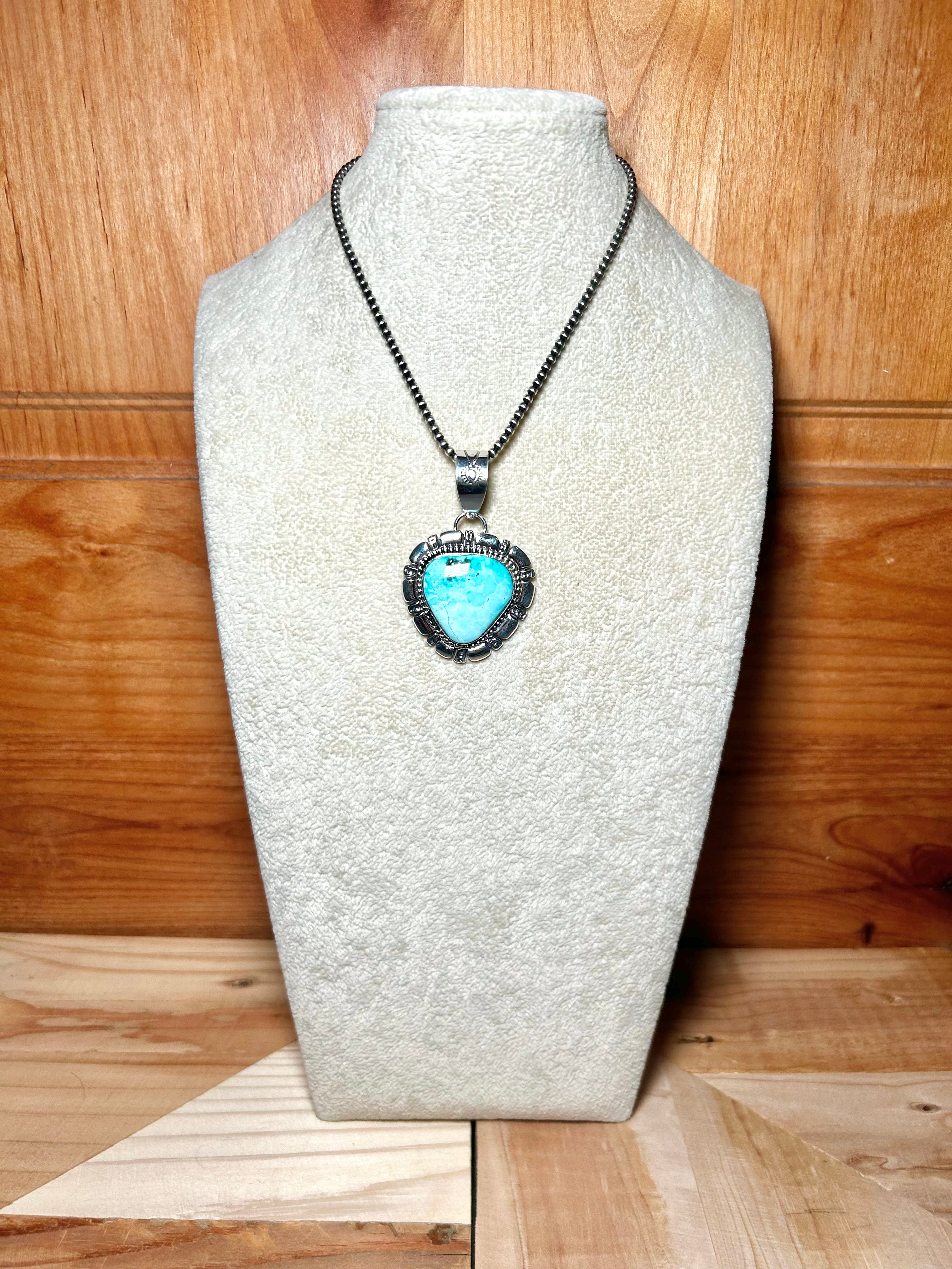 Navajo Made Royston Turquoise & Sterling Silver Pendant. It measures 2 1/2 inches long and 1 5/8 inches wide. Pendant Only! Signed by the artist and stamped sterling silver.