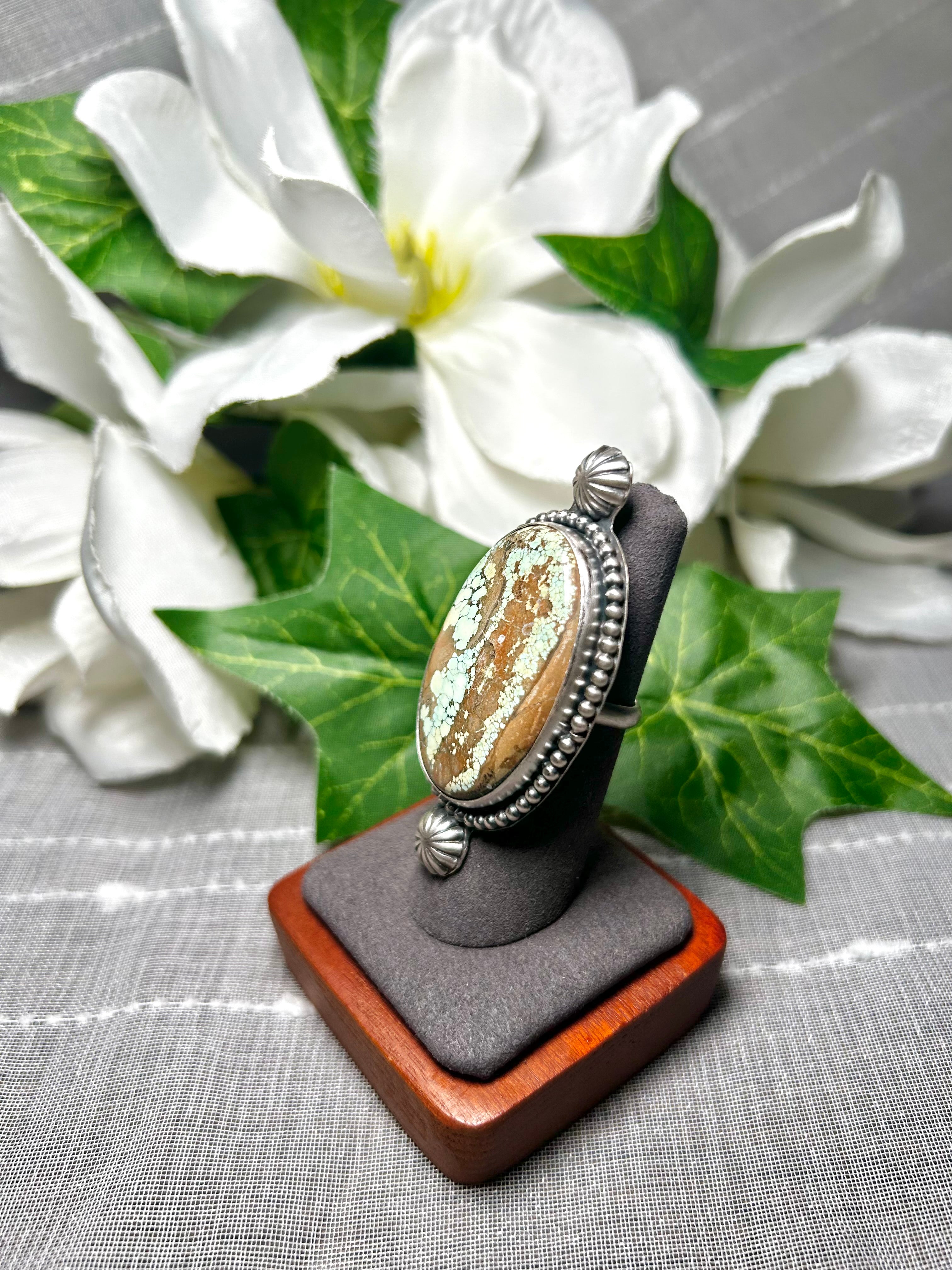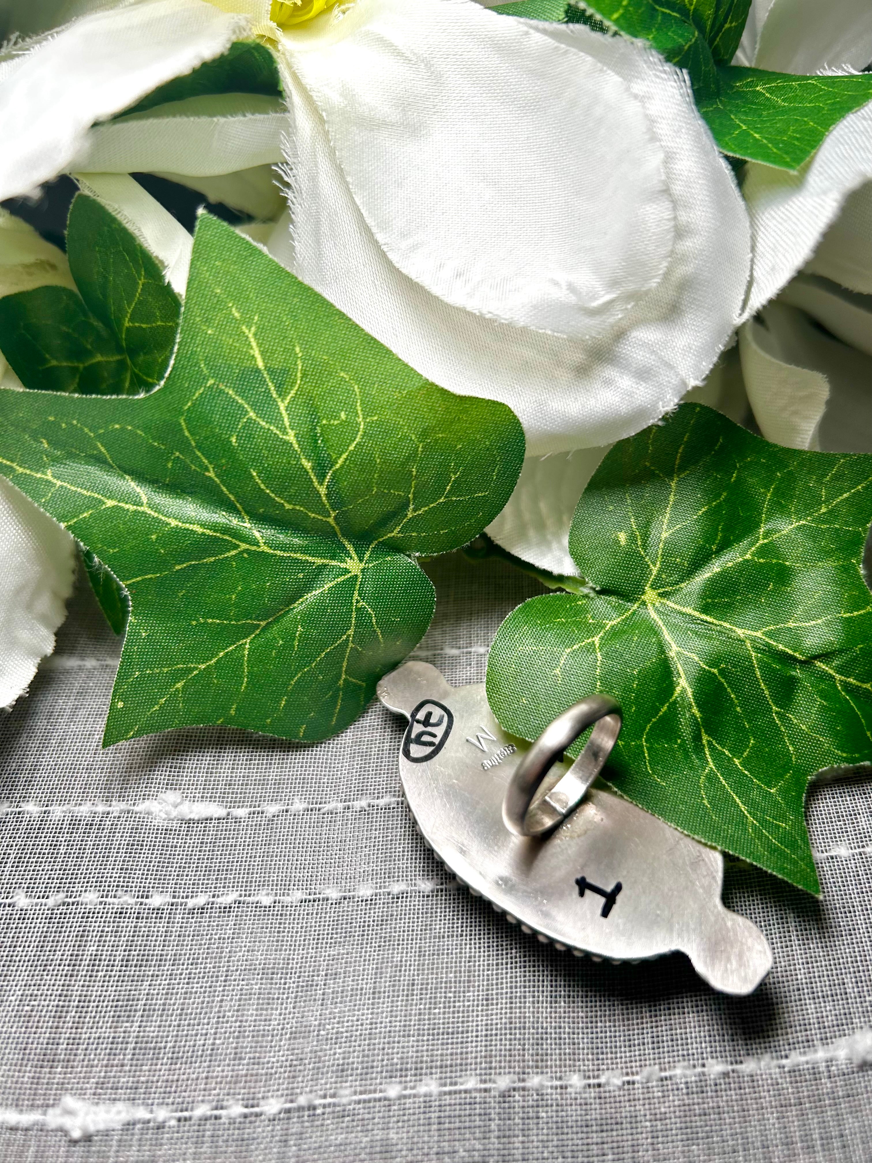 Navajo Made Carico Lake Turquoise & Sterling Silver Ring Size 6. It measures 2 1/2 inches long and 1 1/4 inches wide. Signed by the artist and stamped sterling silver.