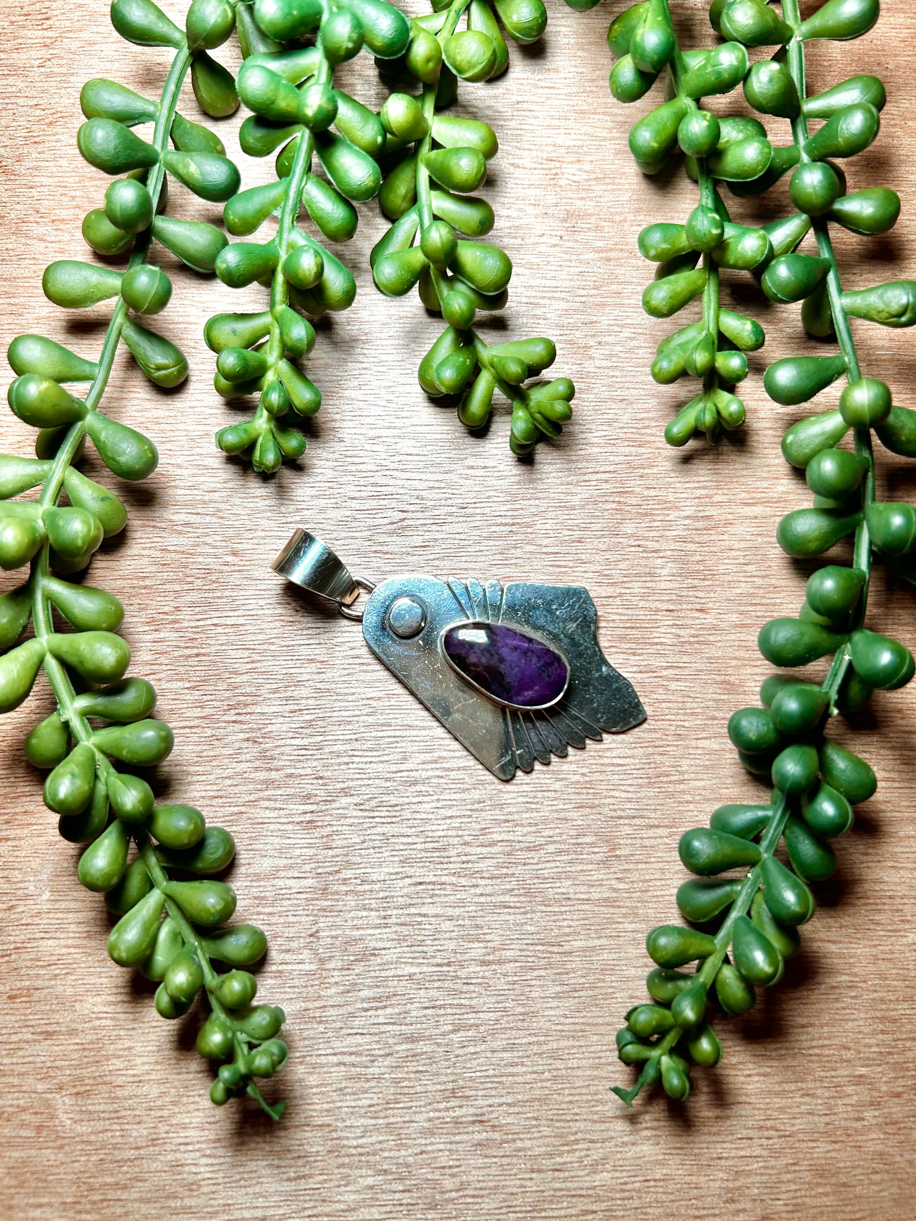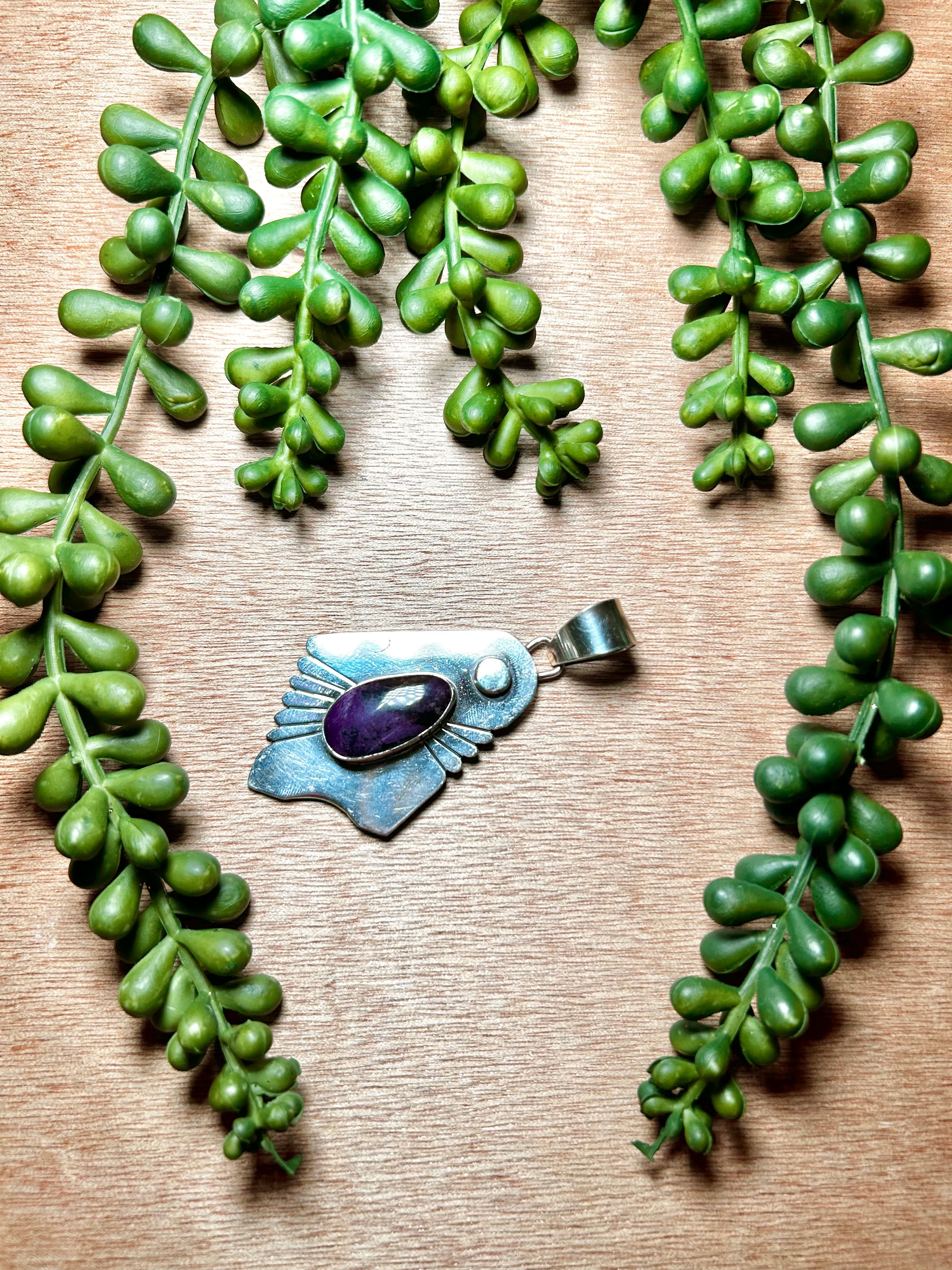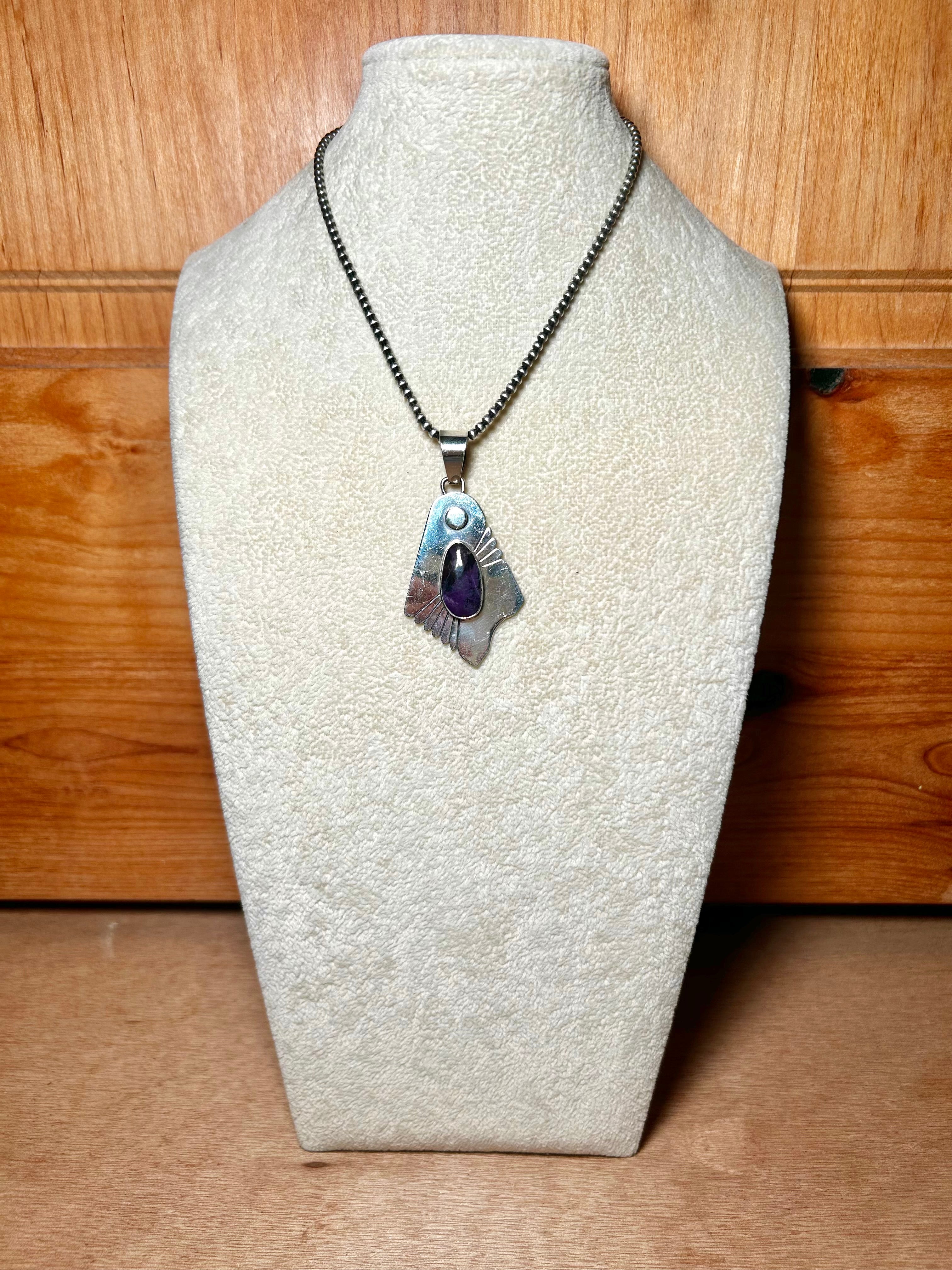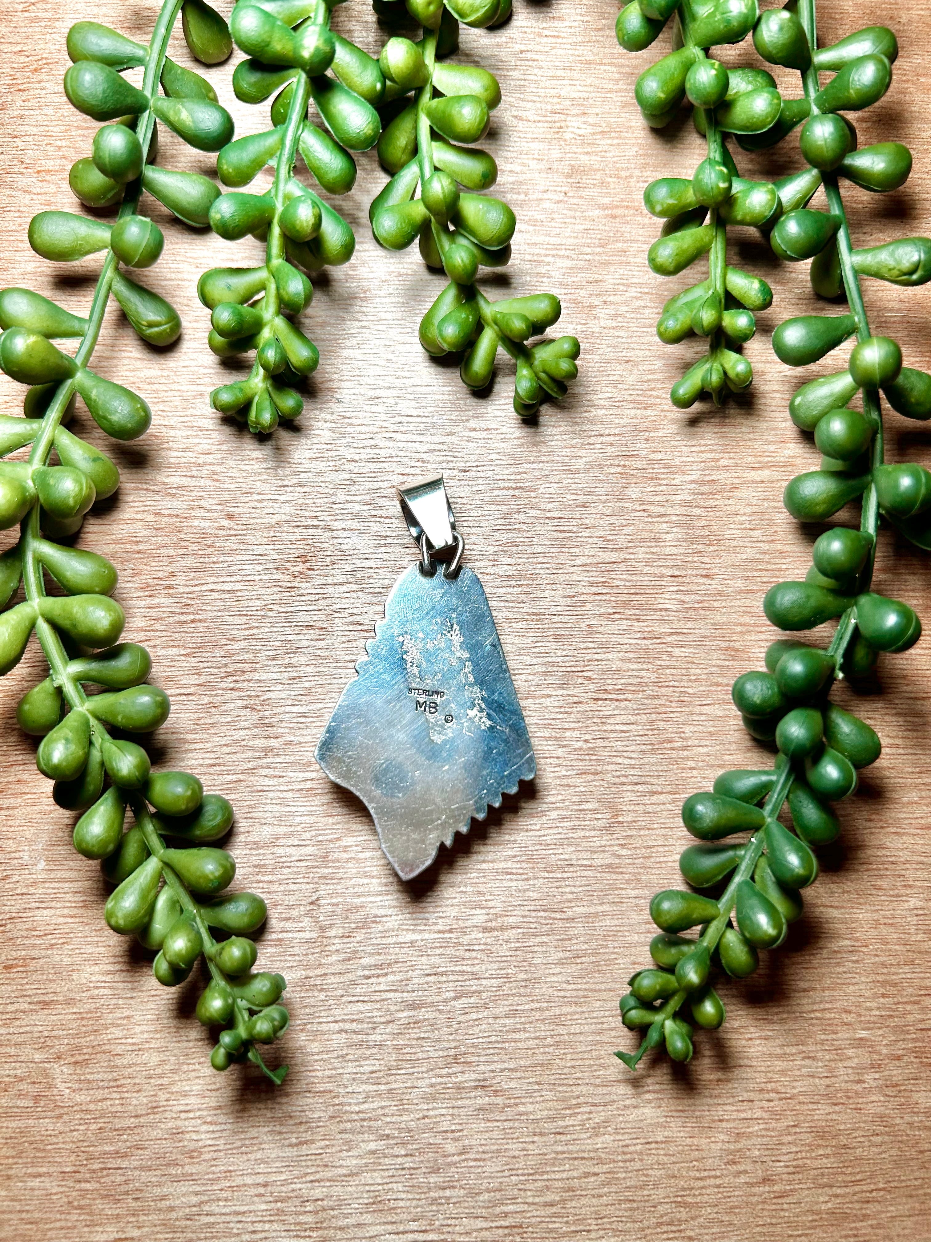Navajo Made Sngilite & Sterling Silver Pendant. It measures 2 5/8 inches long and 1 3/8 inches wide. Pendant Only! Signed by the artist and stamped sterling silver.