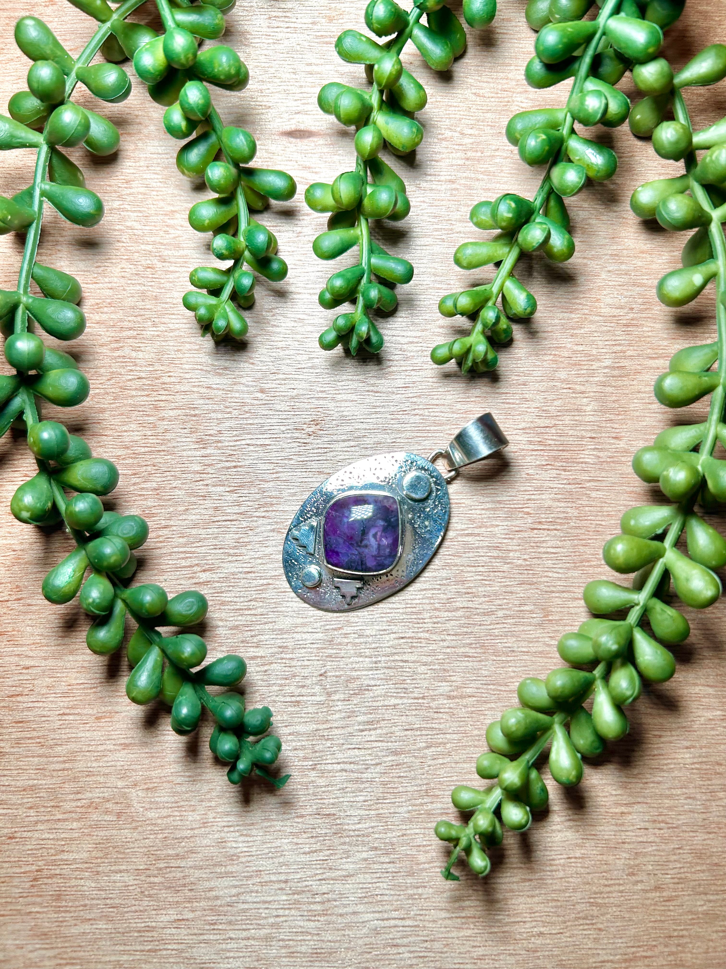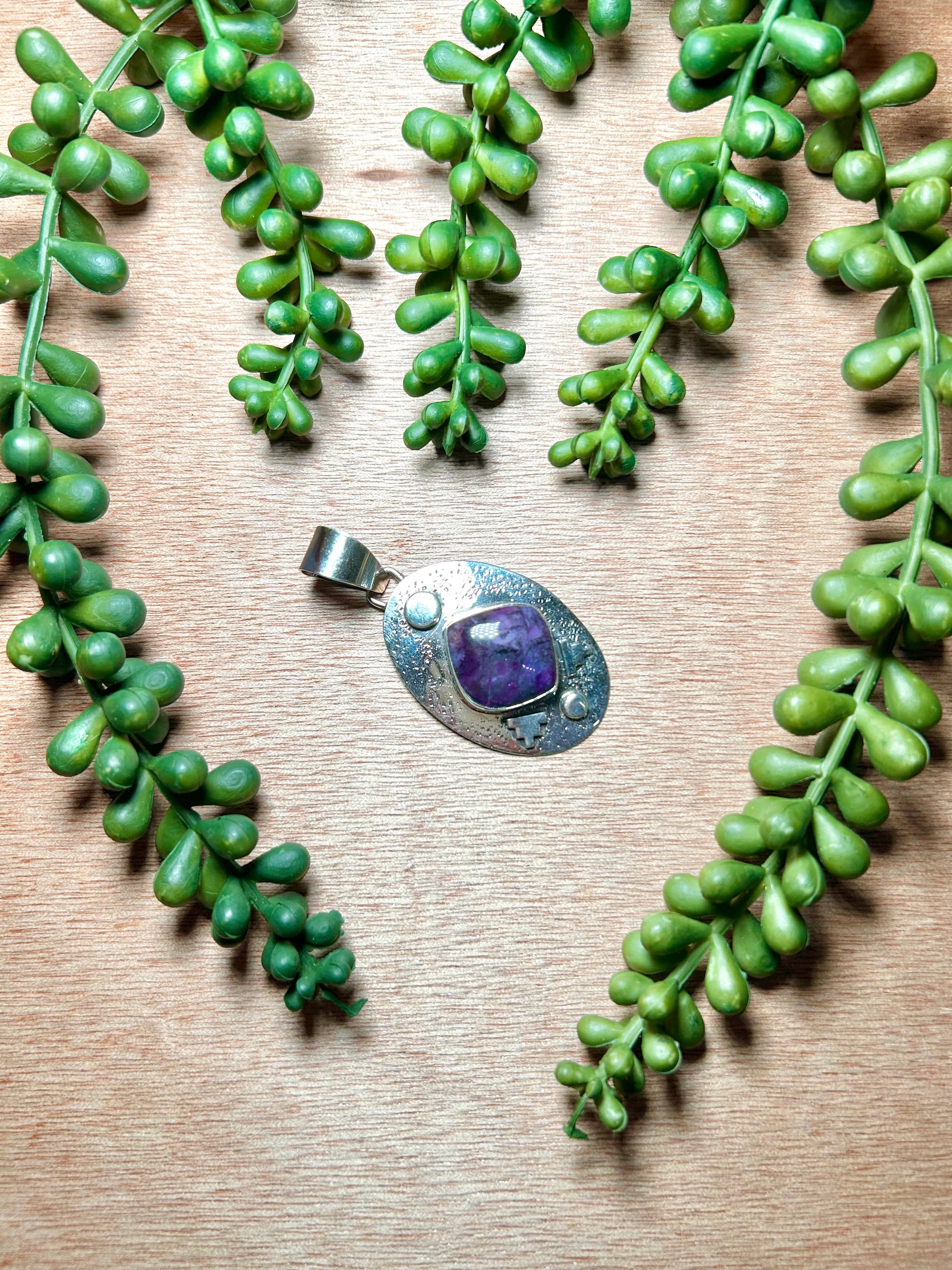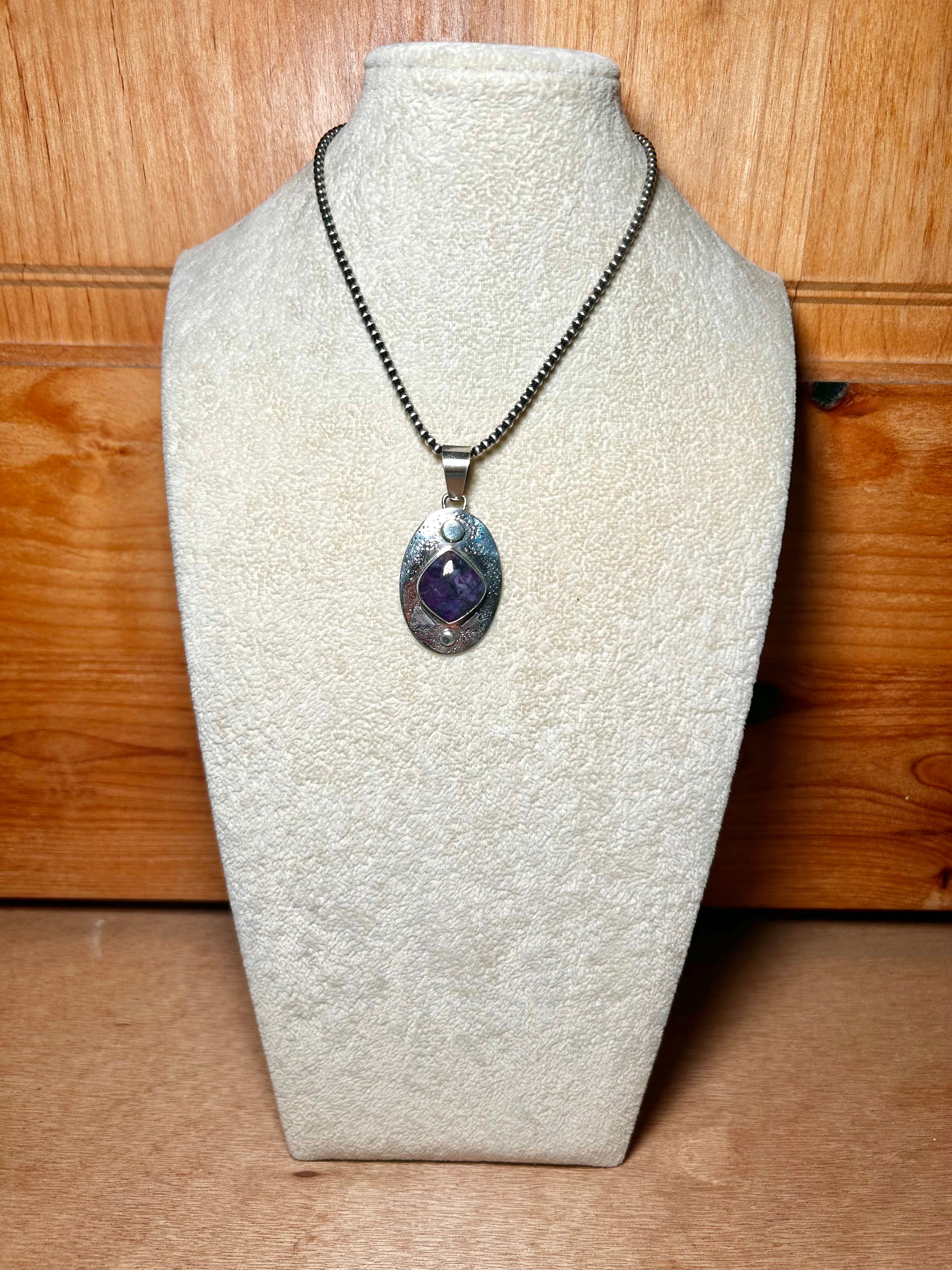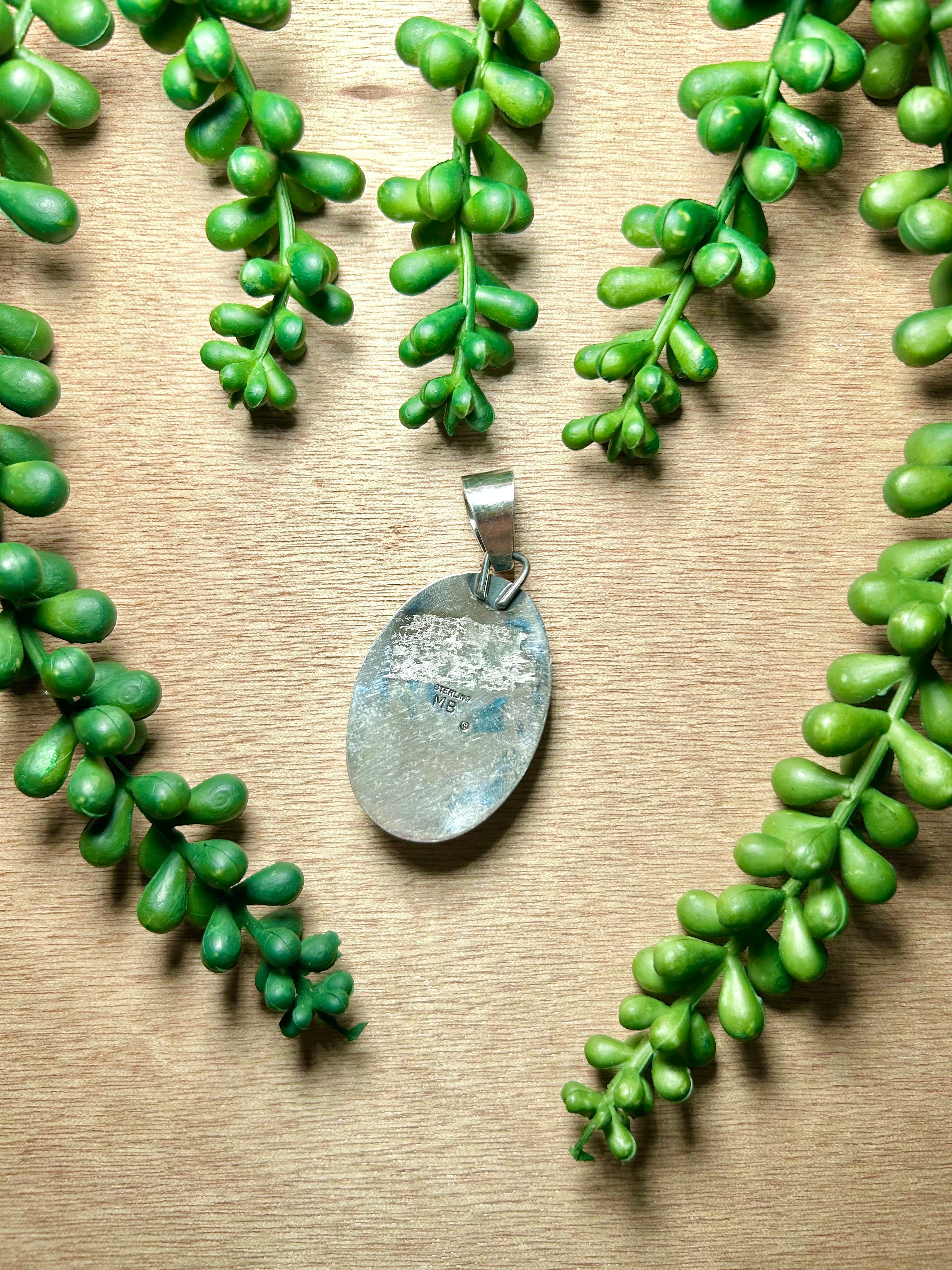 Navajo Made Sngilite & Sterling Silver Pendant. It measures 2 1/4 inches long and 1 1/8 inches wide. Pendant Only! Signed by the artist and stamped sterling silver.