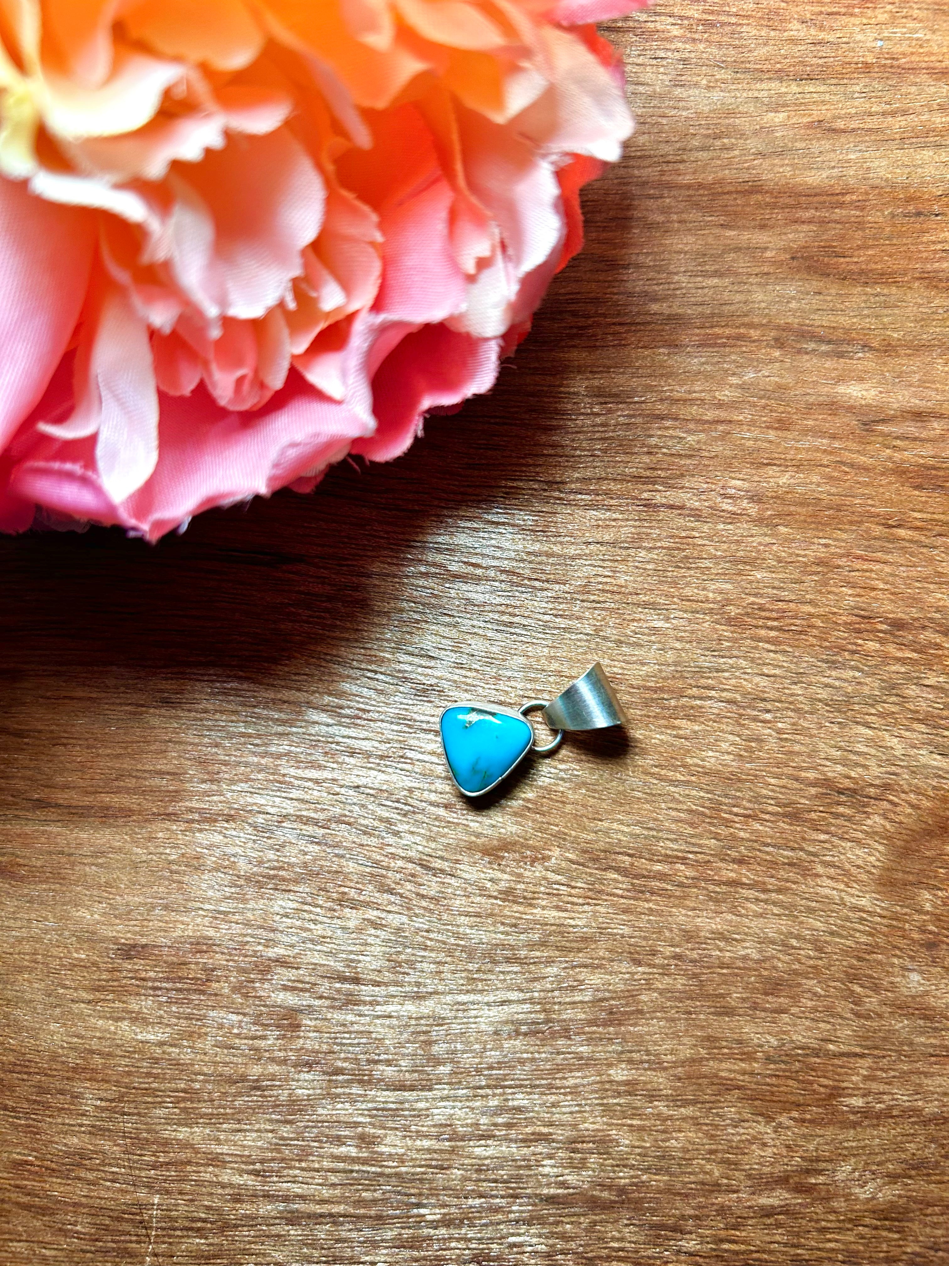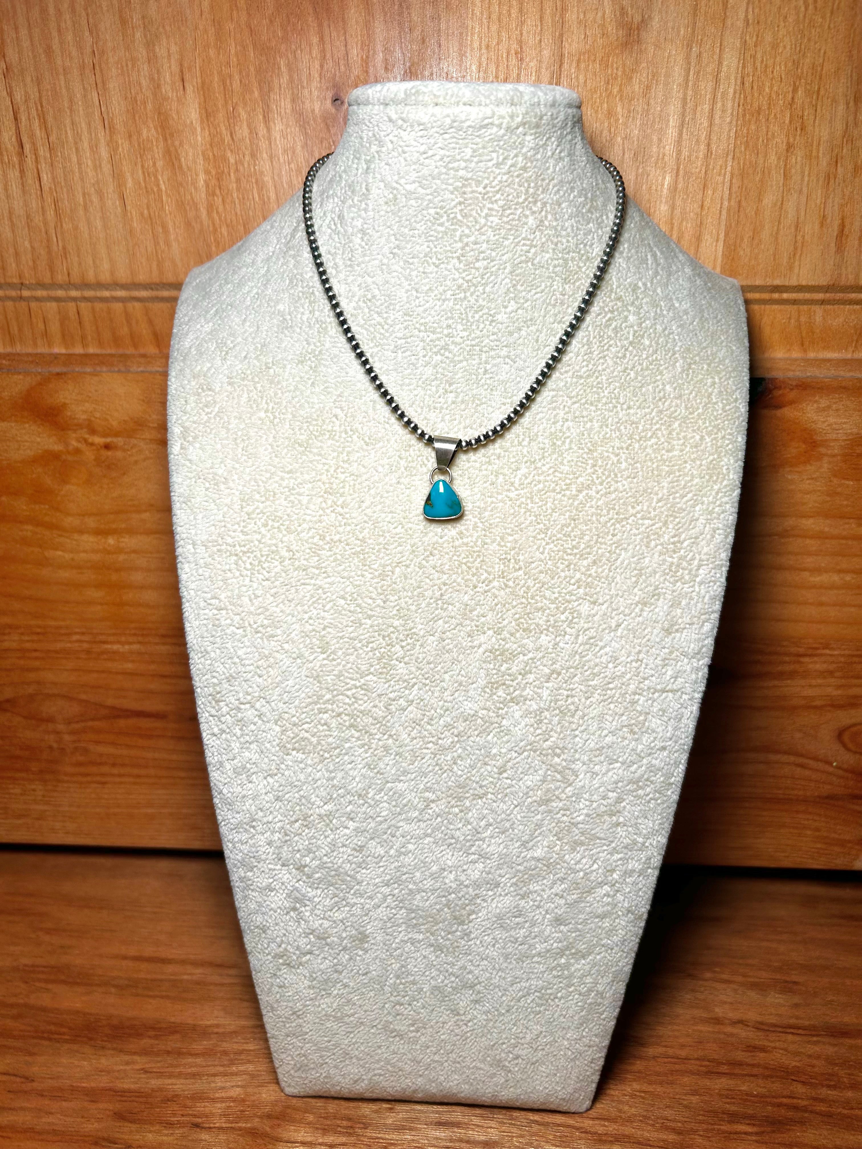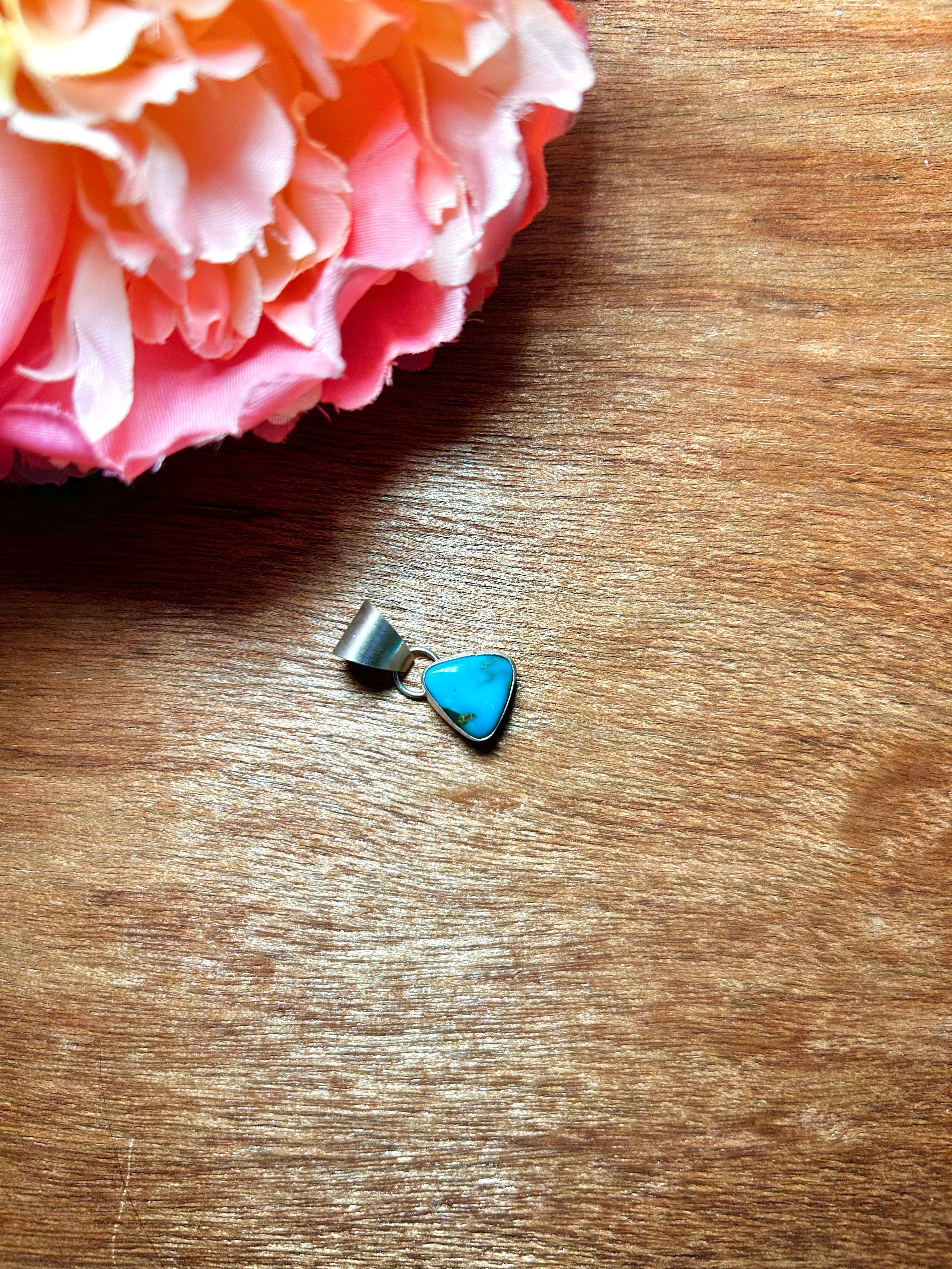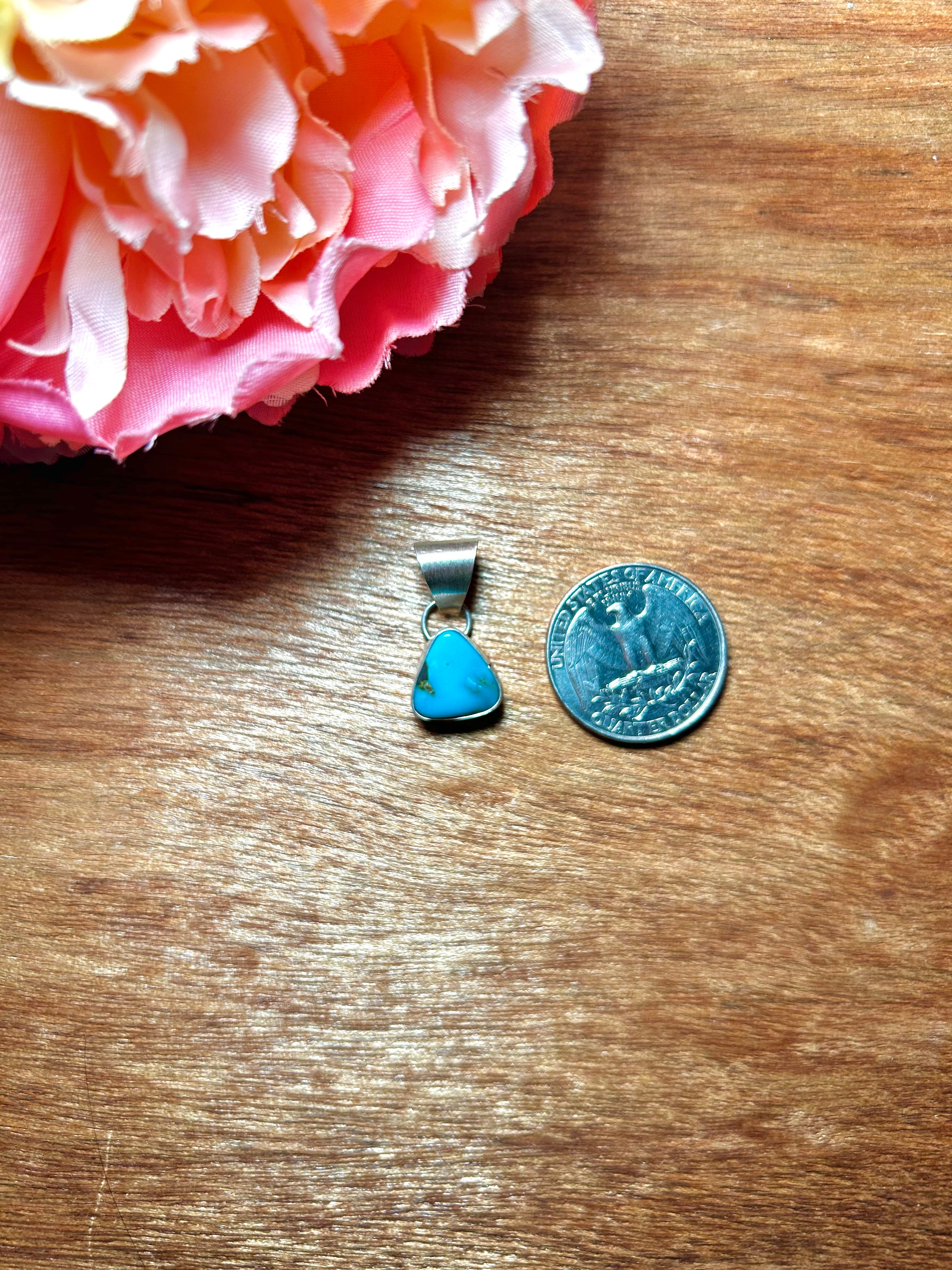 Navajo Made Kingman Turquoise & Sterling Silver Pendant. It measures 1 1/4 inches long and 1/2 of an inch wide. Pendant Only. Signed by the artist and stamped sterling silver.