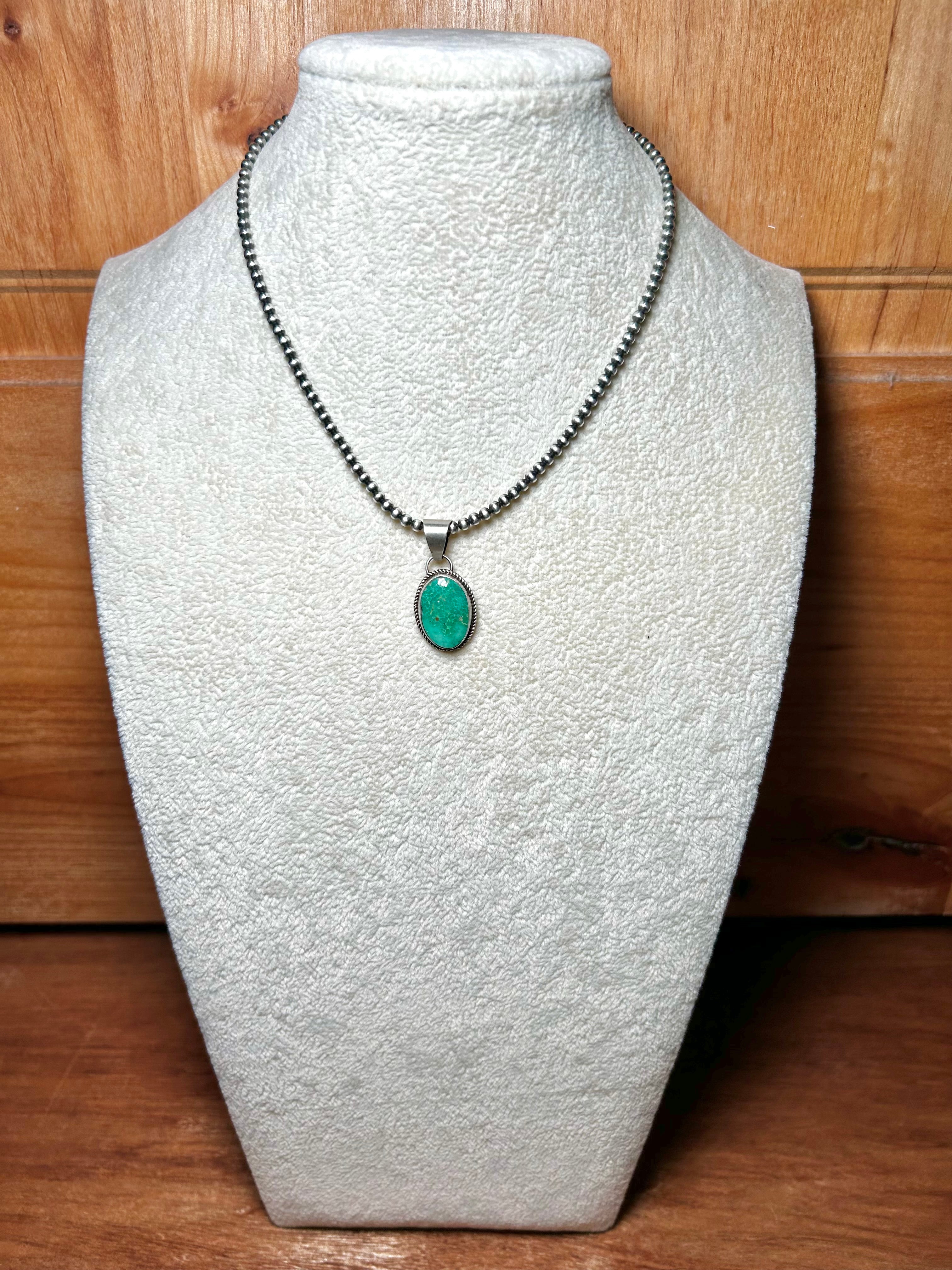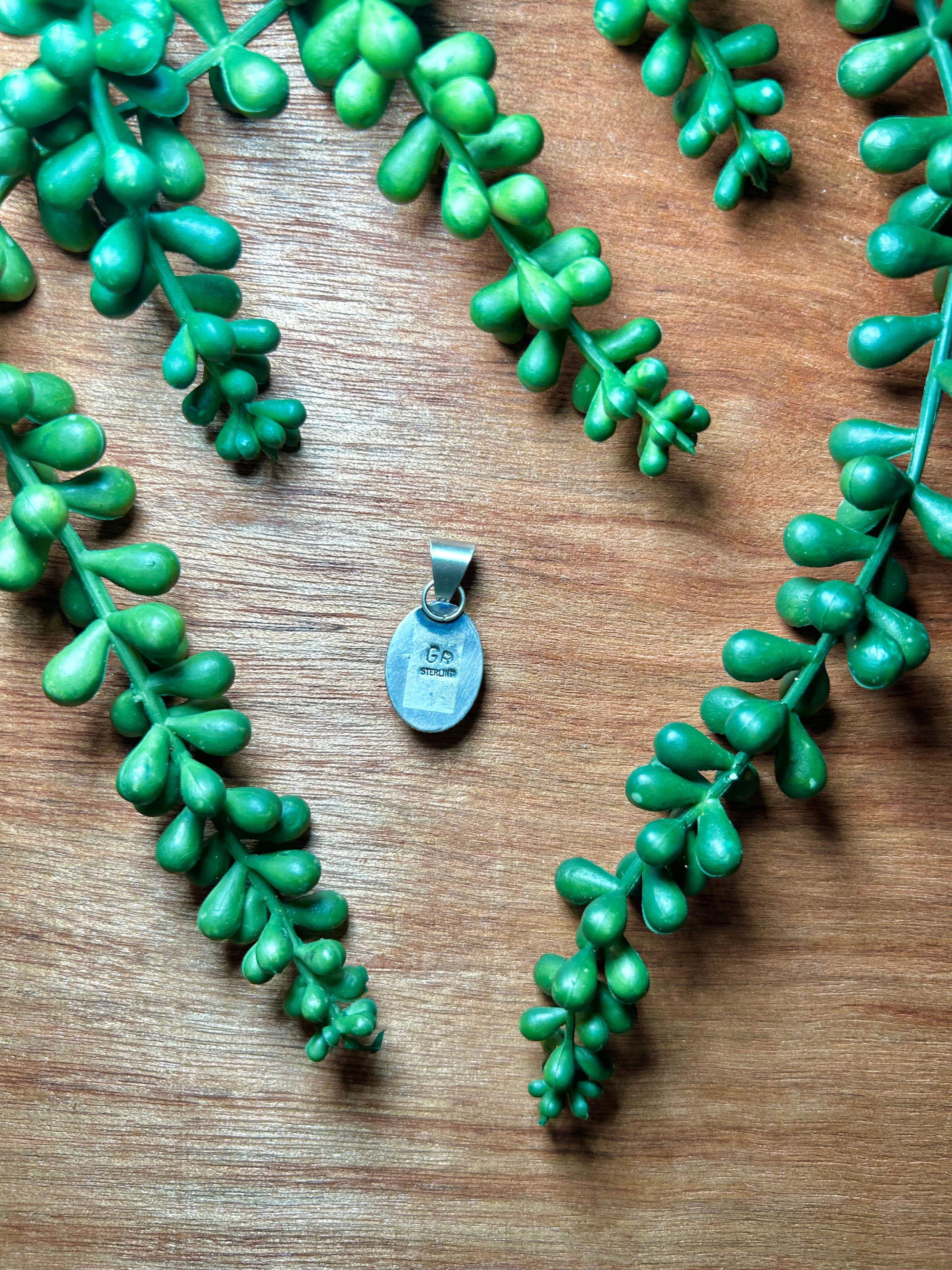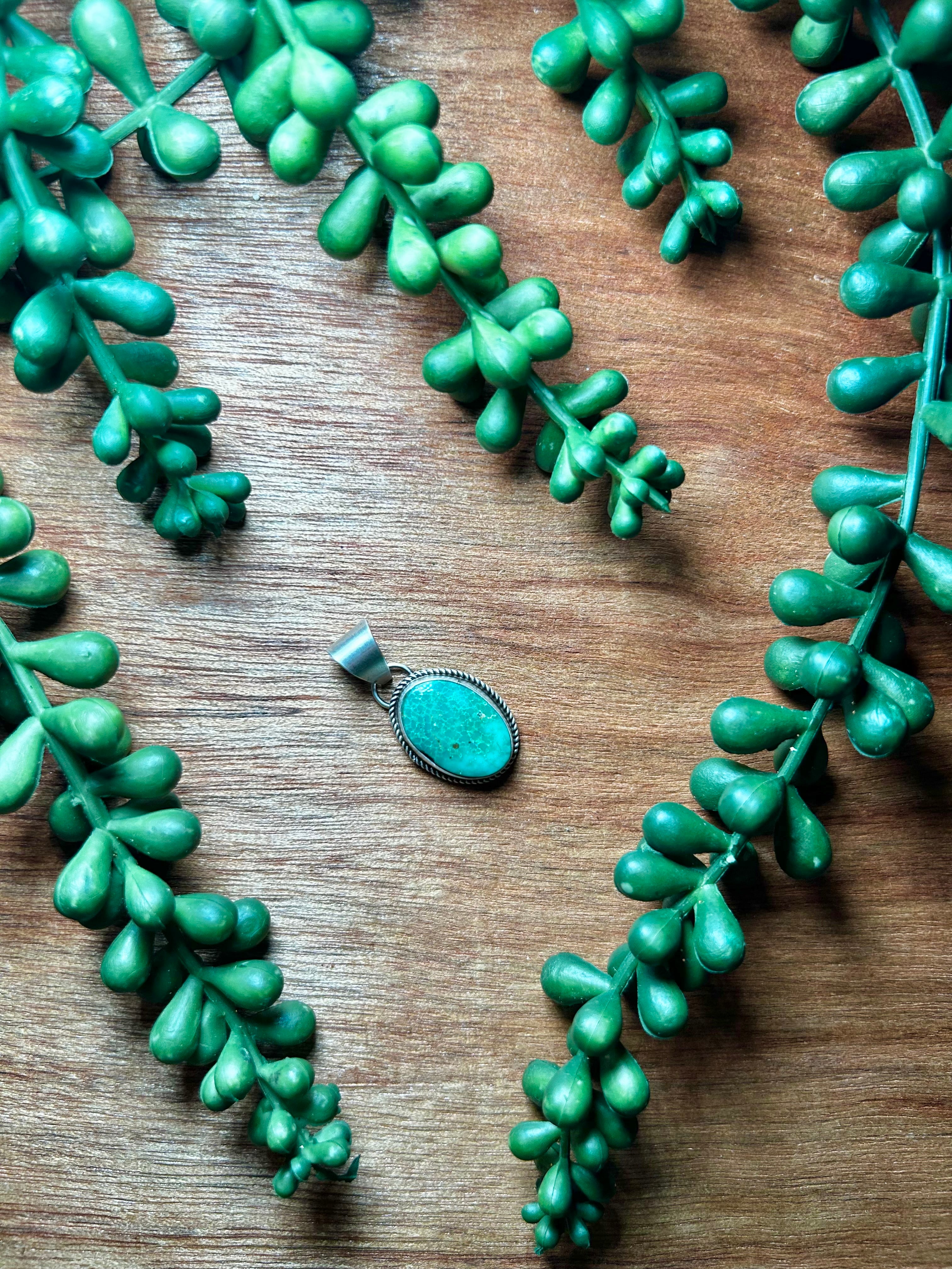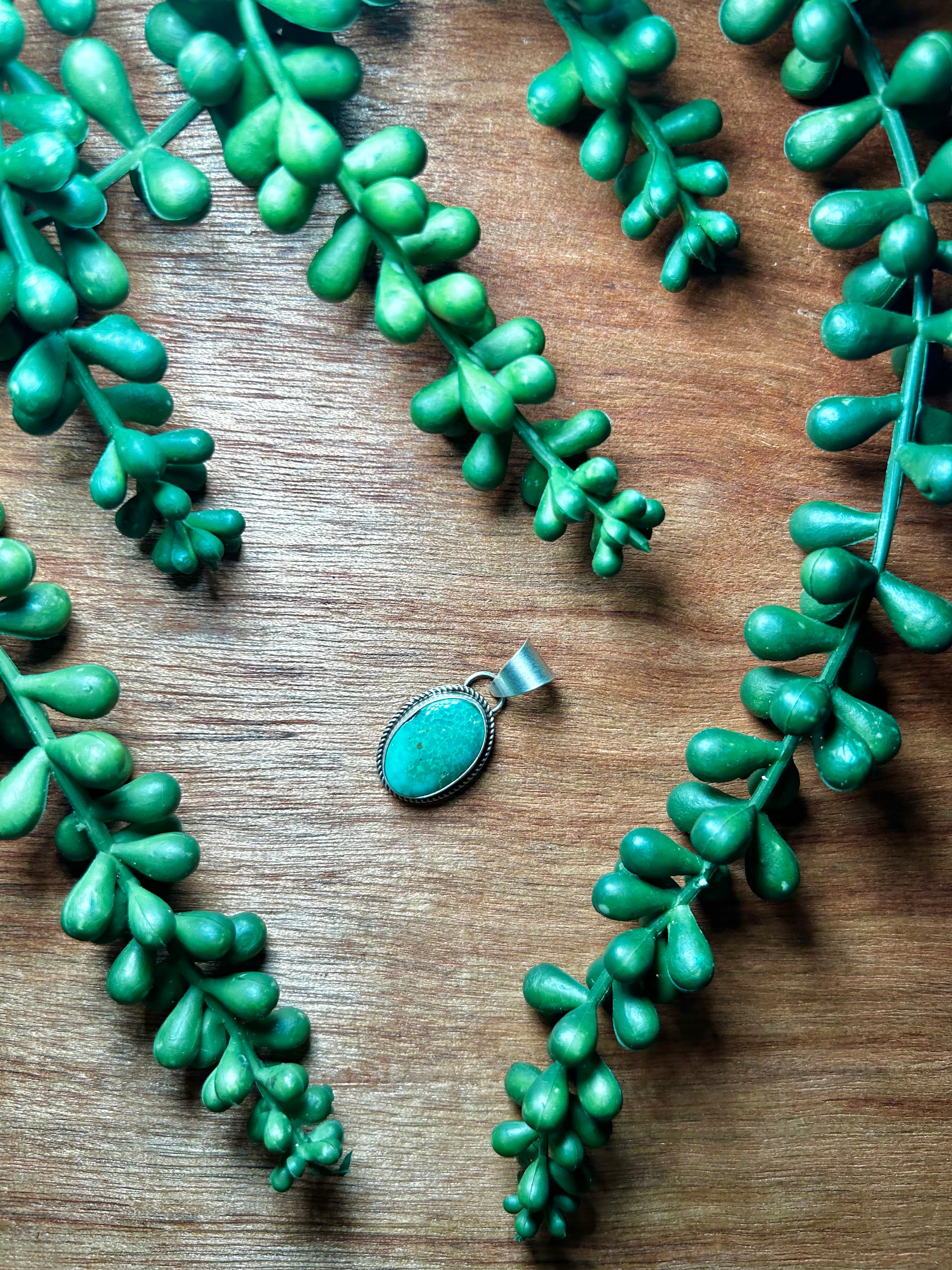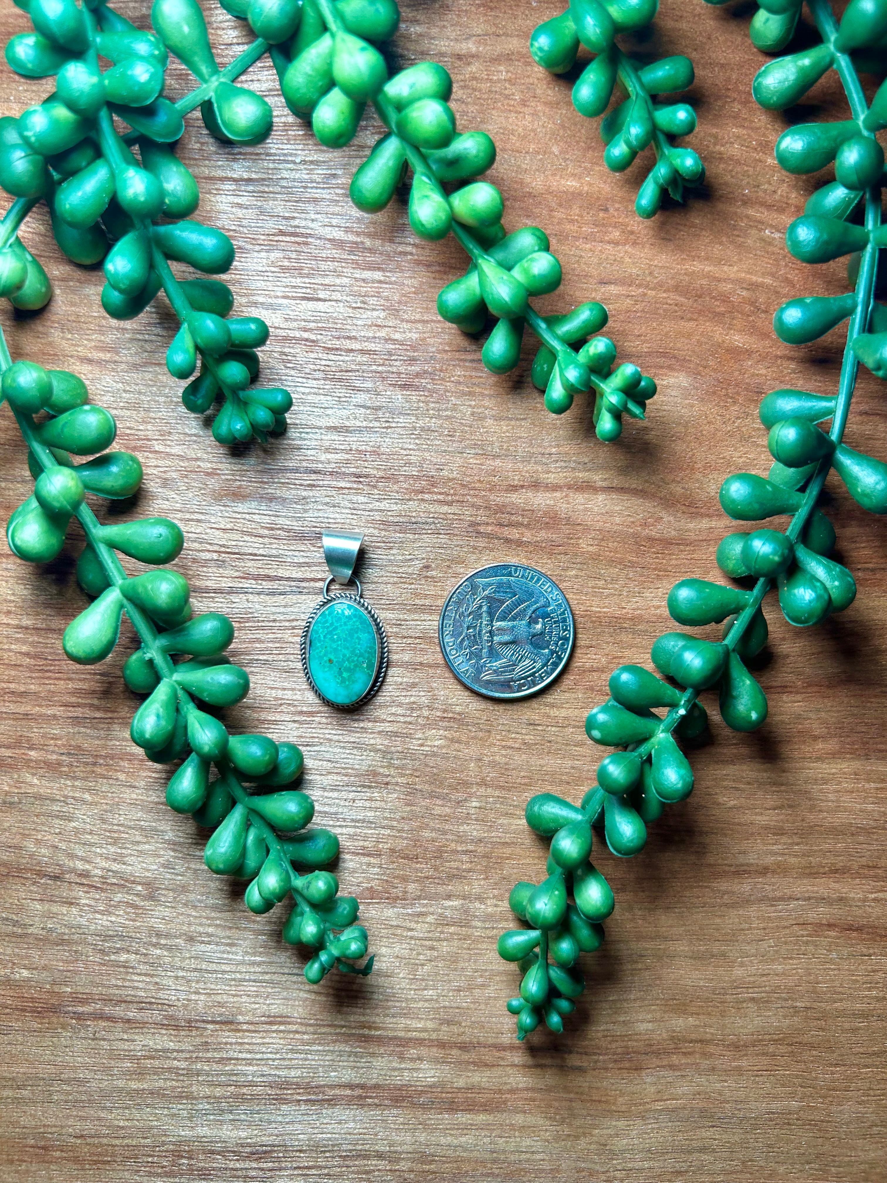 Navajo Made Sonoran Gold Turquoise & Sterling Silver Pendant. It measures 1 1/4 inches long and 5/8 of an inch wide. Pendant Only! Signed by the artist and stamped sterling silver.