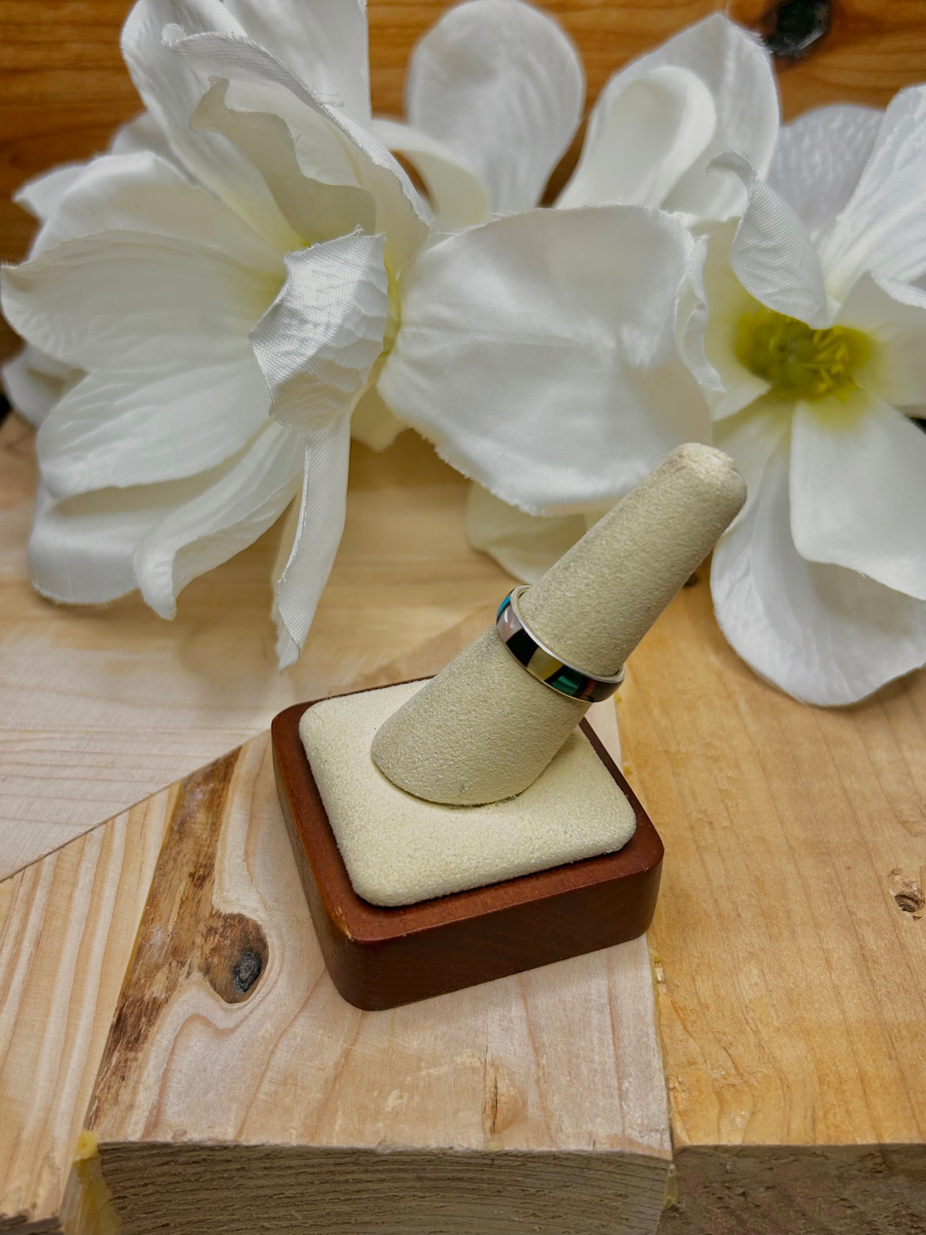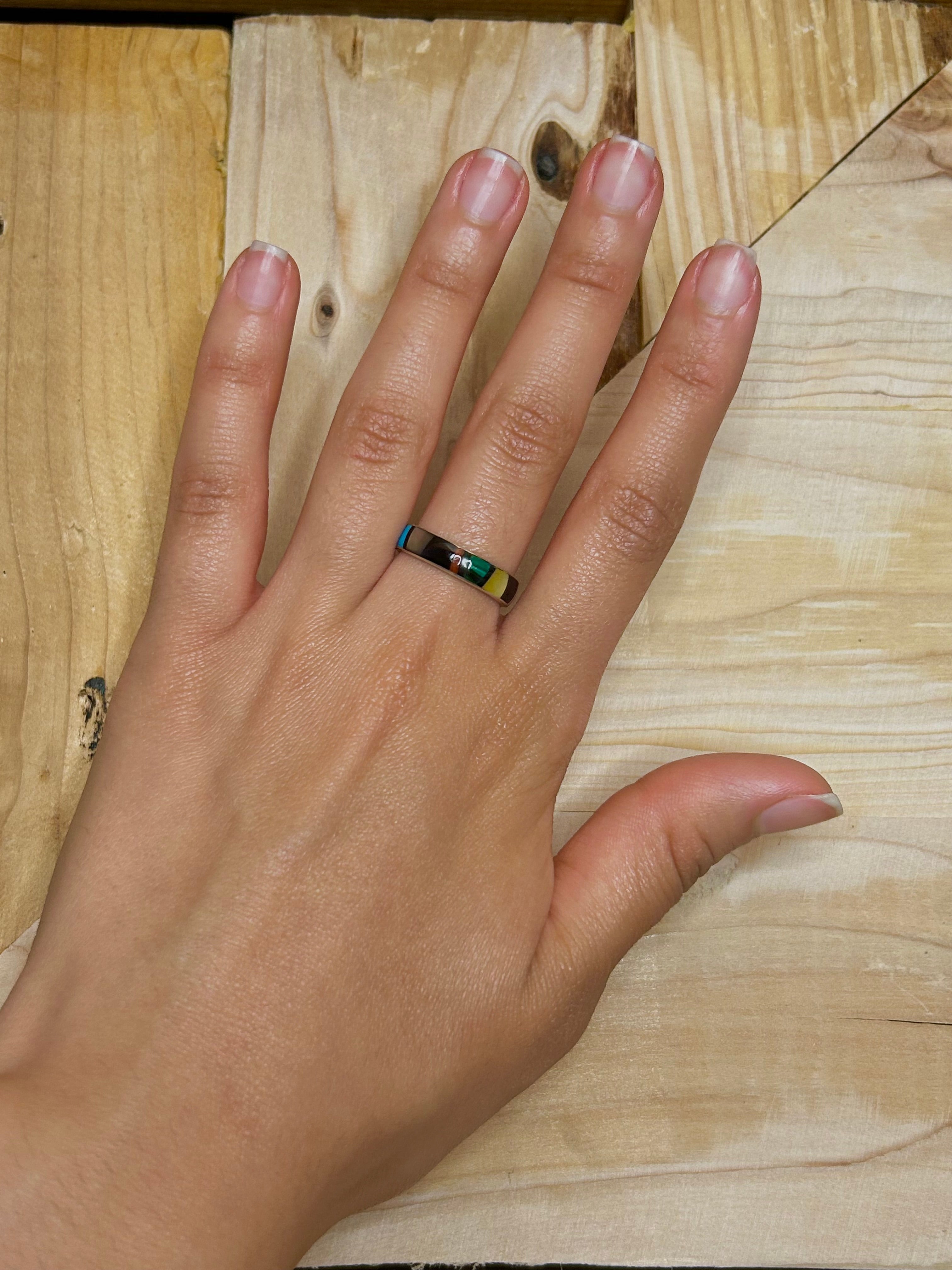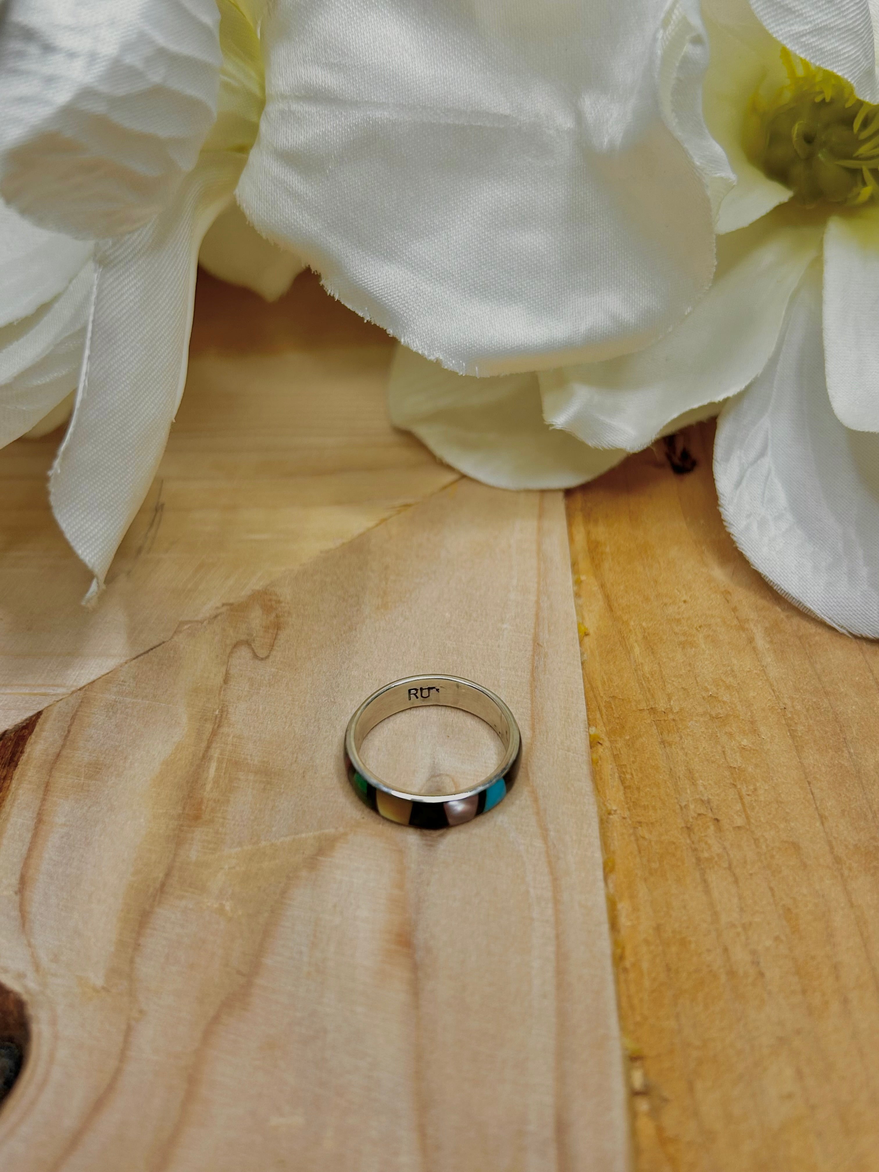Zuni Made Multi Stone & Sterling Silver Cluster Ring. It measures 3/4 of an inch long and 1/8 of an inch wide. Signed by artist and stamped sterling silver.