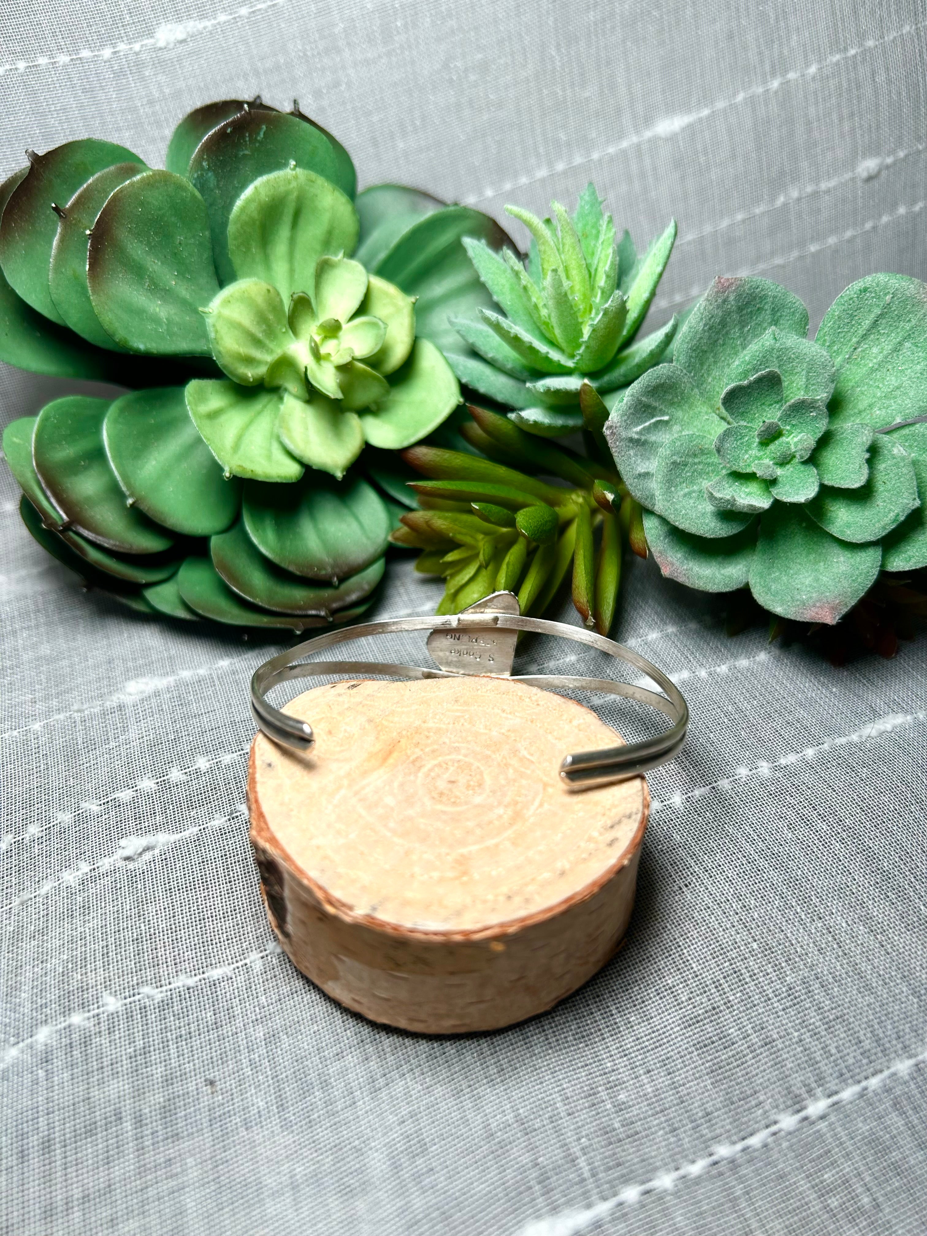 Navajo Made #8 Turquoise & Sterling Silver Cuff Bracelet. It measures 7/8 of an inch wide with an inside circumference of 5 3/8 inches and a gap of 1 1/8 inches. Signed by the artist and stamped sterling silver.