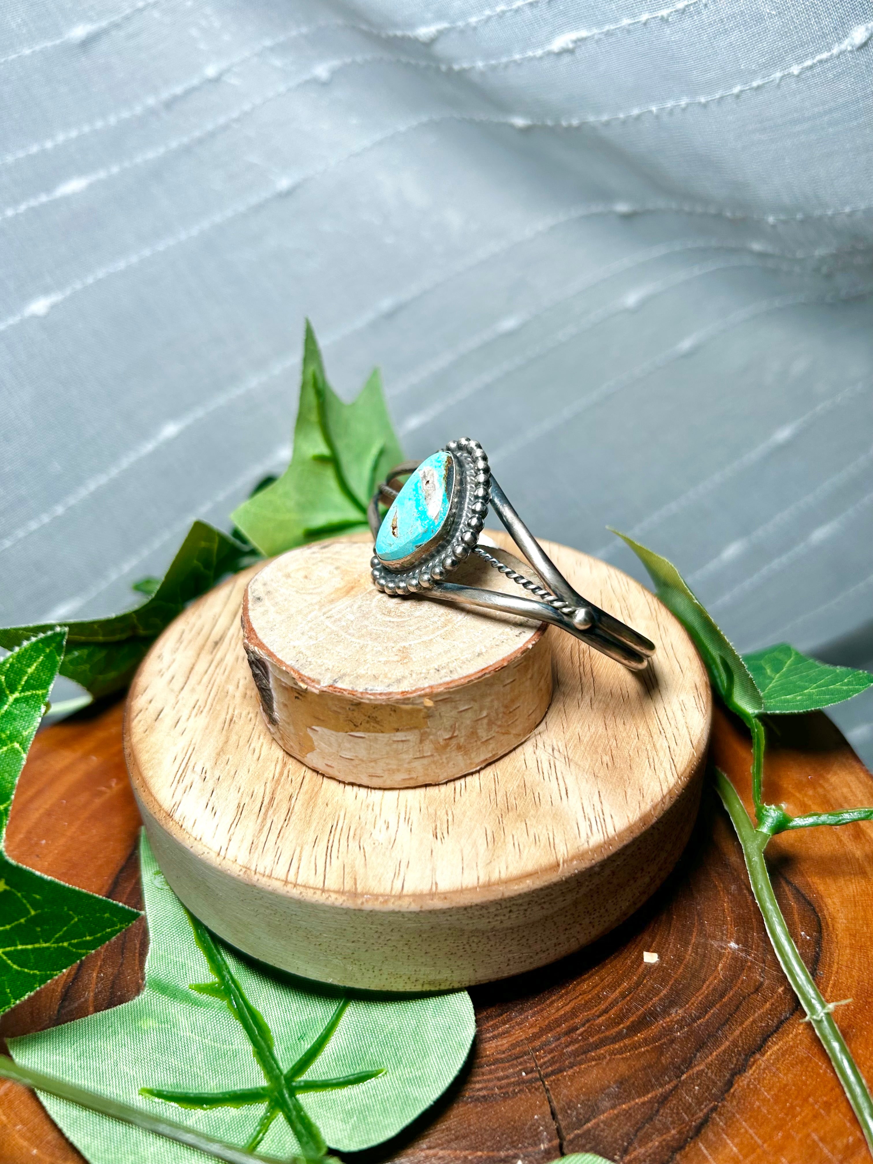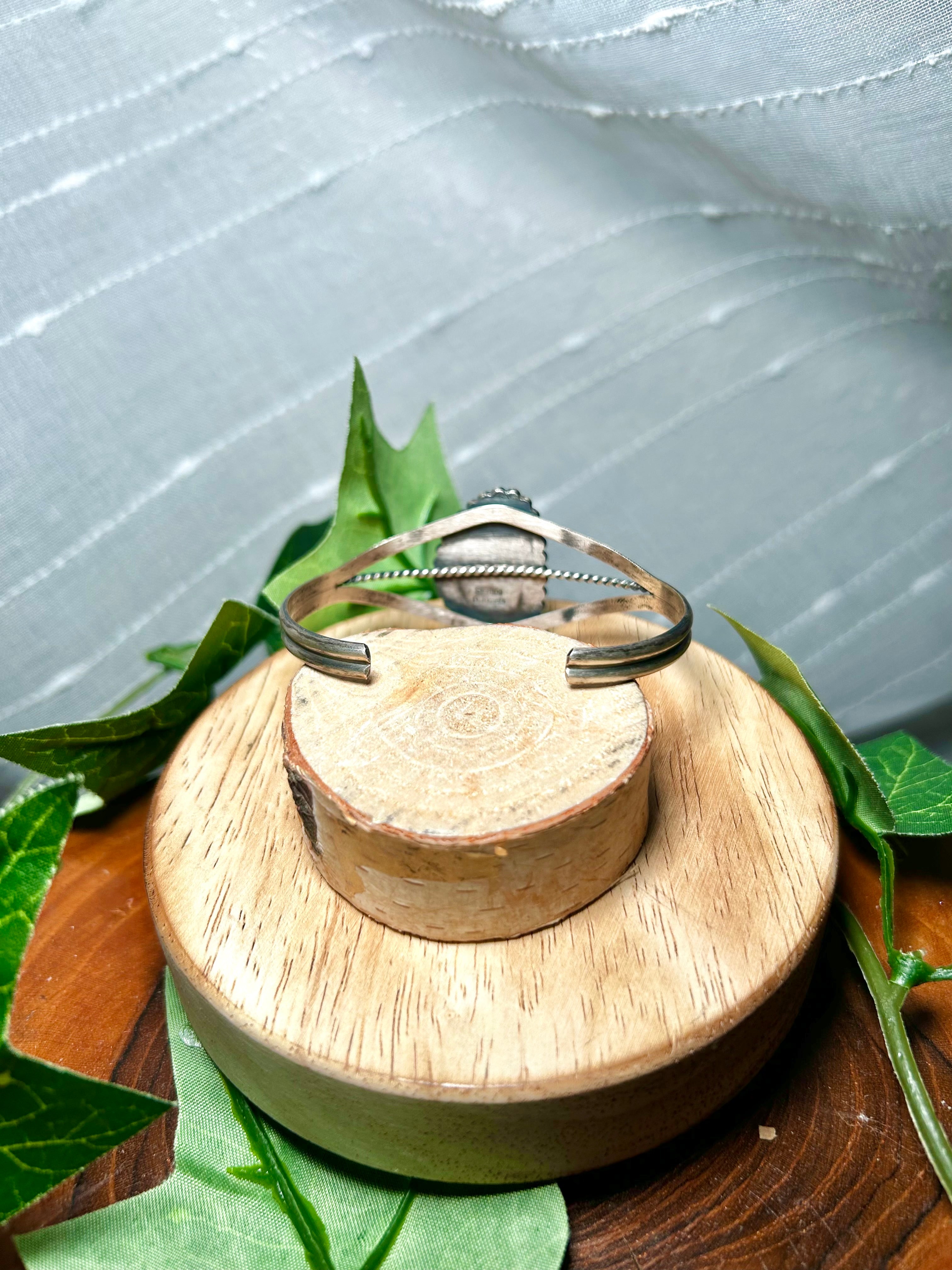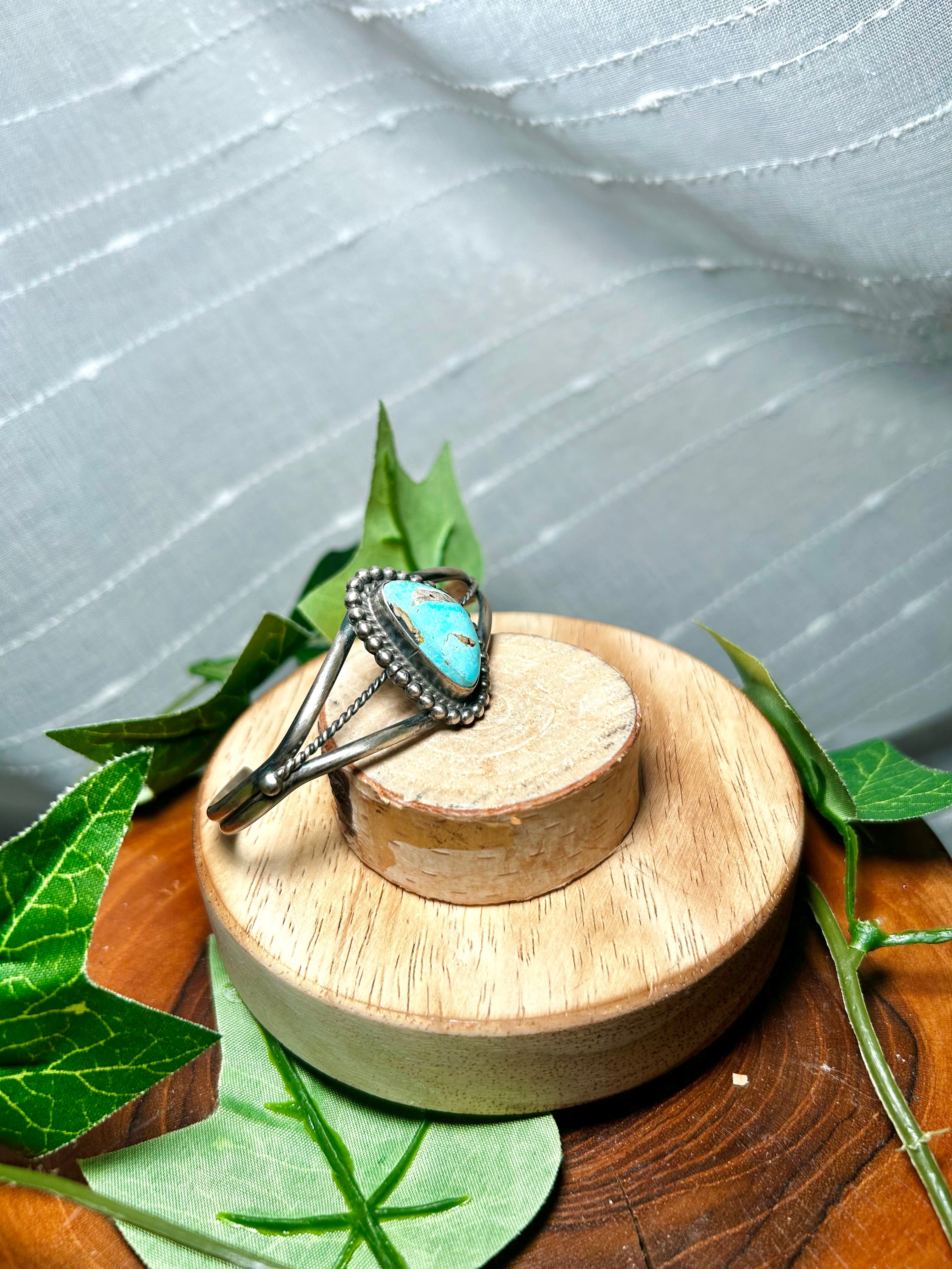 Dave Skeets Royston Turquoise & Sterling Silver Cuff Bracelet. It measures 1 1/8 inches wide with an inside circumference of 5 1/2 inches and a gap of 1 1/8 inches. Signed by the artist and stamped sterling silver.