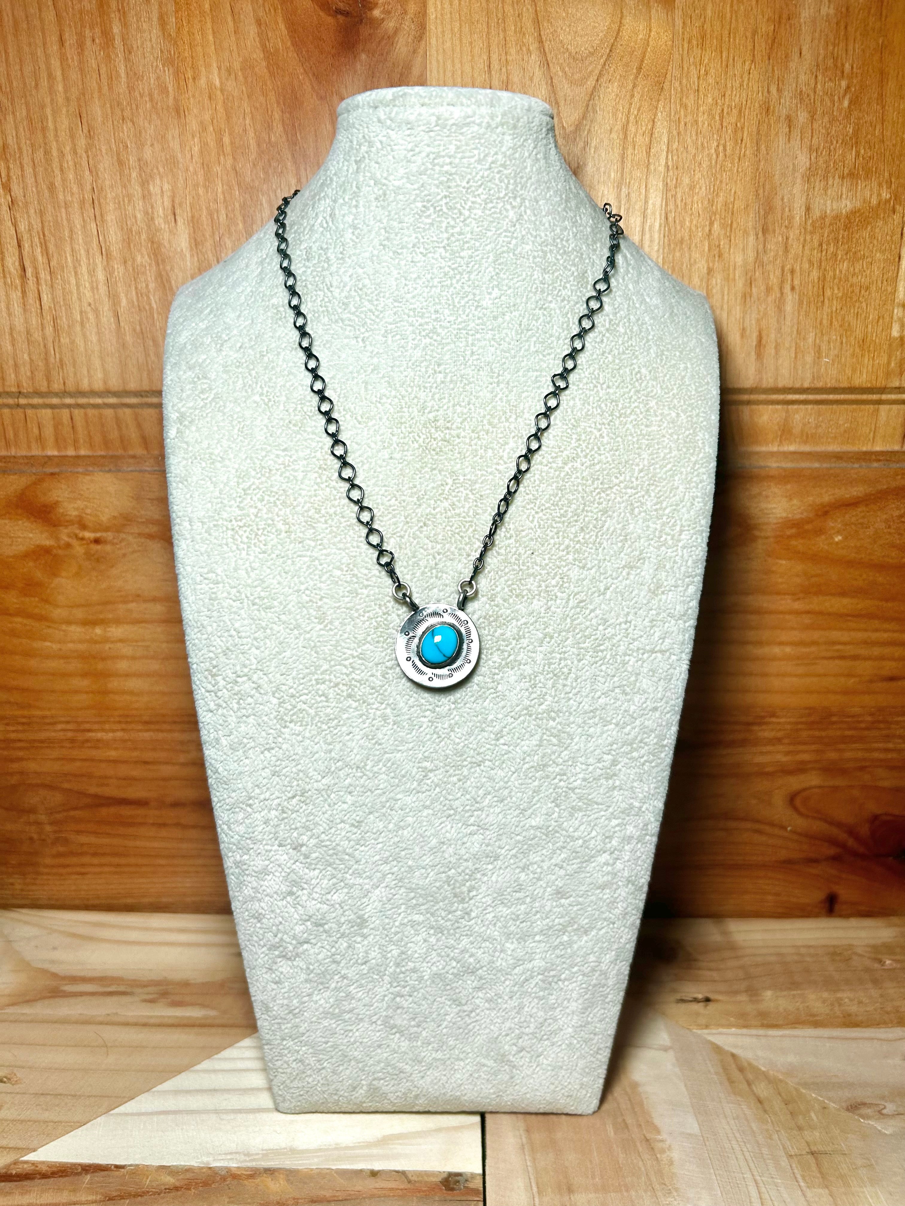 Navajo Made Egyptian Turquoise & Sterling Silver Necklace. It measures 20 inches long with hang while the chain measures 18 inches long. Signed by the artist and stamped sterling silver.