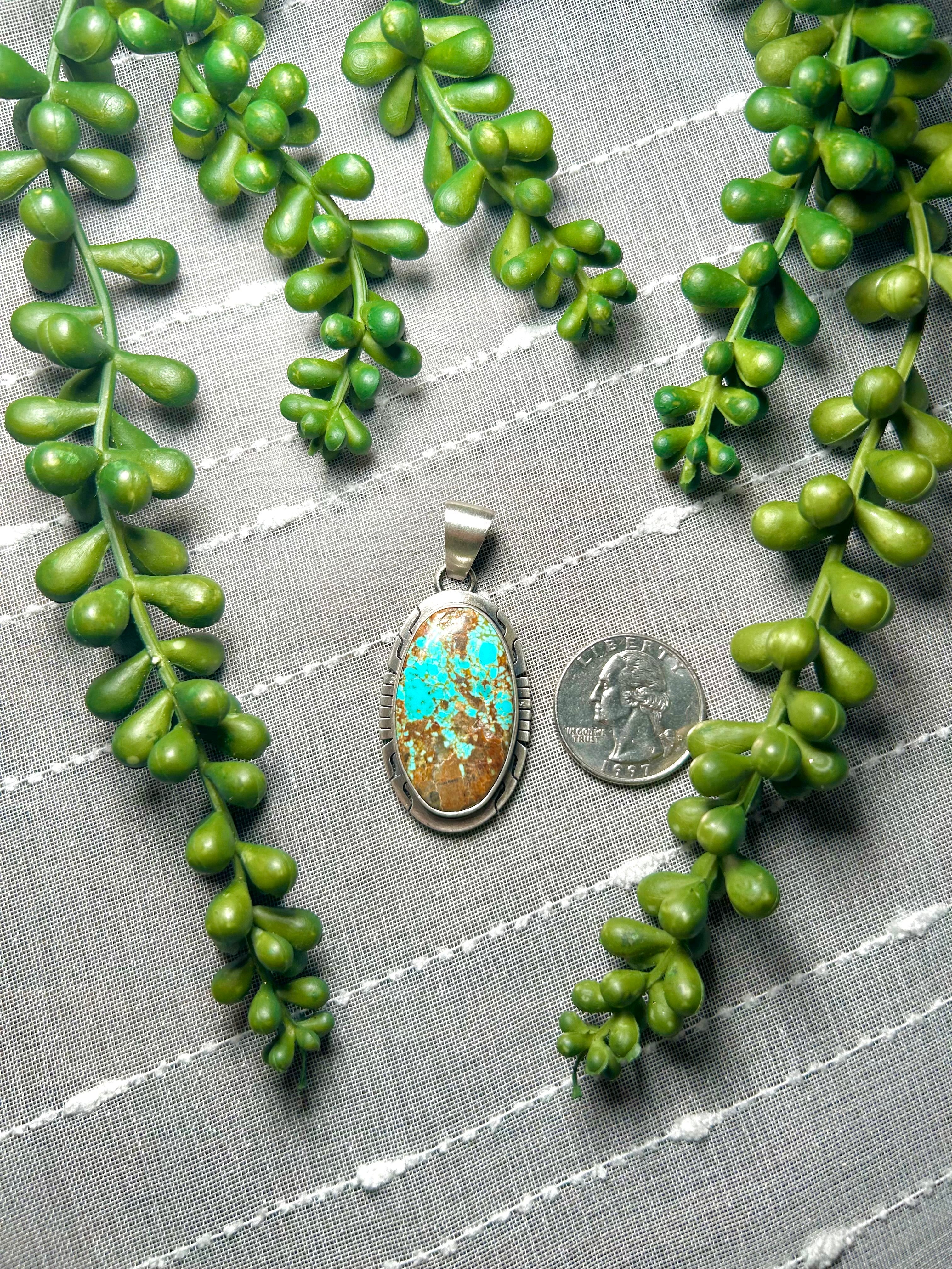 Navajo Made #8 Turquoise & Sterling Silver Pendant. It measures 2 1/8 inches long and 1 inch wide. Pendant Only! Signed by the artist and stamped sterling silver.