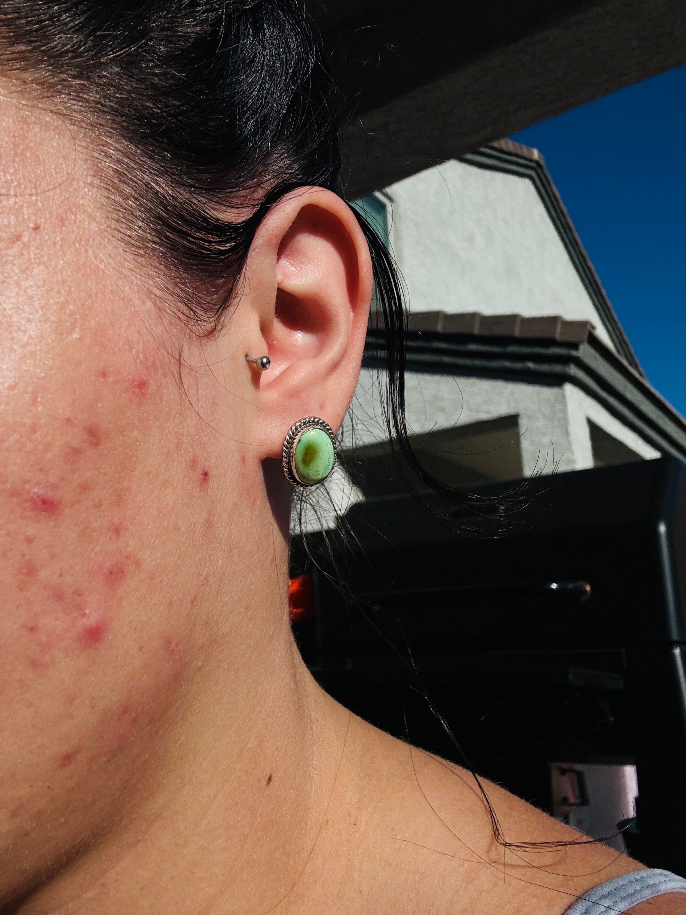 Navajo Made Sonoran Mountain Turquoise & Sterling Silver Post Earrings. They measure 5/8 of an inches long and 1/2 of an inch wide. Signed by artist and stamped sterling silver.