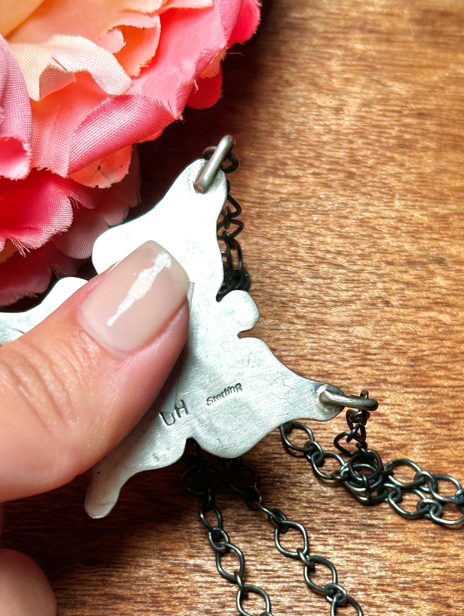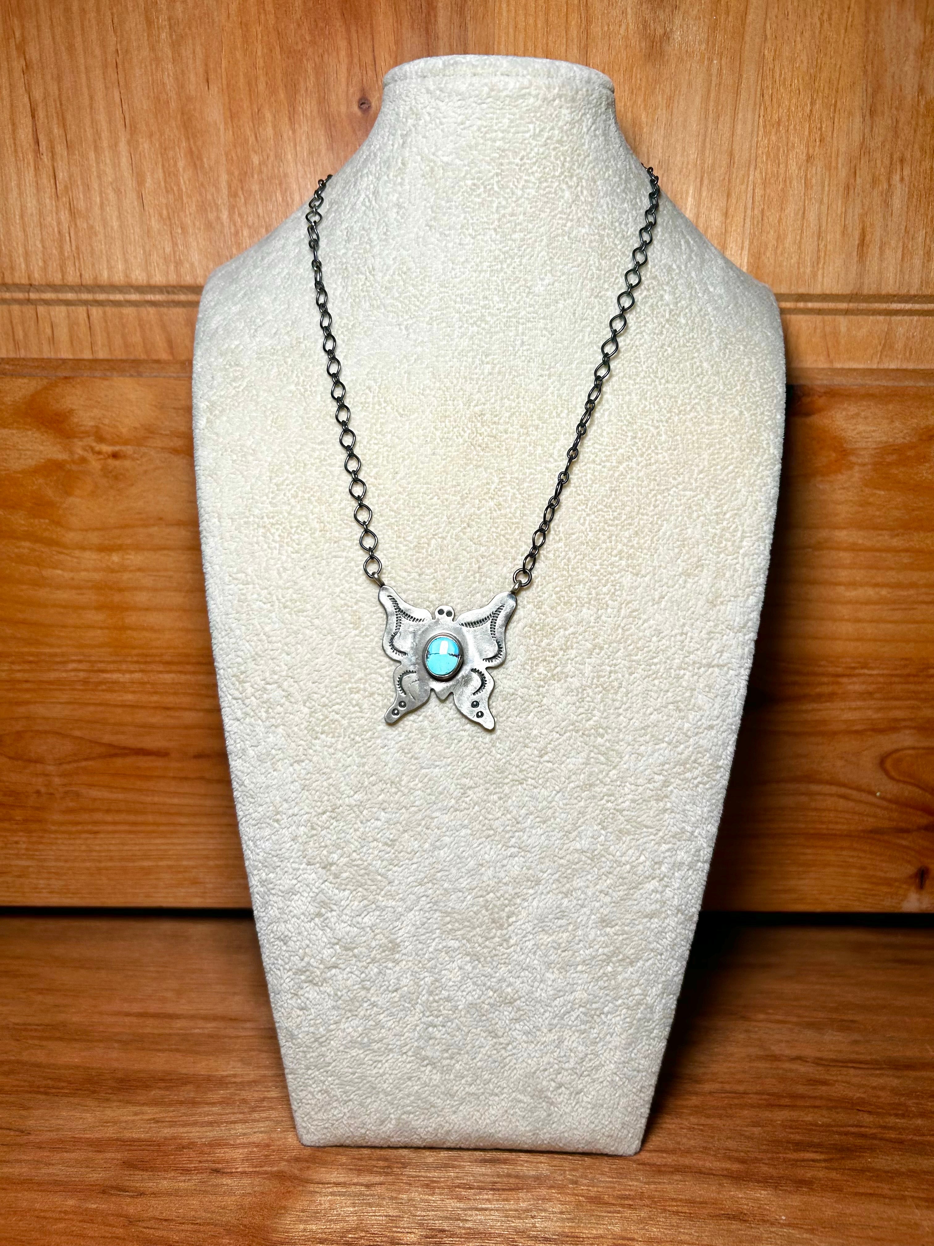 Navajo Made Golden Hill Turquoise & Sterling Sliver Necklace. It measures 20 inches long while the chain measure 17 inches long. Signed by the artist and stamped sterling silver. Stones will vary due to natural stones.