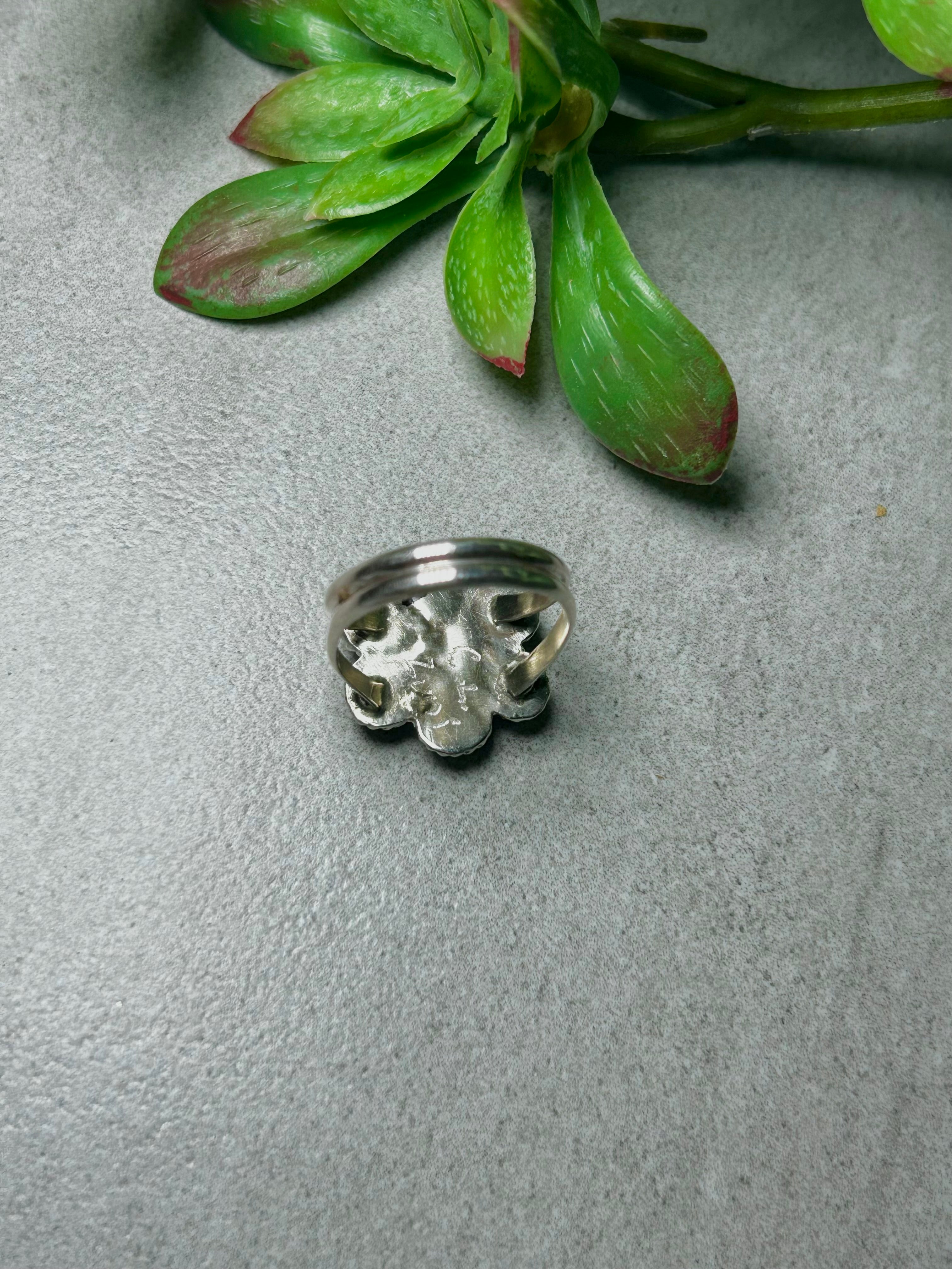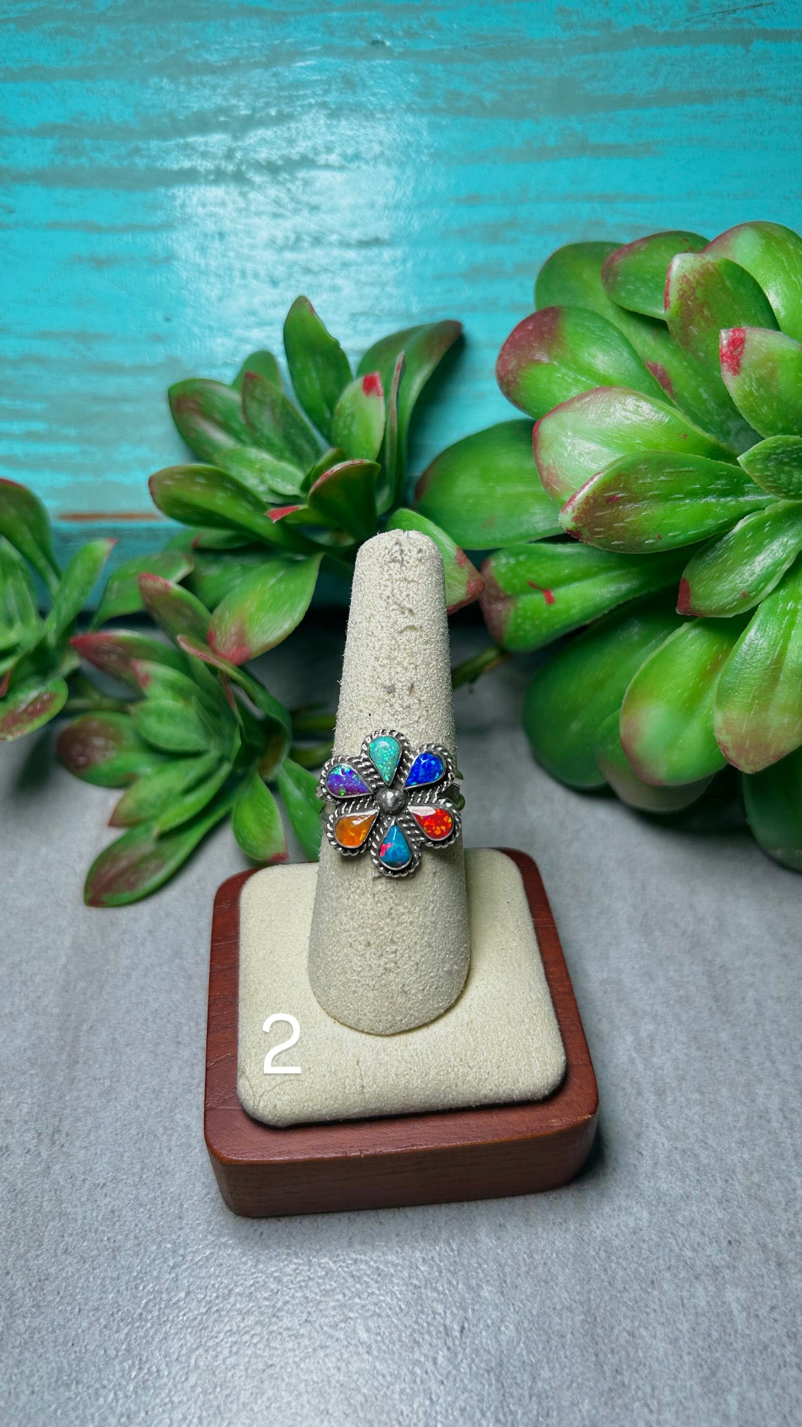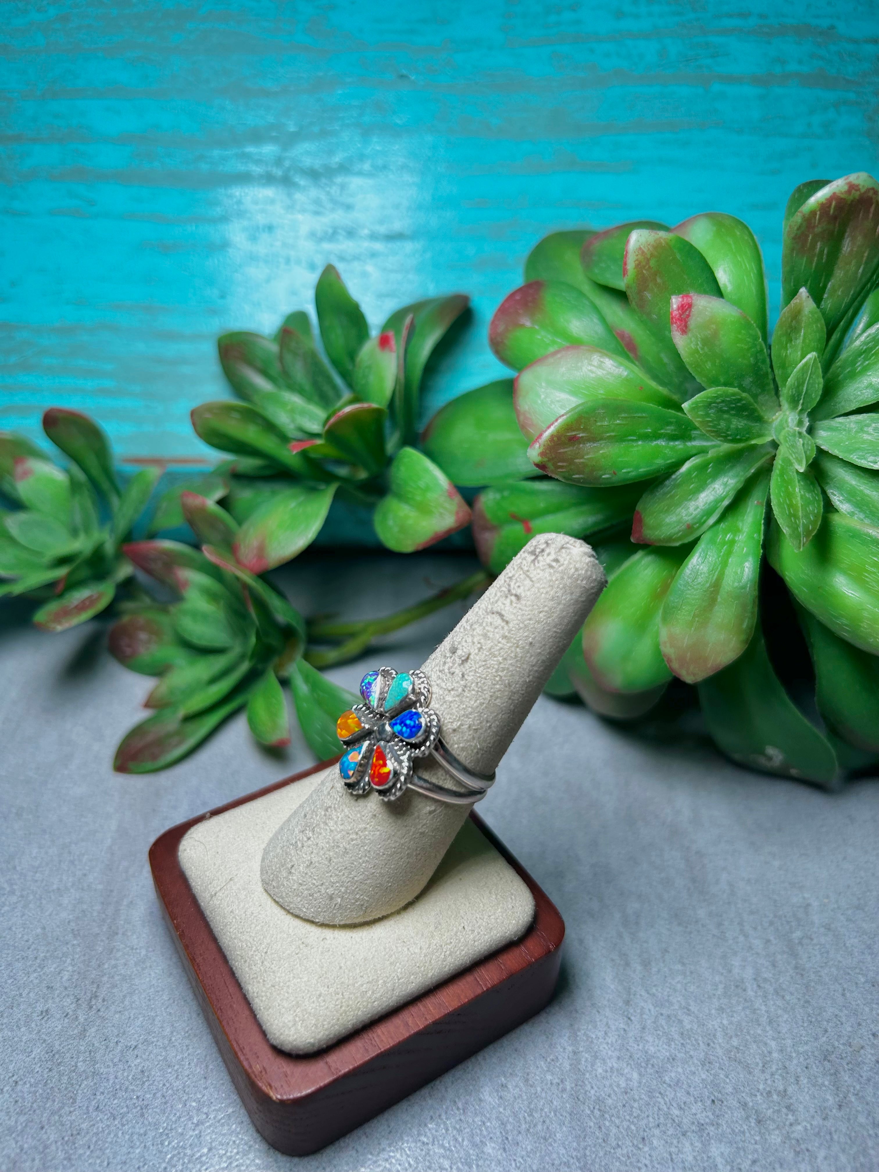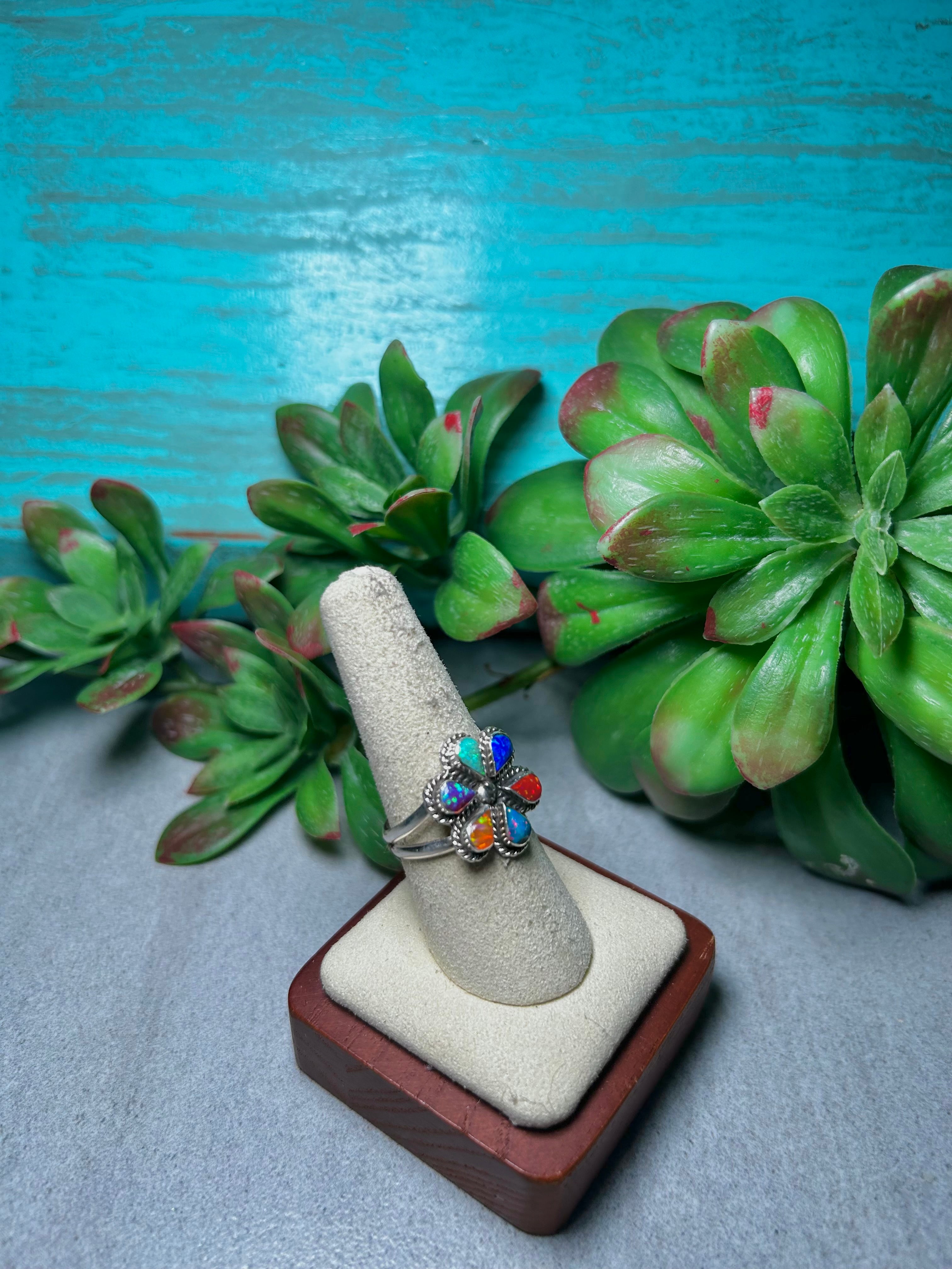 Zuni Made Opal & Sterling Silver Cluster Adjustable Ring. It measures 3/4 of an inch long and 3/4 of an inch wide. Signed by the artist and stamped sterling silver.