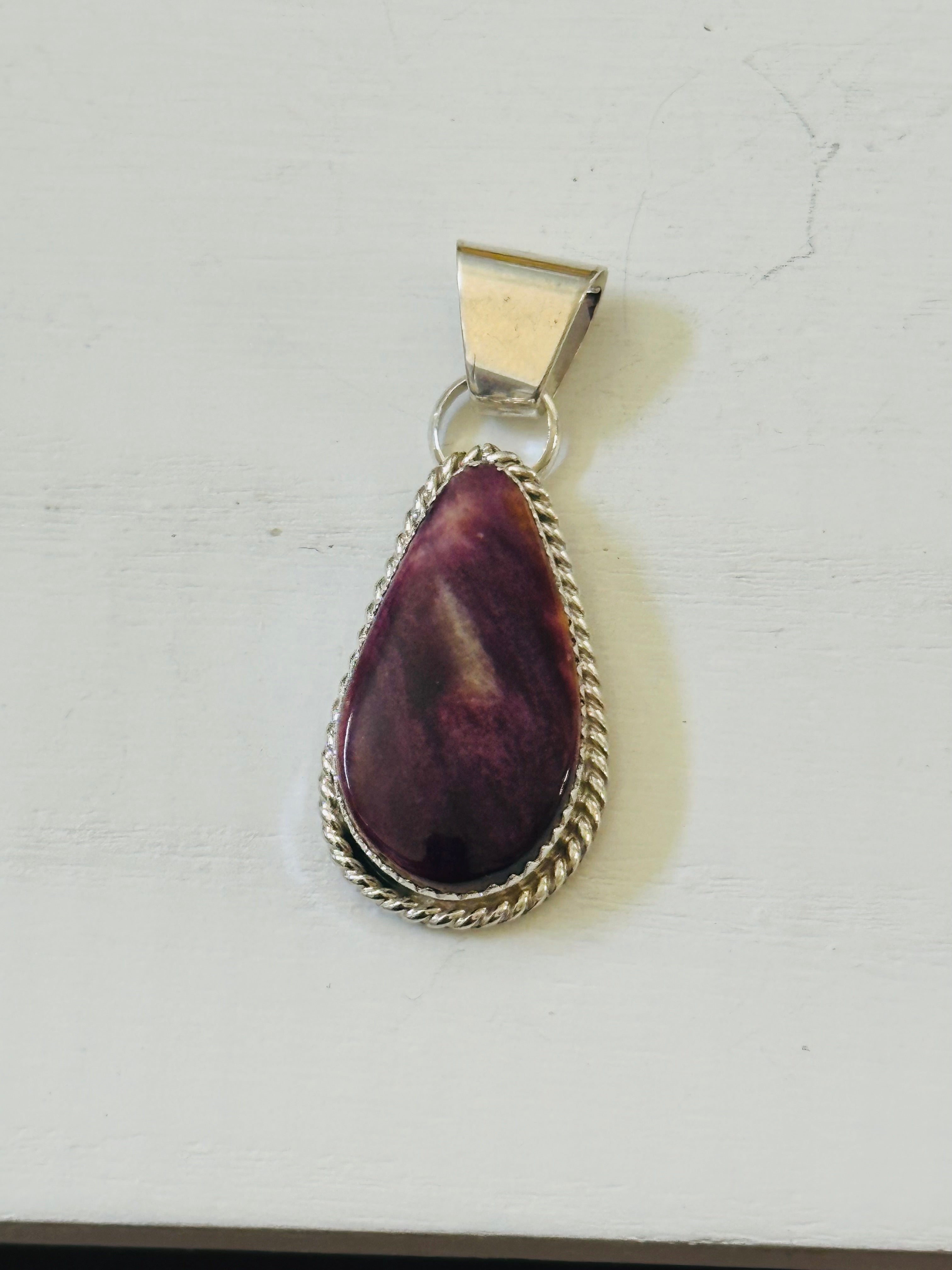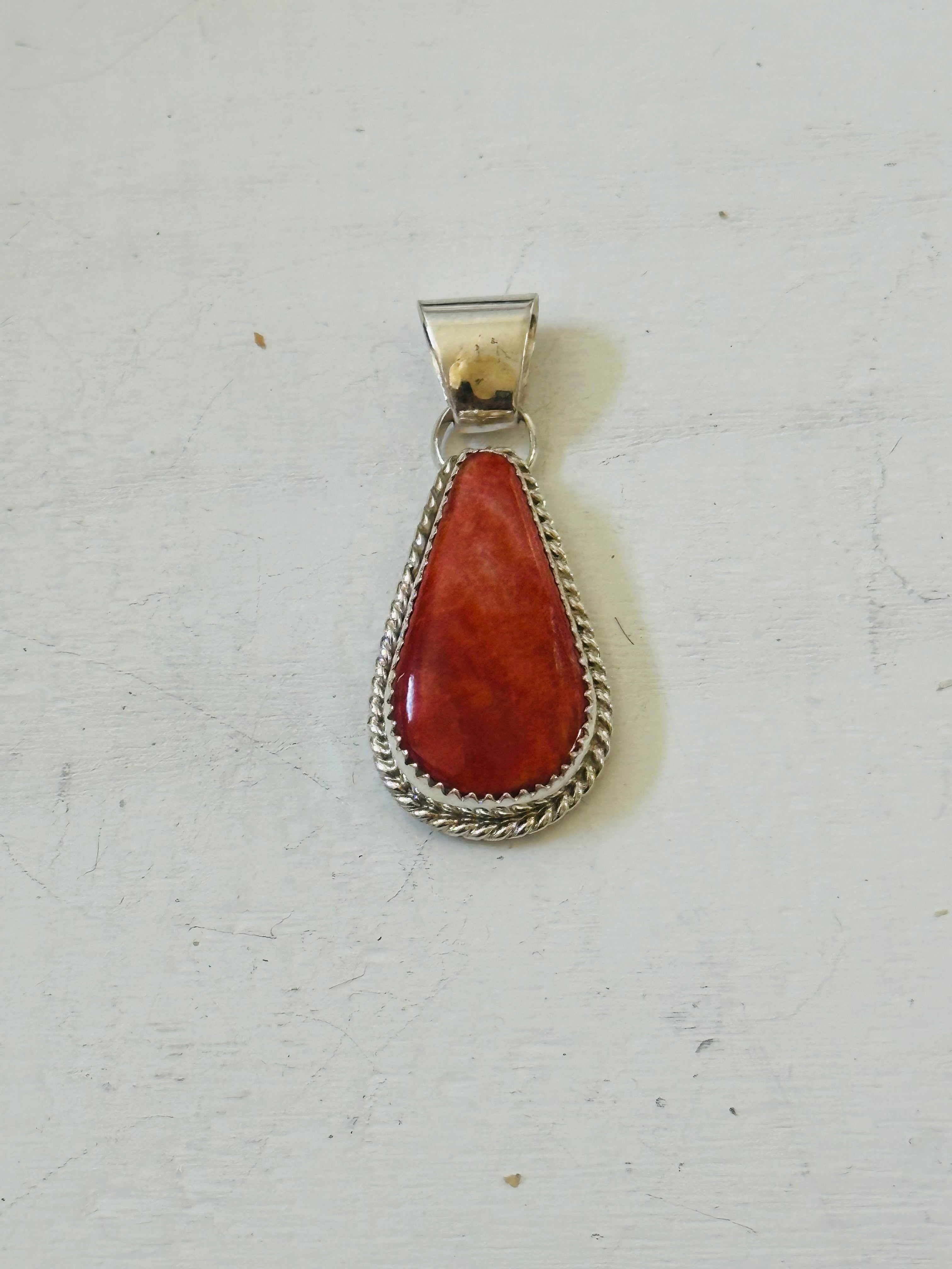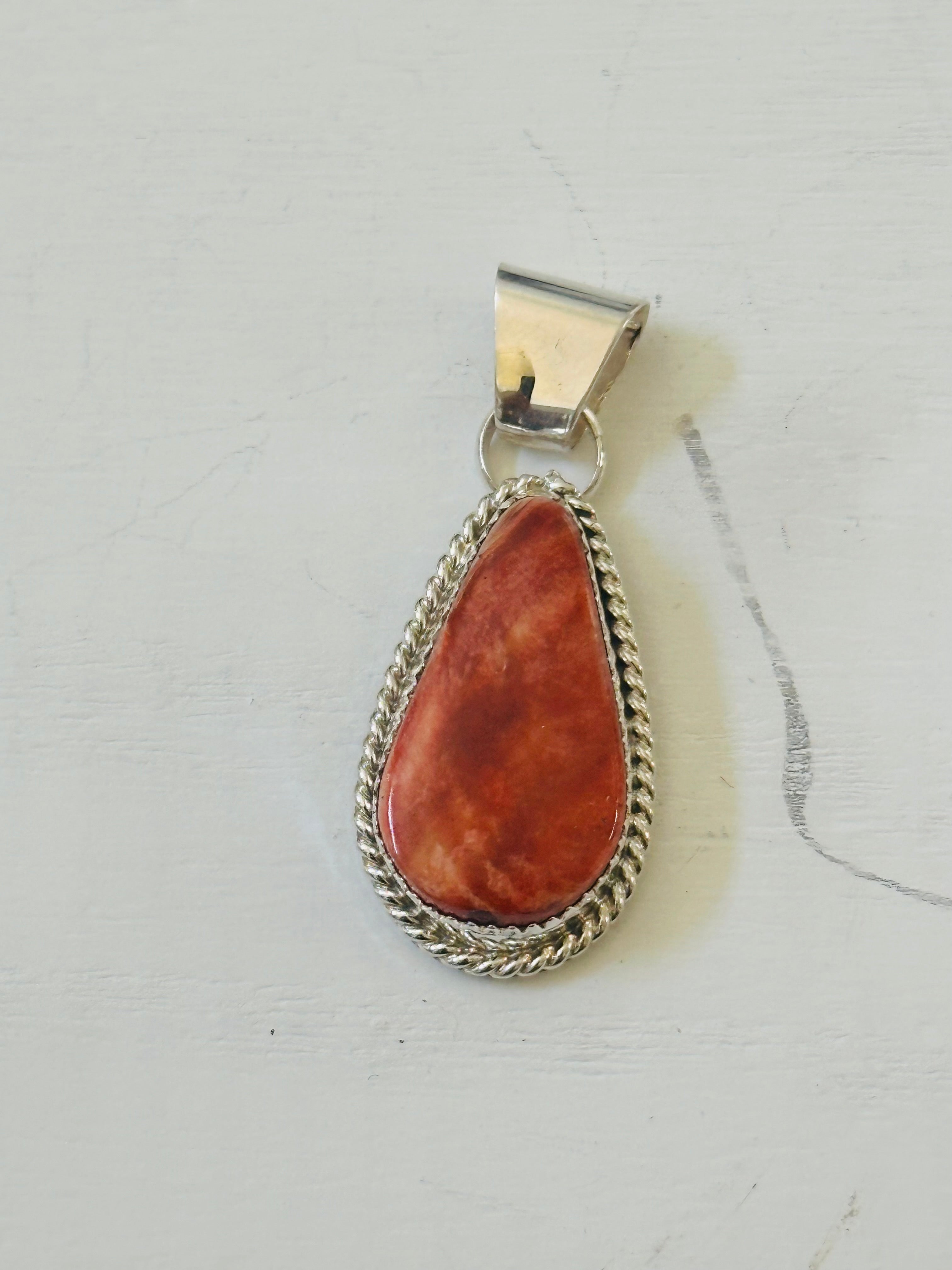 Gorgeous pendant, very well made. Navajo Made Spiny Oyster & Sterling Silver Pendant. It measures 1 7/8 inches long and 7/8 of an inch wide. Pendant Only. Signed by the artist and stamped sterling silver.