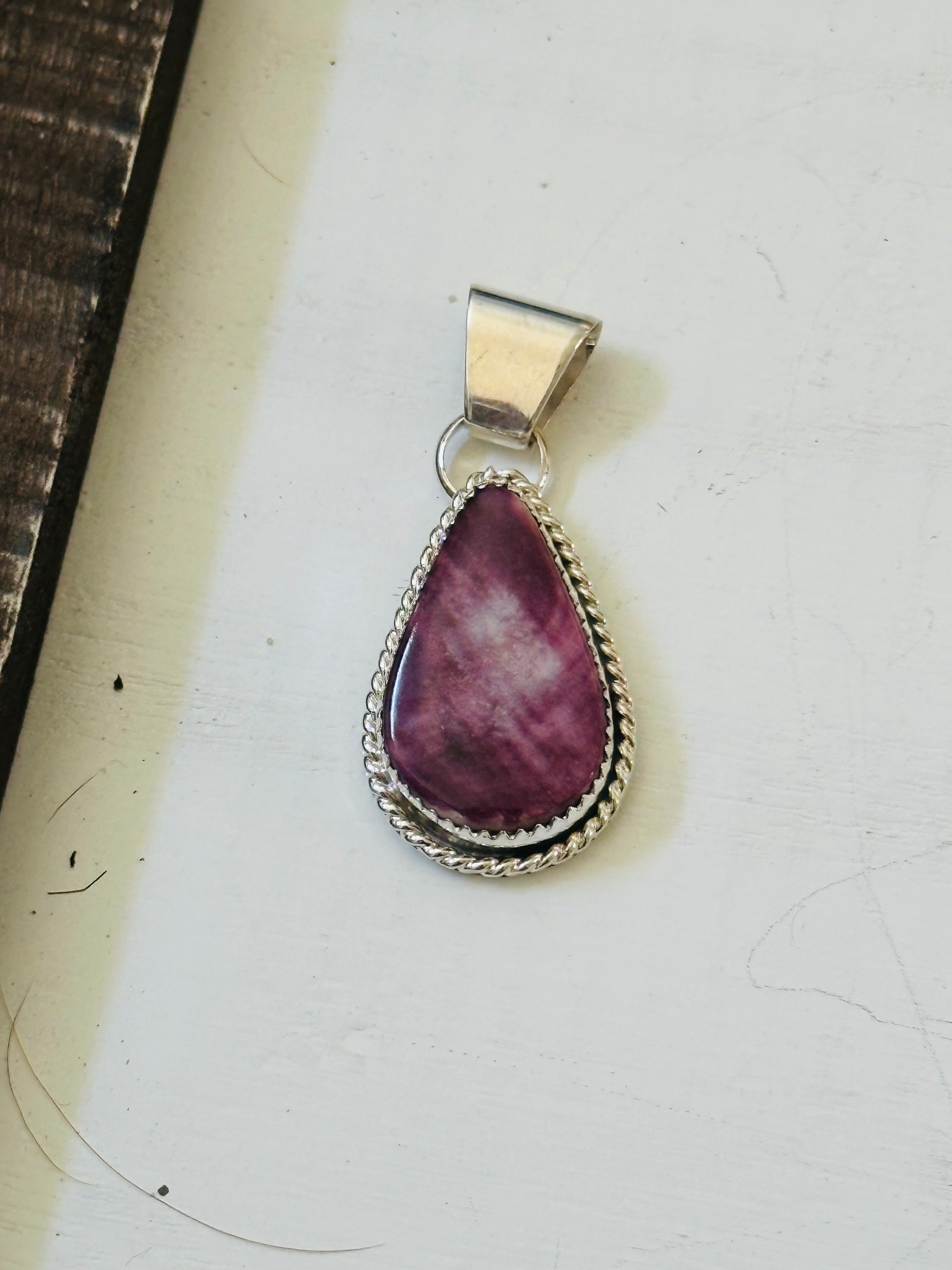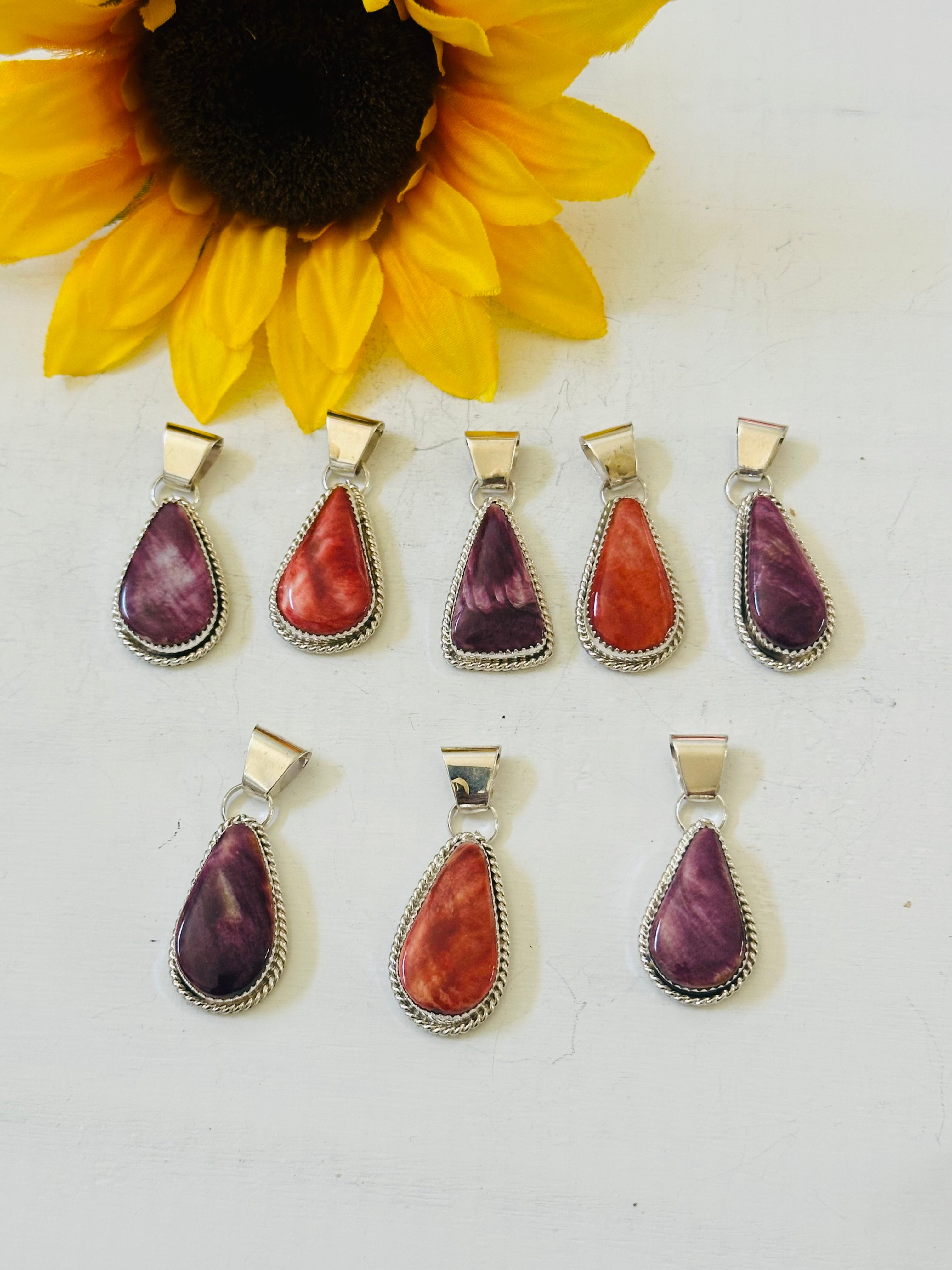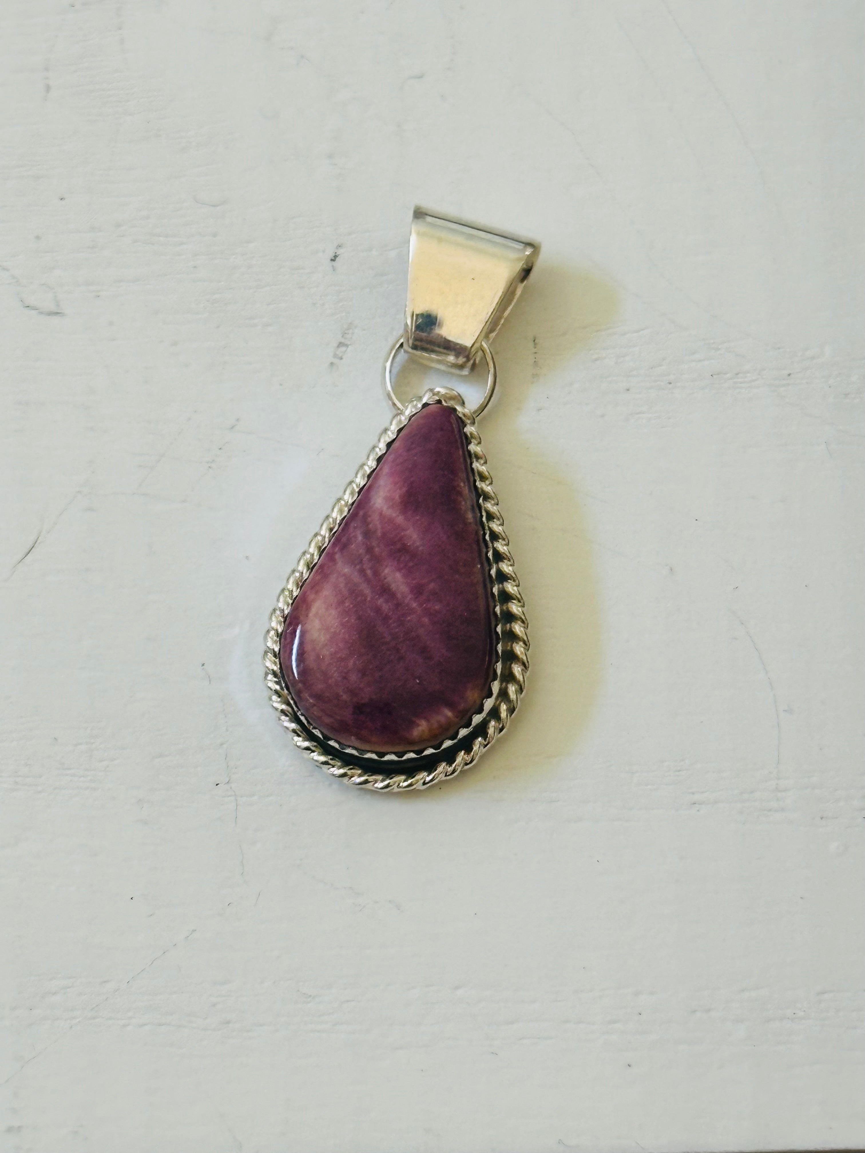 Gorgeous pendant, very well made. Navajo Made Spiny Oyster & Sterling Silver Pendant. It measures 1 7/8 inches long and 7/8 of an inch wide. Pendant Only. Signed by the artist and stamped sterling silver.