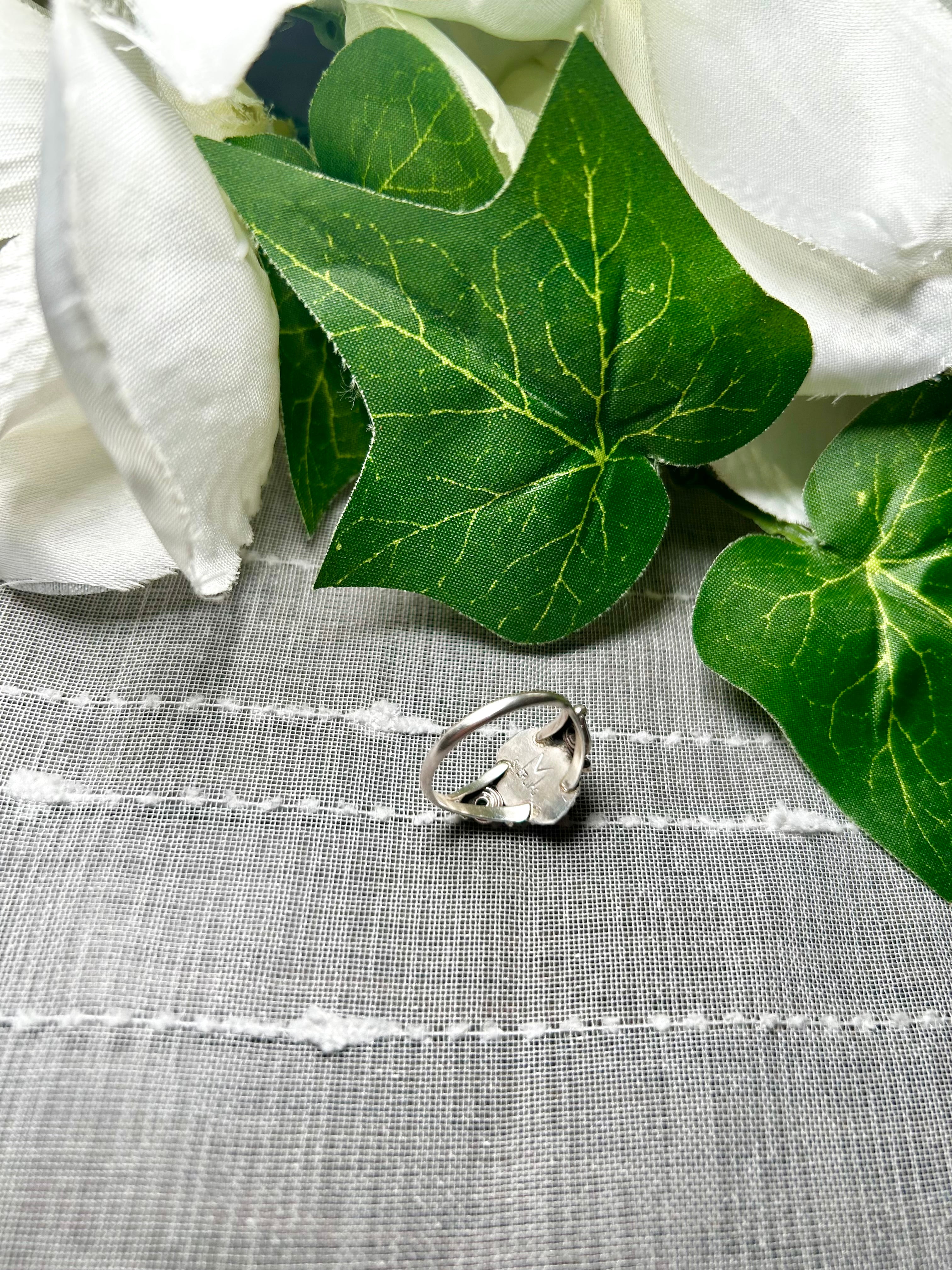 Navajo Made Spiny Oyster & Sterling Silver Ring Size 6.75. It measures 1/2 of an inch long and 3/4 of an inch wide. Signed by the artist and stamped sterling silver.