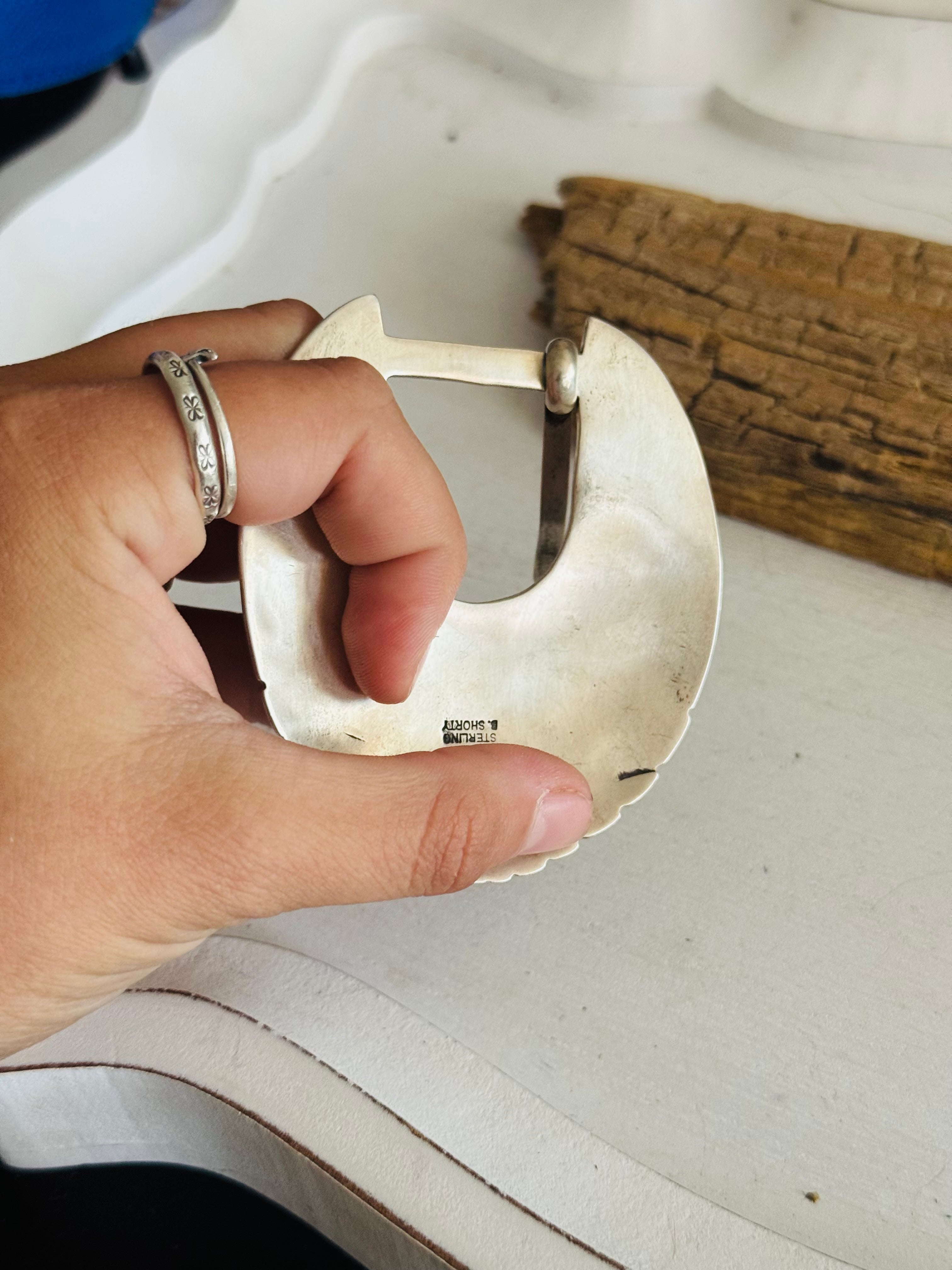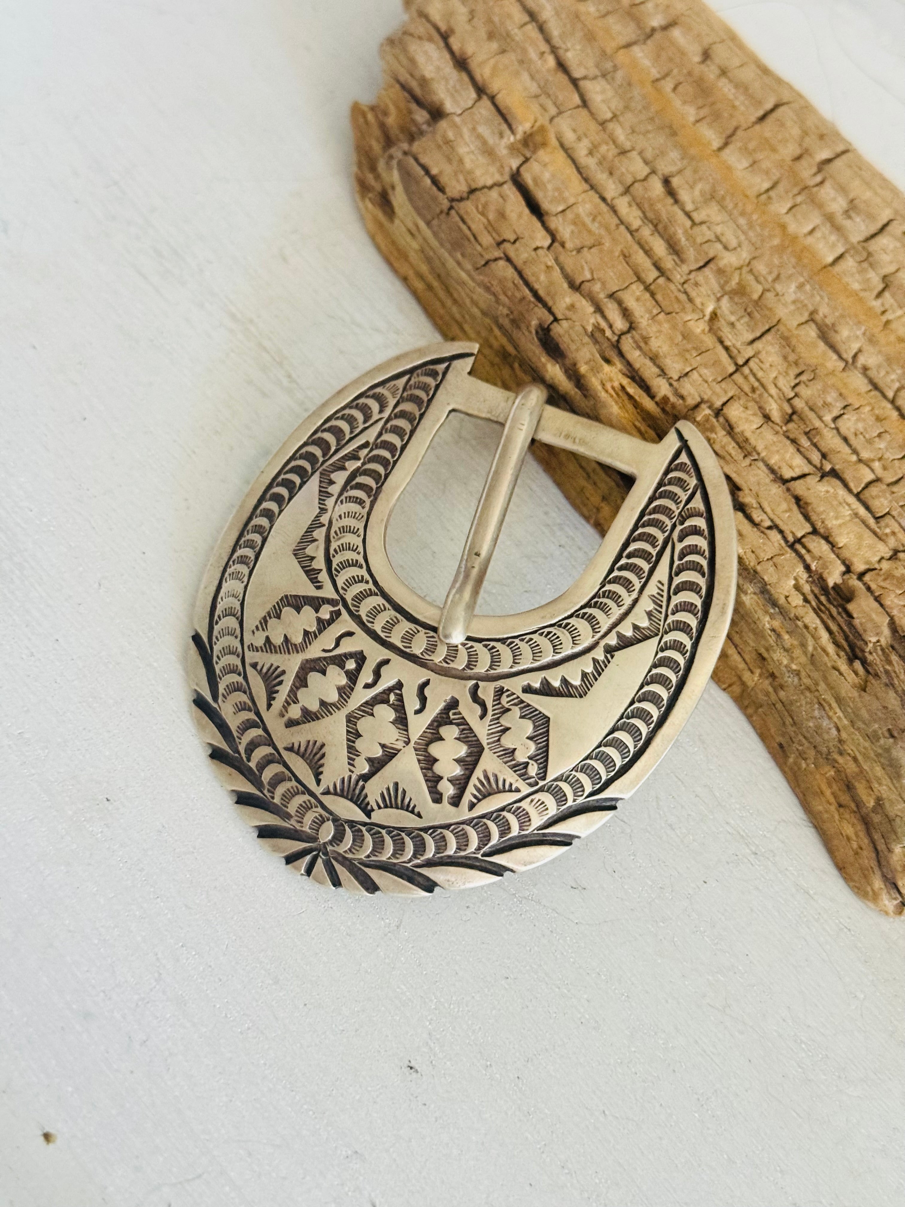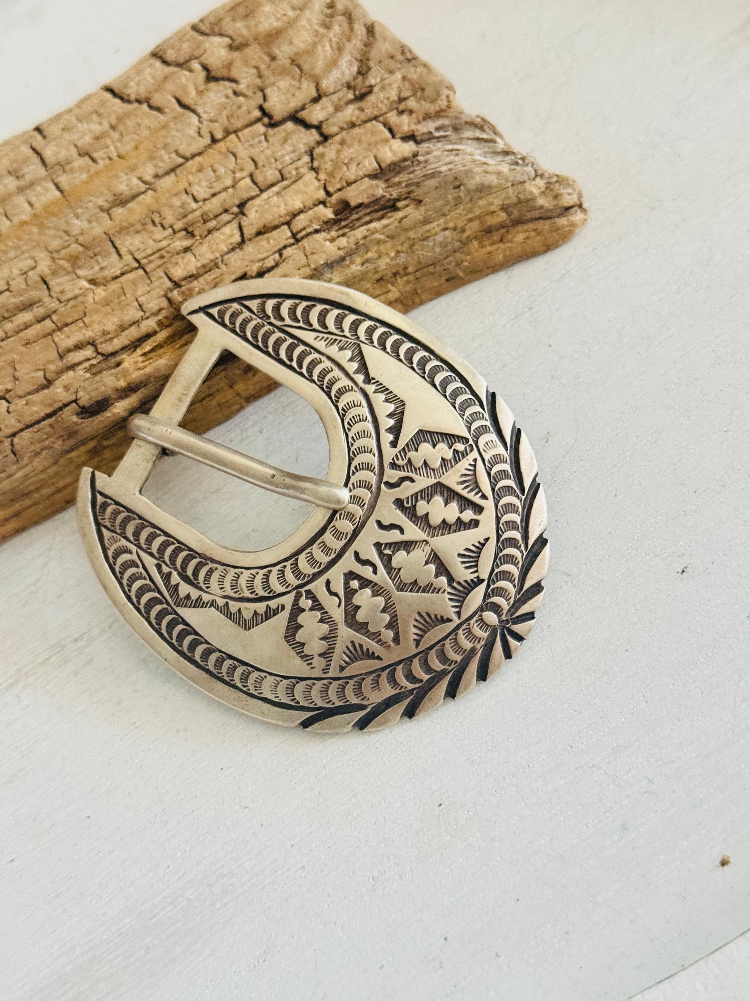 Navajo Made Sterling Silver Belt Buckle. It measures 3 1/8 inches long and 2 3/4 inches wide. Signed by the artist and stamped sterling silver.