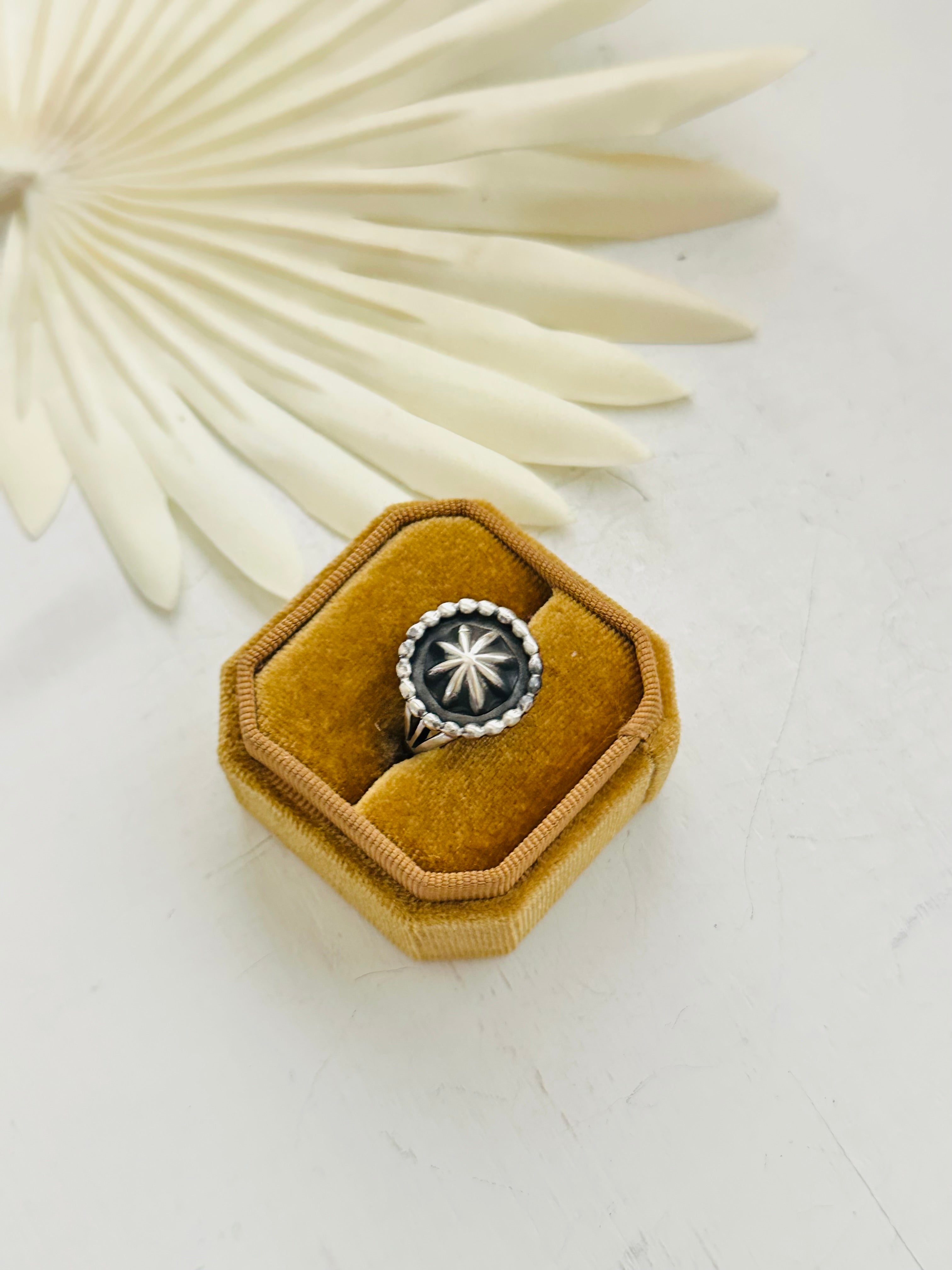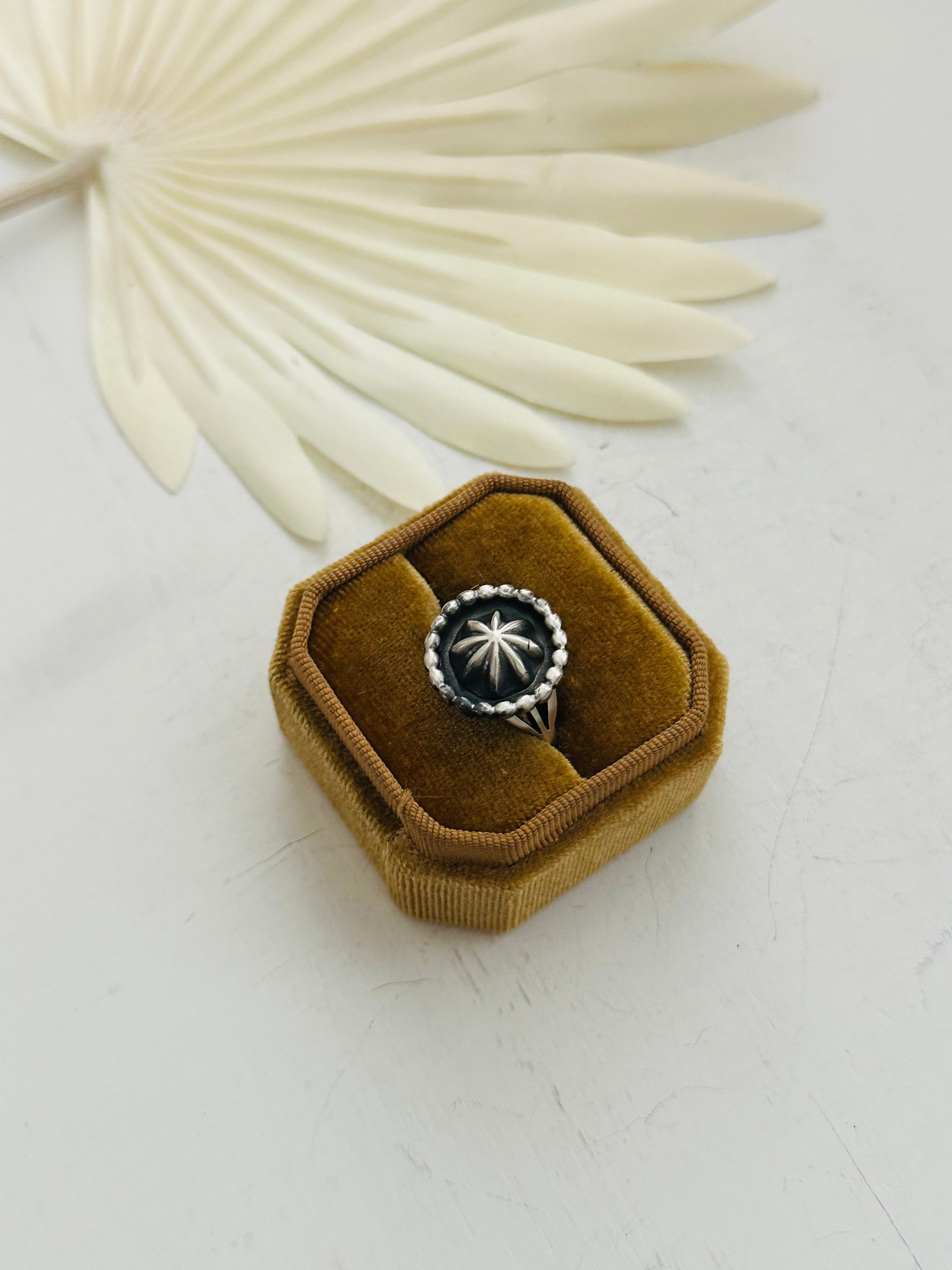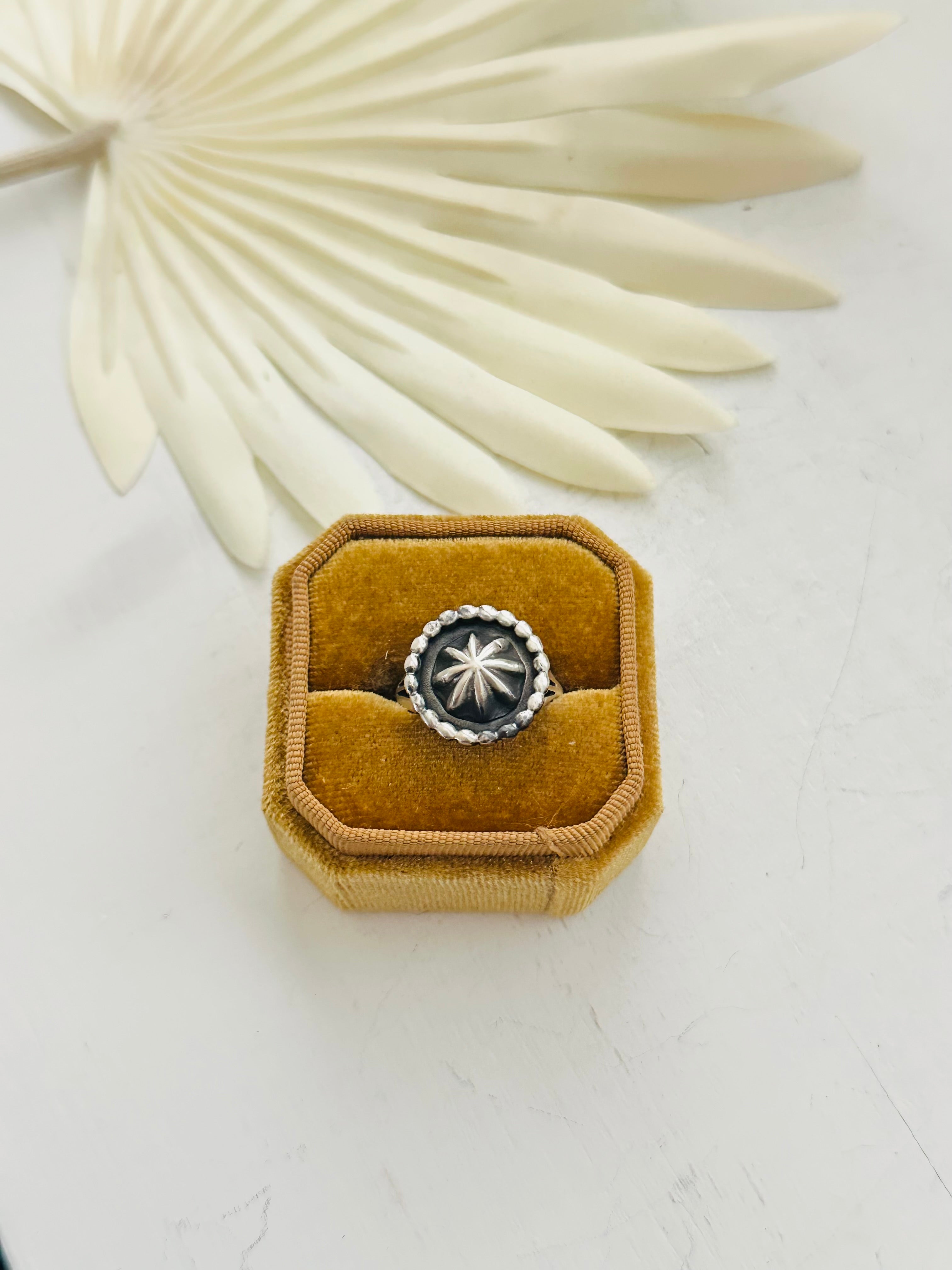 Kendal Yellowhorse Sterling Silver Concho Ring. It measures 5/8 of an inch round. Stangled sterling and signed by artist.