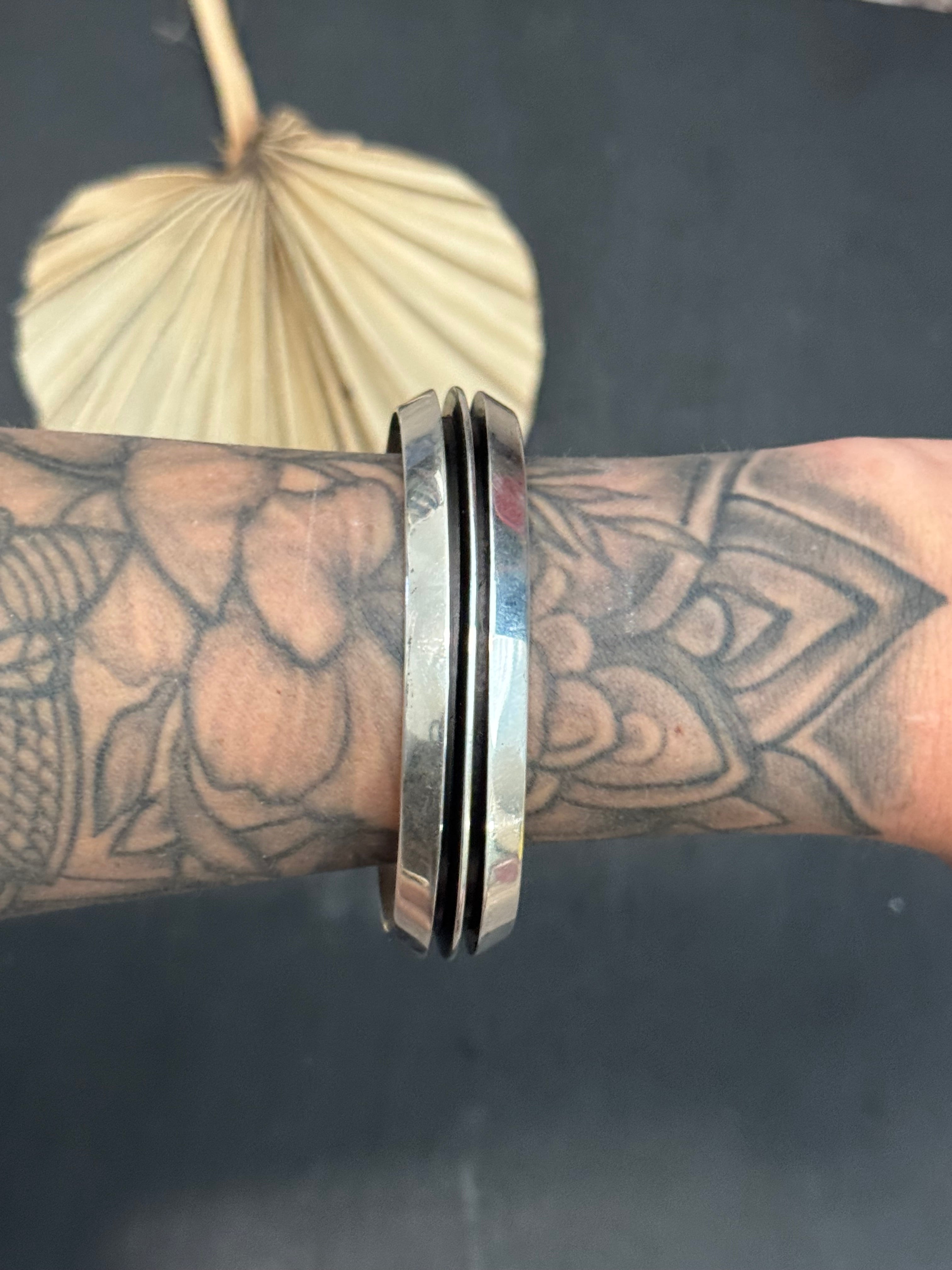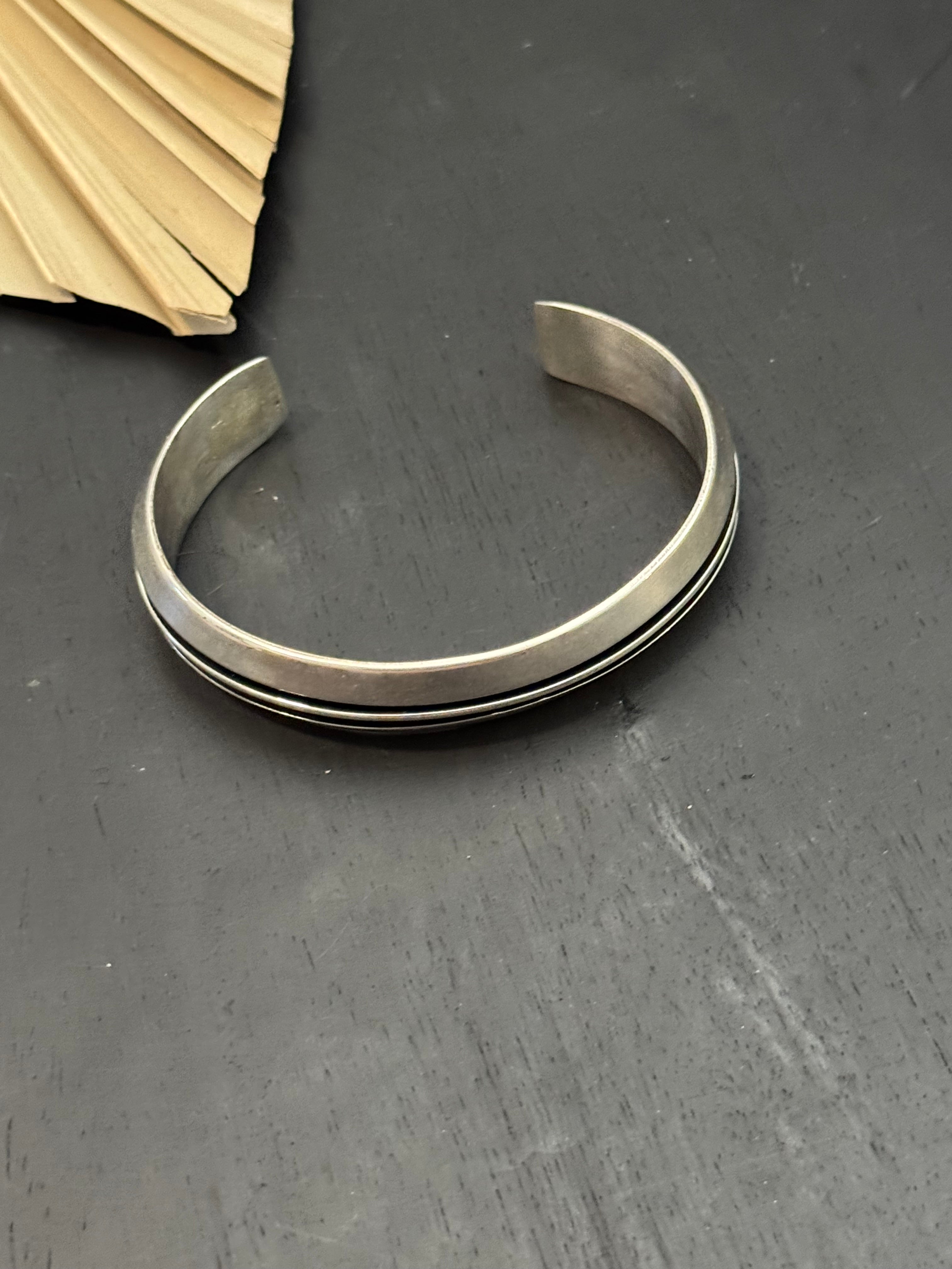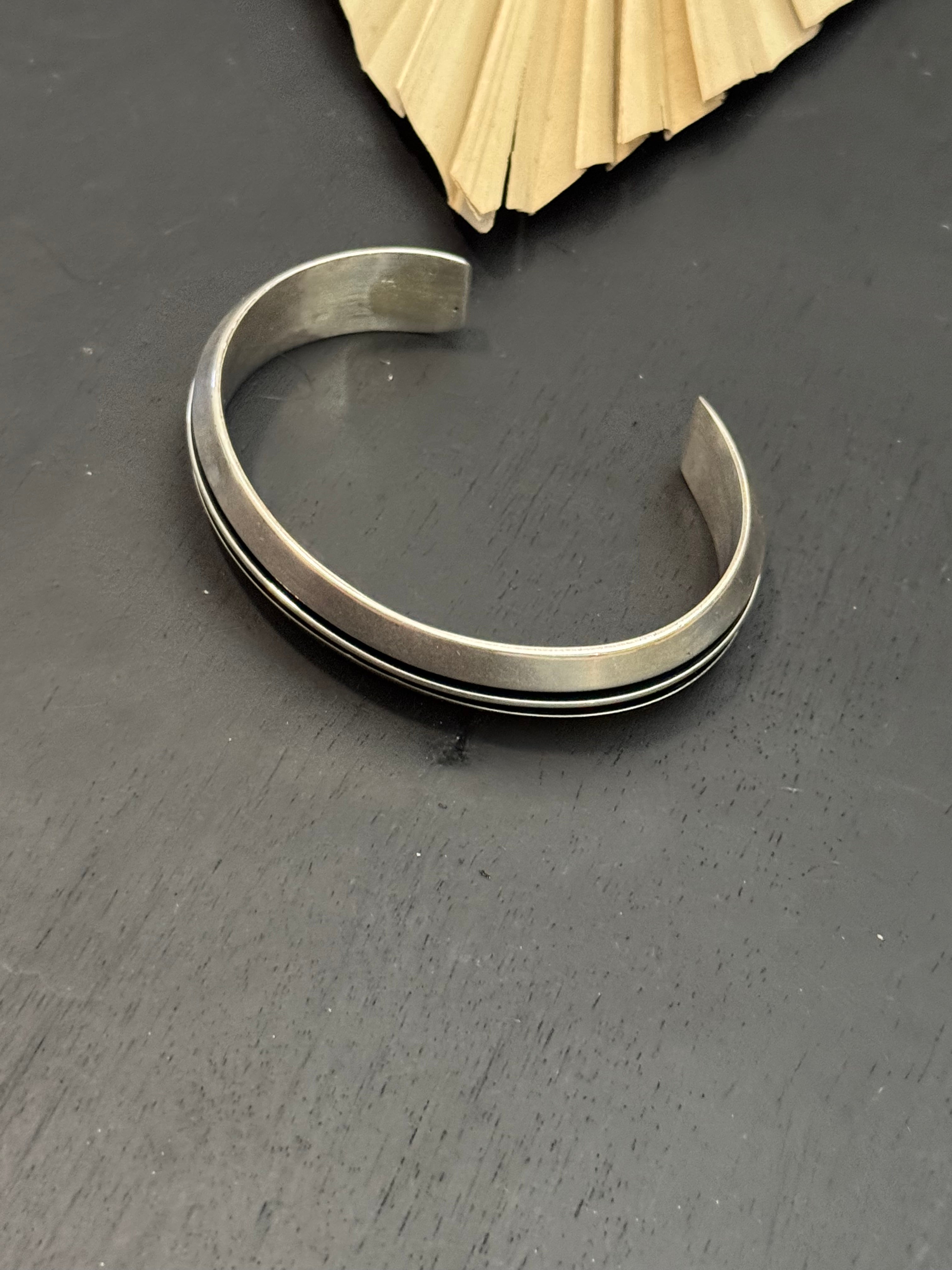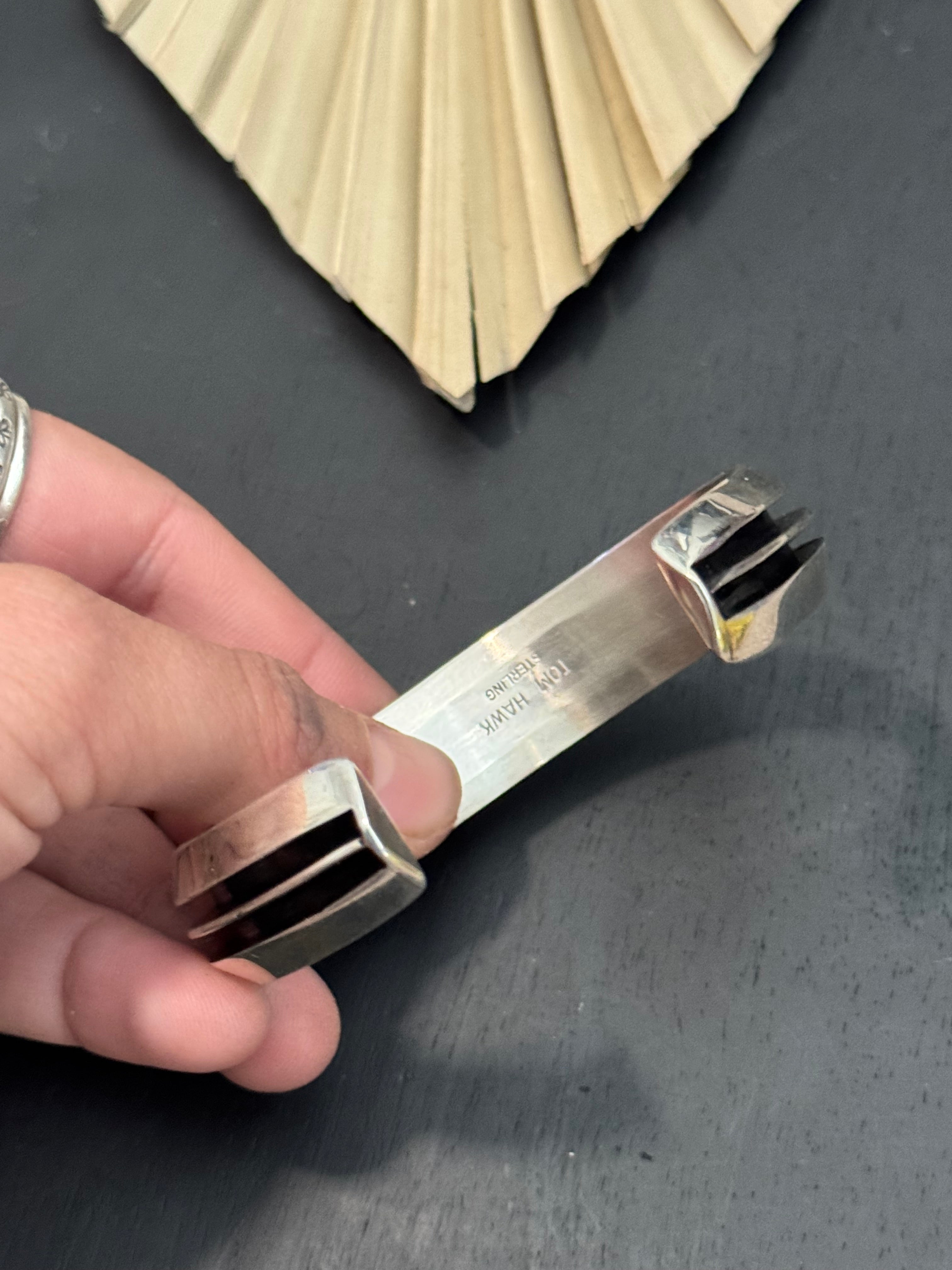 Tom Hawk Sterling Silver Cuff Bracelet. It measures 5/8 of an inch wide with an inside circumference of 5 5/8 inches and a gap of 1 3/8 inches. Signed by the artist and stamped sterling silver.