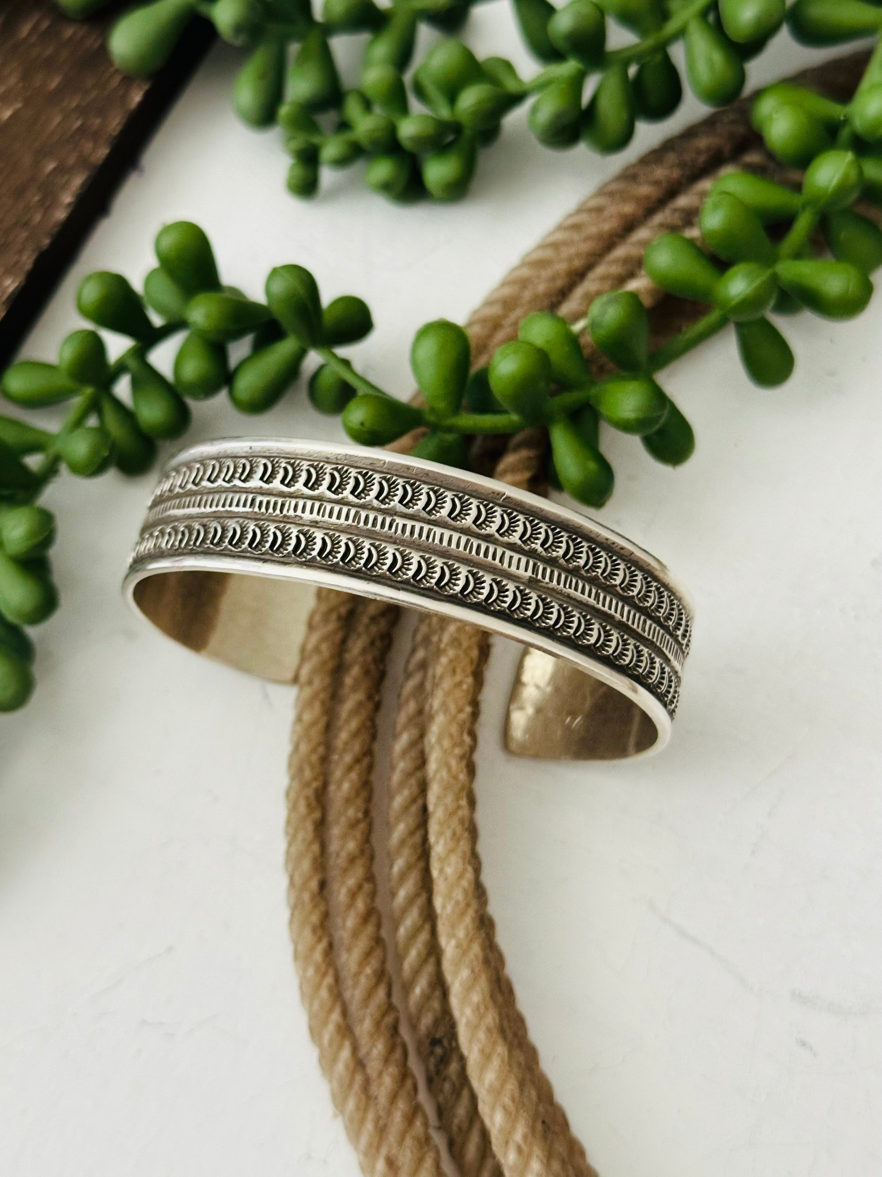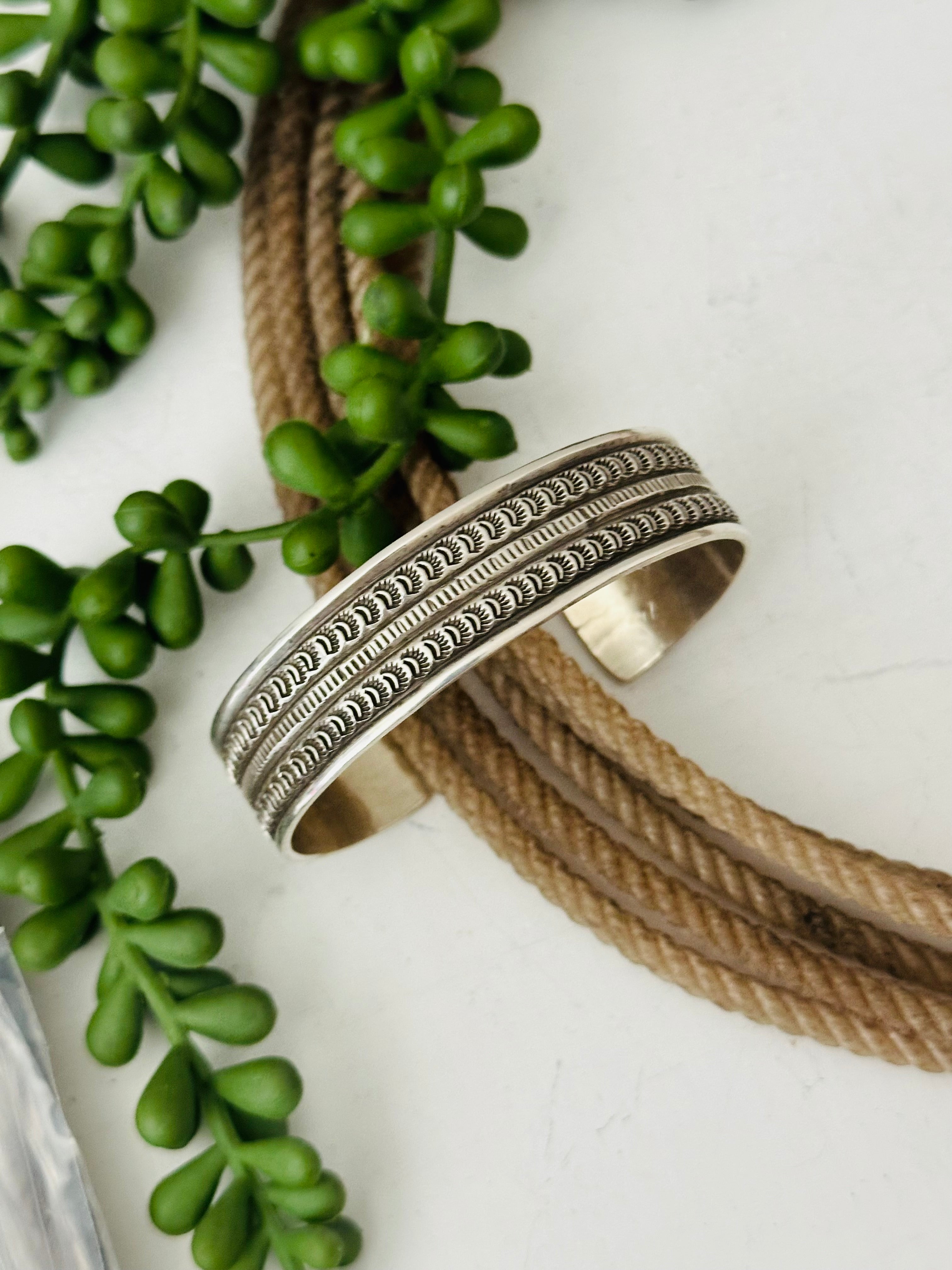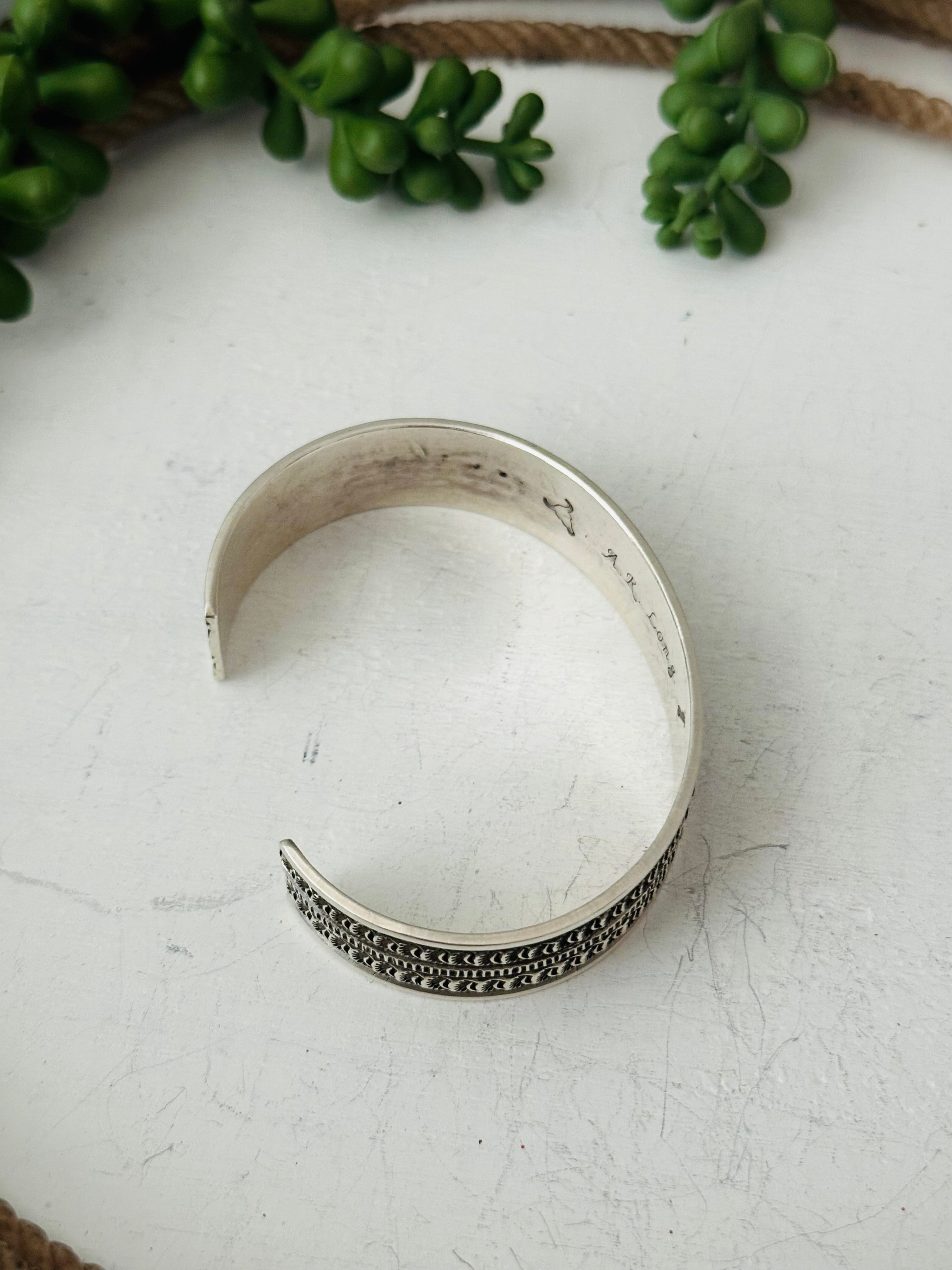 Ar Long Sterling Silver Cuff Bracelet. It measures 5/8 of an inch wide with an inside circumference of 6 inches and a gap of 1 inch. Signed by artist and stamped sterling silver.