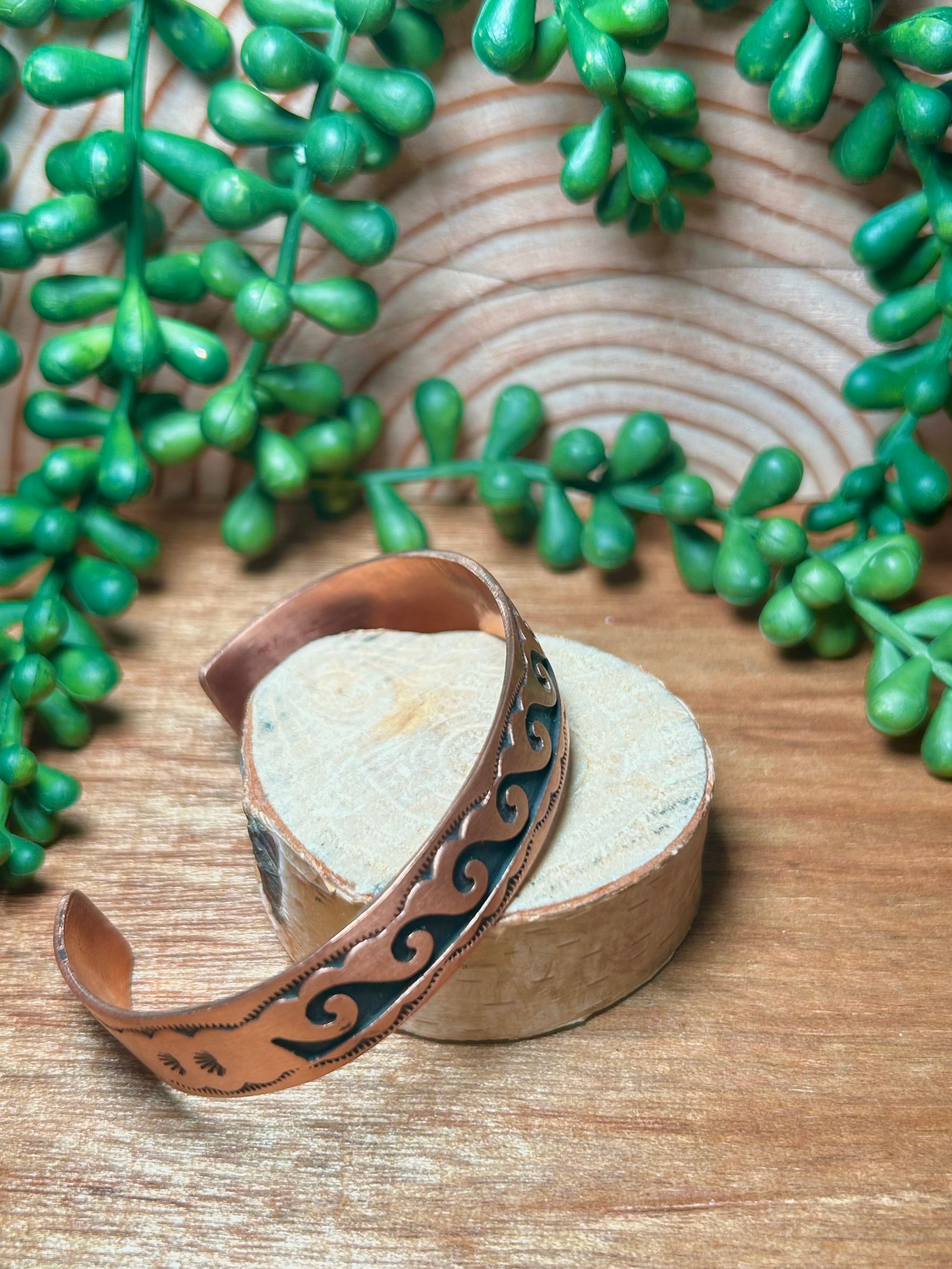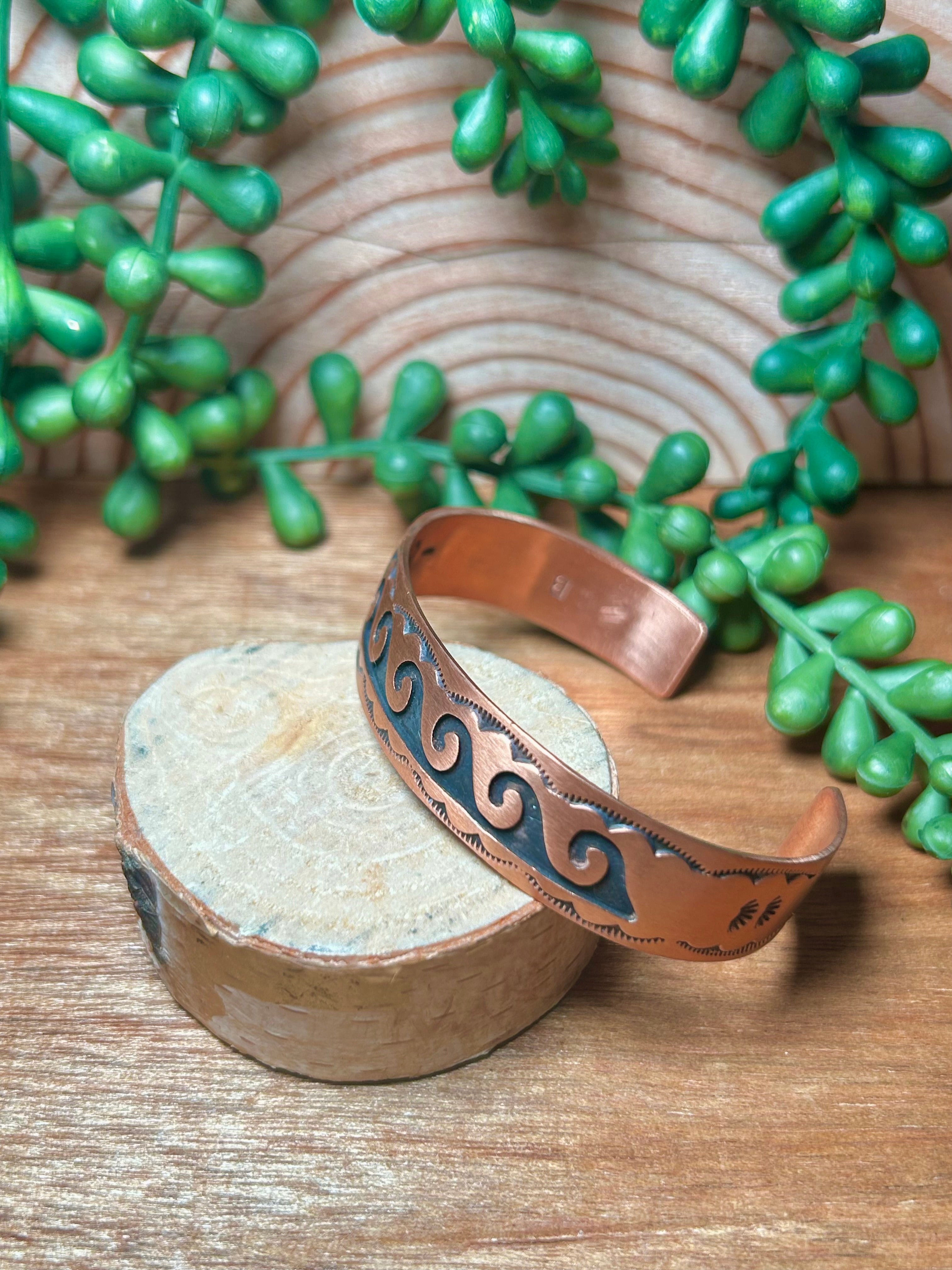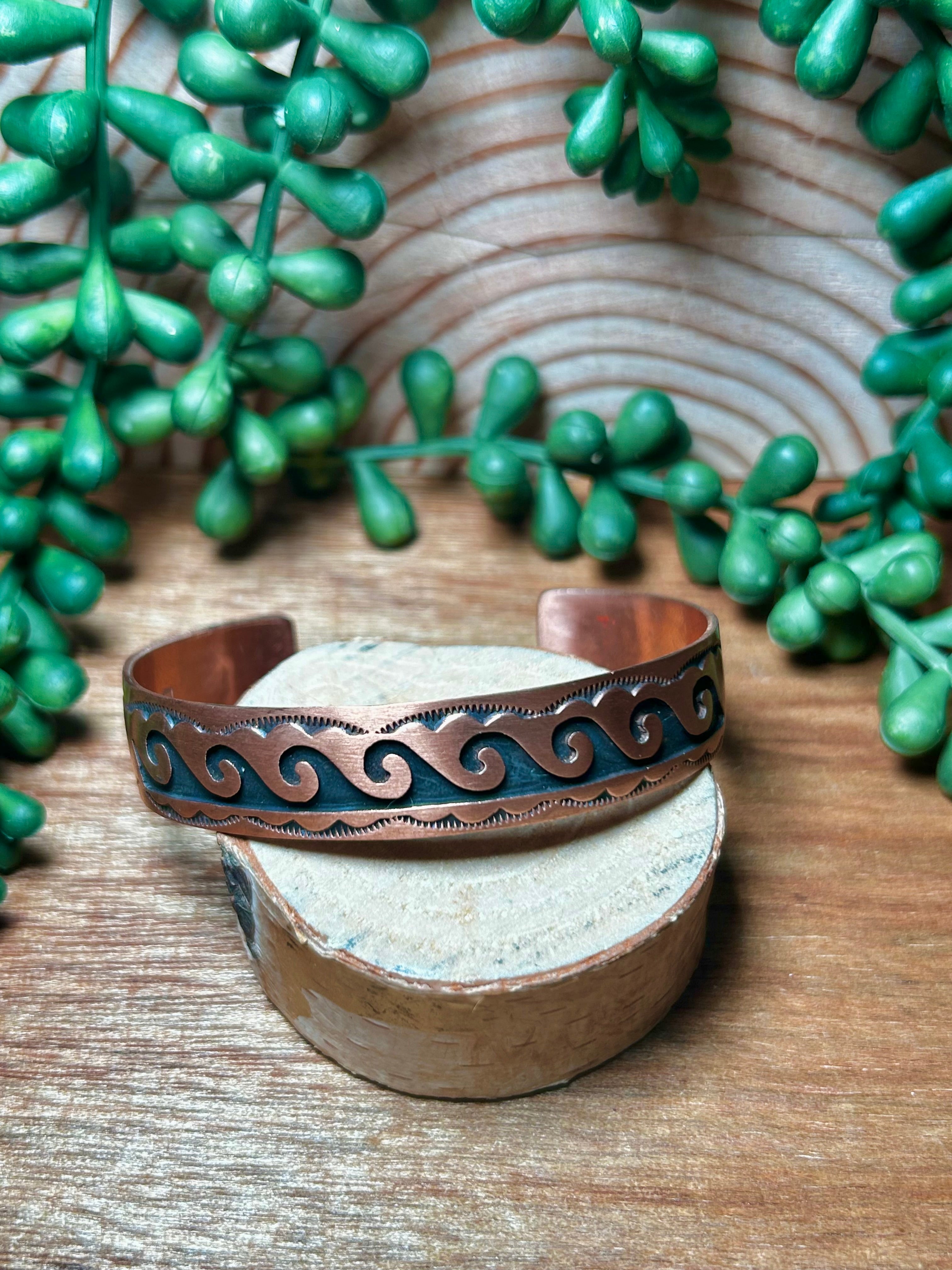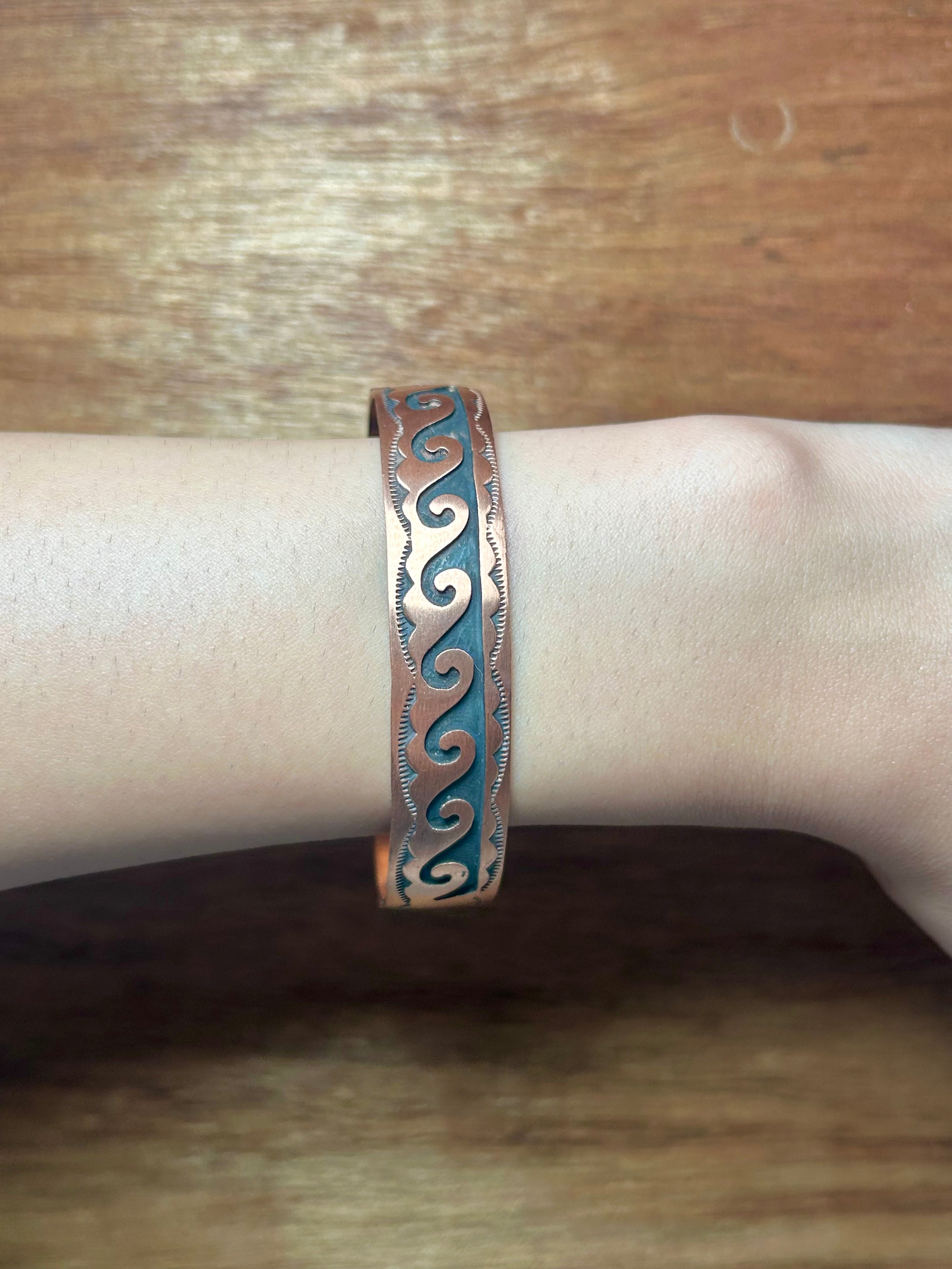 Navajo Made Copper Cuff Bracelet. It measures 1/2 of an inch wide with an inside circumference of 6 3/4 inches and a gap of 1 1/4 inches. Signed by artist and stamped sterling silver.