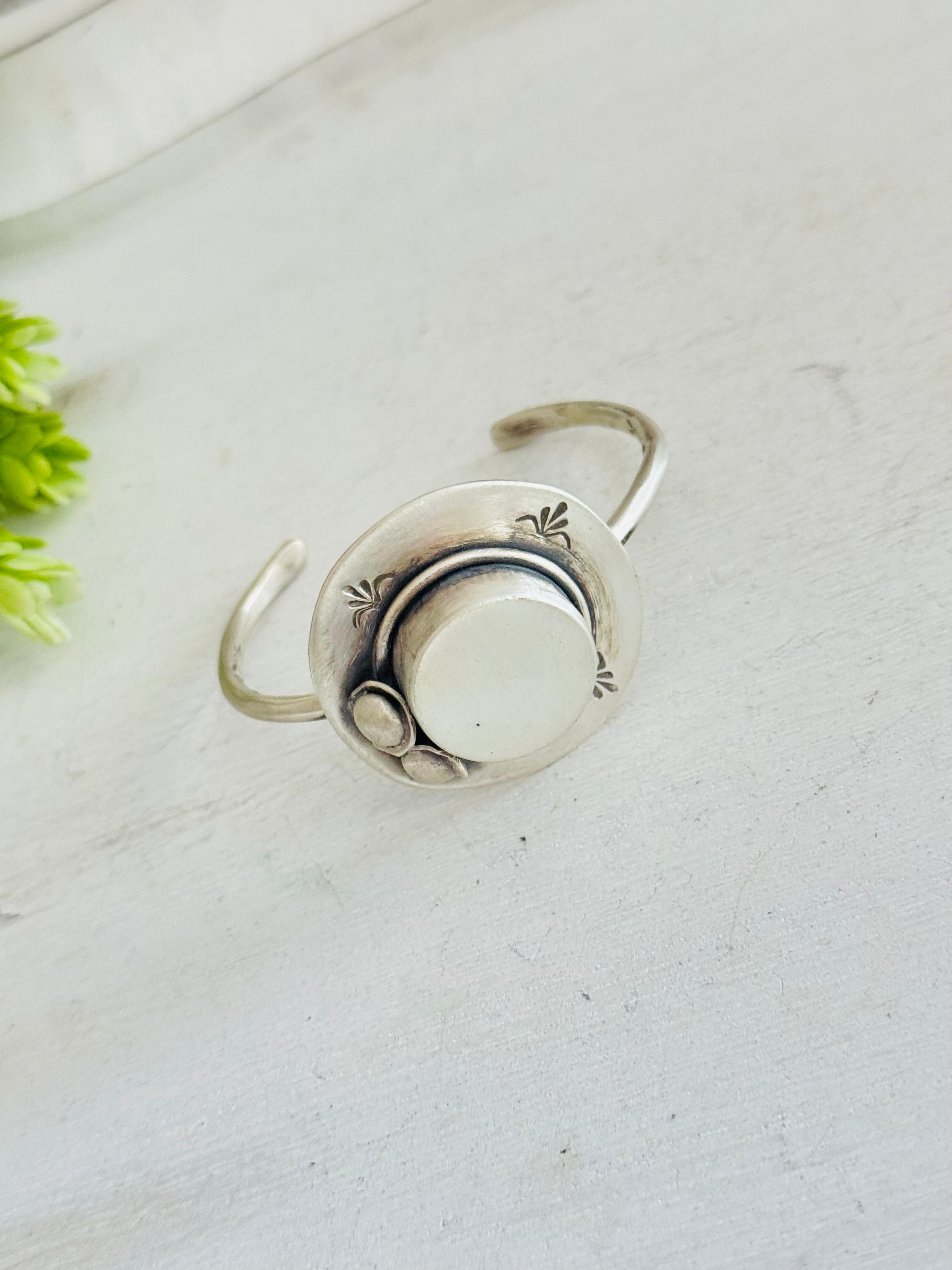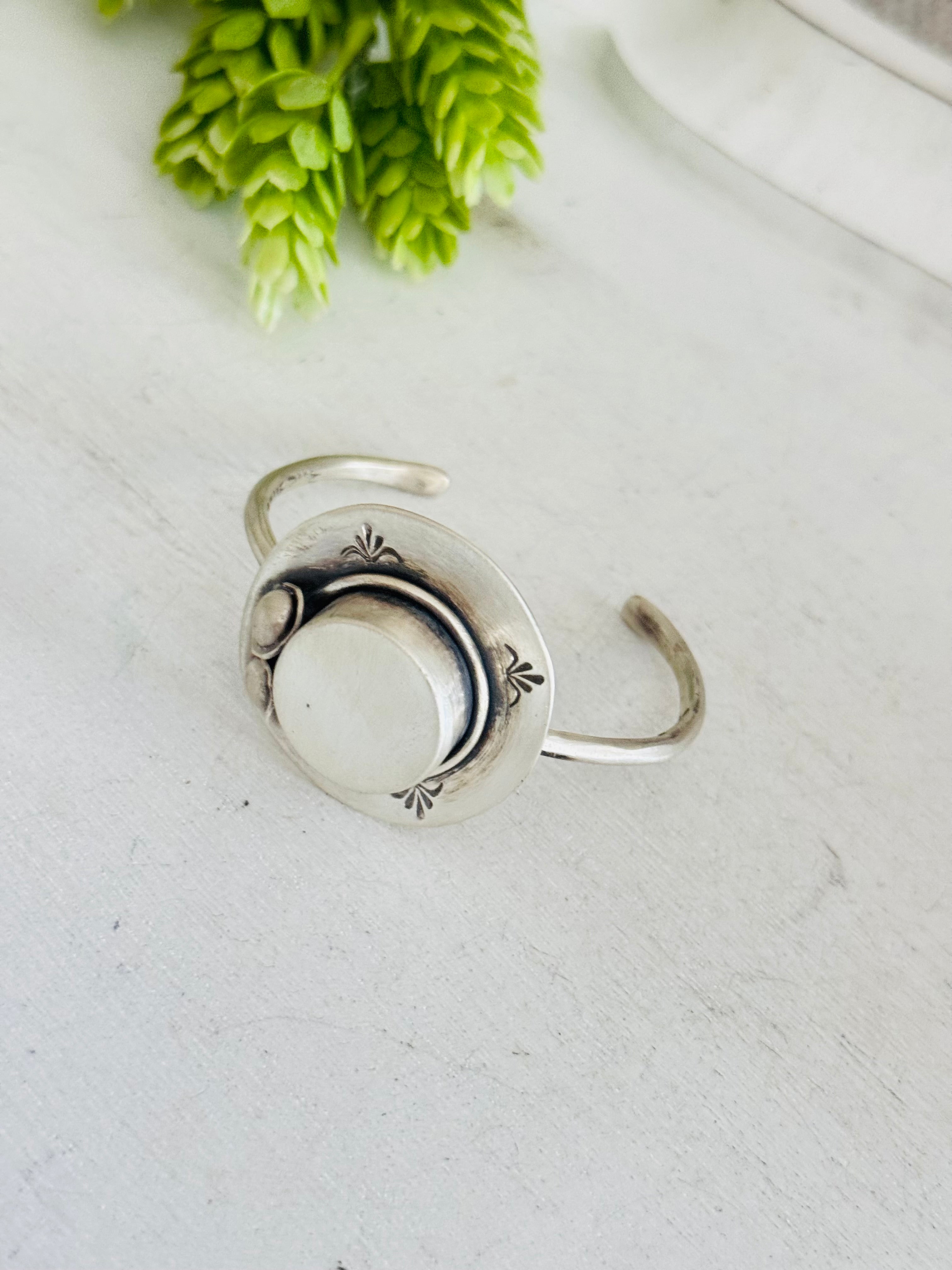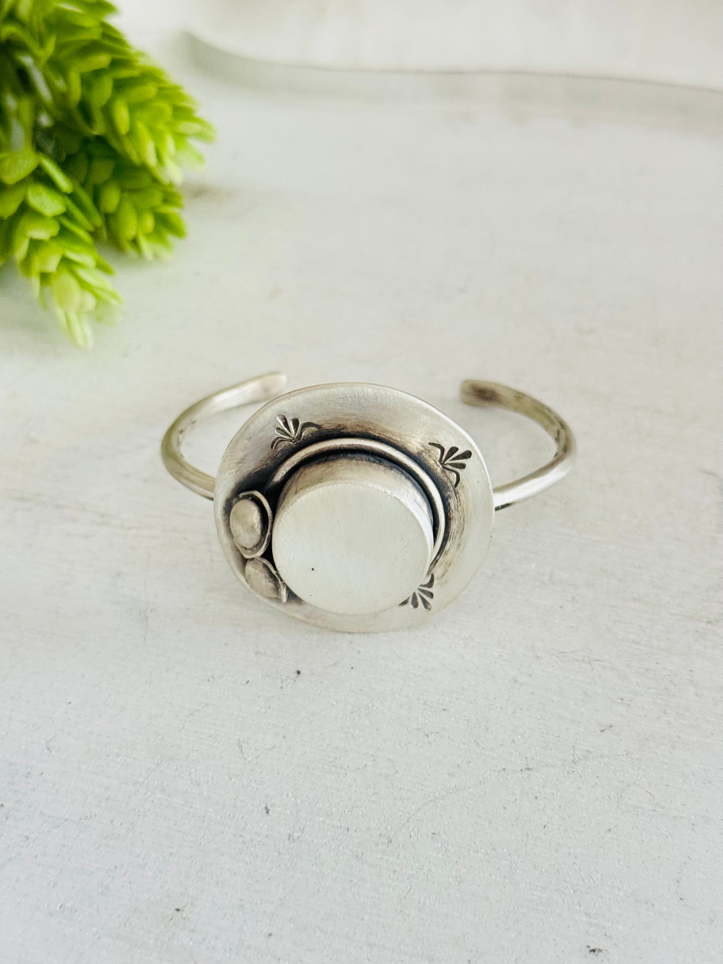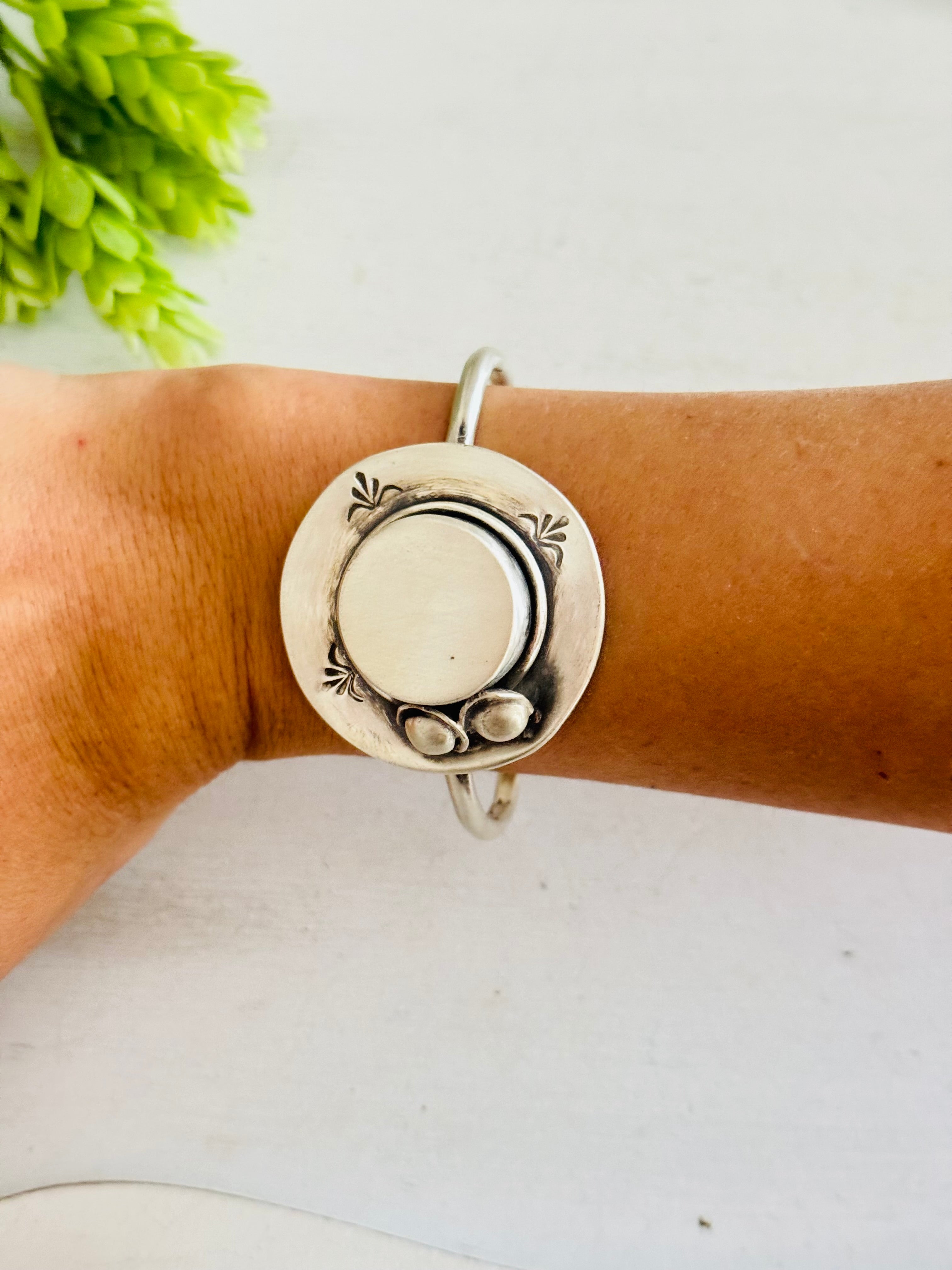 Larry Jackson Sterling Silver Cuff Bracelet. It measures 1 1/2 inches wide with an inside circumference of 5 1/8 inches and a gap of 1 3/8 inches. Signed by artist and stamped sterling silver.