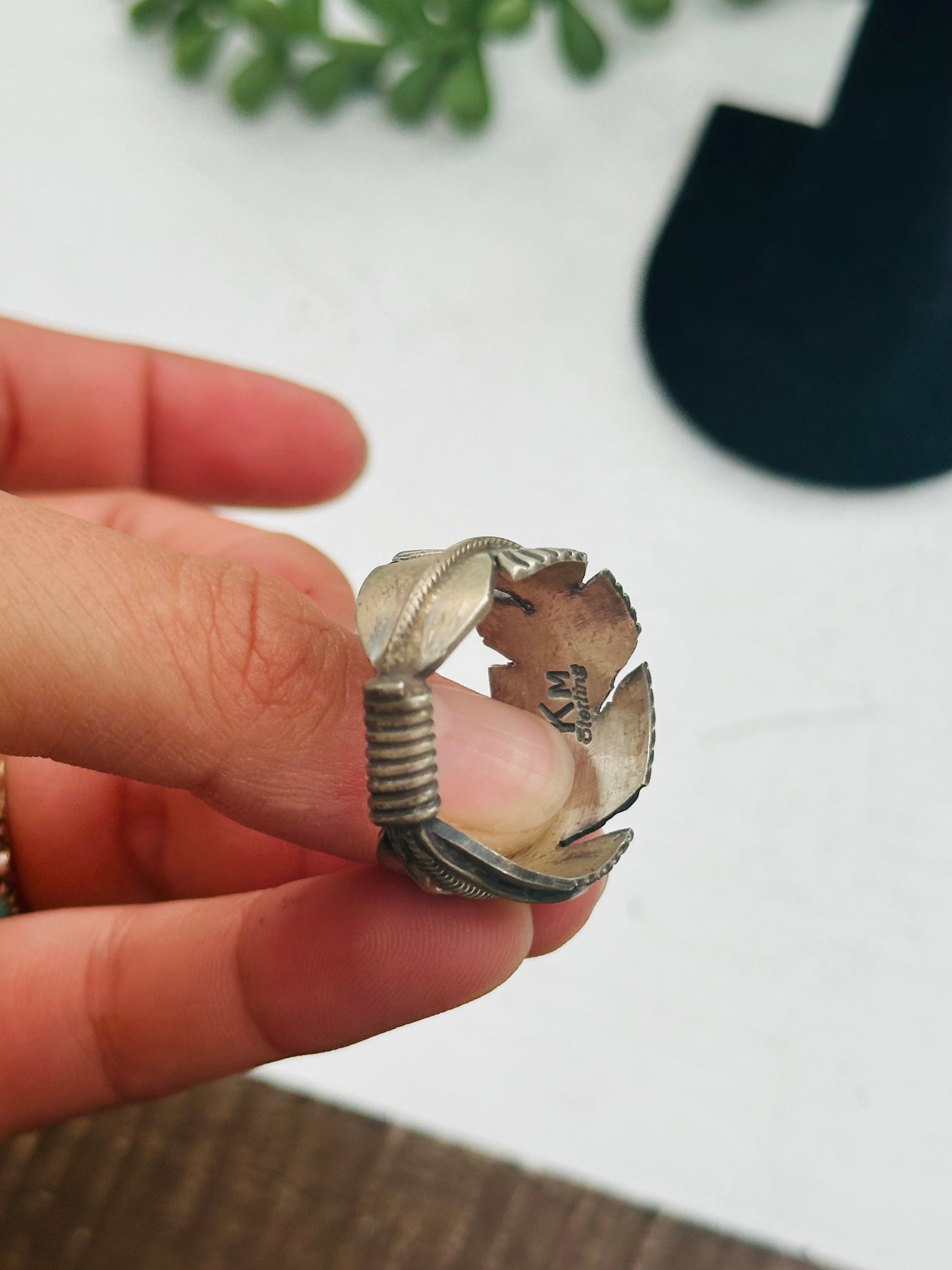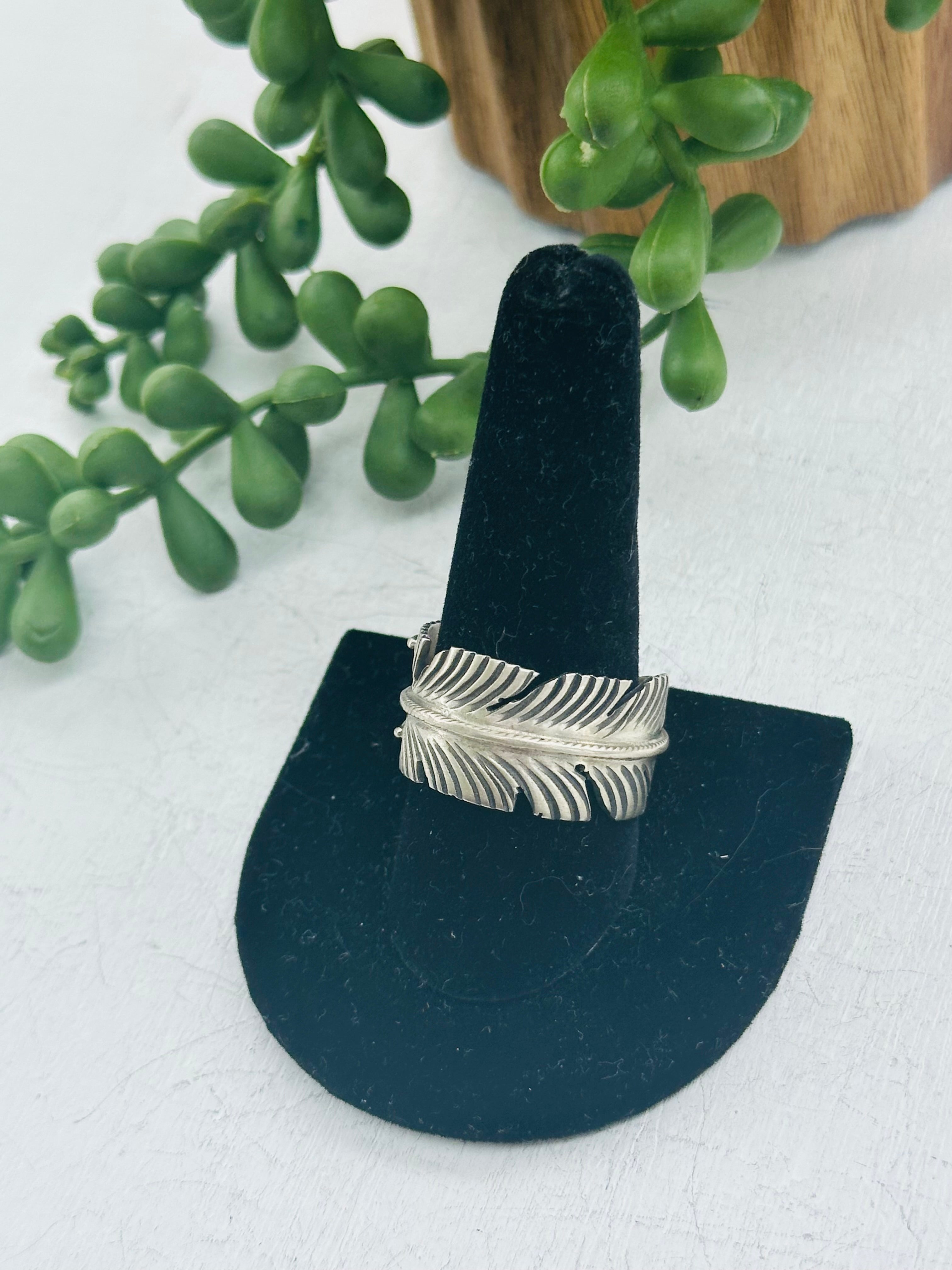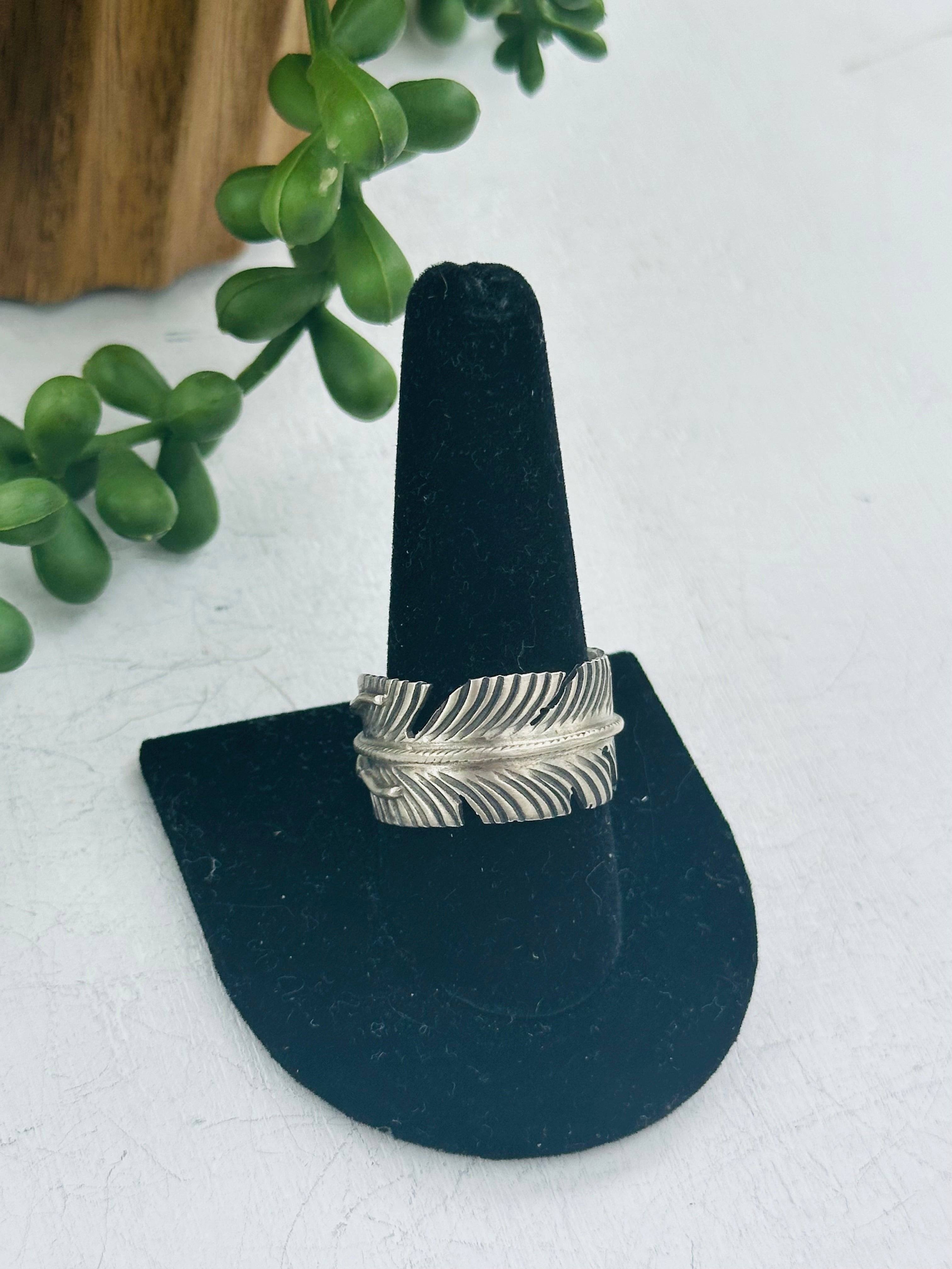Navajo Made Sterling Silver Feather Ring. It measures just under 5/8 of an inch wide. Signed by the artist and stamped sterling silver.