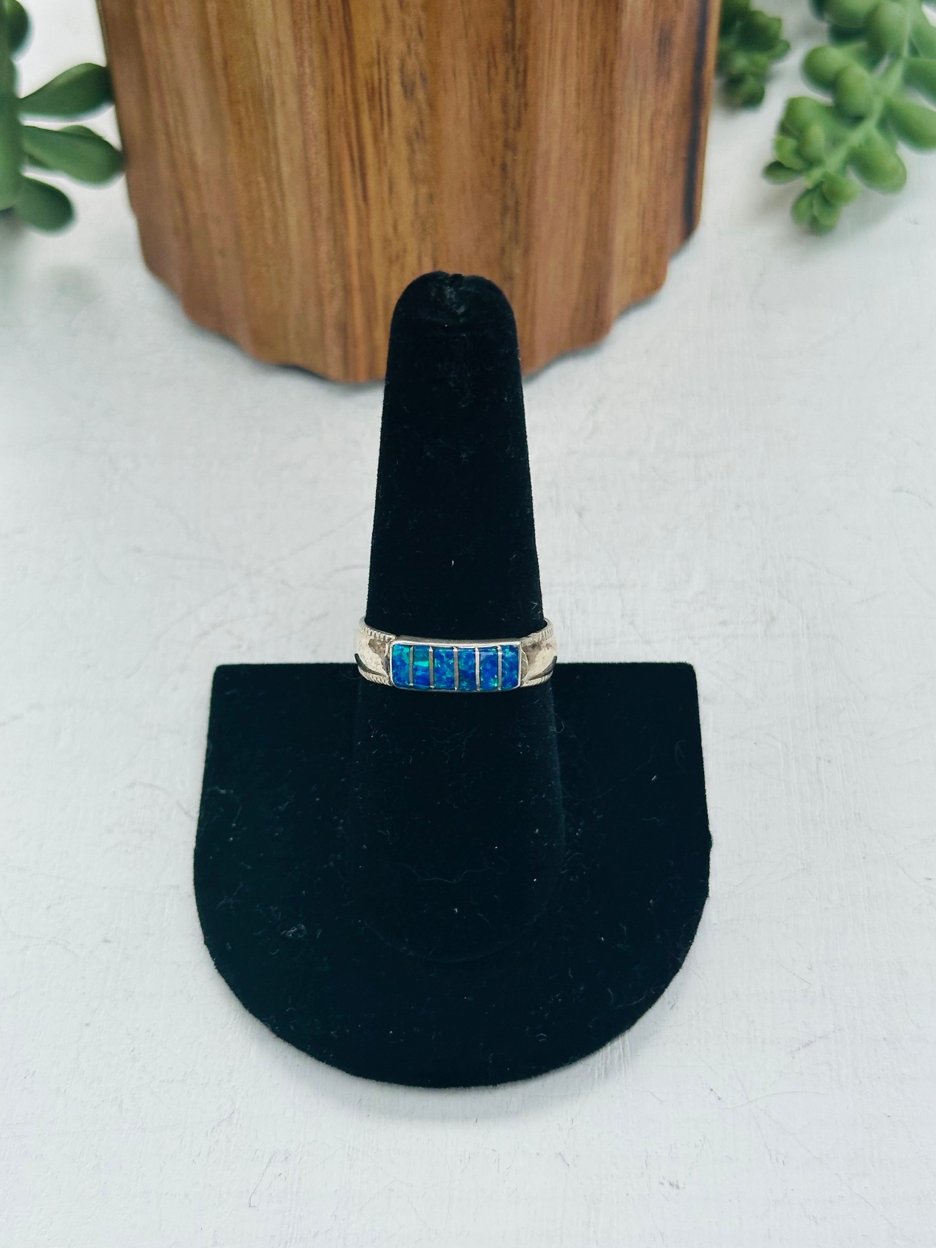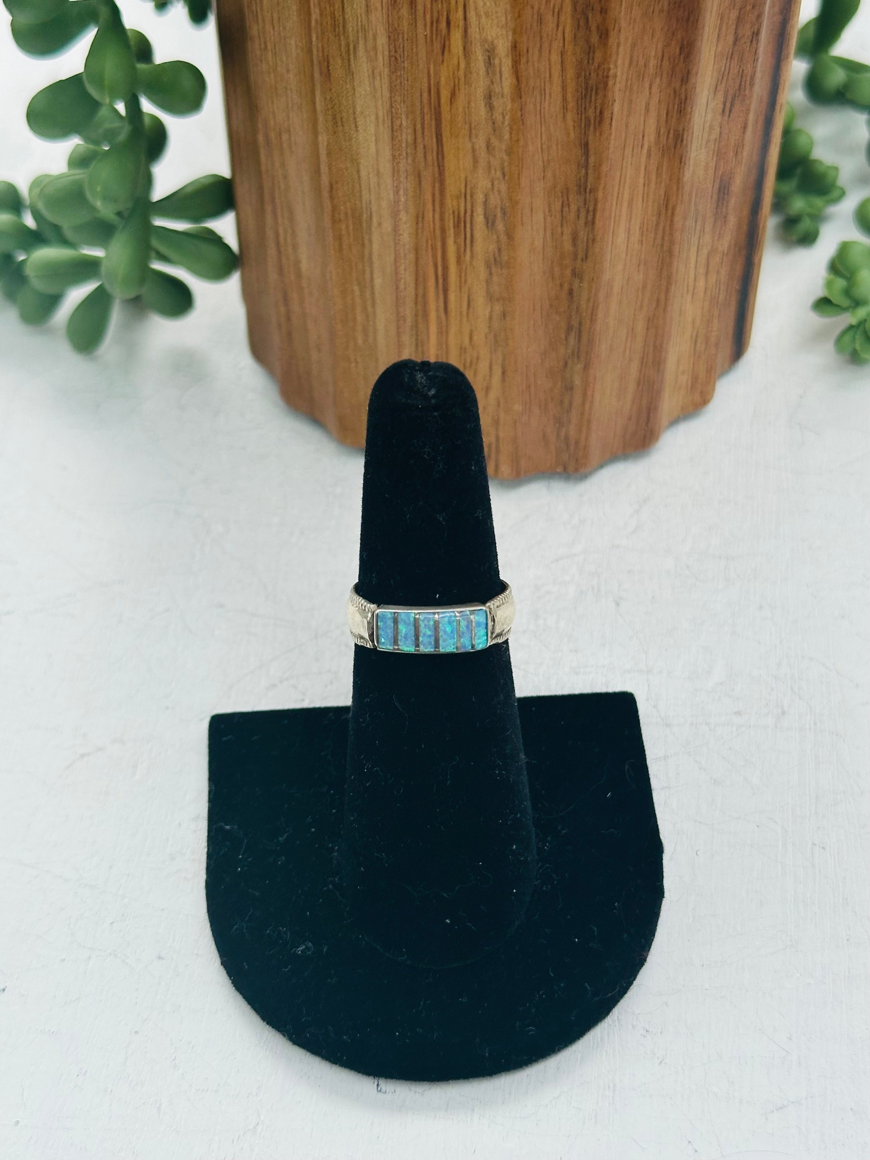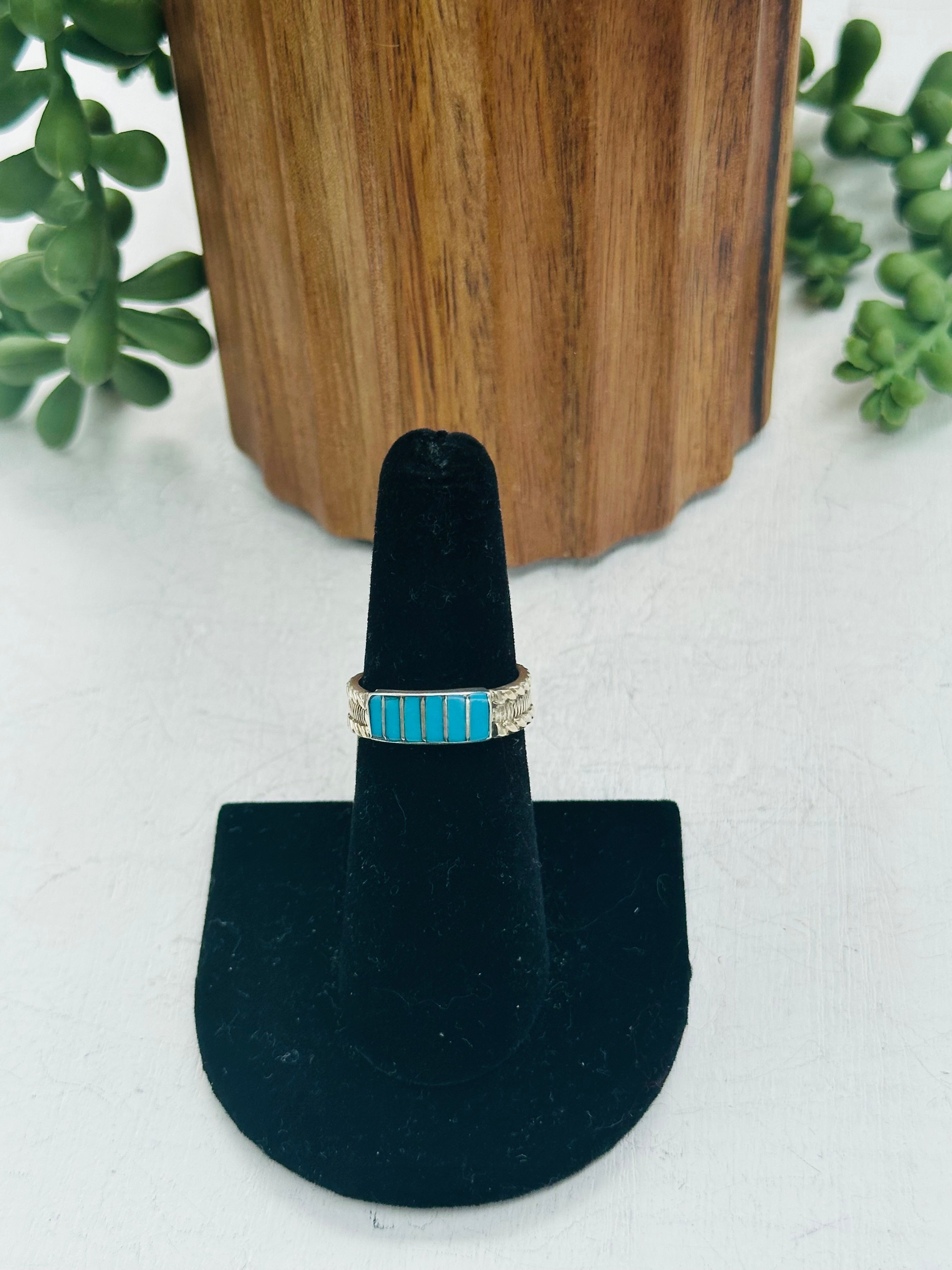 This is an awesome ring. Navajo Made Sterling Silver Inlay Ring. It measures 1/8 of an inch long. Stamped and signed. Stones will vary due to natural stones.