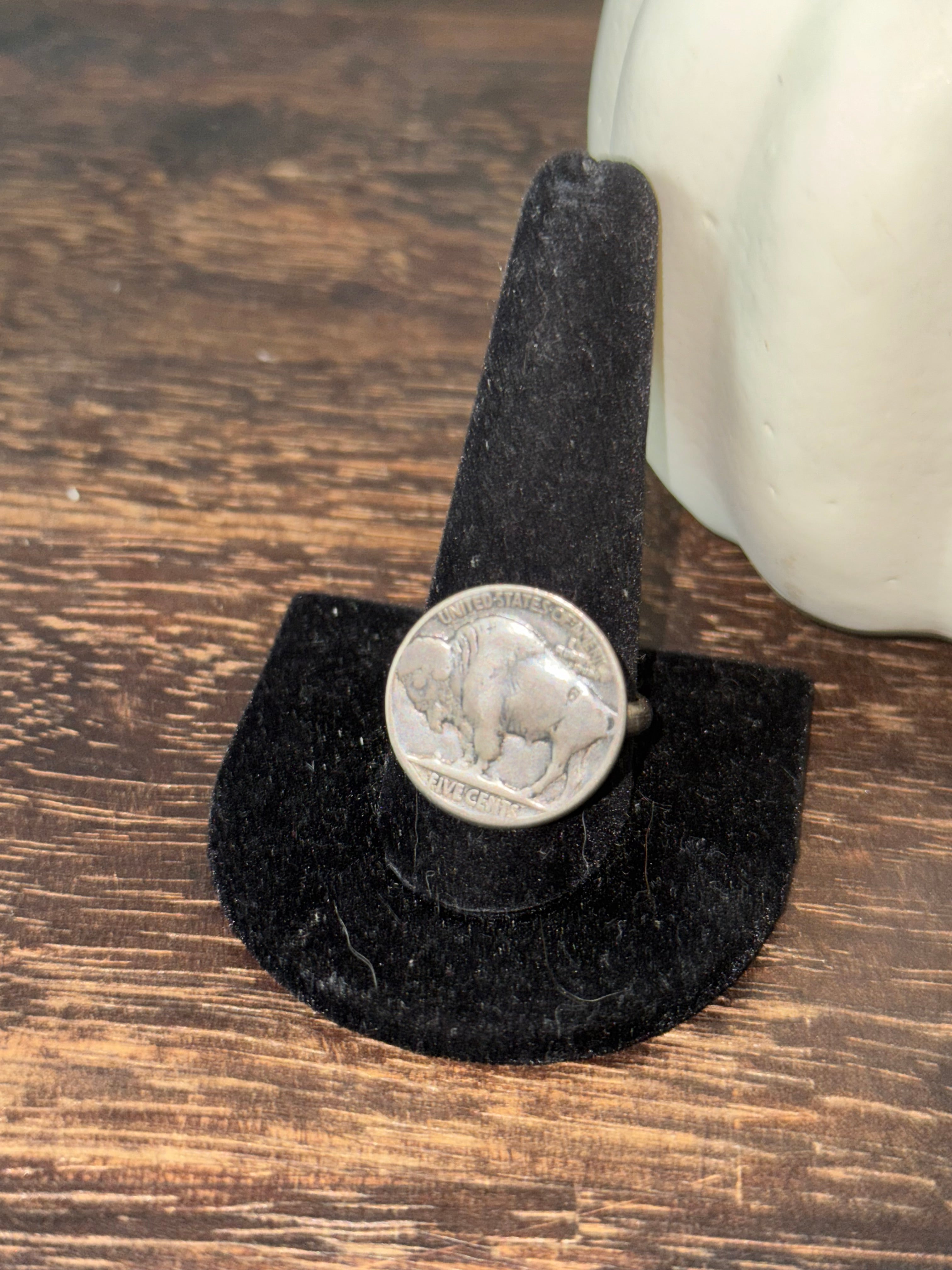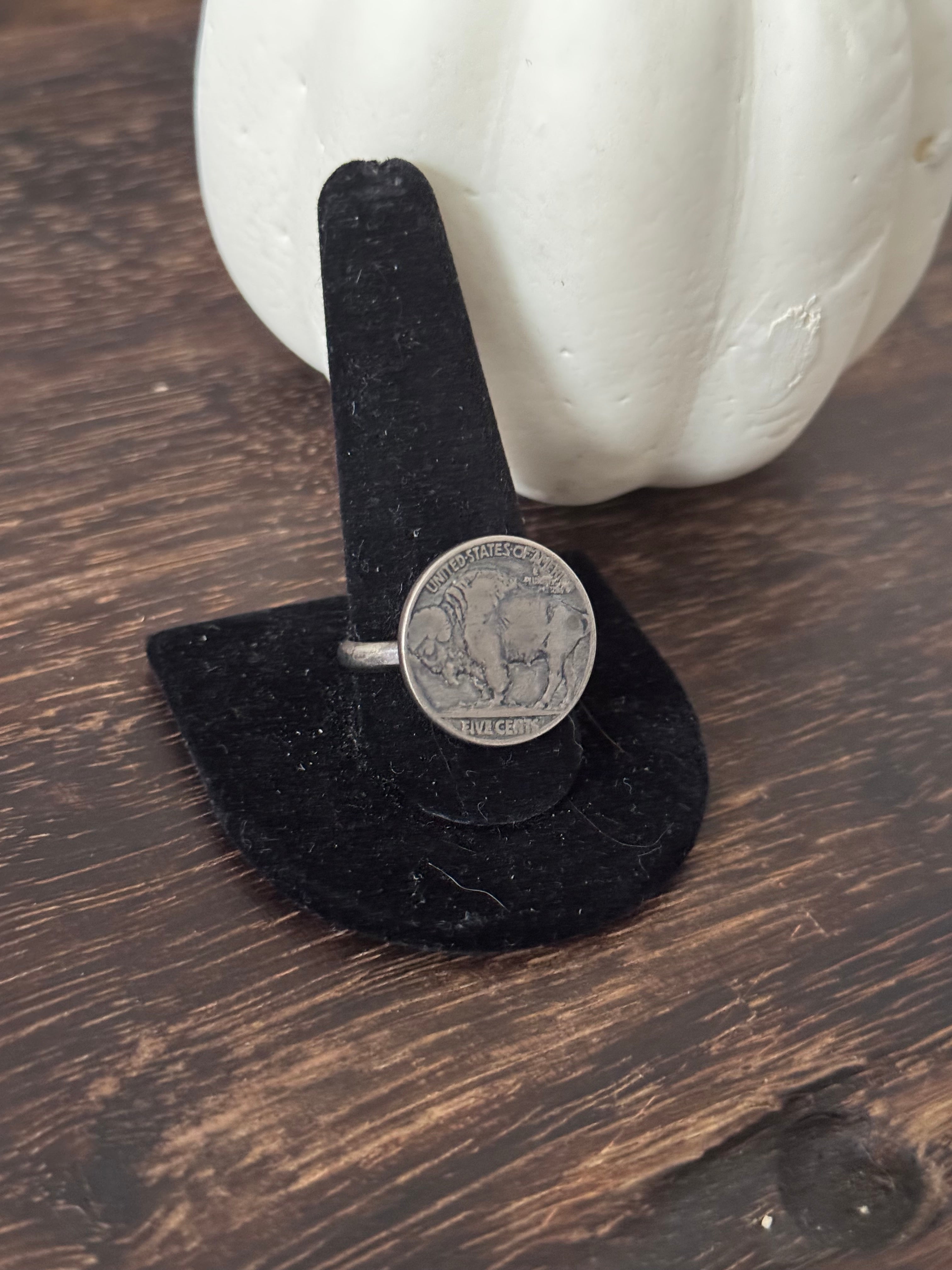 Navajo Made Sterling Silver Nickle Coin Ring Size 11.5. It measures just under 7/8 of an inch round. Stamped sterling silver.
