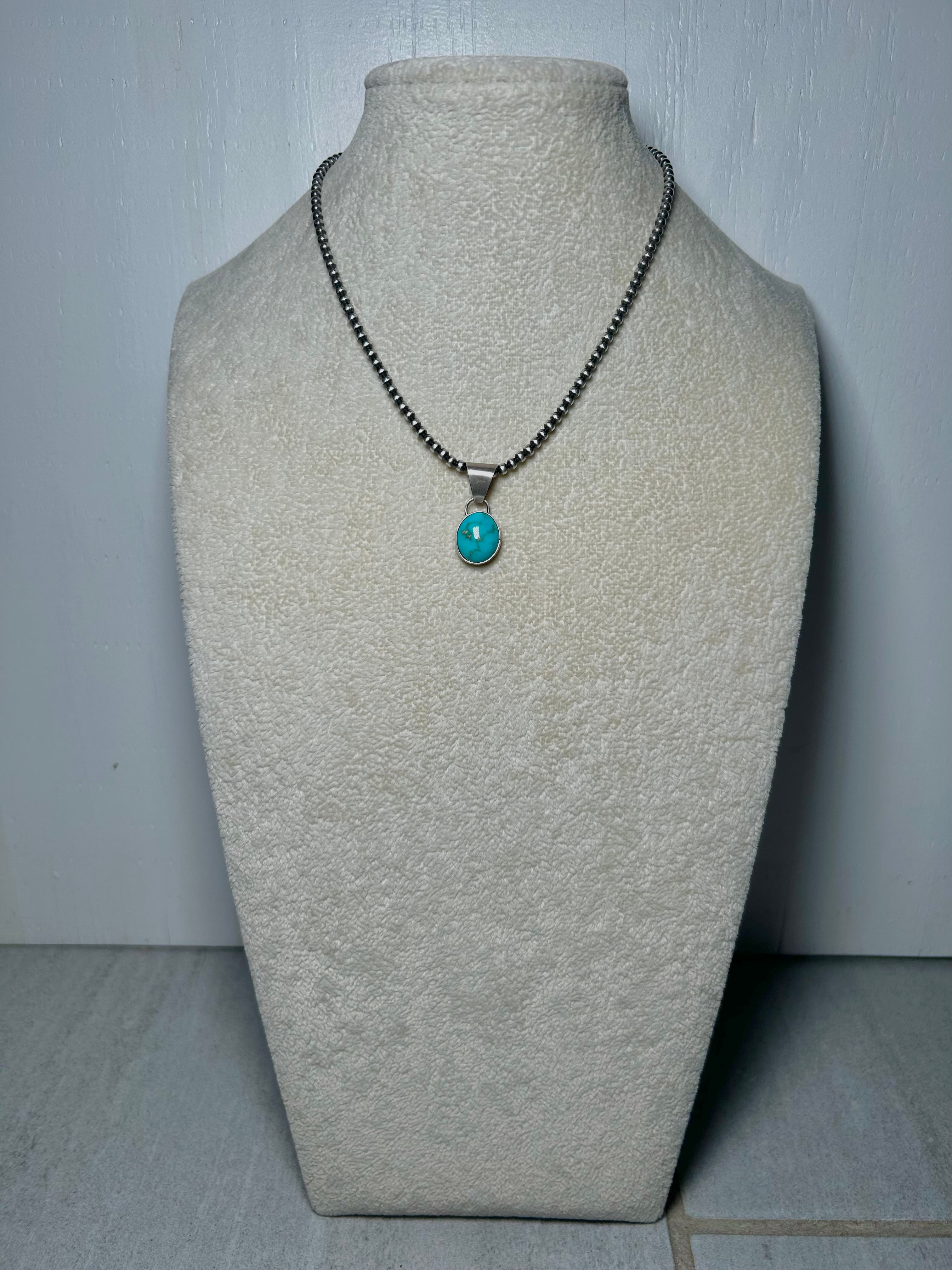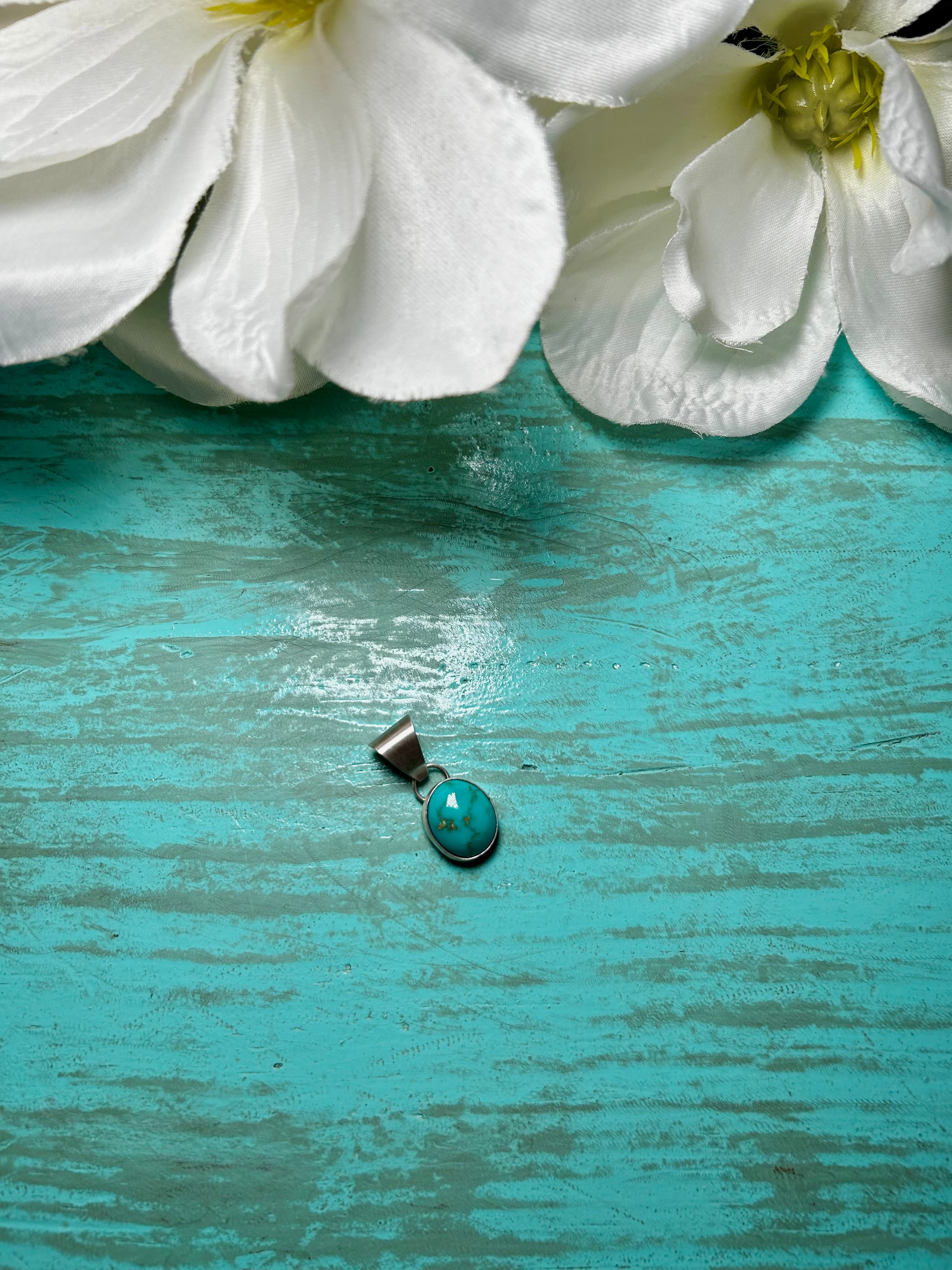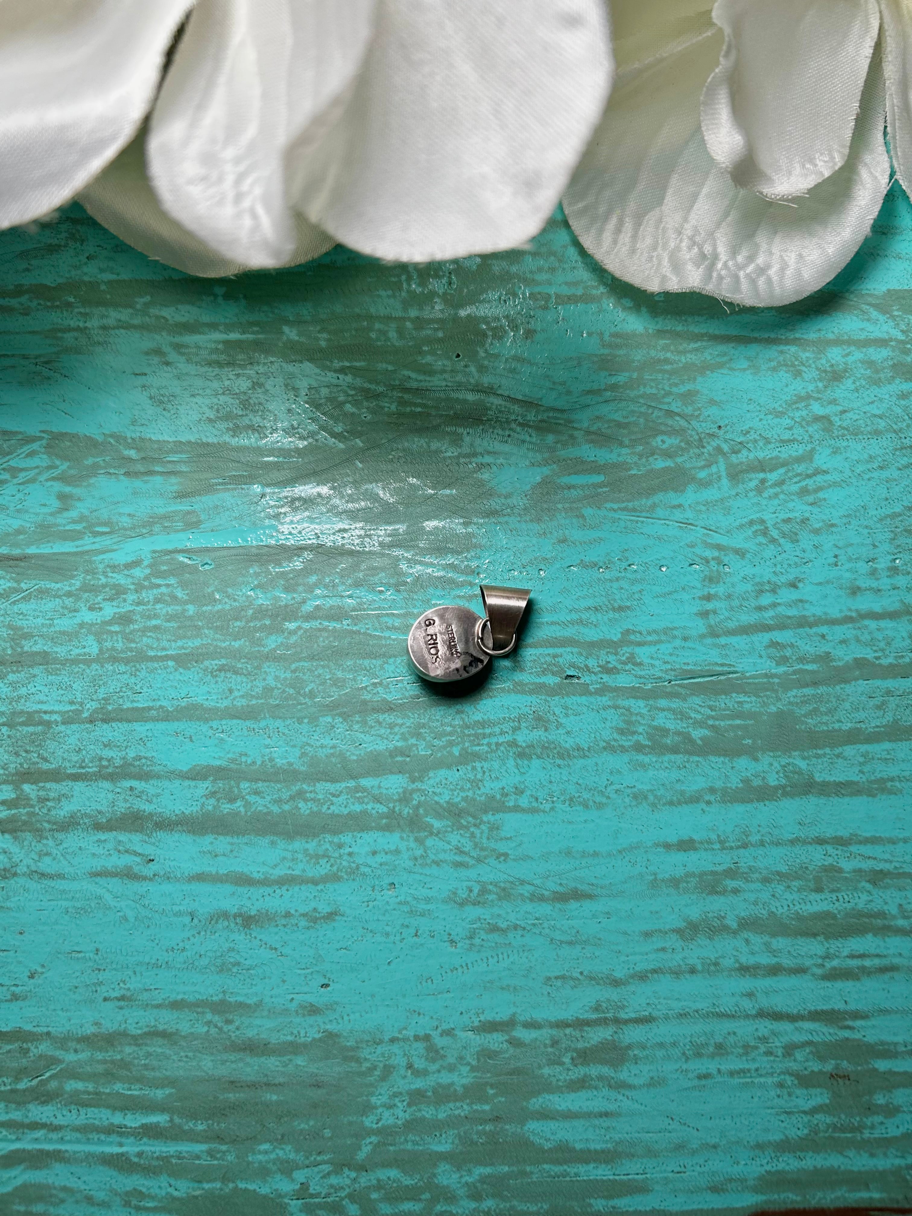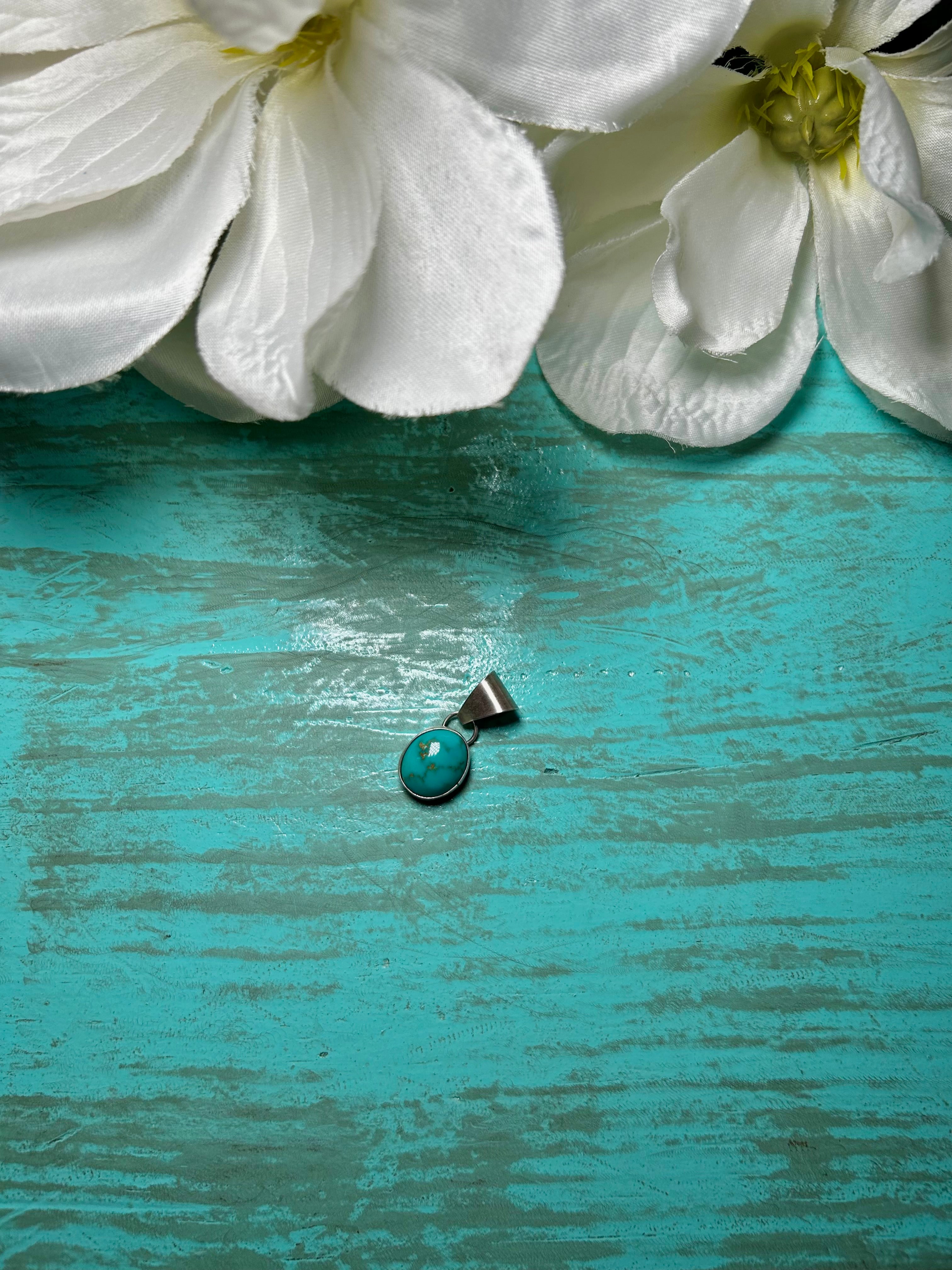 Navajo Made Royston Turquoise & Sterling Silver Pendant. It measures 1 inch long and 1/2 of an inch wide. Signed and stamped the artist. Pendant only!